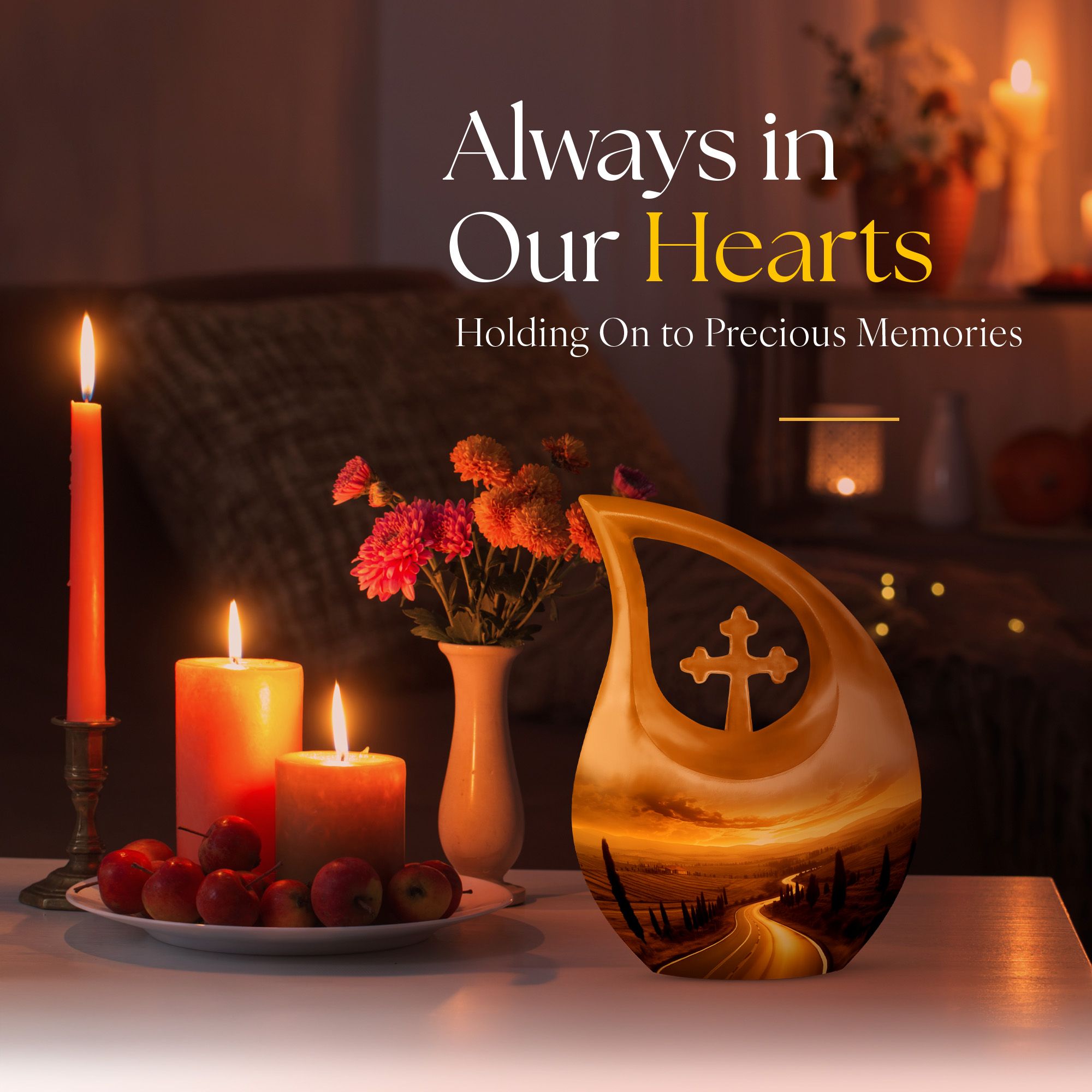 Honor a cherished life with this Sunset Roadway Funeral Urn, a peaceful cremation tribute designed to bring comfort and serenity. Its warm sunset imagery makes it a meaningful choice for urns for human ashes adult male dad, urns for adult male ashes, or loving memorials for urns for human ashes adult female mom.