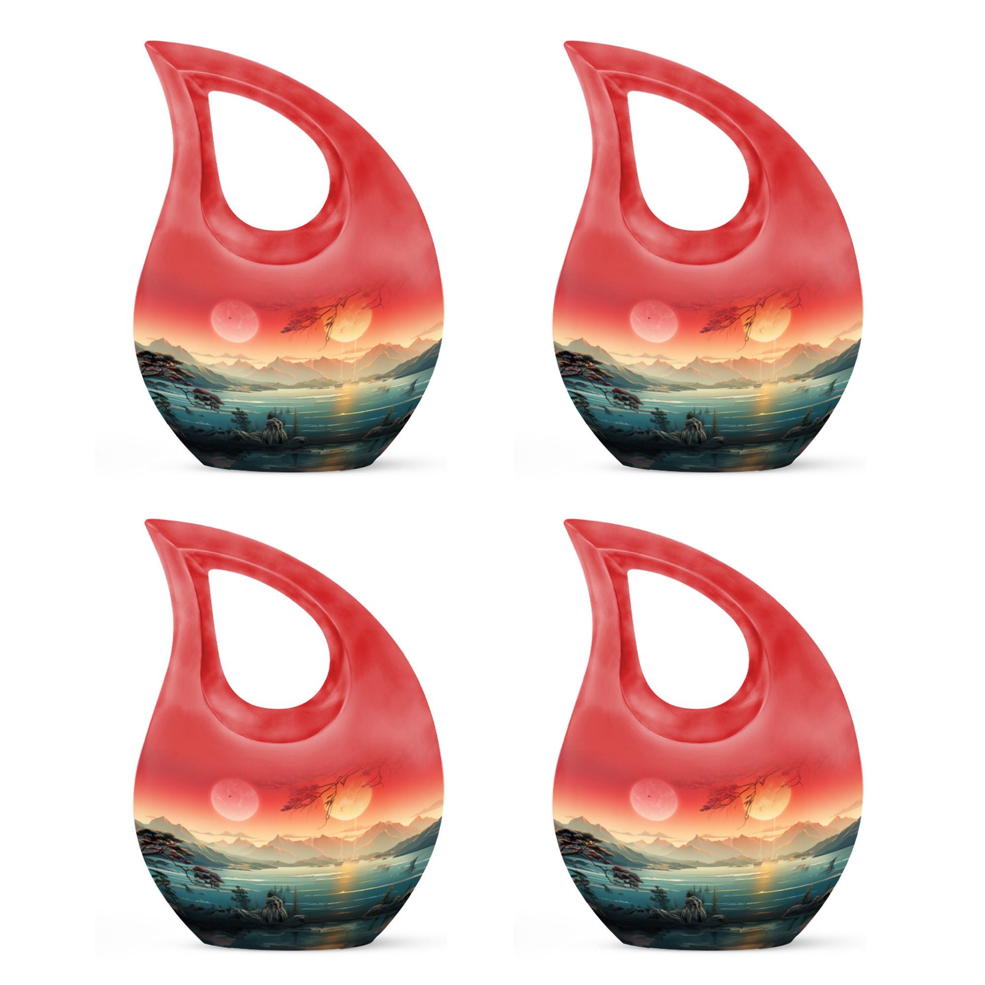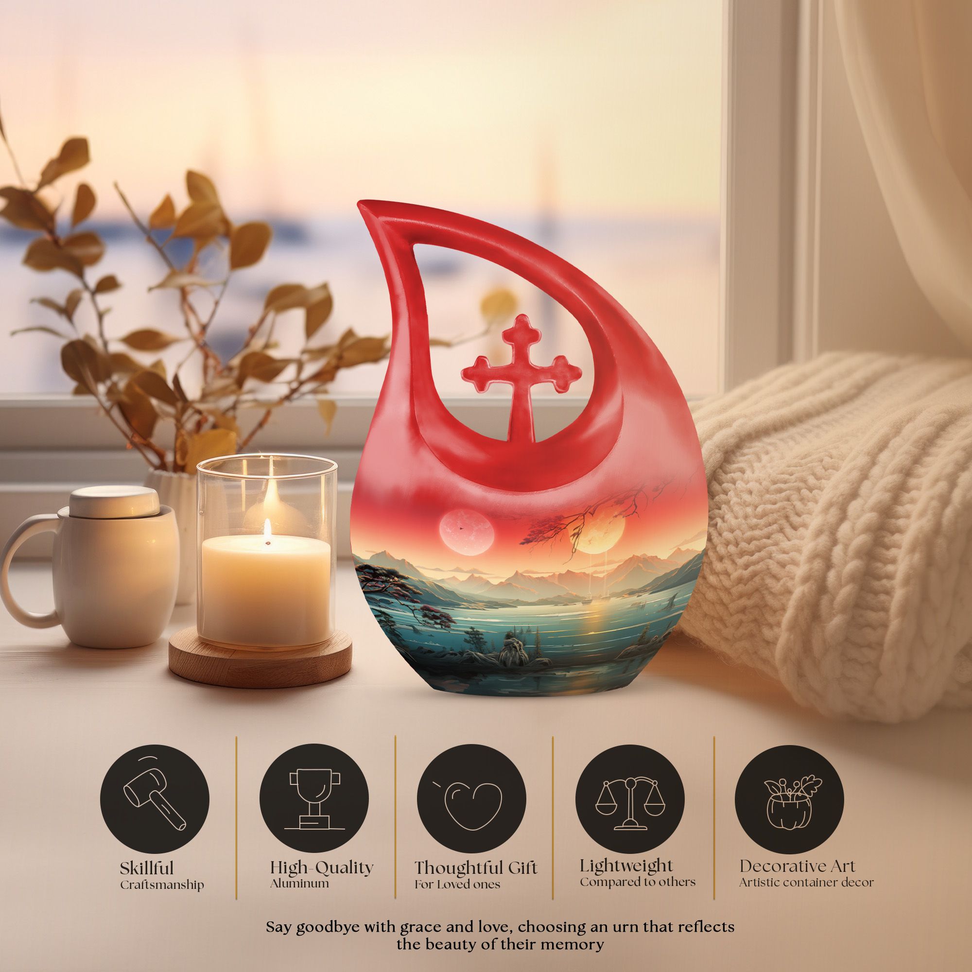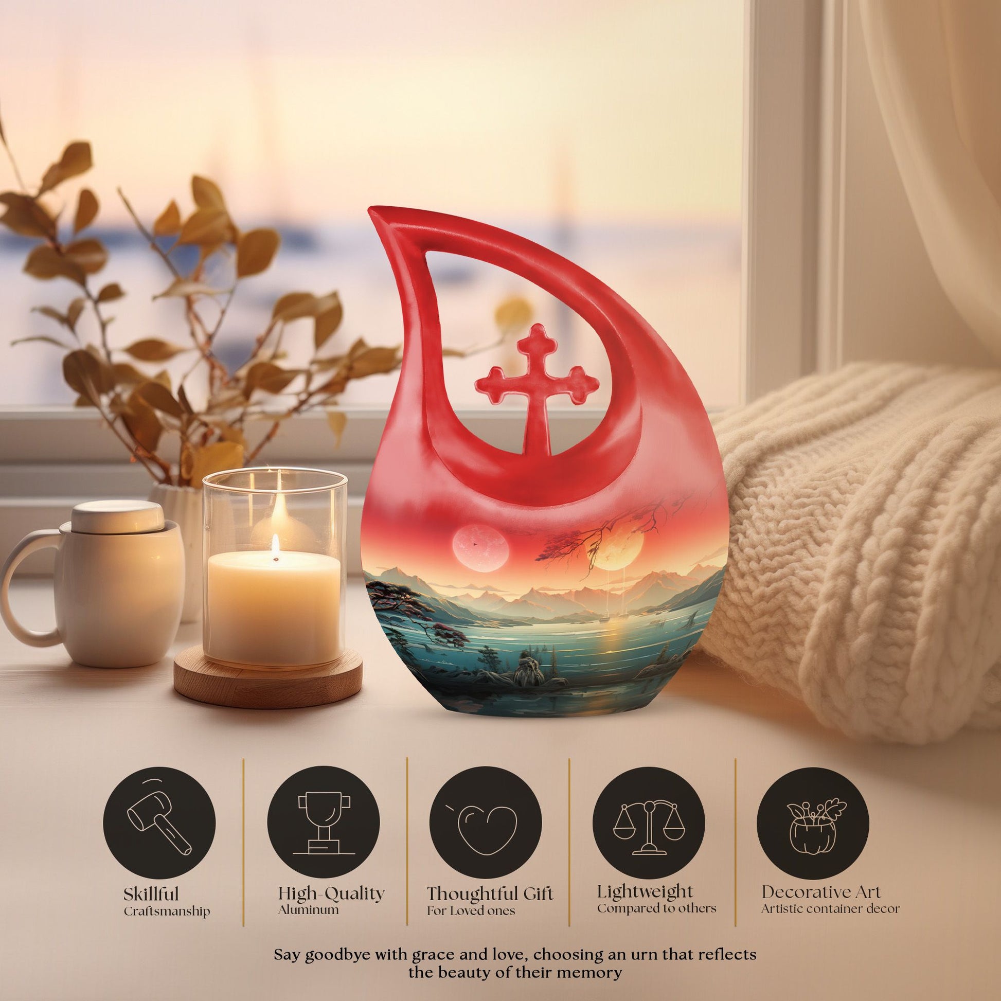 Crafted from durable aluminum, this adult size cremation urn features a serene landscape illustration inspired by peaceful outdoor scenery. The secure screw-top lid ensures long-term protection, making it a dependable urn for cremation ashes or cremation urn human memorial. This design also pairs beautifully with cremation keepsake urns for ashes or cremation urns for human ashes adult small to share ashes among family members.