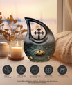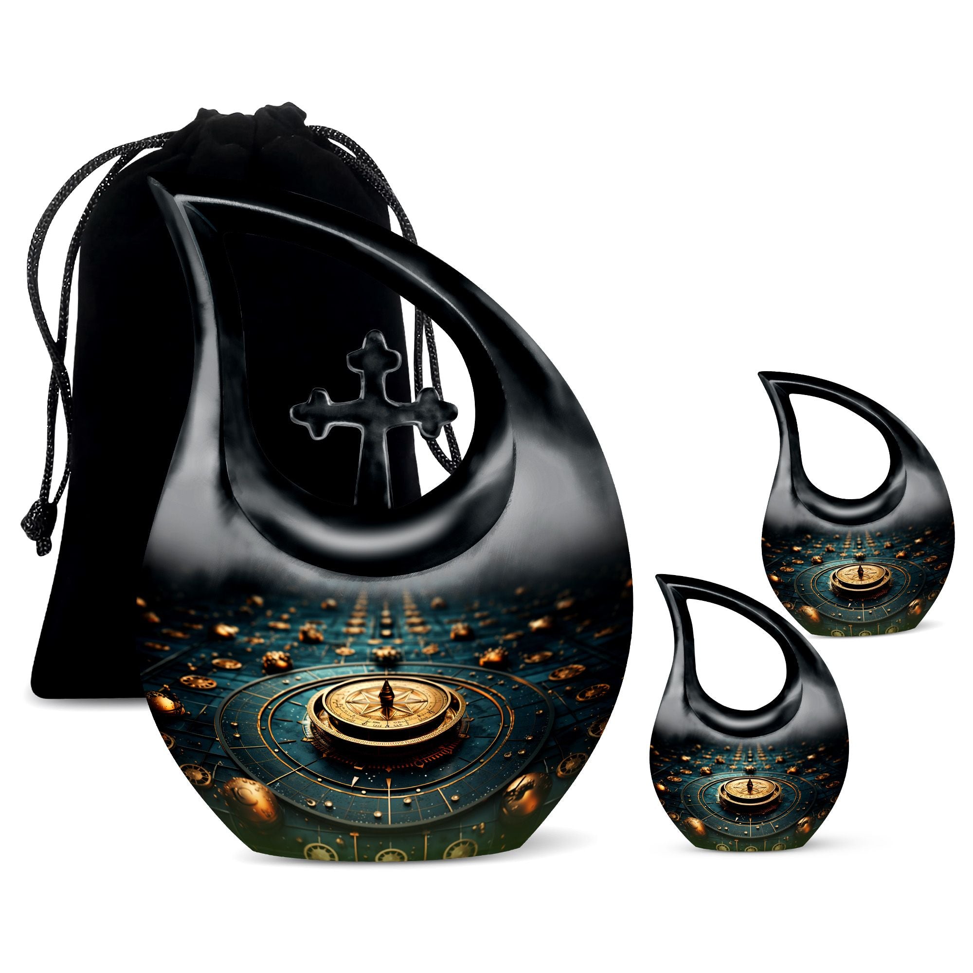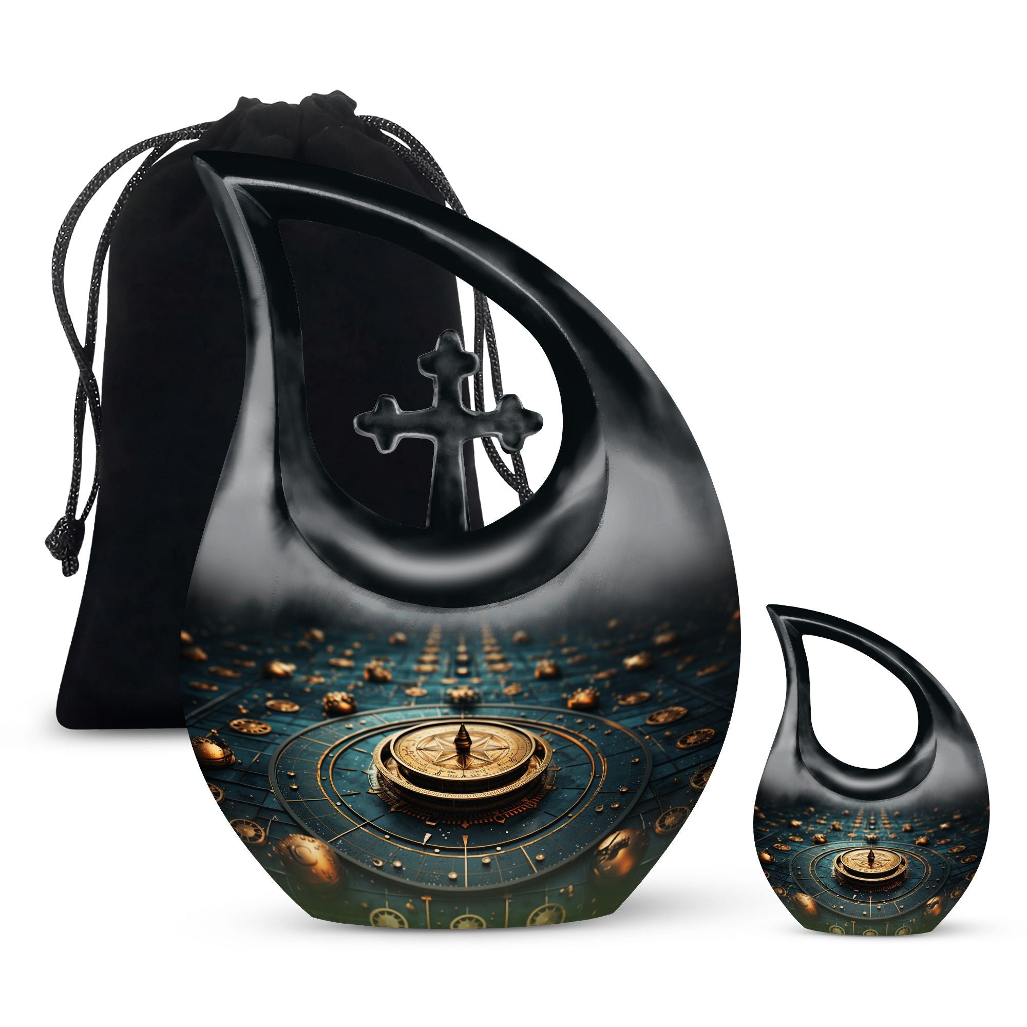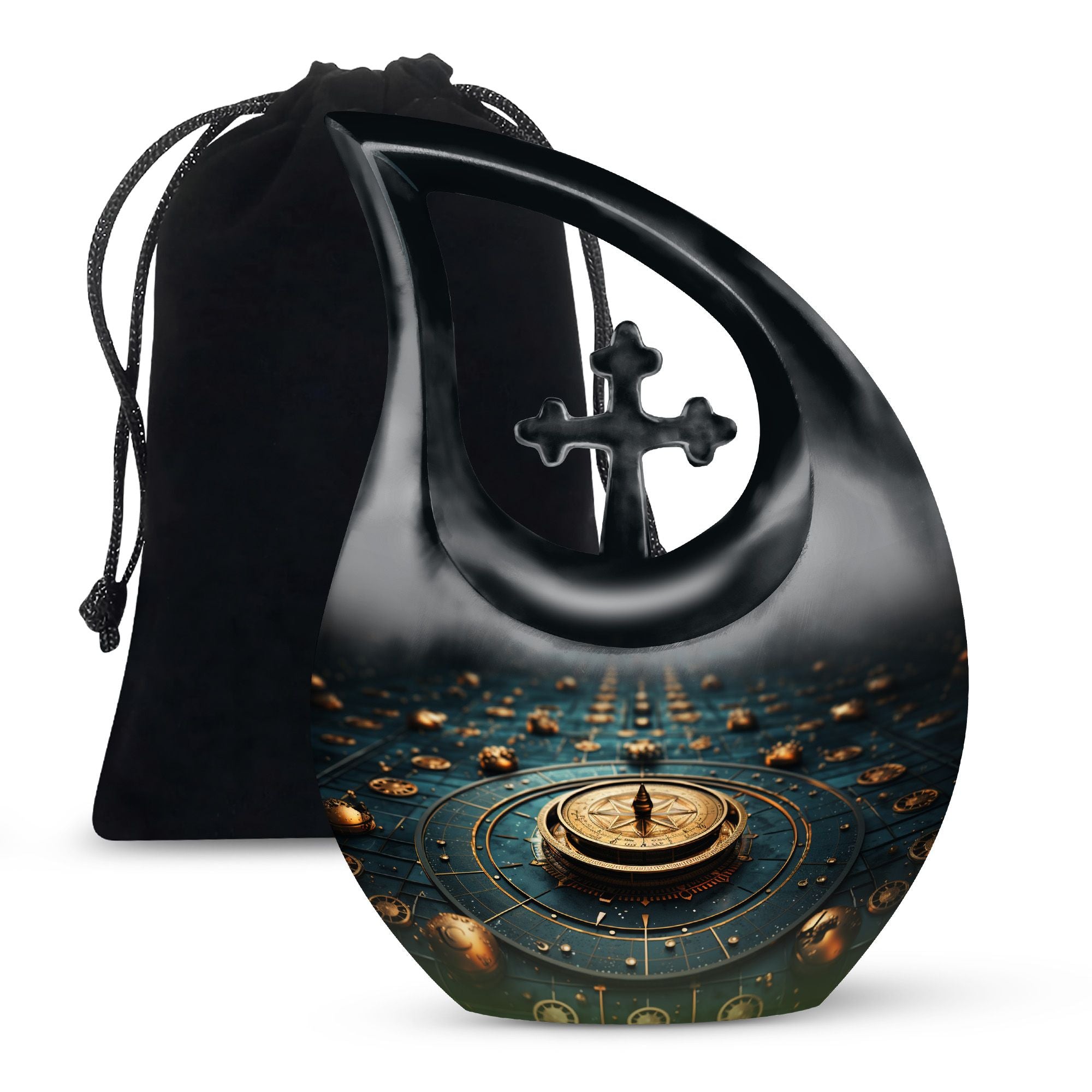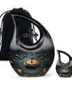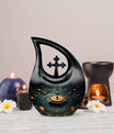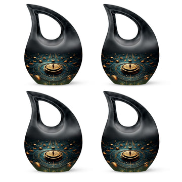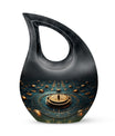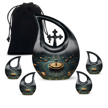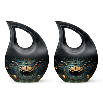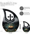 Elevate your memorial ceremonials with our 'Navigating The Celestial Cremation Urn'. Crafted delicately with high-quality aluminum, this 10-inch urn encompasses a unique celestial theme to honor your loved ones in the most sacred way. The urn radiates an aura of serenity and beauty with its symbolic 'Cross Drop' design. Weighing only 3.3 pounds, this poignant piece offers a large capacity of 200 cubic inches suitable for holding ashes. The urn comes in a plush velvet pouch, adding further dignity to this special containment. Include a personal touch by engraving names, turning it into a treasured memorial urn. The 'Navigating The Celestial Urn' is not only a profound piece for remembrance, but its blend of artisan craftsmanship and quality make it an unparalleled choice for burial urns, even outshining many discount urns. Purchase our double-ceremonial urn for a reverential and poignant resting place for your dear ones.