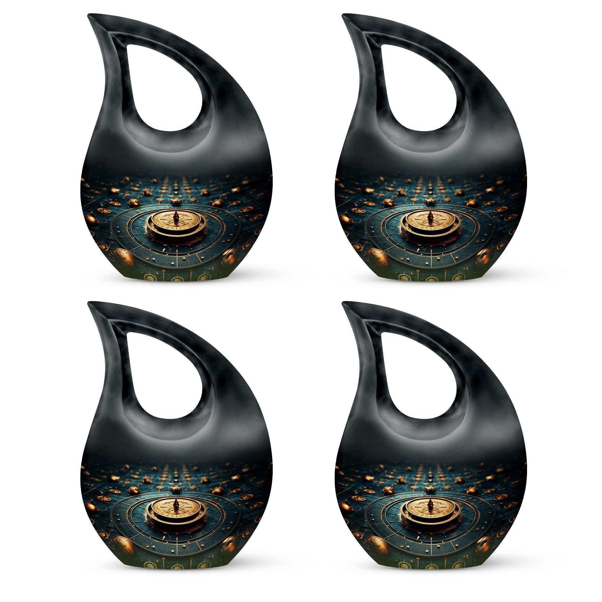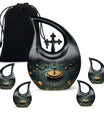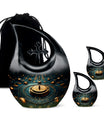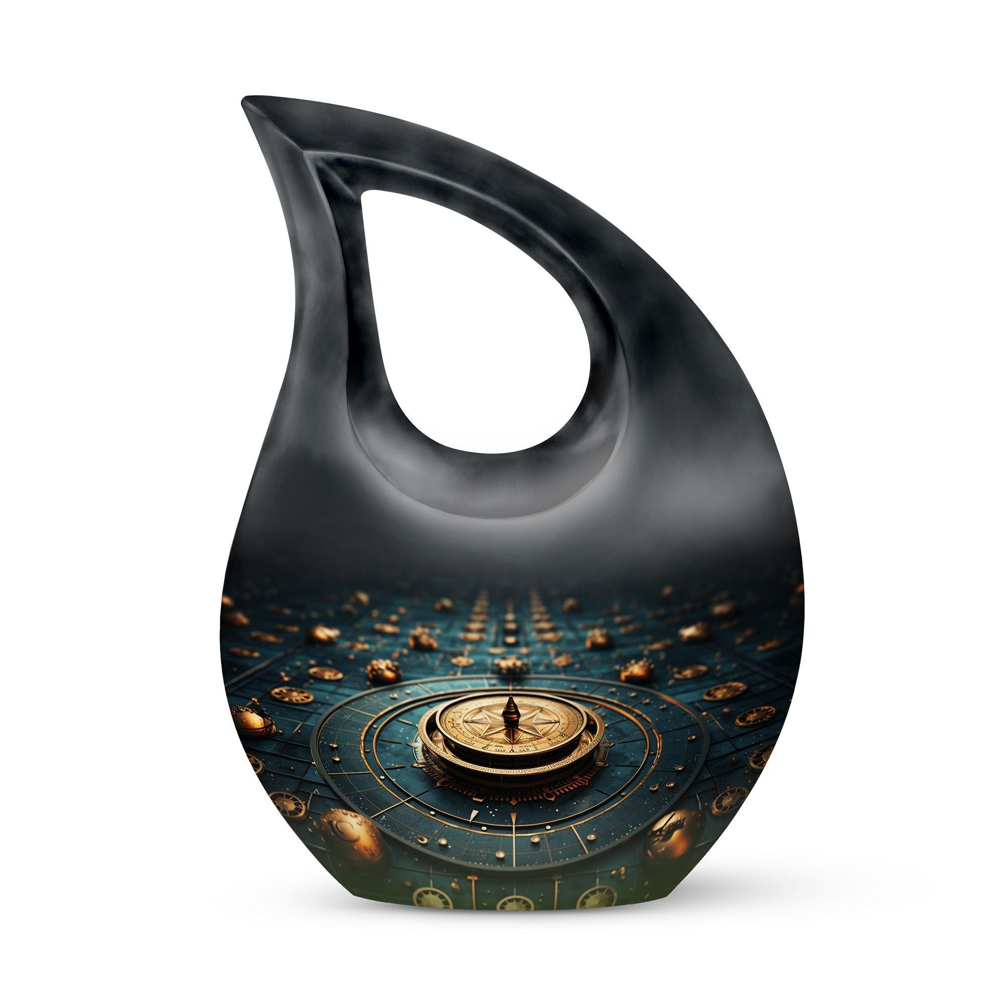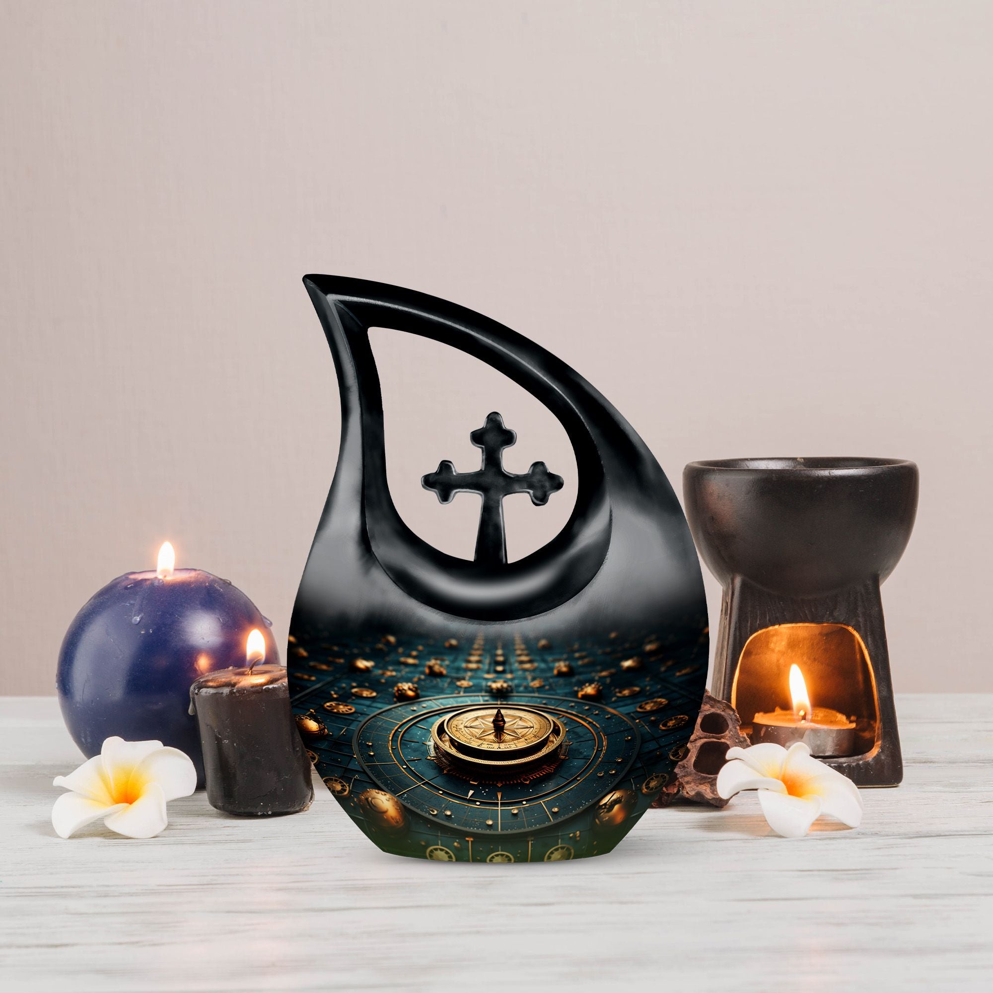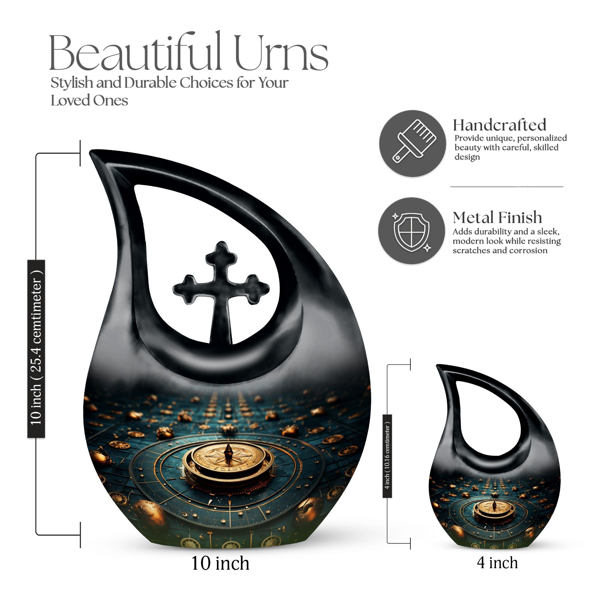 Elevate your memorial ceremonials with our 'Navigating The Celestial Cremation Urn'. Crafted delicately with high-quality aluminum, this 10-inch urn encompasses a unique celestial theme to honor your loved ones in the most sacred way. The urn radiates an aura of serenity and beauty with its symbolic 'Cross Drop' design. Weighing only 3.3 pounds, this poignant piece offers a large capacity of 200 cubic inches suitable for holding ashes. The urn comes in a plush velvet pouch, adding further dignity to this special containment. Include a personal touch by engraving names, turning it into a treasured memorial urn. The 'Navigating The Celestial Urn' is not only a profound piece for remembrance, but its blend of artisan craftsmanship and quality make it an unparalleled choice for burial urns, even outshining many discount urns. Purchase our double-ceremonial urn for a reverential and poignant resting place for your dear ones.