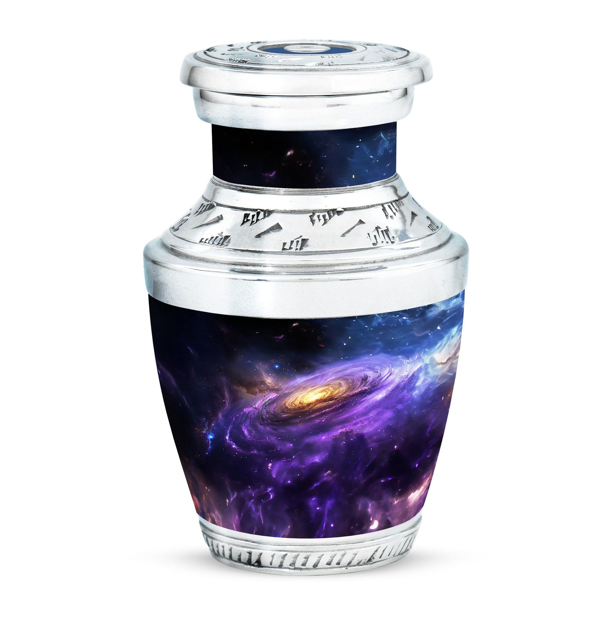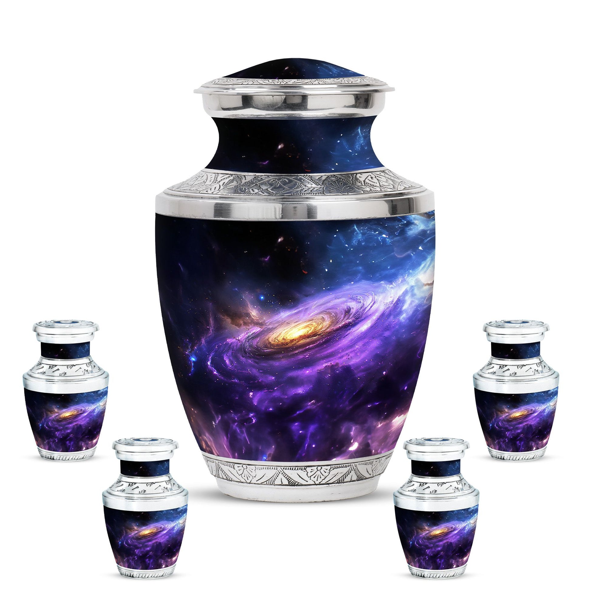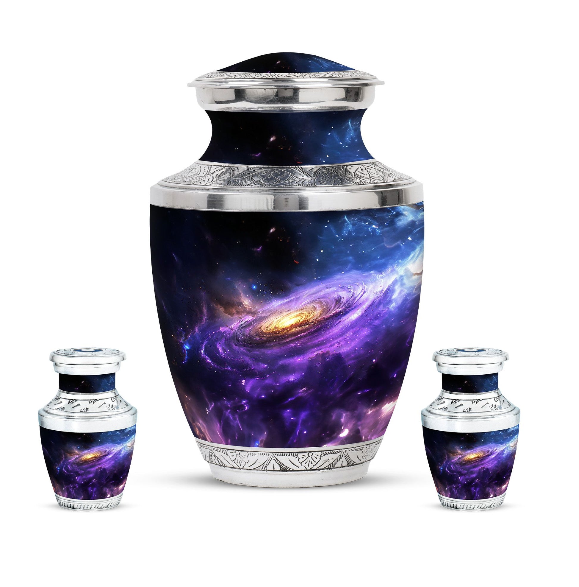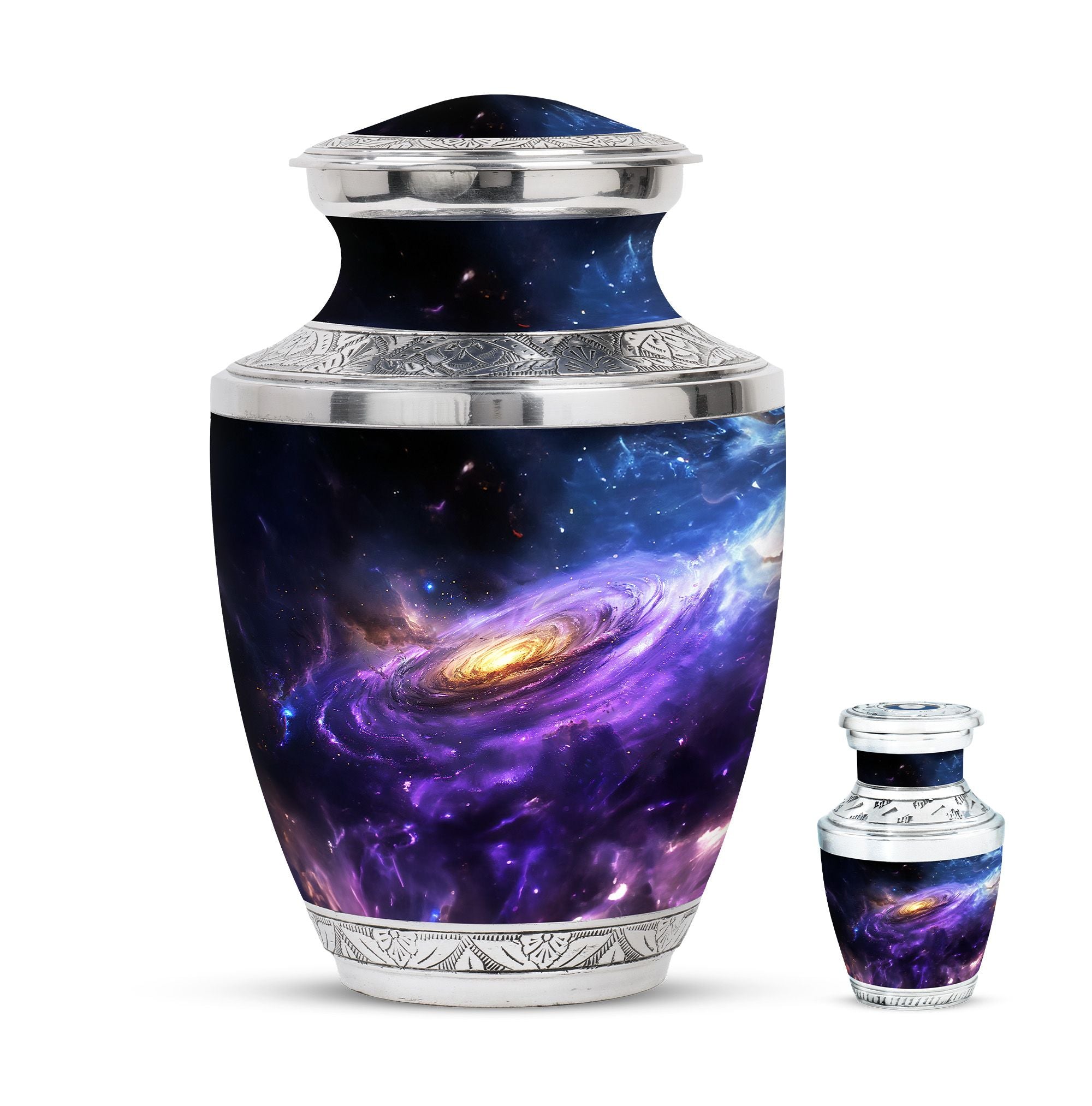 Carefully crafted with high-quality aluminum, this funeral ashes urn displays a stunning galaxy-inspired design, symbolizing eternity and connection beyond the stars. Available as a funeral urn adult and mini keepsake funeral urn, the set allows family members to share in keeping a piece of their loved one close. Designed with durability and timeless elegance, these adult funeral urns and funeral keepsake urns provide peace of mind with a secure screw-top lid.