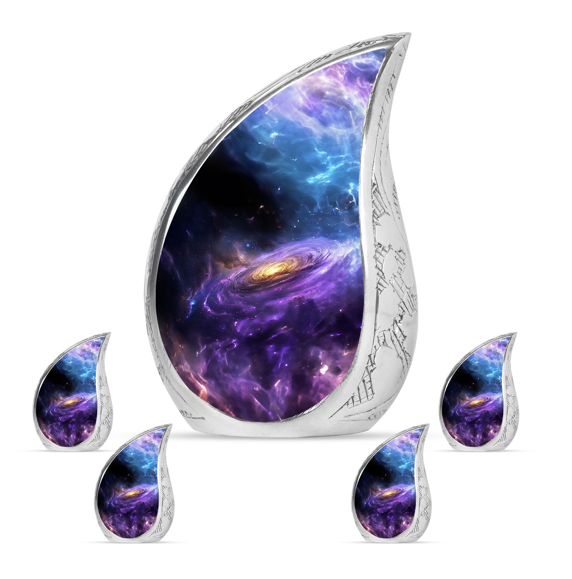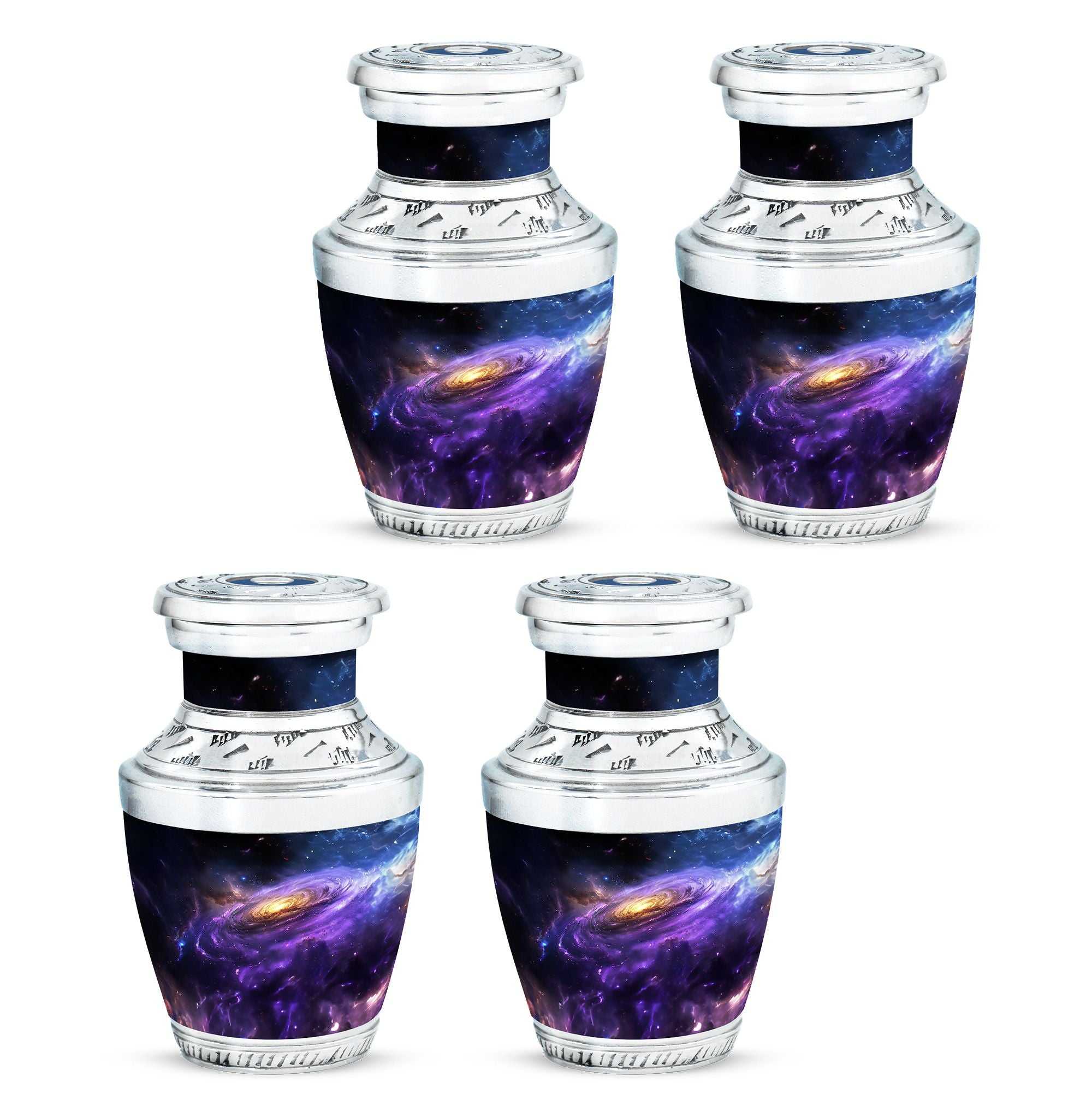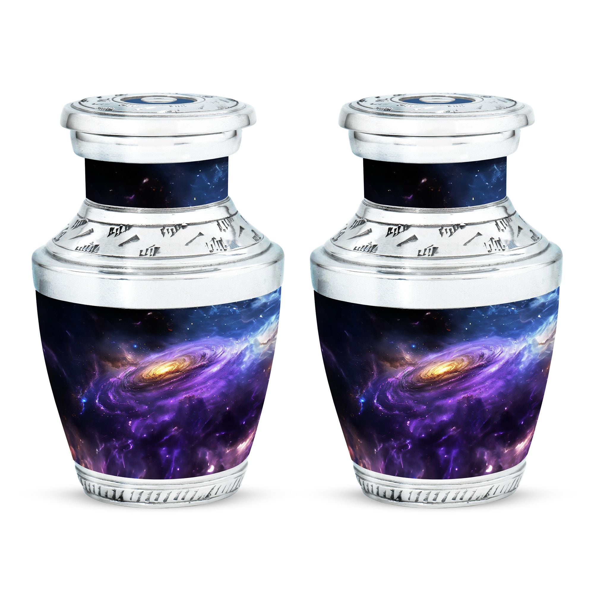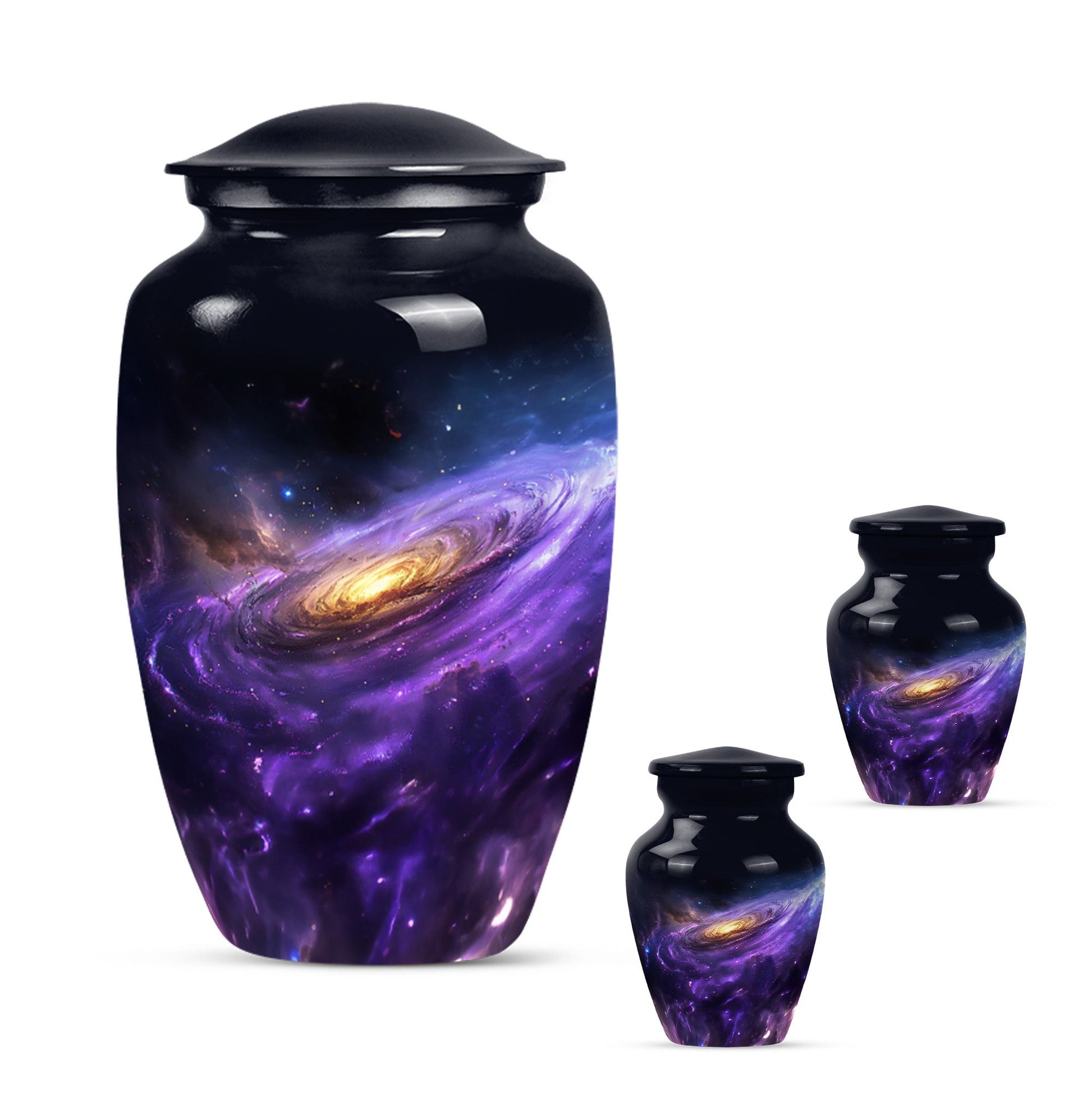 Carefully crafted with high-quality aluminum, this funeral ashes urn displays a stunning galaxy-inspired design, symbolizing eternity and connection beyond the stars. Available as a funeral urn adult and mini keepsake funeral urn, the set allows family members to share in keeping a piece of their loved one close. Designed with durability and timeless elegance, these adult funeral urns and funeral keepsake urns provide peace of mind with a secure screw-top lid.