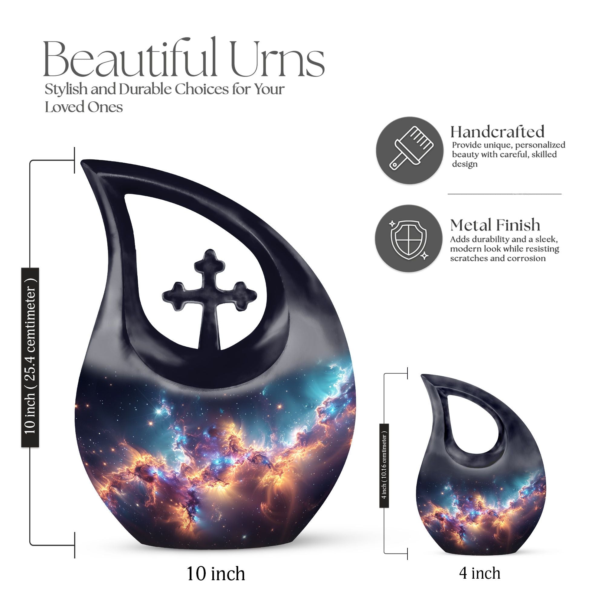 Crafted from durable aluminium, this handcrafted 10-inch urn features a breathtaking galaxy design symbolizing eternity, peace, and the ongoing journey of the soul. Its secure screw-top lid ensures dependable protection, making it suitable as a cremation urn small alternative, cremation keepsake urn companion piece, or a full-size memorial urn. Families looking for small cremation urns for ashes, mini cremation urns for human ashes, or small urn for cremation human ashes will appreciate its artistry, durability, and emotional resonance. It also complements urns for cremation ashes mother and cremation urns for ashes for men with its universal, comforting design.