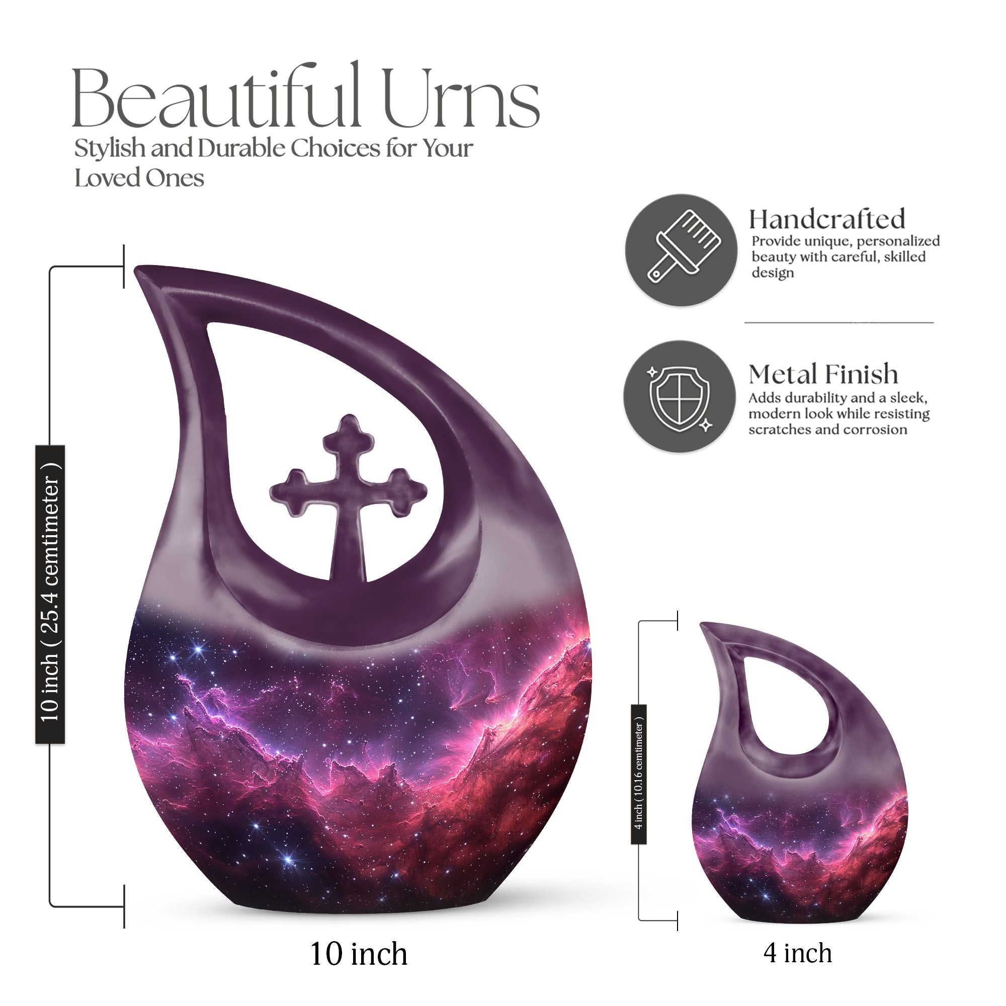 Crafted from durable aluminum, this 10 inch urn features a vivid cosmic pattern with rich blues, purples, and star-like accents. Its secure screw-top lid ensures ashes remain safe, making it a trusted option for families needing cremation urns women, a dignified burial urn men, or smaller matching memorials such as keepsake urns for men ashes or tiny urns for women & men. Designed for full adult capacity, it also supports those seeking an urn ashes for women or a unifying urn for adult male & female suitable for any loved one.