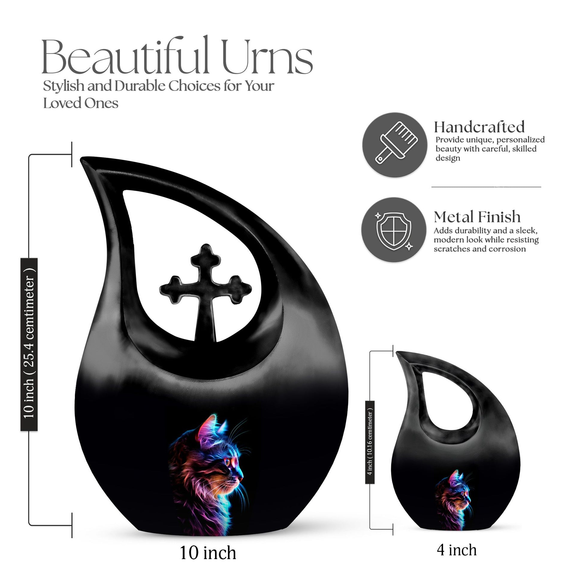 Presenting our Neon Cat Urn, a large urn crafted from high-quality aluminium, perfect to pay tribute to loved ones. Its size, 10-inch in height, can conveniently hold up to 200 cubic inches of ashes and weighs just 3.3 pounds for an easy placement. Uploaded with a unique Cross Drop theme, the urn depicts a radiant neon cat illustration, invoking serenity and tenderness. Our package comes with a lovely velvet pouch, providing a dignified home for your cherished one's ashes, symbolizing the lasting memory. For a truly personal touch, we provide engraving services for names, allowing you to etch an affectionate sentiment of remembrance. This affordable cremation solution is benefited by its durability and attractive design. A versatile choice from cheap urns, it is notably one of the sought-after cool urns for ashes. Ideal for those seeking Box for Ashes Human, or a pop of color like our purple urn, this product is a fitting tribute to the memories of the departed.