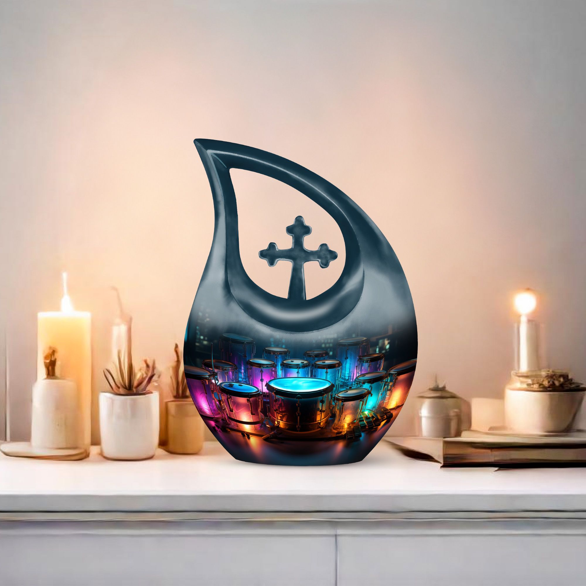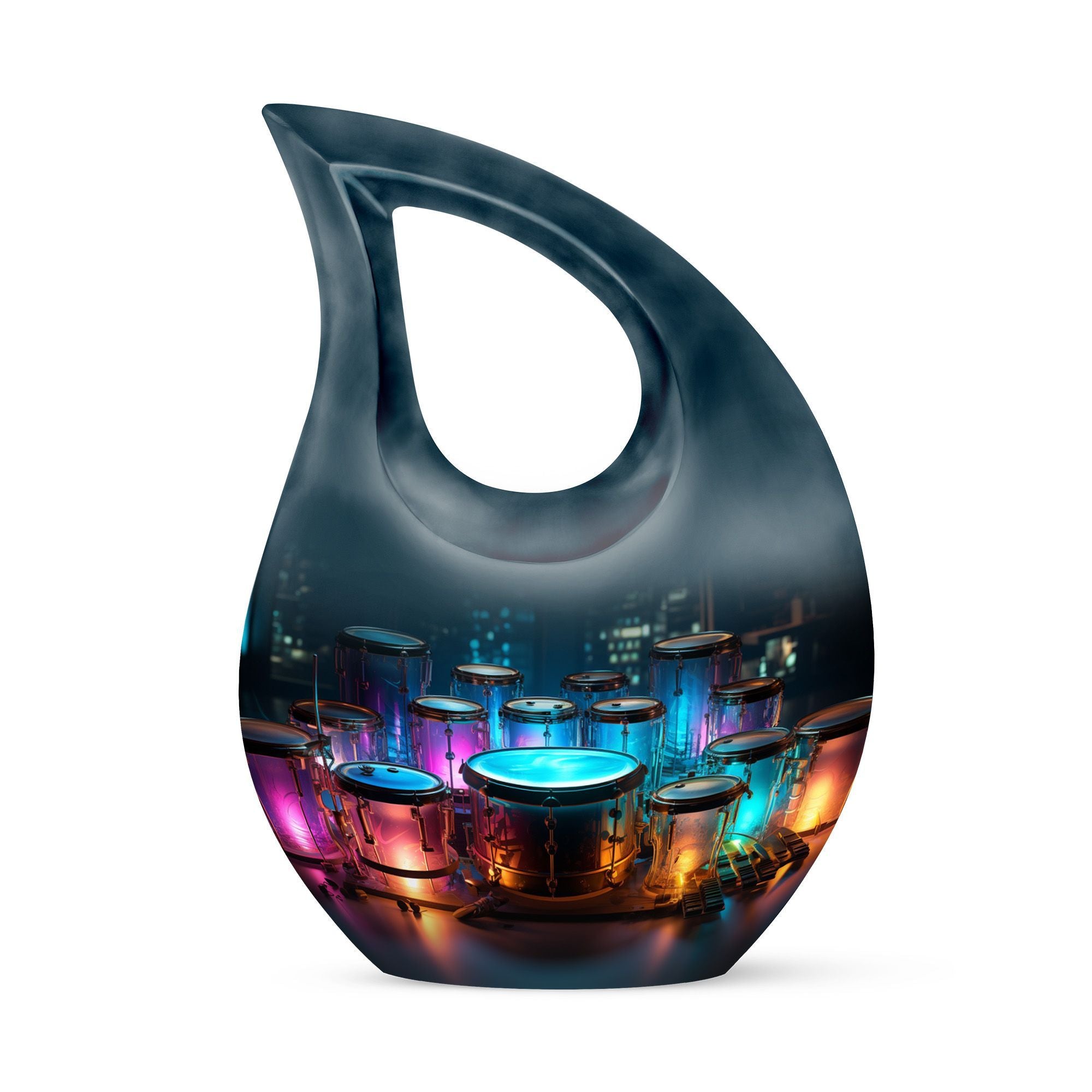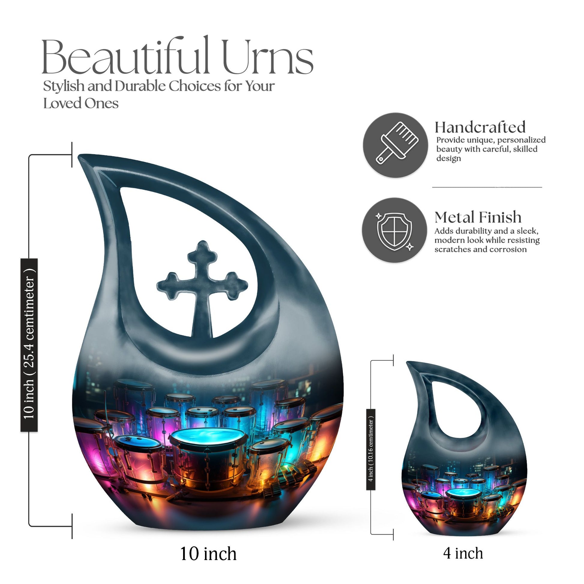 Crafted from durable aluminum, the 10-inch urn features a vibrant neon drum–themed artwork that symbolizes passion, movement, and the heartbeat of a life well lived. Its secure screw-top lid offers lasting protection while providing a meaningful memorial for families. For those wishing to share ashes, this urn pairs beautifully with mini urn set for ashes, decorative miniature urn options, mini urn for human ashes, mini urn for Mom ashes, urn keepsakes for ashes, human ashes keepsake designs, ash keepsakes for human ashes, memorial ashes keepsake pieces, keepsake for ashes, and keepsakes for ashes—allowing loved ones to hold a personal and intimate remembrance.