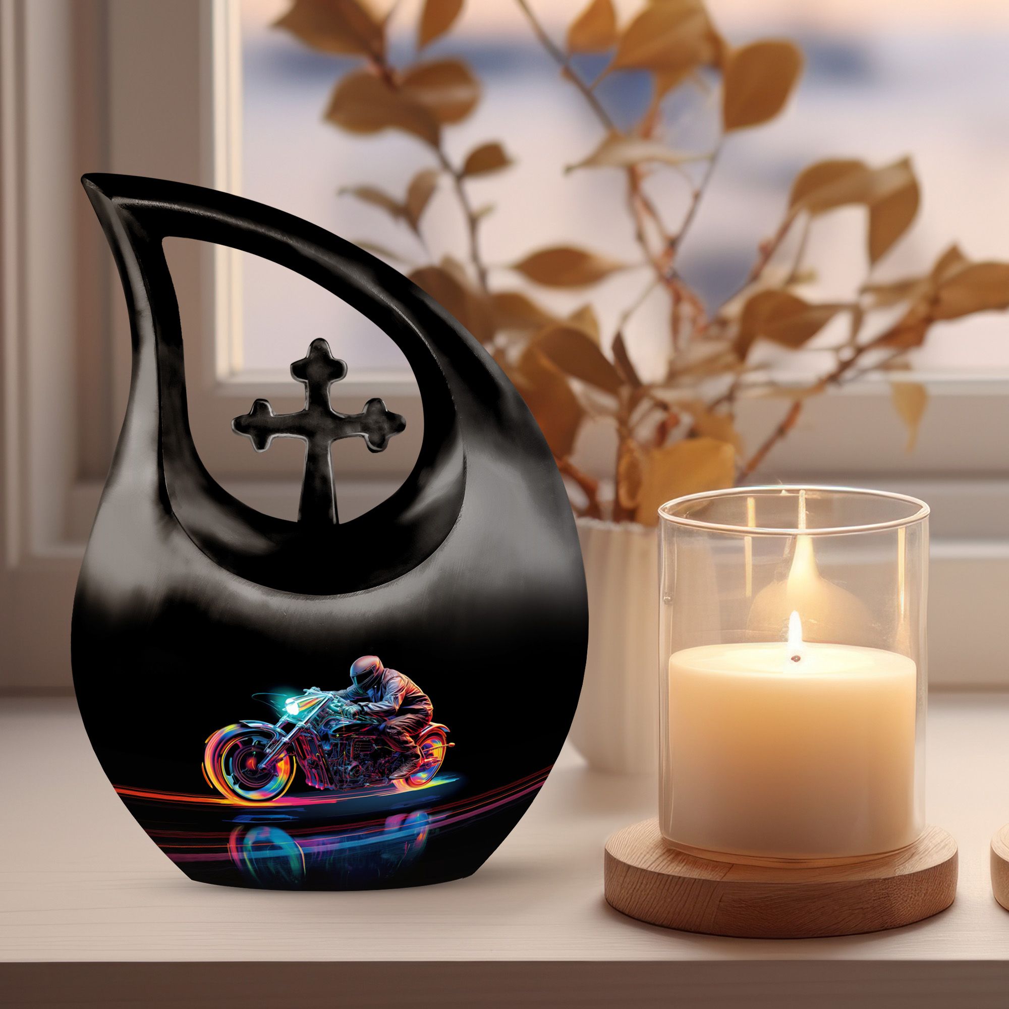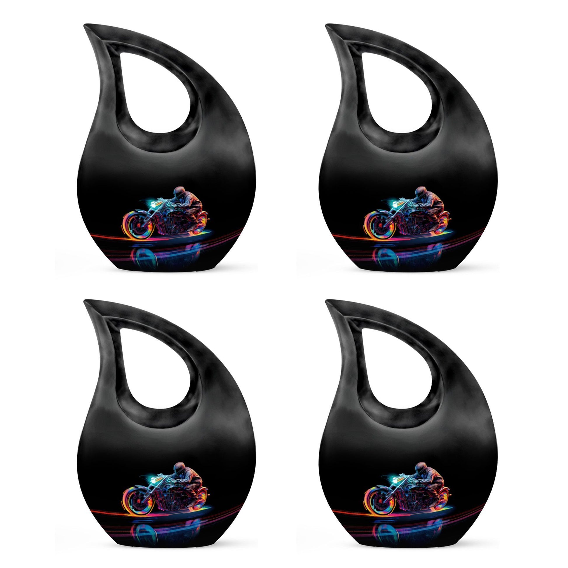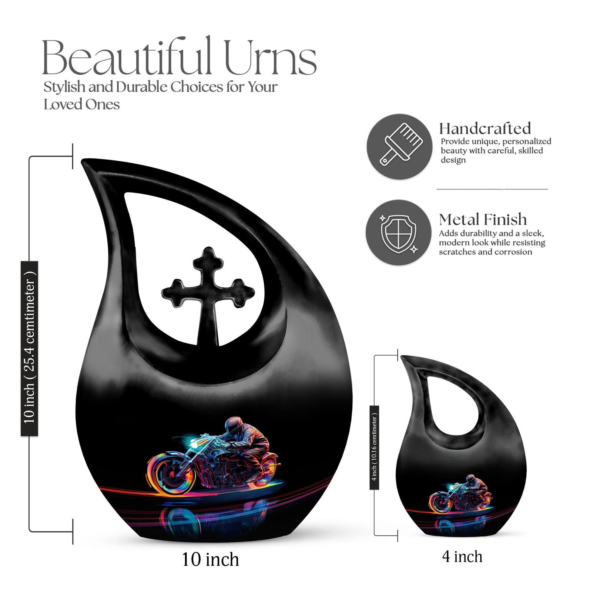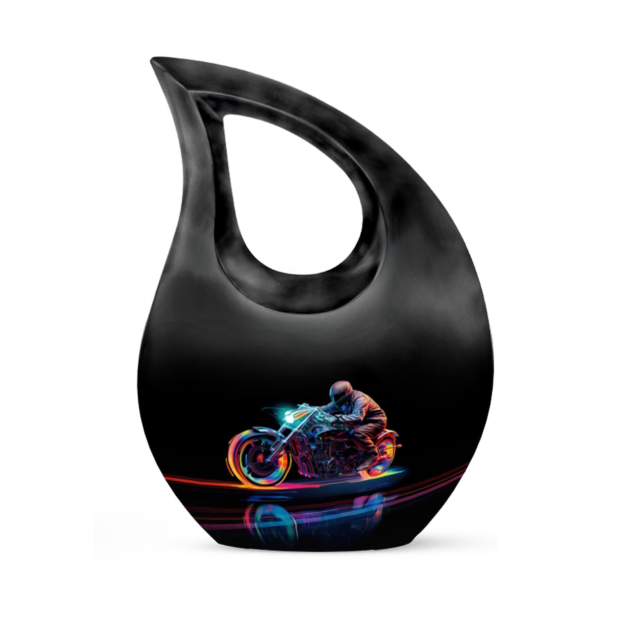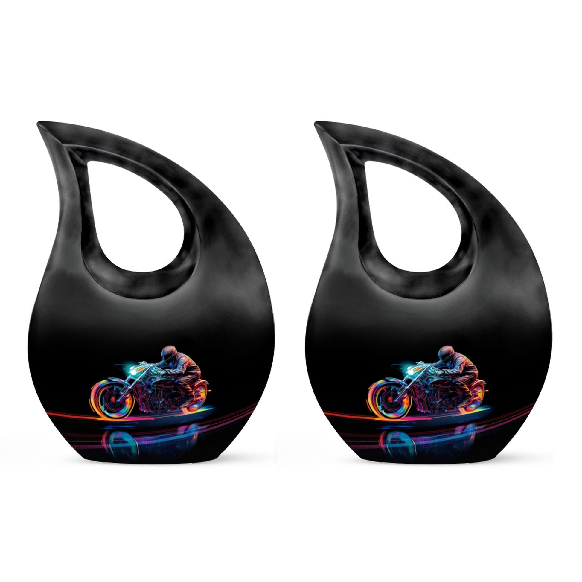 Honor and celebrate your departed beloved with our 10-inch Neon Streak Biker Urn, expertly designed under the Memorial Ceremony Supplies category. Officially available for the respectful containment of ashes, this high-quality large urn and its velvet pouch present a timeless tribute to a loved one's eternal journey. Crafted from resilient aluminum, this sturdy urn weighs 3.3 pounds, reflecting enduring strength and longevity. The exclusive Cross Drop design compliments the overall theme, evoking a sense of peace and tranquility. Adorned with the capacity to hold up to 200 cubic inches, this urn can become an enduring sanctuary for your loved one's ashes. For a unique touch, customization options are available to engrave names. Brilliantly crafted for Adults and Seniors, the Neon Streak Biker Urn can also serve as a valuable addition to pieces similar like marble cremation urns, keepsake urns, and biodegradable urns for human ashes. Find solace in the thoughtfulness and originality of this carefully designed memorial urn. It is indeed an exceptional way to celebrate, remember, and honor a poised journey to eternity.