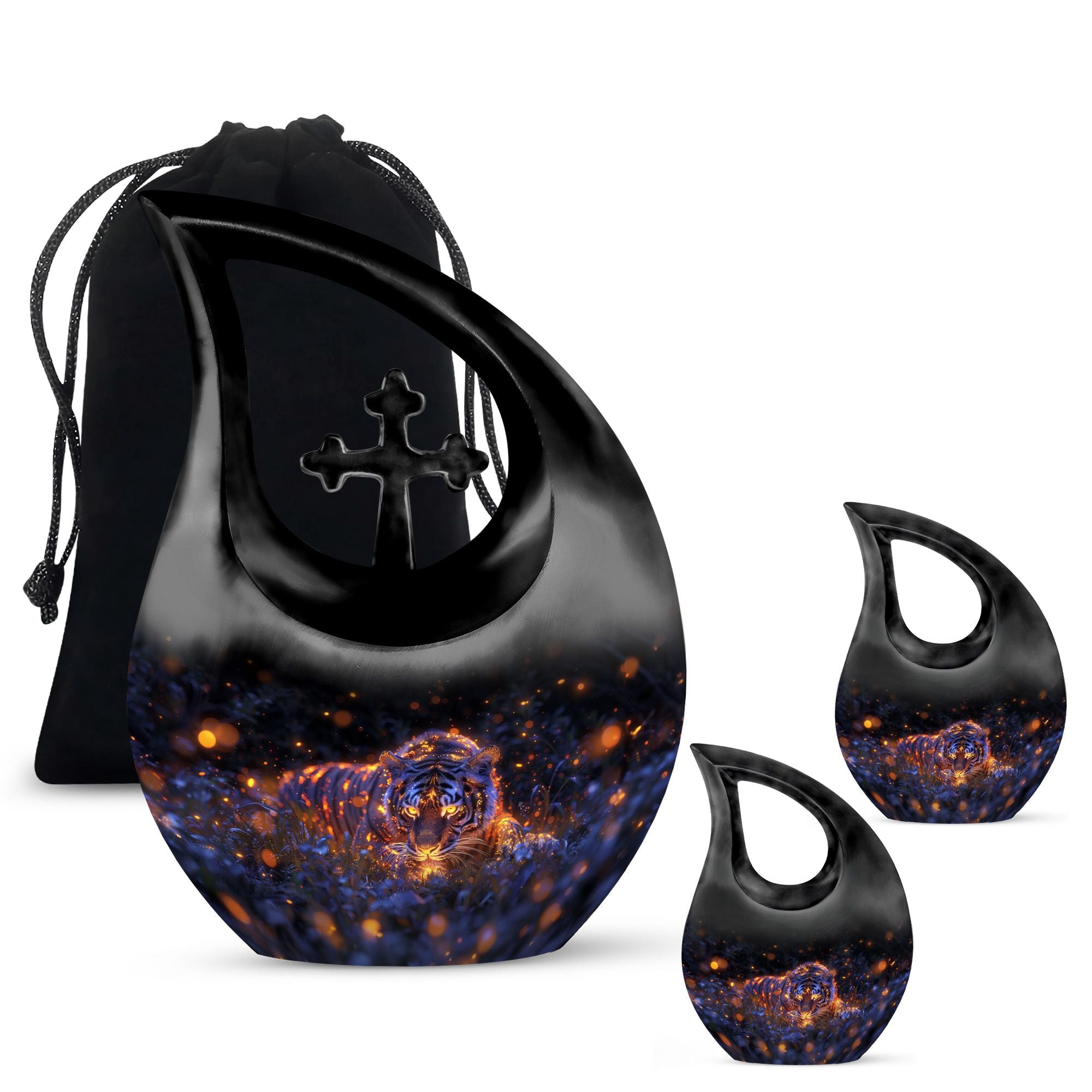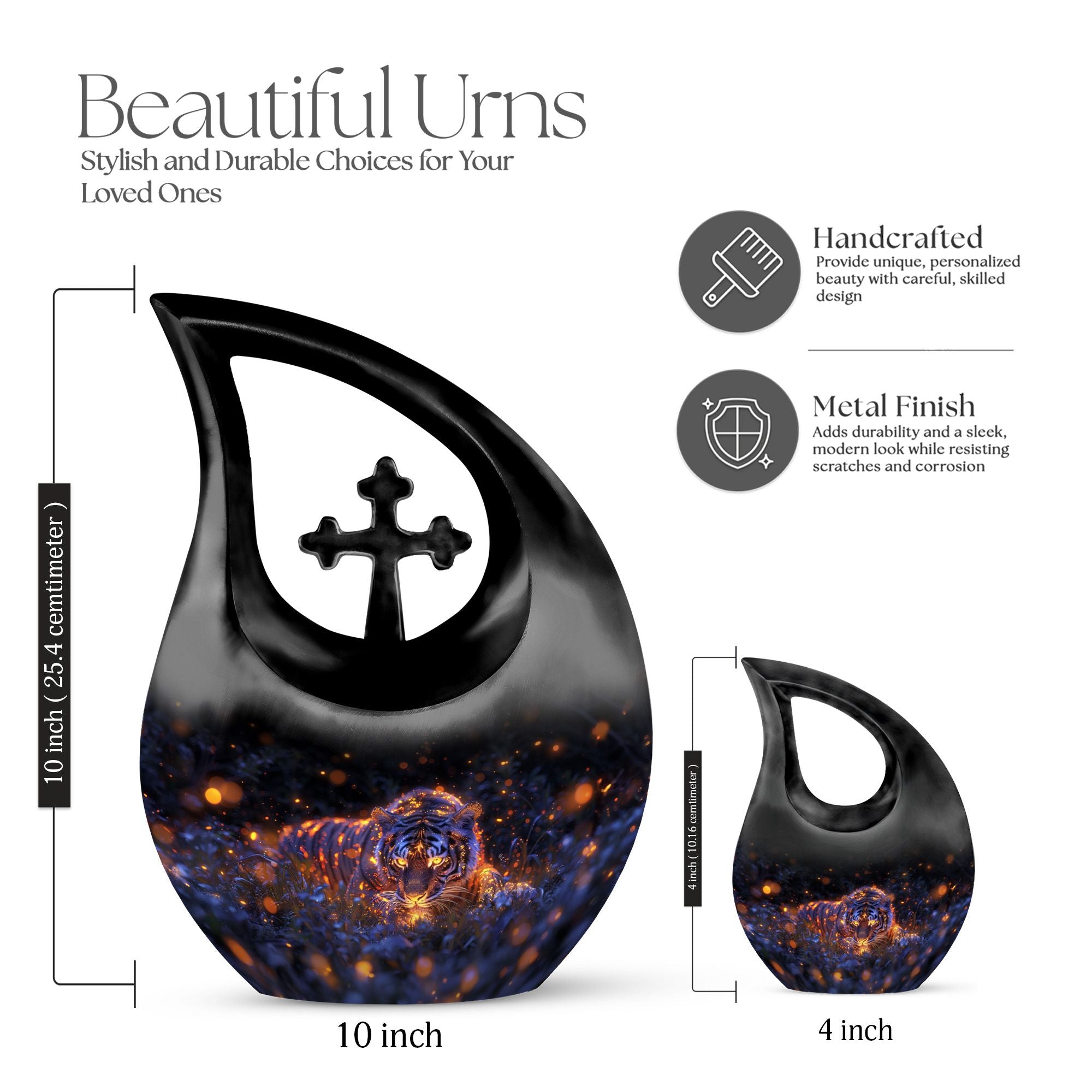 Introducing the 'Starry Night Prowl Urn', a remarkable tribute to your loved one, meticulously crafted to serve as a dignified resting place. This 10-inch biodegradable box for ashes, weighing 3.3 pounds, captivates with its 'Cross Drop' theme, reflecting a harmonious balance of elegance and spiritual reverence. The urn's dimensions are perfect for containing 200 cubic inches of cremains securely. The 'Starry Night Prowl Urn' is not just a large memorial urn, but it's a piece of art made from premium quality aluminium, designed to last. The package includes a tender velvet pouch, ensuring the delicacy in maintaining the ashes. Moreover, we offer an option to personalize this urn by engraving names, adding an intimate touch to commemorate your precious memories. Ideal choice for those searching for large cremation urns, custom urns, or cremation urns for human ashes with a touch of sophistication.