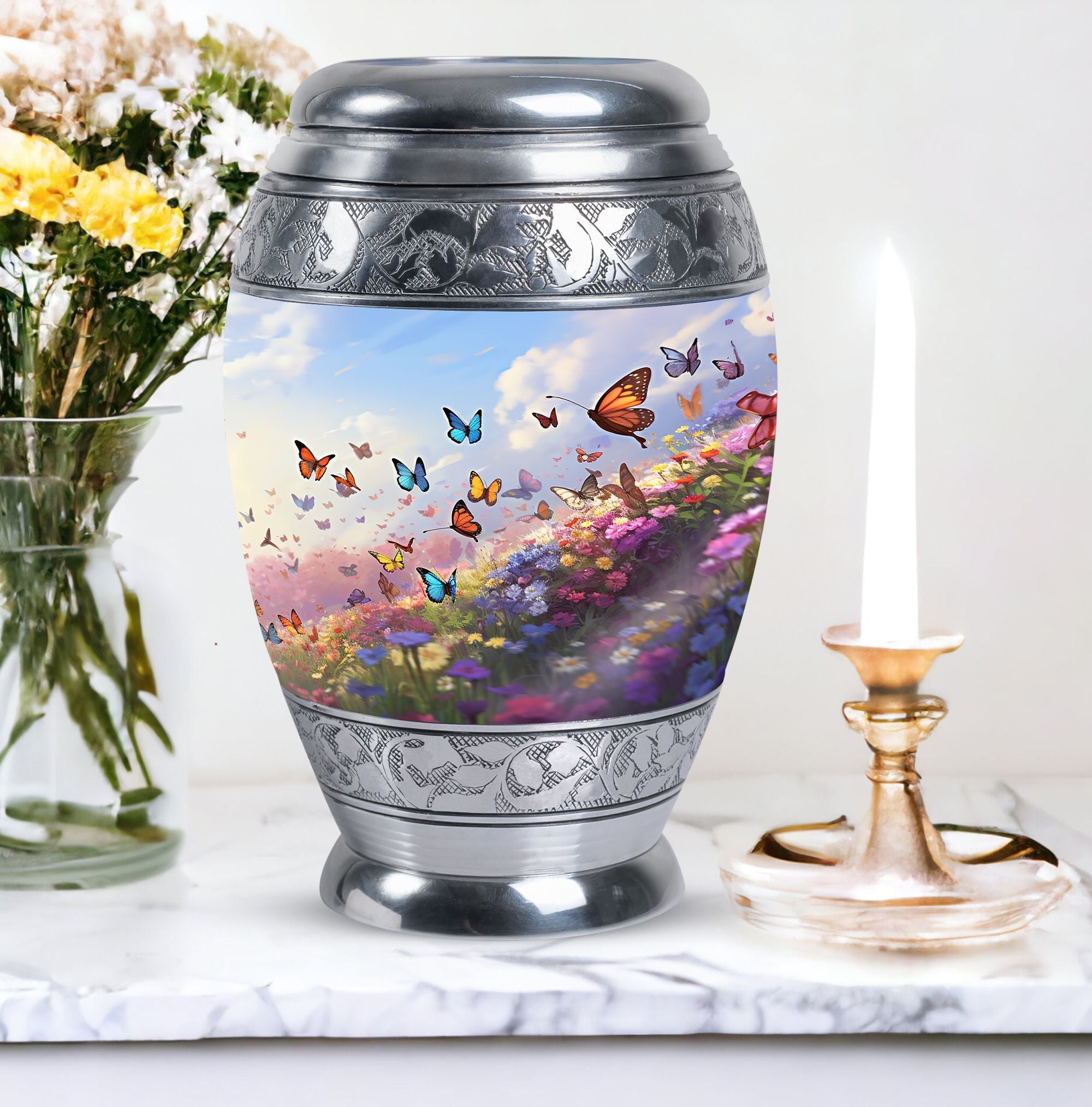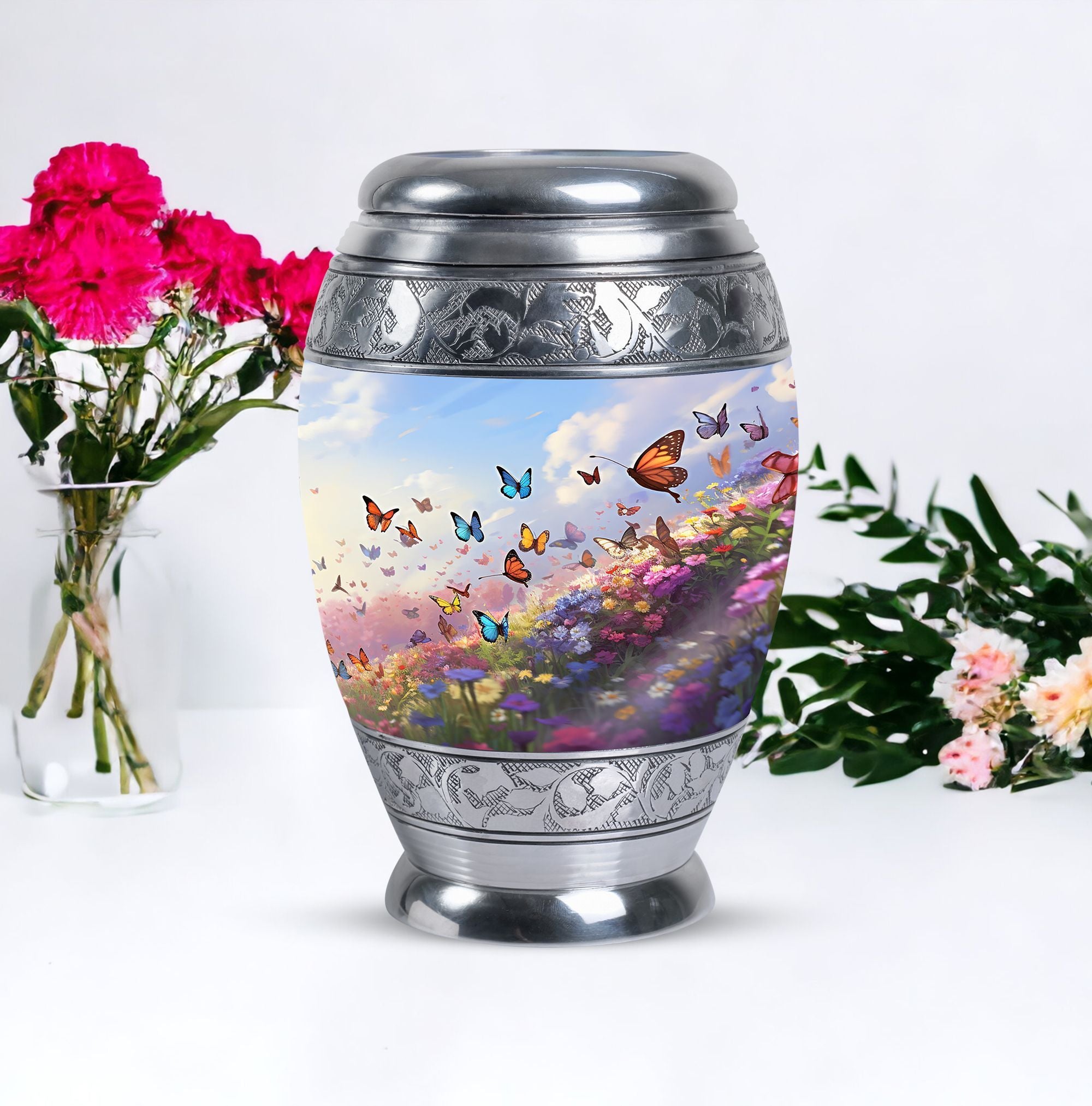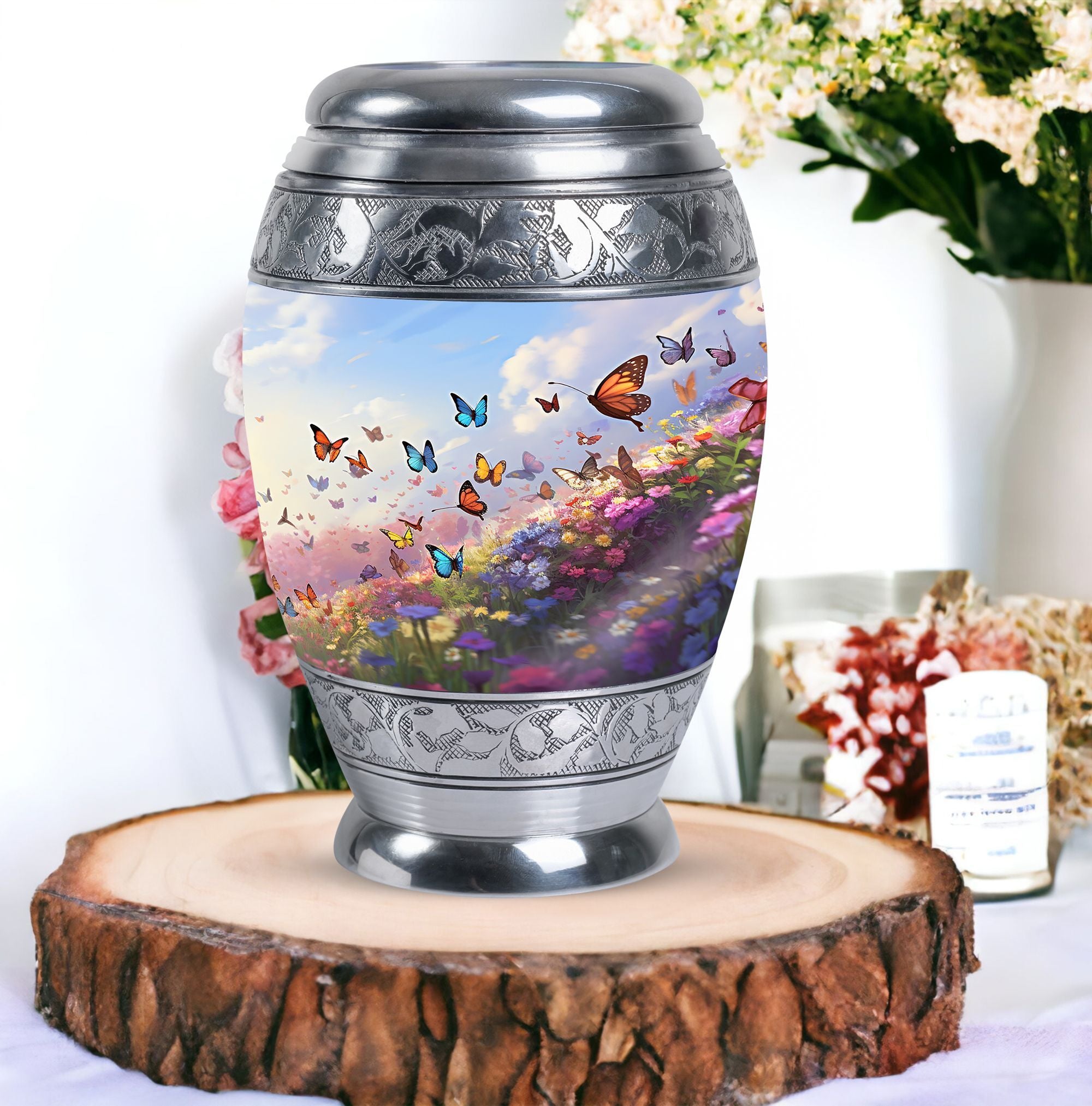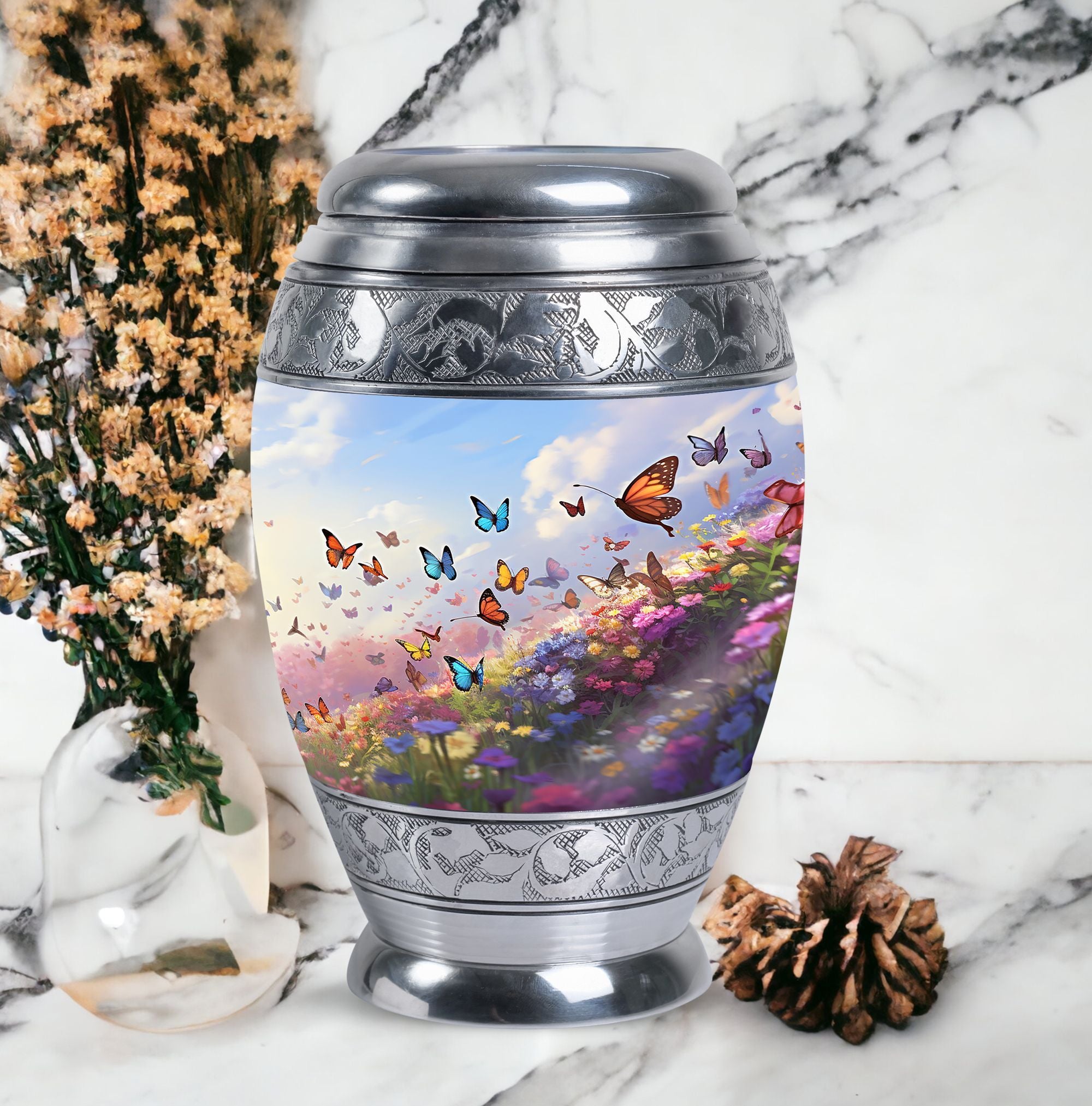 Preserve the memory of a dear one in our Magical Butterfly Cremation Urn. Crafted from durable and strong aluminium, this Large Urn ensures a long-lasting memorial to your loved one. With a size of 3 inches and weighing 3.3 pounds, it features a capacity of up to 200 cubic inches to adequately hold adult ash portions. This urn brings forth a unique blend of beauty and serenity, a fitting tribute to an unforgettable life well-lived. Your purchase includes a velvet pouch for the containment of ashes. What sets this urn apart is the opportunity to personalize it with engraved names, imbuing the urn with profound significance and closeness. This option of customization acts as an intimate touch to this memorial necessity – a thoughtful remembrance. Ideal for seniors who value premium quality urns for ashes for adults. Also perfect for those seeking personalized urns for human ashes, metal cremation urns, burial urns for adults, and cremation urns for human ashes. This urn celebrates a lifetime of precious memories in an unremarkable style fitting for home or cemetery display.