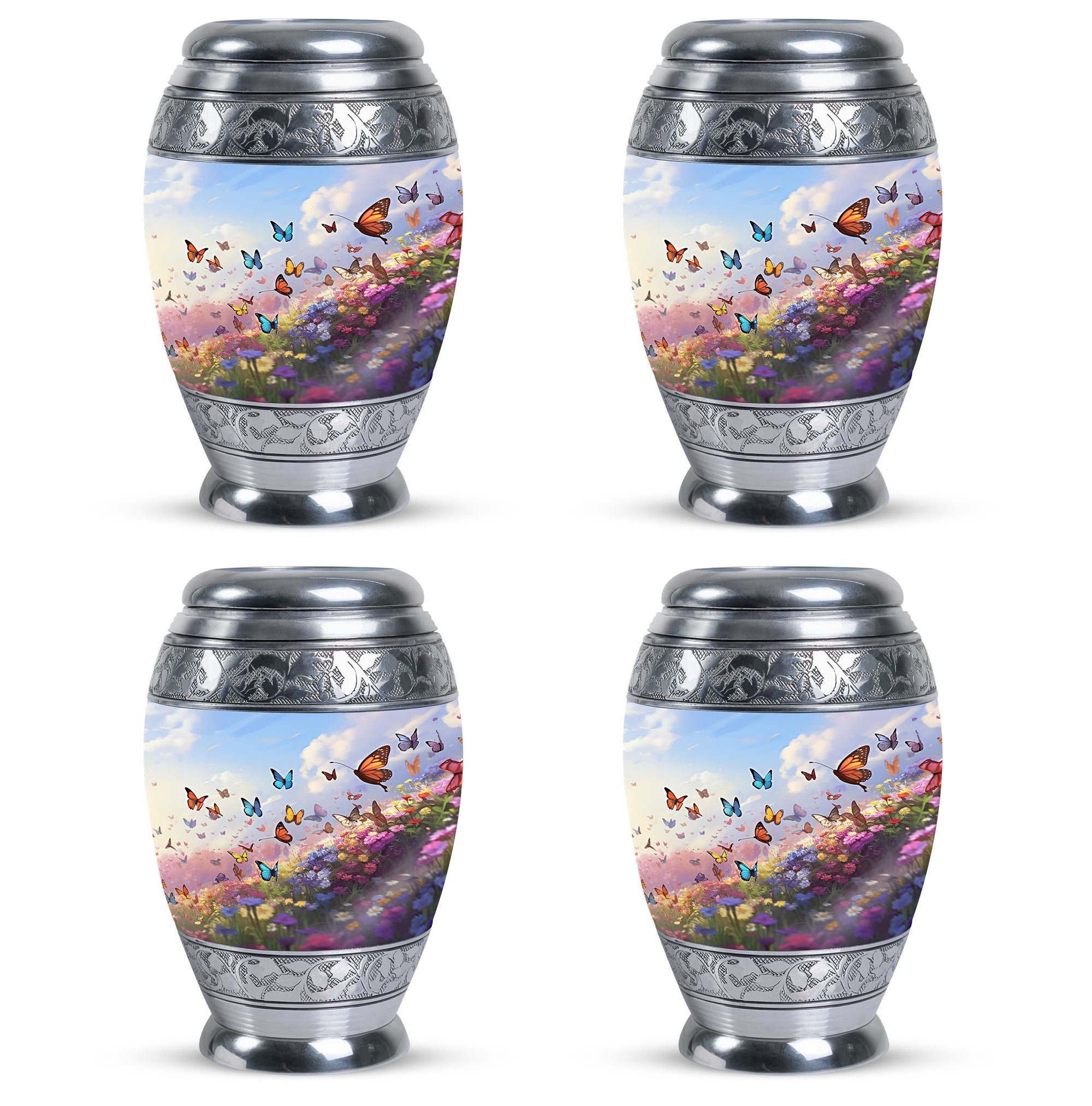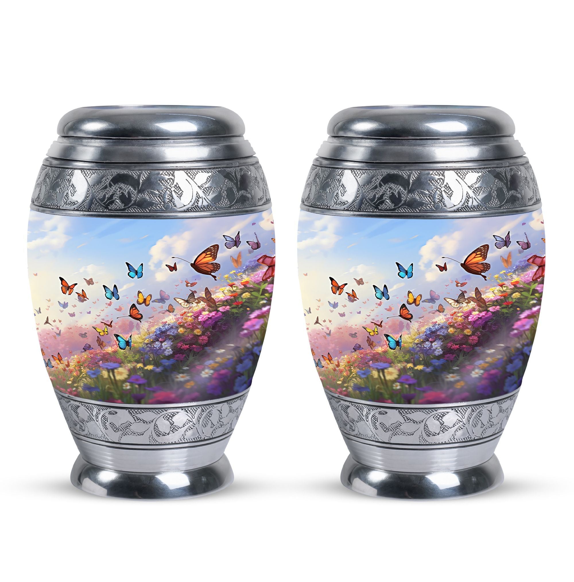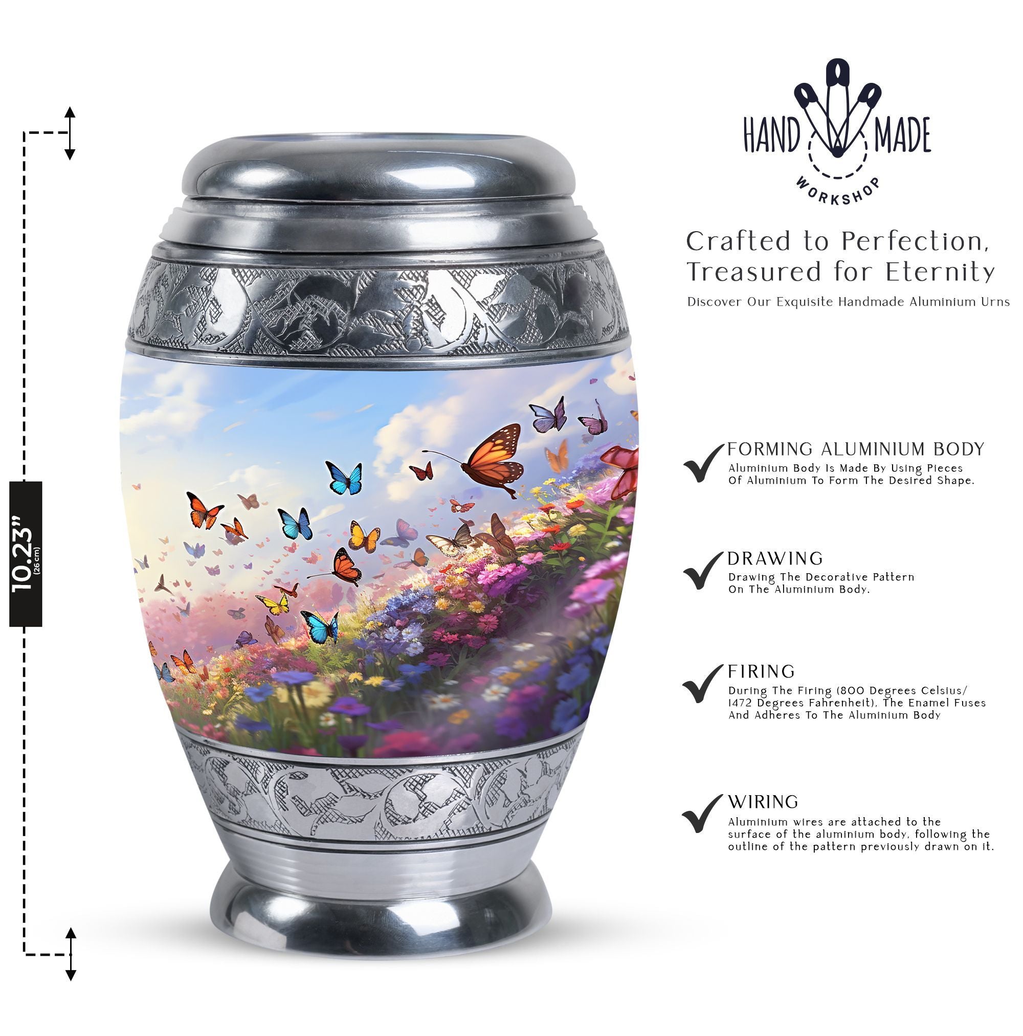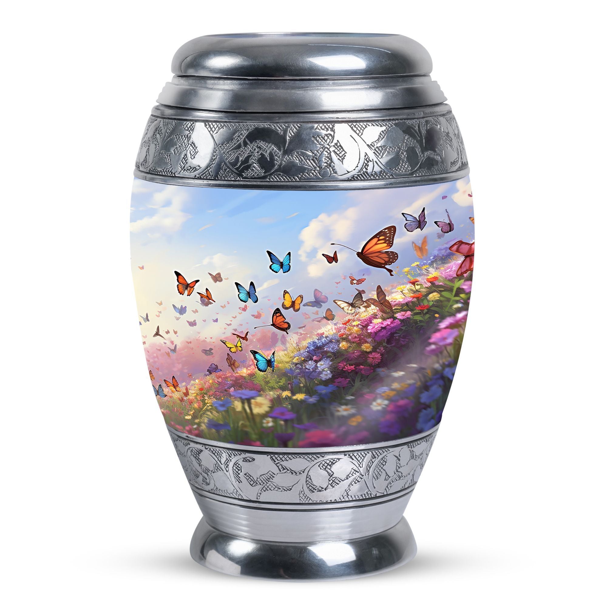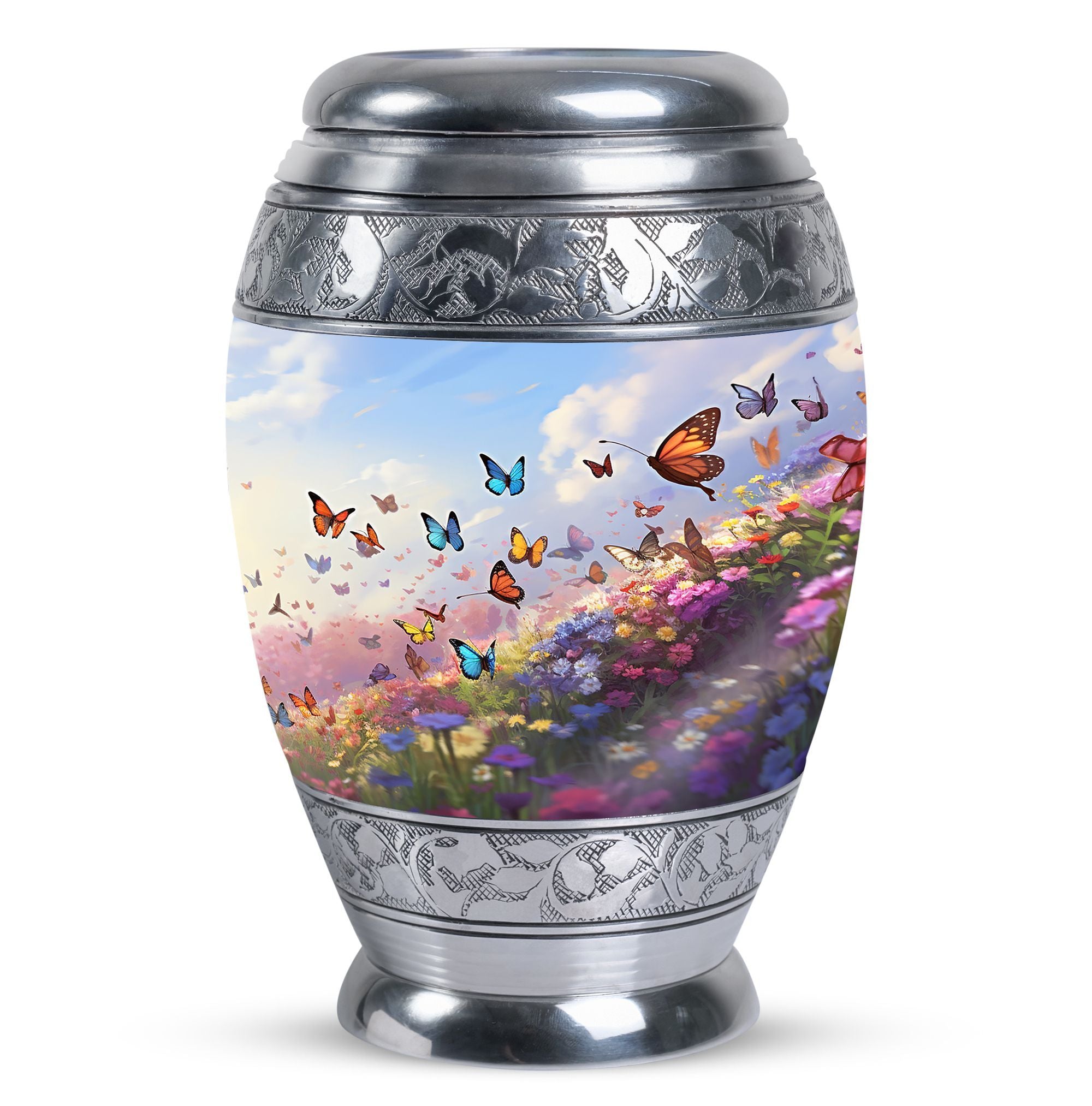 Preserve the memory of a dear one in our Magical Butterfly Cremation Urn. Crafted from durable and strong aluminium, this Large Urn ensures a long-lasting memorial to your loved one. With a size of 3 inches and weighing 3.3 pounds, it features a capacity of up to 200 cubic inches to adequately hold adult ash portions. This urn brings forth a unique blend of beauty and serenity, a fitting tribute to an unforgettable life well-lived. Your purchase includes a velvet pouch for the containment of ashes. What sets this urn apart is the opportunity to personalize it with engraved names, imbuing the urn with profound significance and closeness. This option of customization acts as an intimate touch to this memorial necessity – a thoughtful remembrance. Ideal for seniors who value premium quality urns for ashes for adults. Also perfect for those seeking personalized urns for human ashes, metal cremation urns, burial urns for adults, and cremation urns for human ashes. This urn celebrates a lifetime of precious memories in an unremarkable style fitting for home or cemetery display.