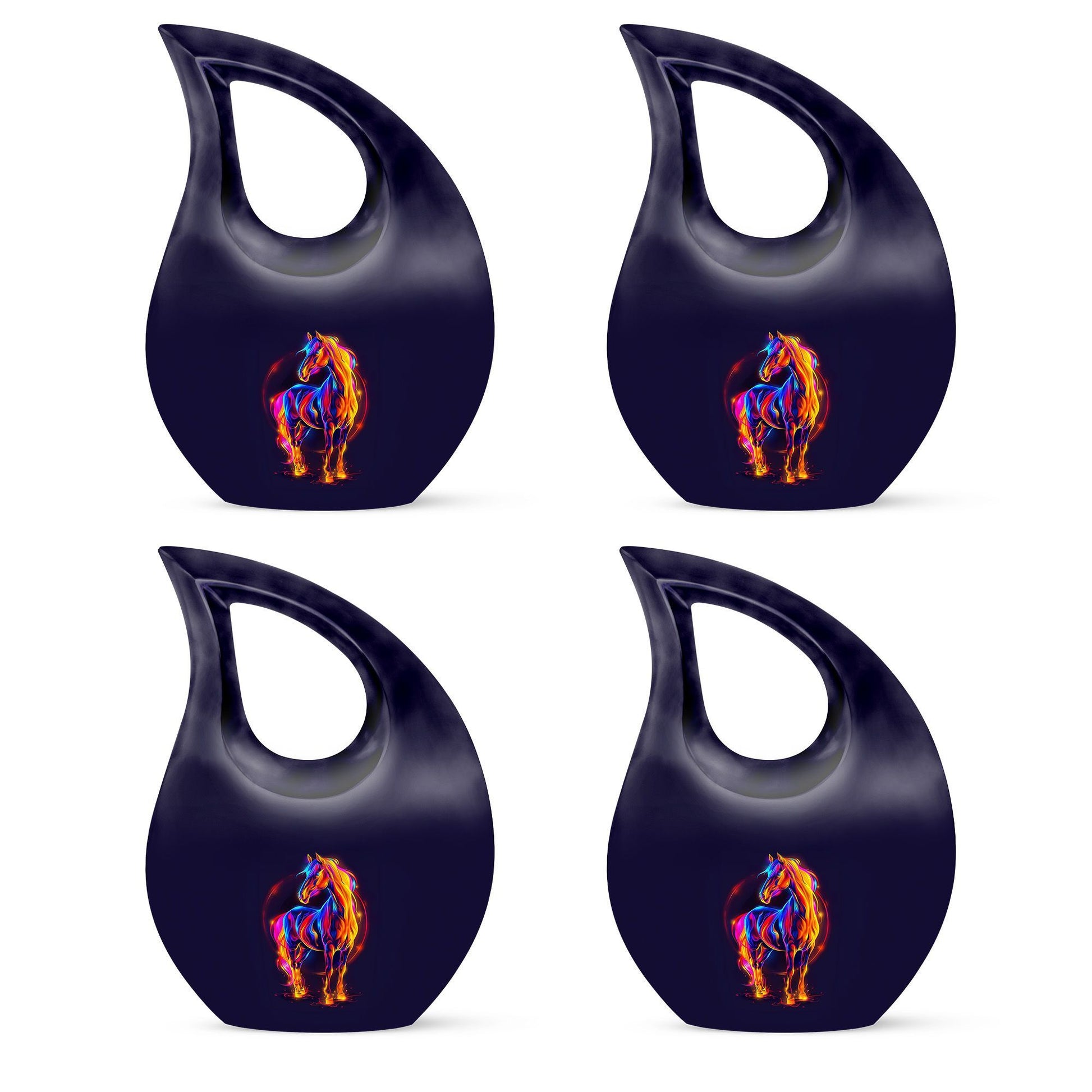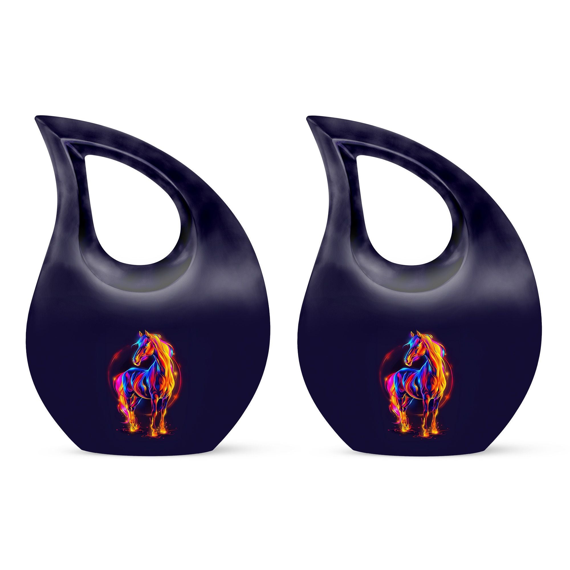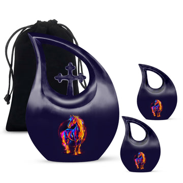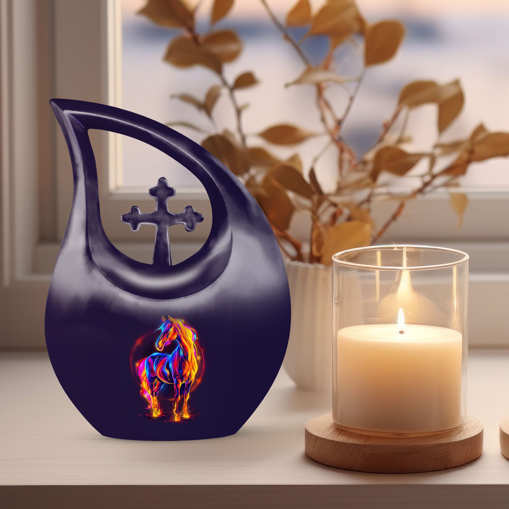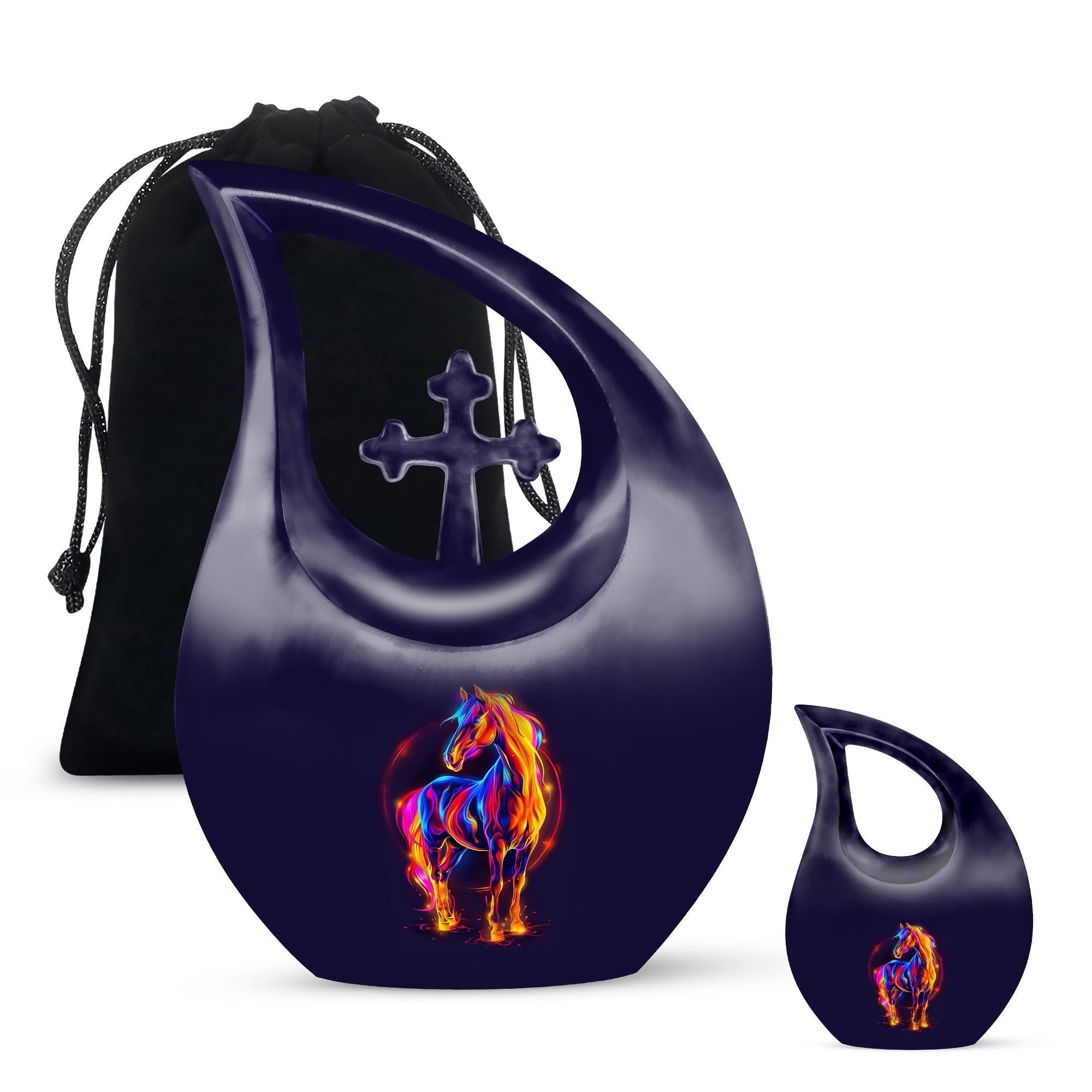 Honor and cherish the memory of a departed loved one with this Large Horse Urn. Crafted from durable and high-quality aluminium, our memorial urn weighs a sturdy 3.3 pounds, stands at an impressive 10 inches in height, and has a capacity of 200 cubic inches. The urn features a unique 'Cross Drop' theme, deeply symbolic and a kind reminder of the enduring spirit of the departed. Included with the urn is a soft velvet pouch, providing a respectful and secure containment for the ashes. Personalize this Medium Size Urn with the engraved names of your loved one, ensuring their memories live on in a truly special way. This urn is more than just a keepsake, it's a testament of unending love and remembrance. It's not just another urn, it's a tribute to a life well-lived. Searching terms like 'Horse Urn', 'Medium Size Urns', 'Keepsake For Ashes For A Man', 'Customized Urns For Ashes For Adults', and 'Personal Urns' will lead you to this significant memorial piece.