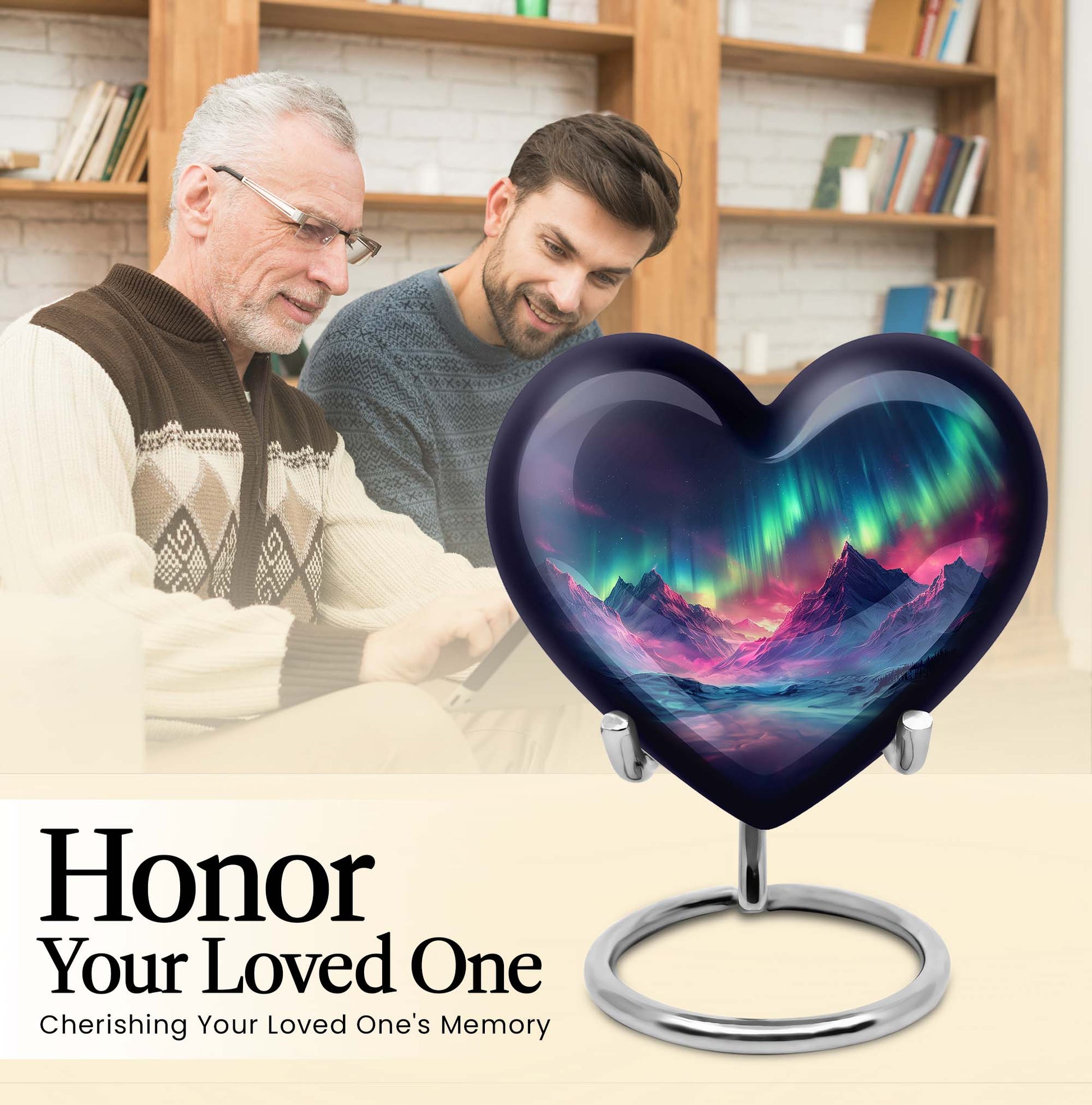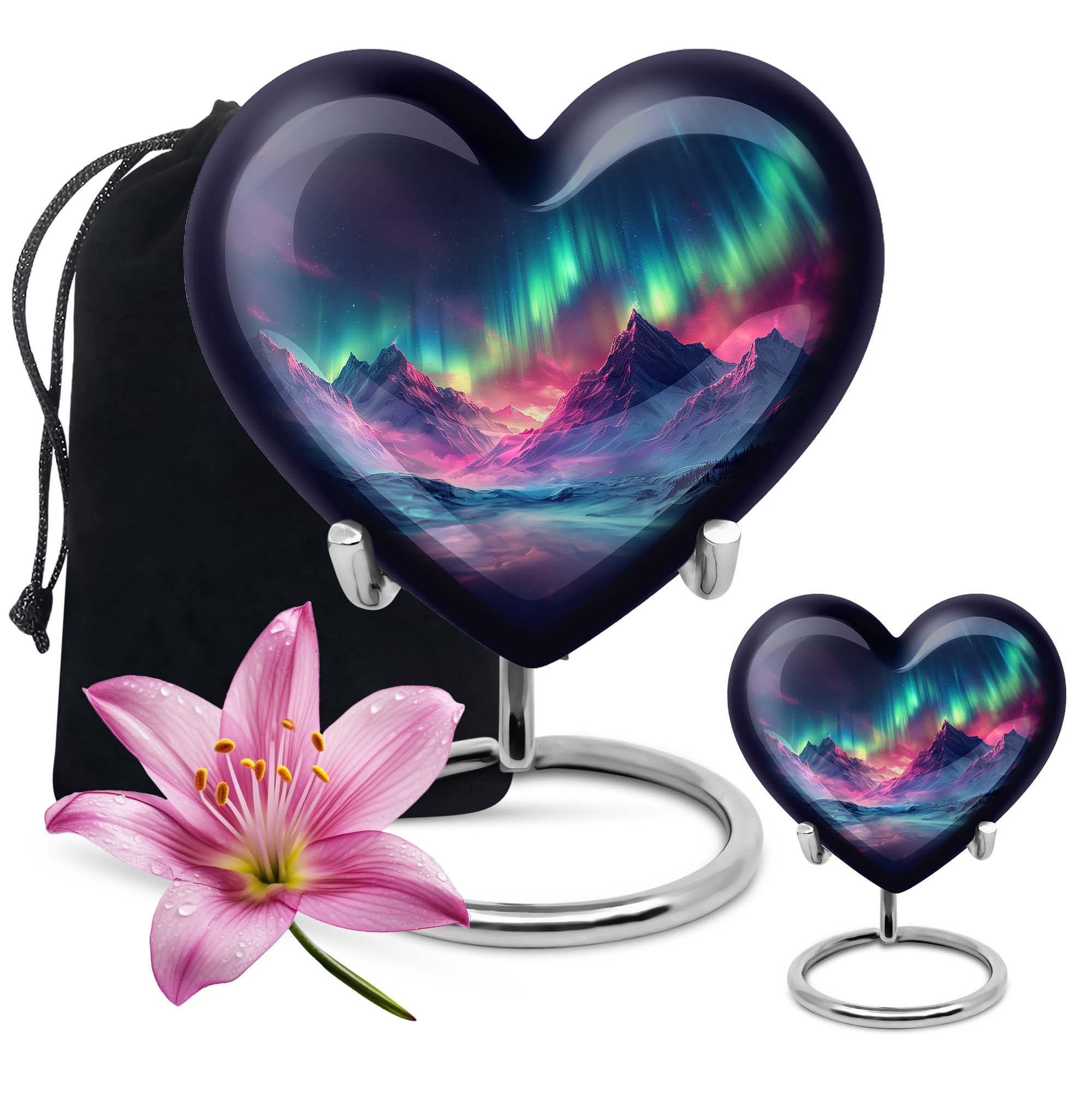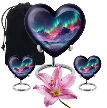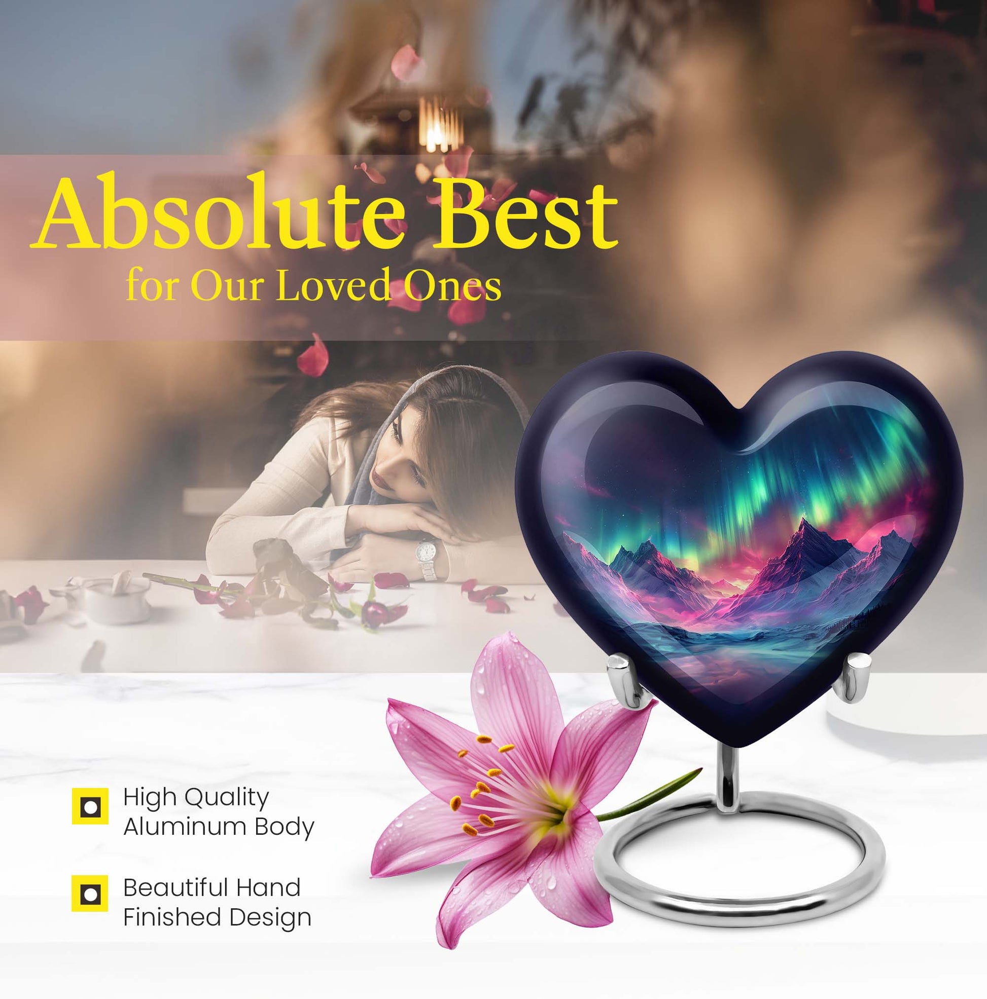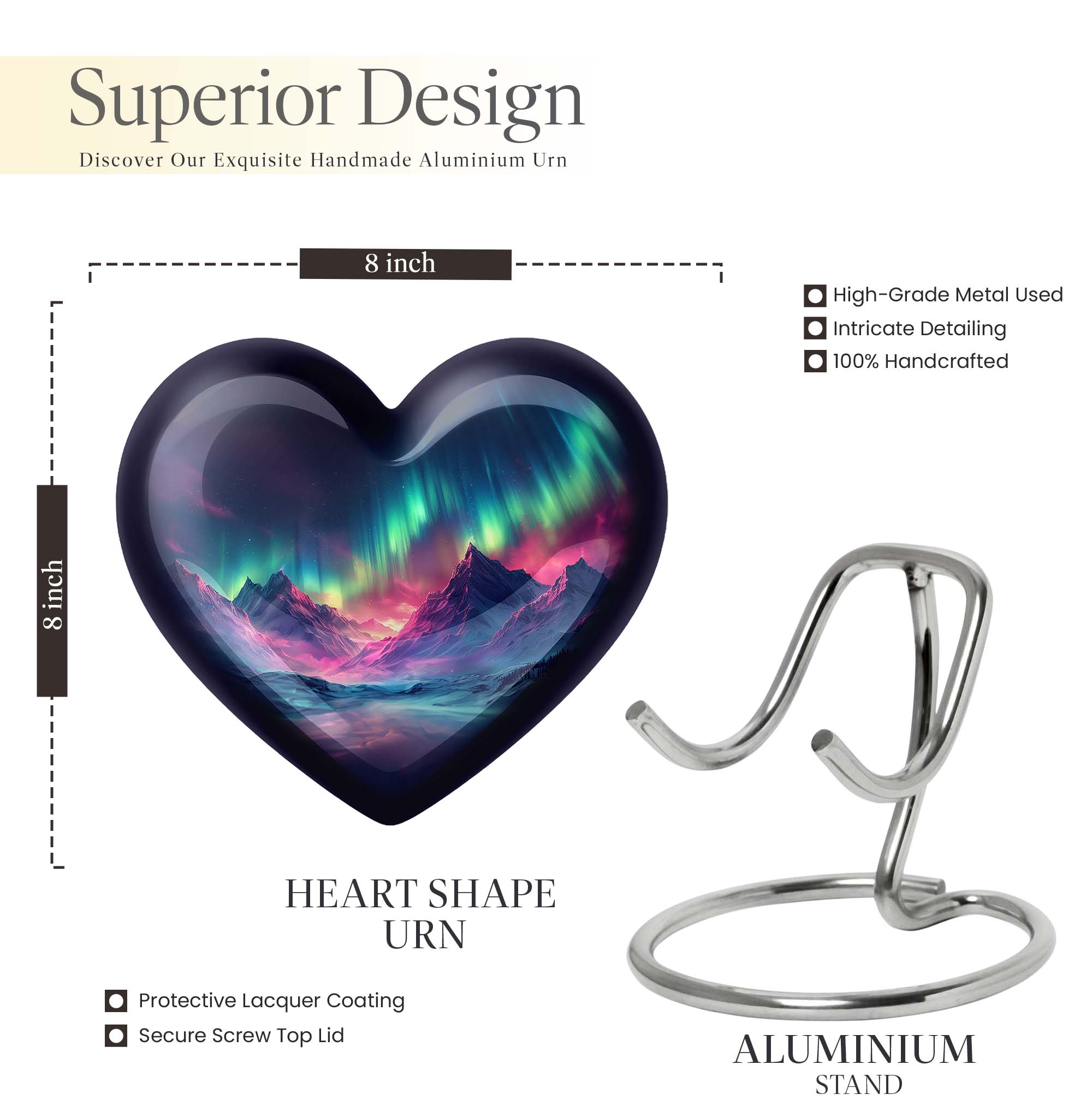 Embrace sentimental value and memorialize your lost loved ones with the Northern Lights Heart Urn, a meticulously crafted funeral urn for females and males. At 10 inches, this durable Aluminium cremation urn features a subtly elegant design, symbolized by a gentle butterfly theme. This large urn is not only an encapsulation of fond memories, but it also serves the practical purpose of holding up to 200 cubic inches of ashes. Each package includes a velvet pouch for the dignified containment of the ashes. With a weight of 3.3 pounds and sturdily built, this cremation urn is easy to handle and maintain, enhancing its reliability. Plus, it offers a unique opportunity for customization - personalize it with engraved names to make it a heart-touching tribute. Elegant and tasteful, it's more than just an adult cremation urn; it's a symbol of cherished moments and enduring love.