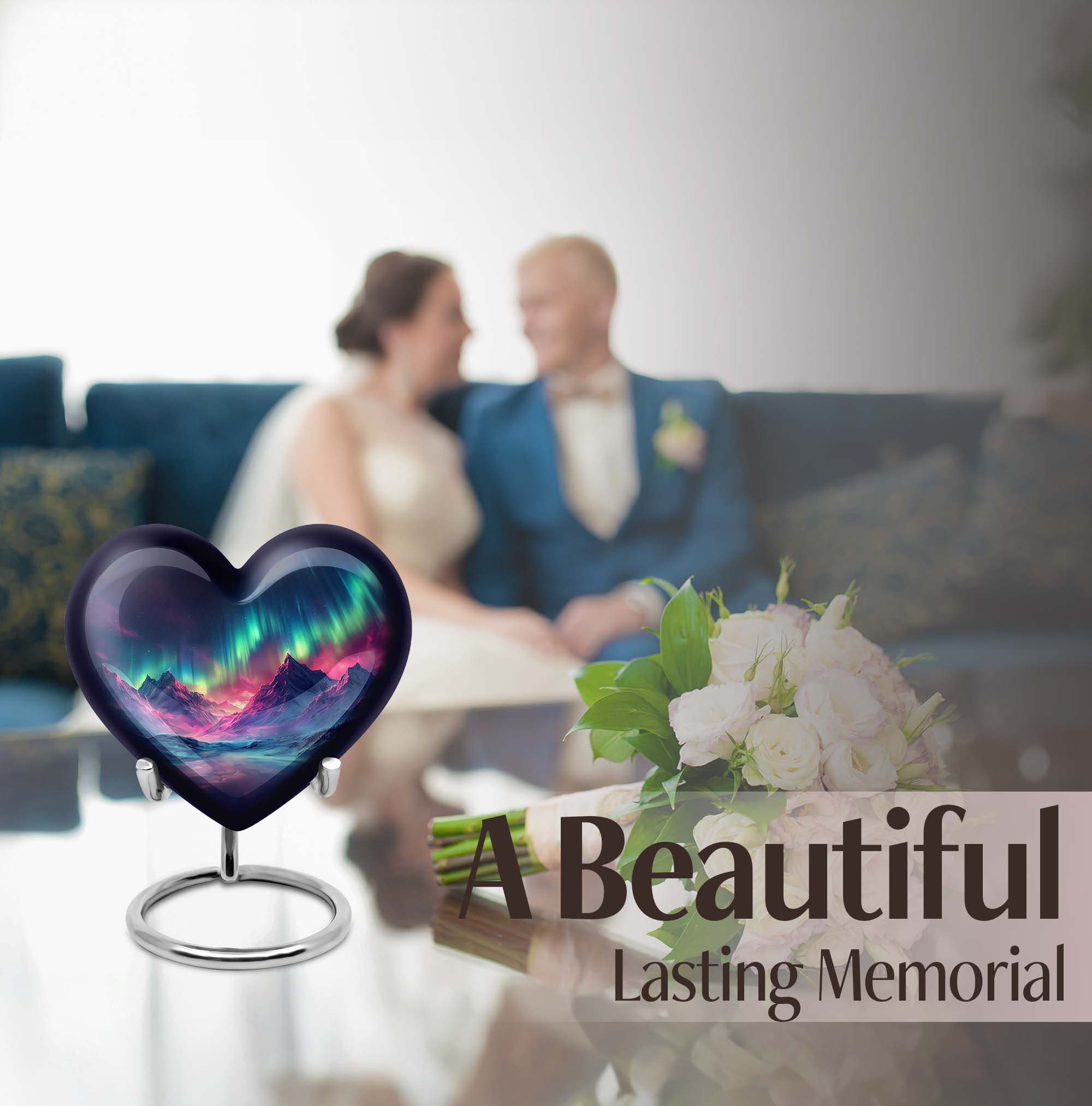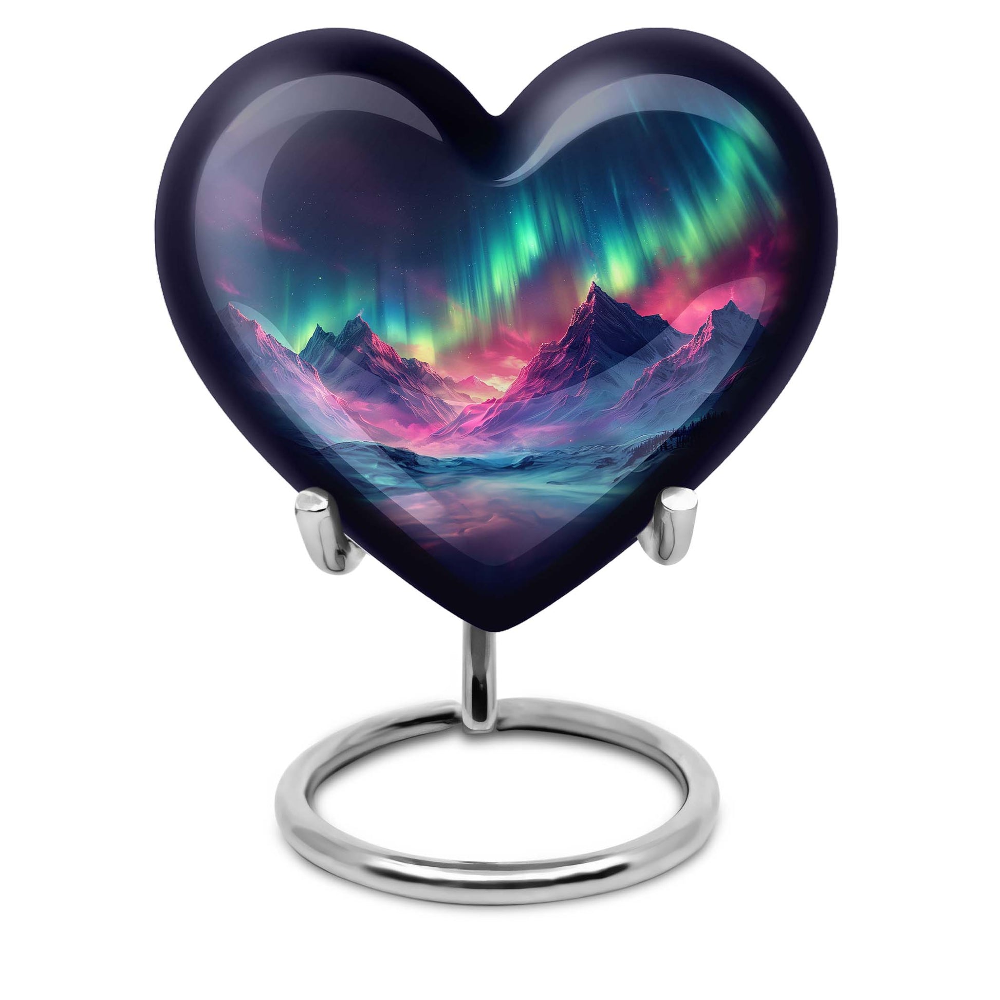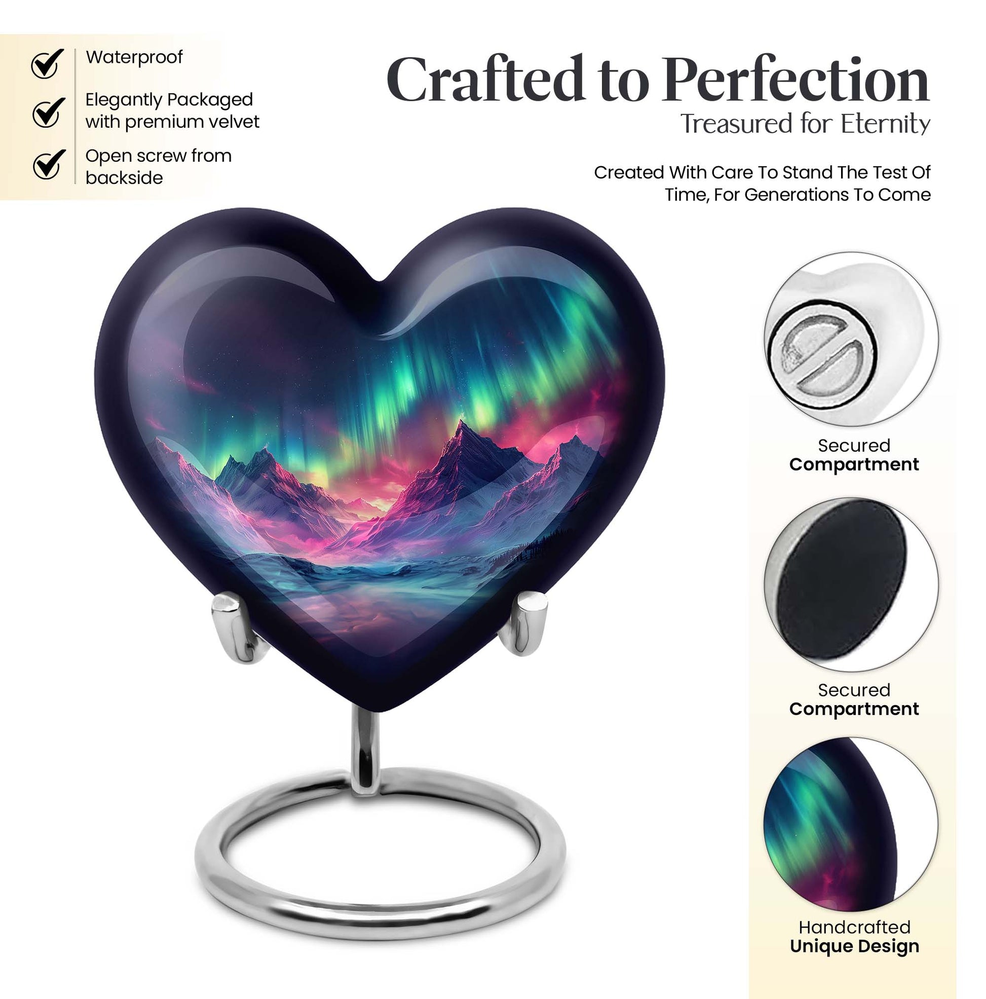 Embrace sentimental value and memorialize your lost loved ones with the Northern Lights Heart Urn, a meticulously crafted funeral urn for females and males. At 10 inches, this durable Aluminium cremation urn features a subtly elegant design, symbolized by a gentle butterfly theme. This large urn is not only an encapsulation of fond memories, but it also serves the practical purpose of holding up to 200 cubic inches of ashes. Each package includes a velvet pouch for the dignified containment of the ashes. With a weight of 3.3 pounds and sturdily built, this cremation urn is easy to handle and maintain, enhancing its reliability. Plus, it offers a unique opportunity for customization - personalize it with engraved names to make it a heart-touching tribute. Elegant and tasteful, it's more than just an adult cremation urn; it's a symbol of cherished moments and enduring love.