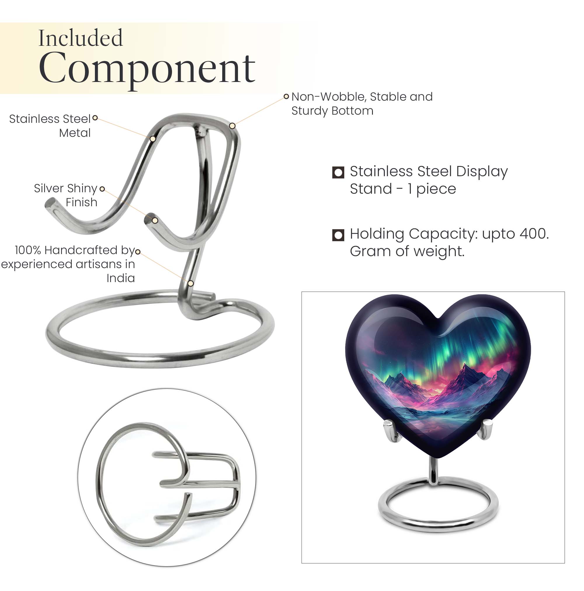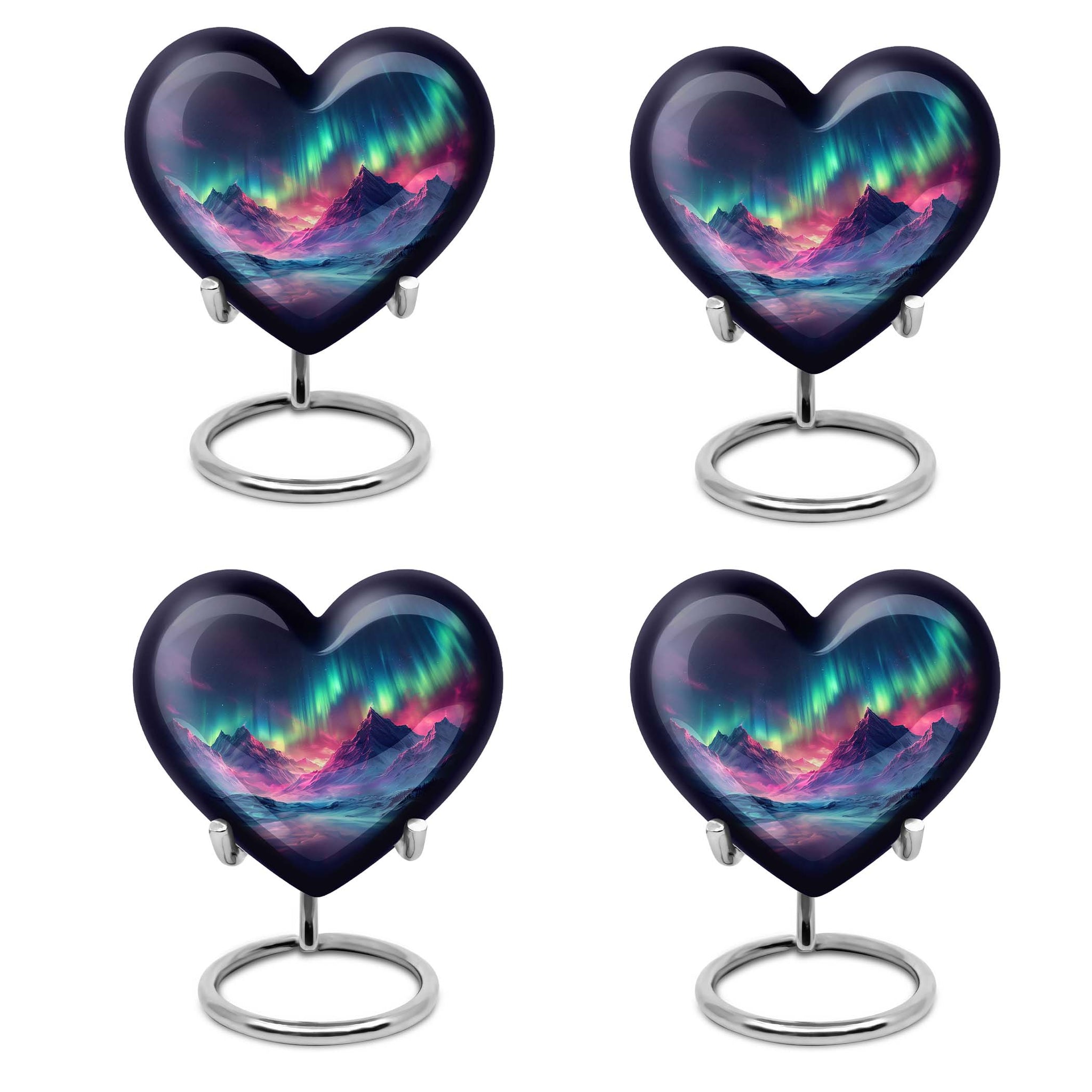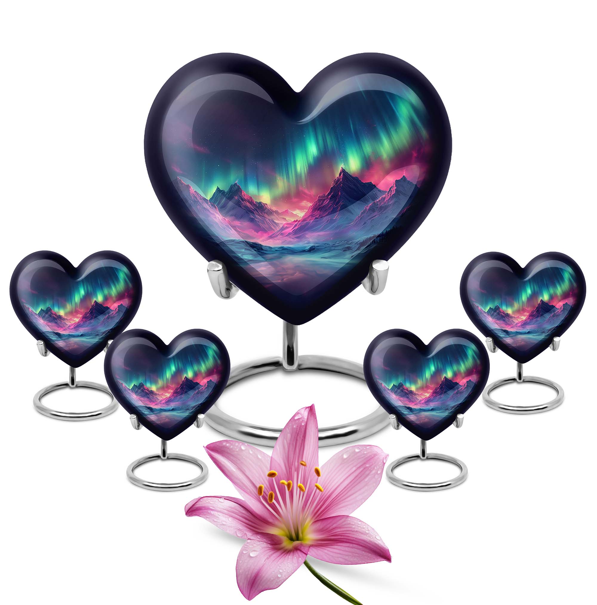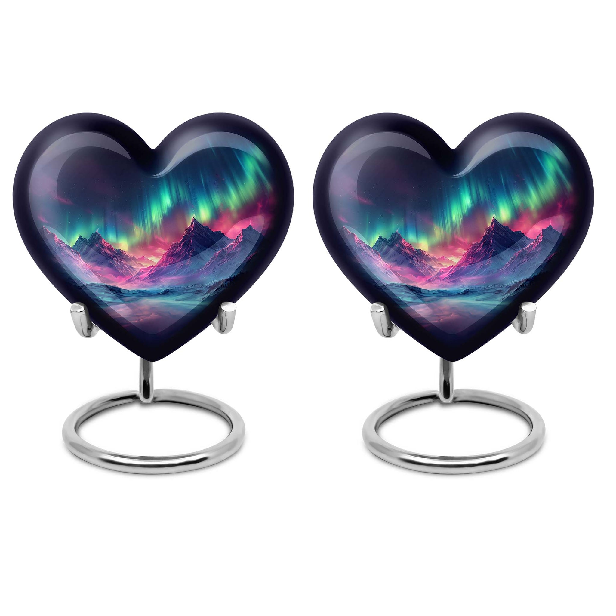 Embrace sentimental value and memorialize your lost loved ones with the Northern Lights Heart Urn, a meticulously crafted funeral urn for females and males. At 10 inches, this durable Aluminium cremation urn features a subtly elegant design, symbolized by a gentle butterfly theme. This large urn is not only an encapsulation of fond memories, but it also serves the practical purpose of holding up to 200 cubic inches of ashes. Each package includes a velvet pouch for the dignified containment of the ashes. With a weight of 3.3 pounds and sturdily built, this cremation urn is easy to handle and maintain, enhancing its reliability. Plus, it offers a unique opportunity for customization - personalize it with engraved names to make it a heart-touching tribute. Elegant and tasteful, it's more than just an adult cremation urn; it's a symbol of cherished moments and enduring love.