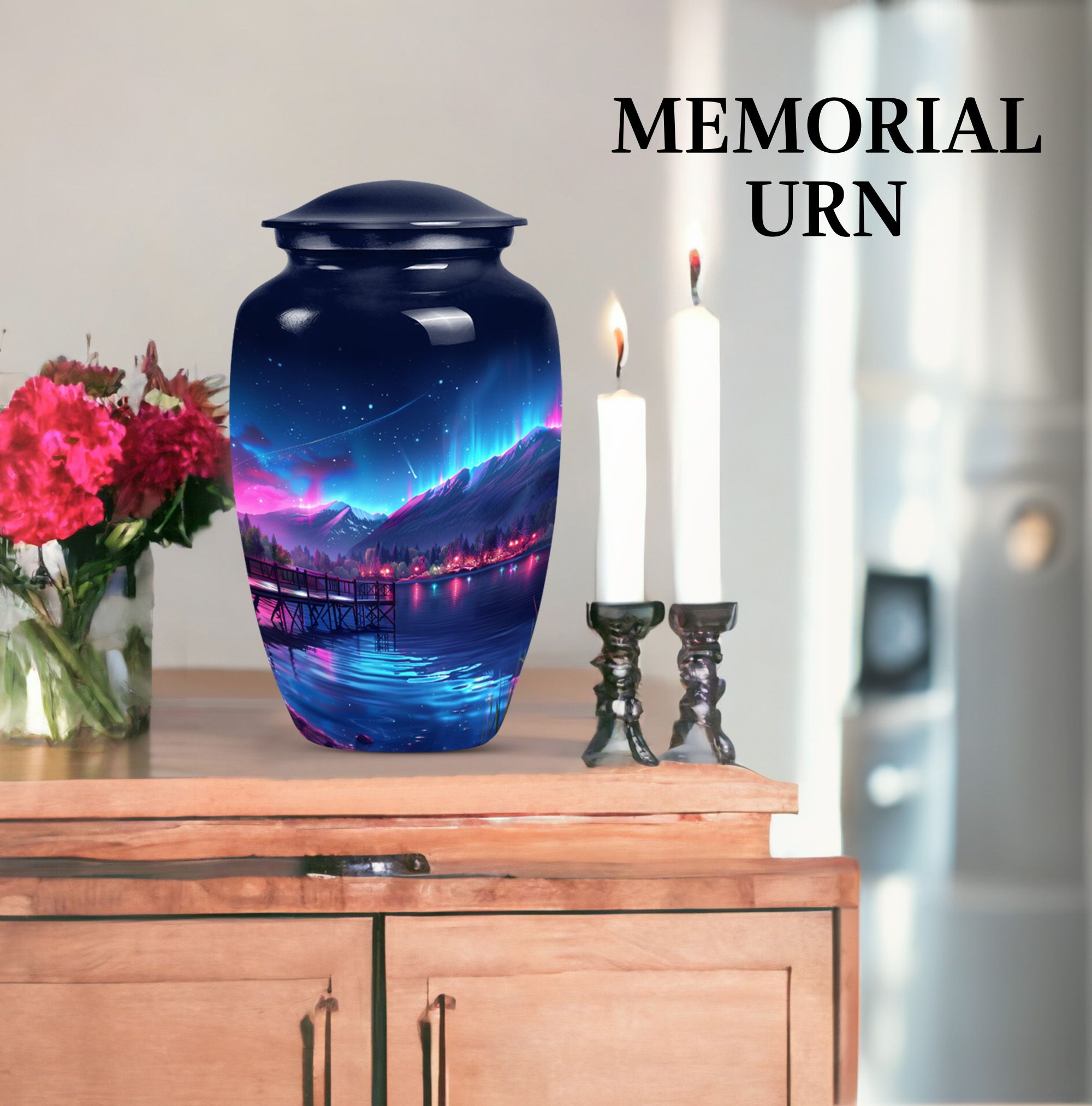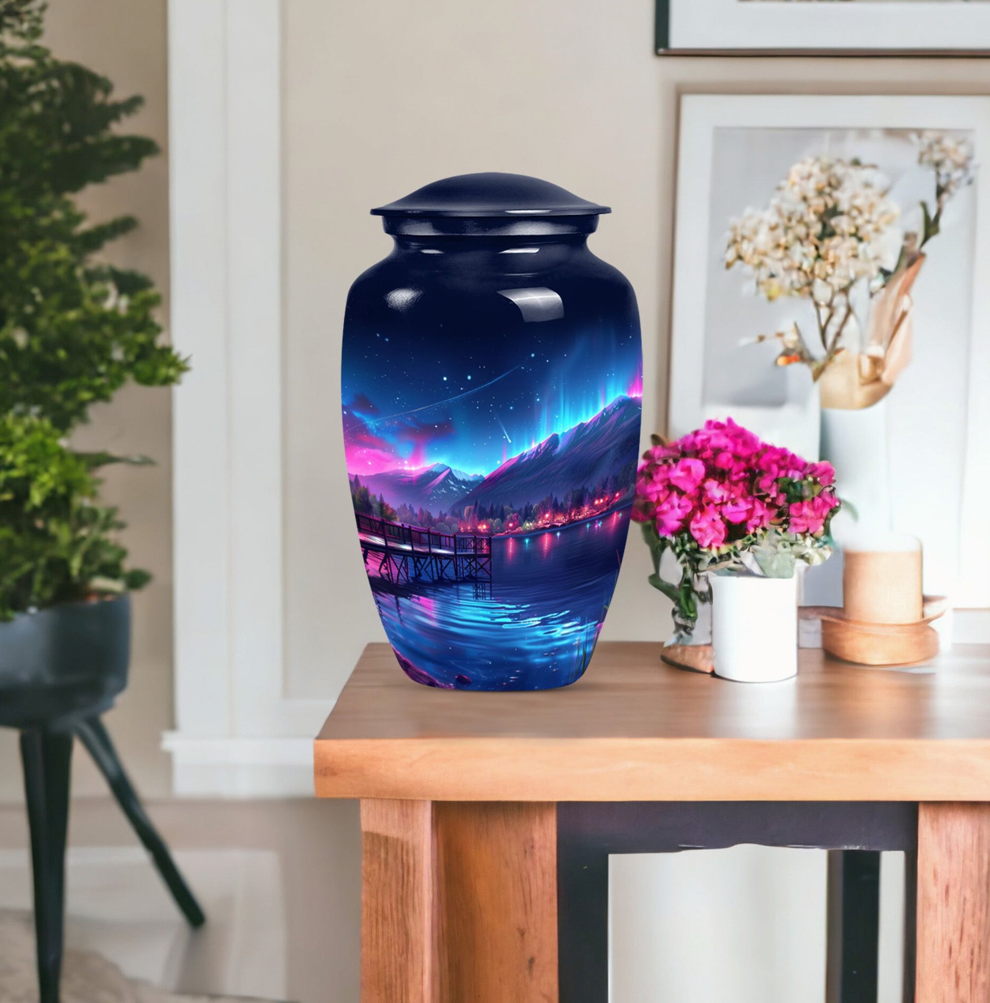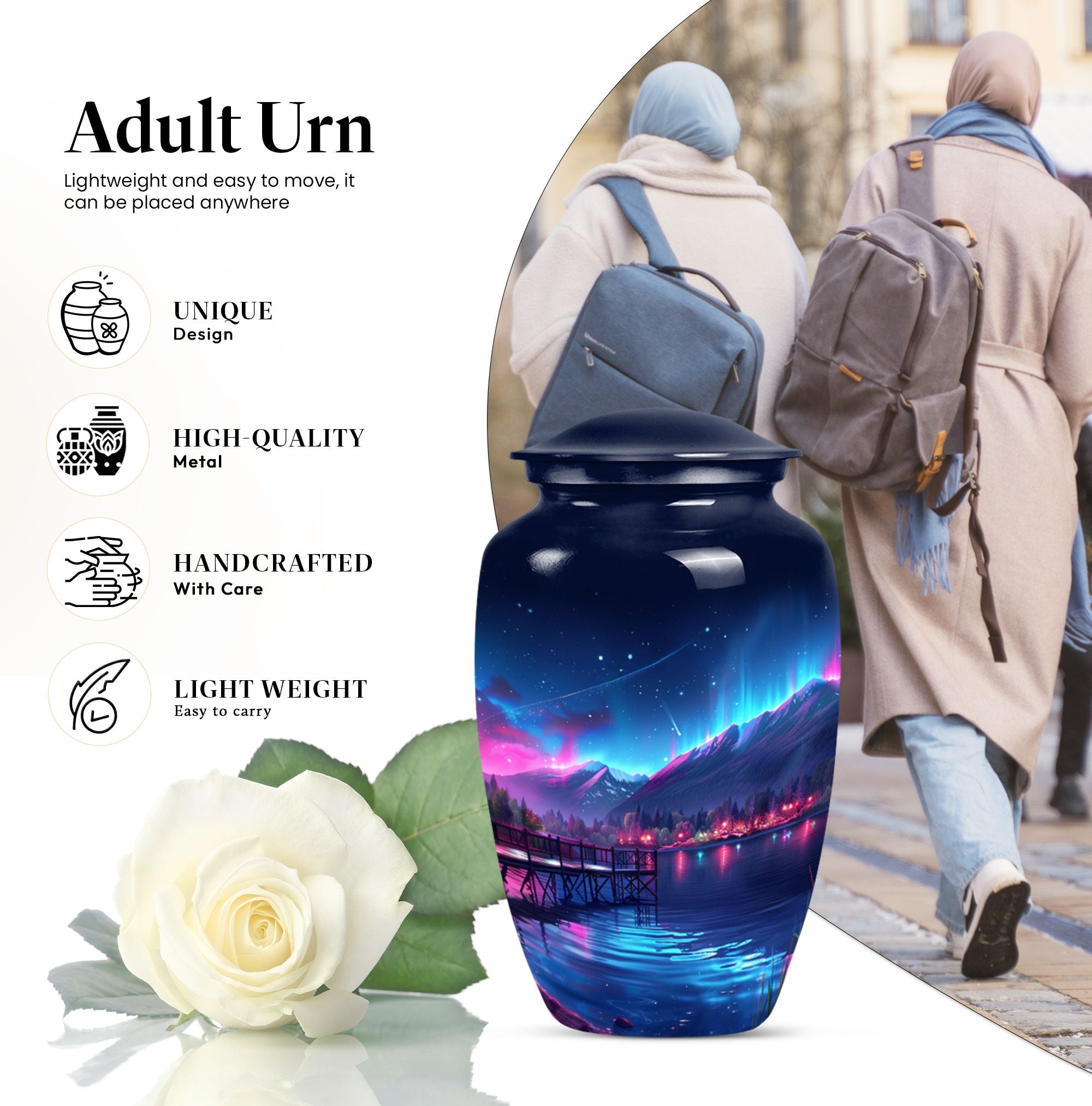 Experience the serene allure of our Northern Lights memorial urn, designed for honoring the memory of your loved ones. Fashioned from resilient aluminium, the large urn boasts a size of 10 inches and a weight of 3.3 pounds, offering a comforting symbol of sturdiness. It possesses a compelling thematic butterfly element reflecting peace and transformation. Having a capacity to secure 200 cubic inches of ashes, it accommodates adult human ashes without any hassles. Each unit includes a soft velvet pouch ensuring that you handle the remembrances of your dearest ones with the respect and care they deserve. The urn offers a beautiful possibility for personalization, allowing you to engrave the names of your departed dear ones upon its surface. It’s an elegant metal urn for both men and women's ashes, skillfully crafted to become an enduring tribute to those revered. Safe and poignant, our memorial urns imbue a gentle serenity into cherished memories. Suitable for en locale, celebrate life by preserving memories with warmth, care, and dignity.