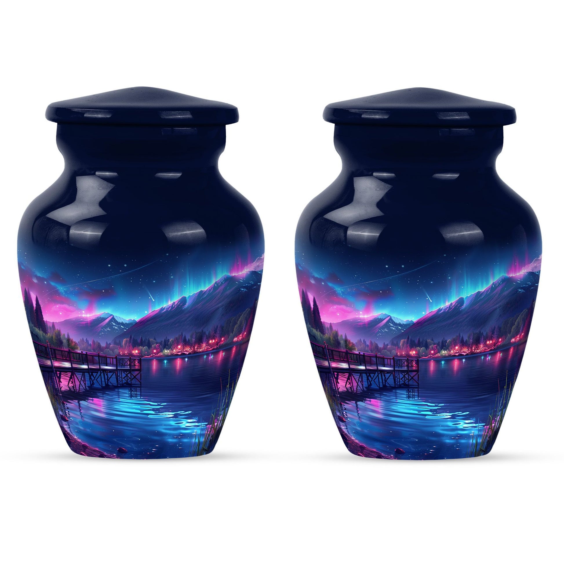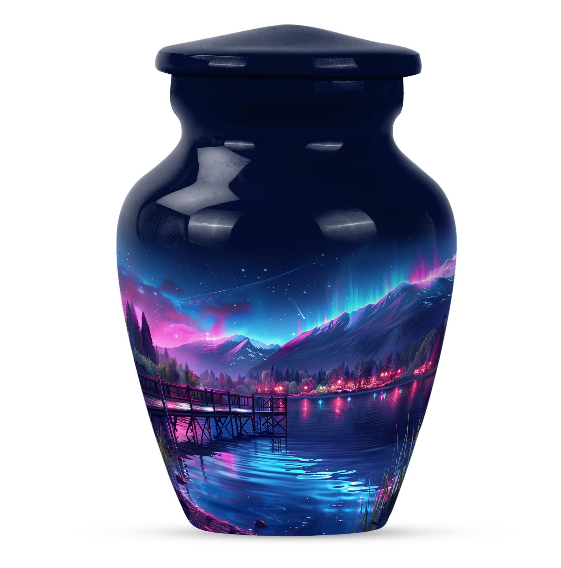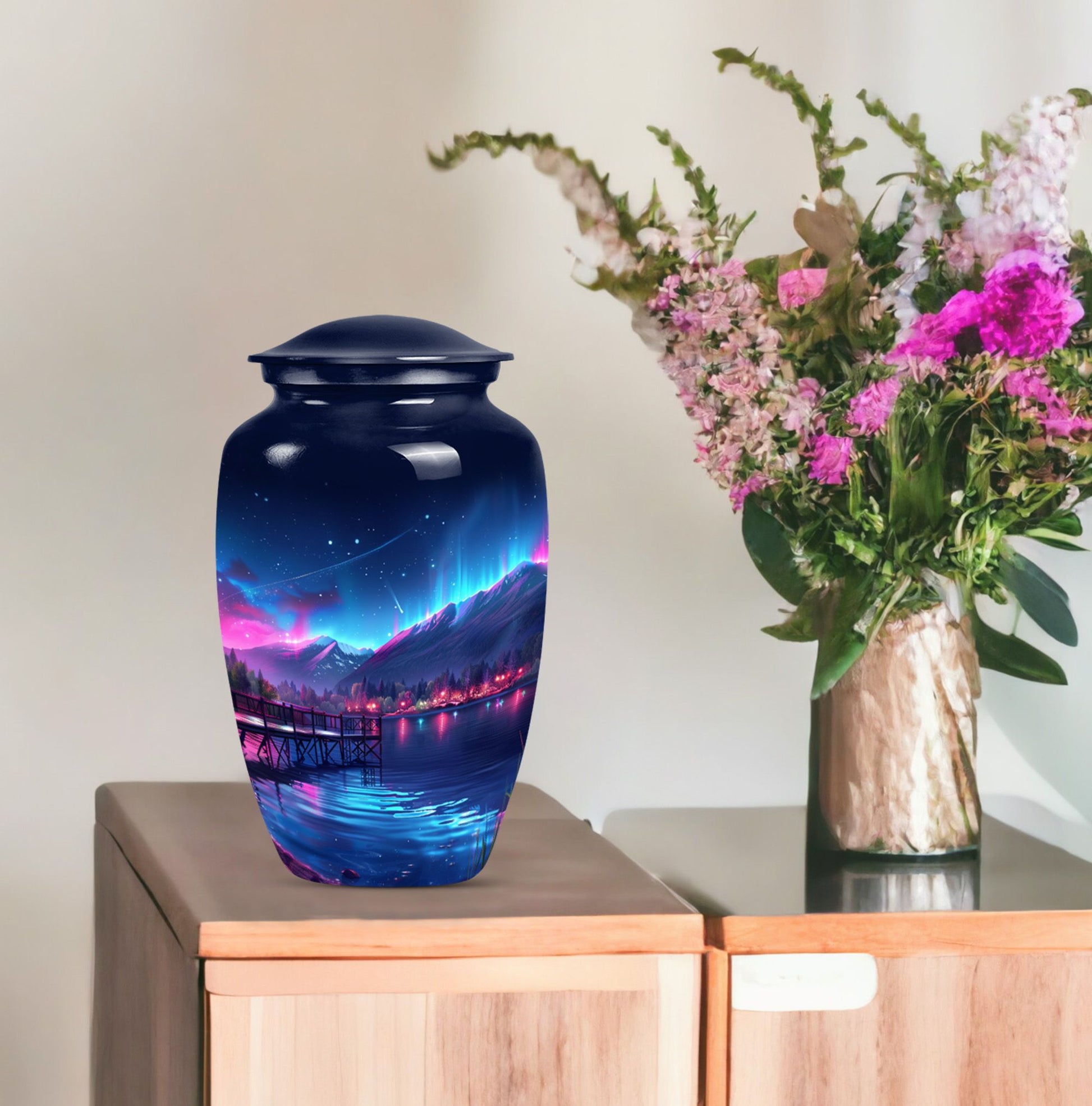 Experience the serene allure of our Northern Lights memorial urn, designed for honoring the memory of your loved ones. Fashioned from resilient aluminium, the large urn boasts a size of 10 inches and a weight of 3.3 pounds, offering a comforting symbol of sturdiness. It possesses a compelling thematic butterfly element reflecting peace and transformation. Having a capacity to secure 200 cubic inches of ashes, it accommodates adult human ashes without any hassles. Each unit includes a soft velvet pouch ensuring that you handle the remembrances of your dearest ones with the respect and care they deserve. The urn offers a beautiful possibility for personalization, allowing you to engrave the names of your departed dear ones upon its surface. It’s an elegant metal urn for both men and women's ashes, skillfully crafted to become an enduring tribute to those revered. Safe and poignant, our memorial urns imbue a gentle serenity into cherished memories. Suitable for en locale, celebrate life by preserving memories with warmth, care, and dignity.