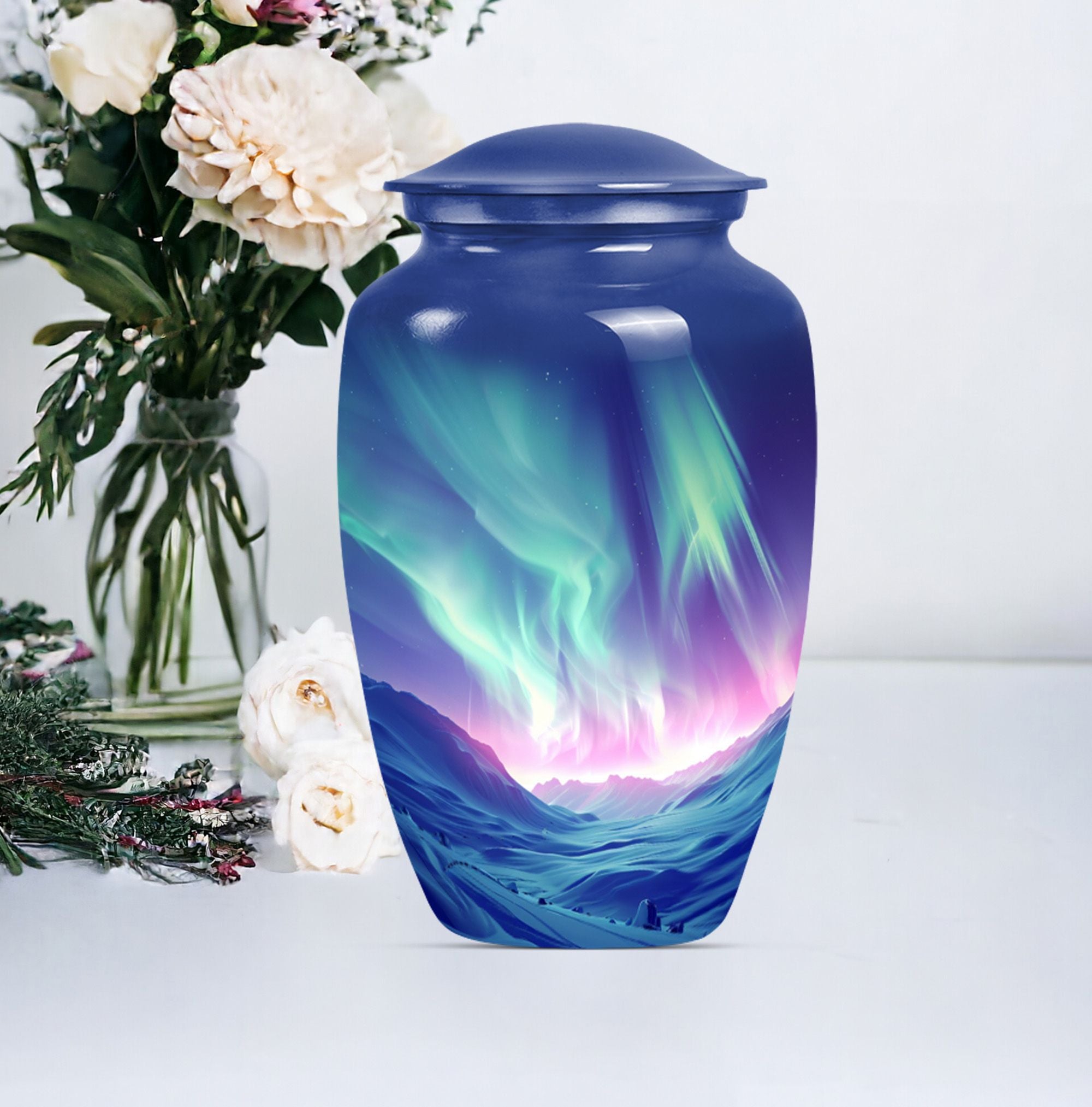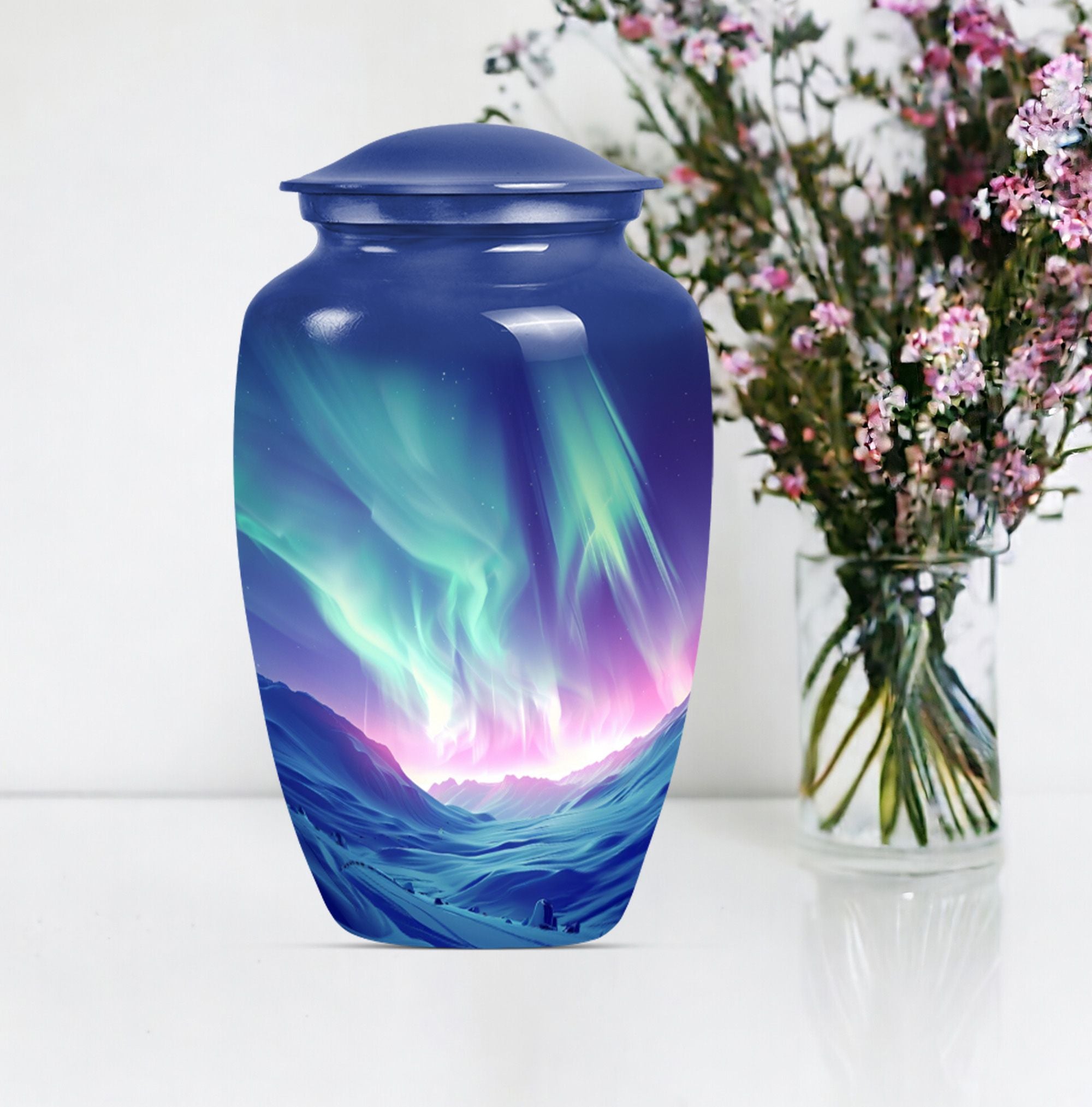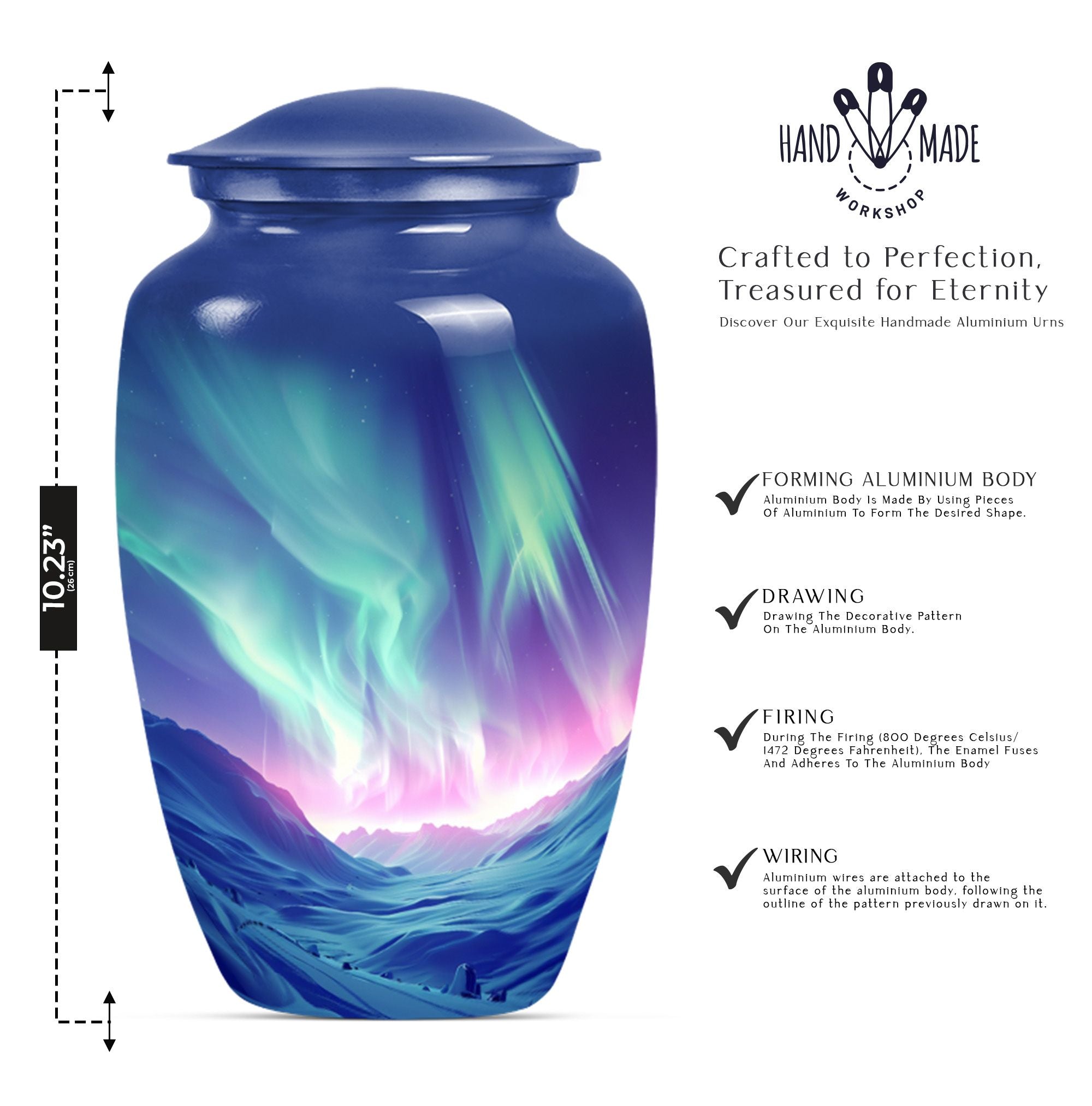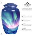 Honor the memory of your loved ones with our Northern Lights Urn, an embodiment of dignity and respect, love and remembrance. This 10-inch high urn, characterized by its abstract theme, is meticulously crafted from durable aluminium, ideal for seniors desiring an enduring and significant memorial for their loved ones. Weighing a modest 3.3 pounds, this large urn for ashes showcases an impressive capacity of 200 cubic inches, effortlessly holding up the ashes of the departed. The urn comes with a velvet pouch, ensuring a secure and discreet containment of your loved ones’ ashes. Moreover, our unique and rare northern lights urn offers customization options, allowing you to personalize this timeless keepsake with engraved names, adding a one-of-a-kind touch. Appreciated as a thoughtful memorial gift or as a purposeful addition to a personal collection, this classic urn resonates with sentiments of respect and remembrance. Keywords: Northern lights urn, burial large urn for ashes for women, memorial urns, burial cremation urns for adult women, cremation urn urn man, memorial gifts, large double cremation urn for two adults.