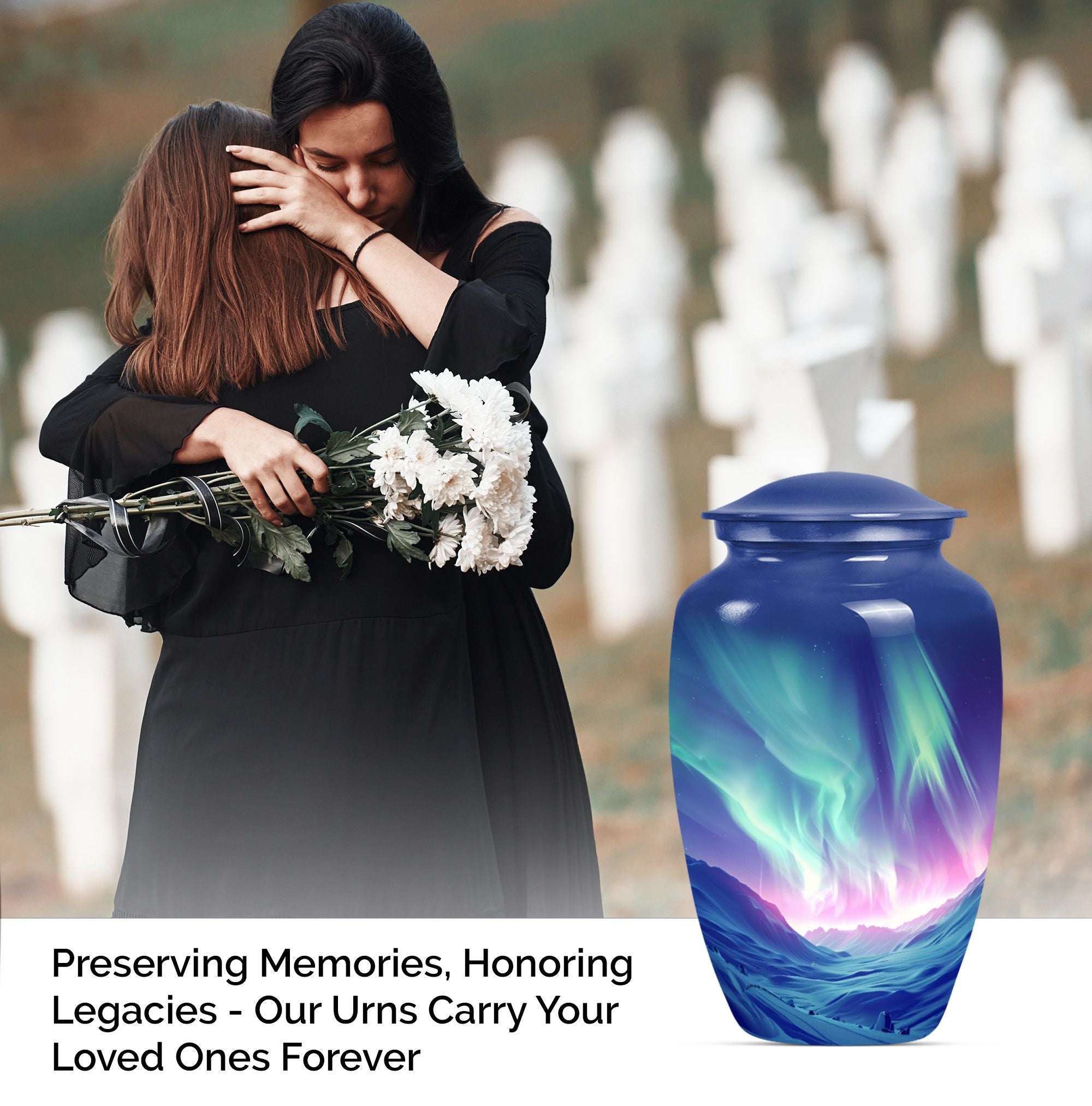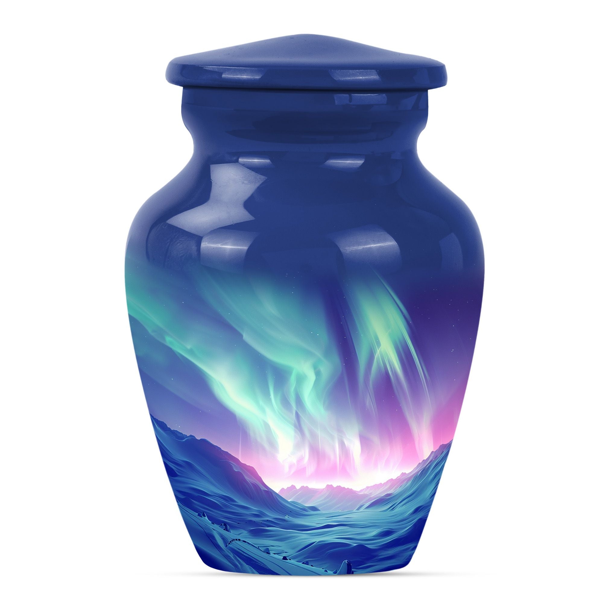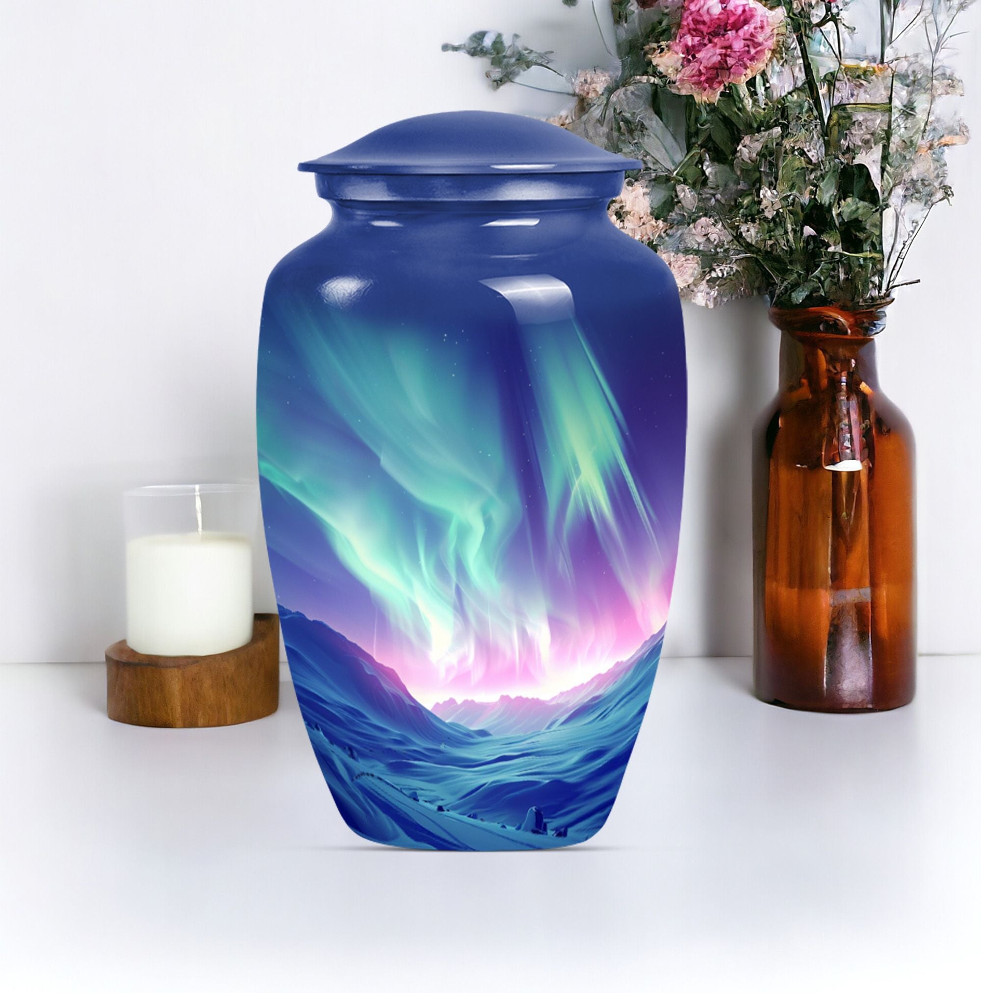 Honor the memory of your loved ones with our Northern Lights Urn, an embodiment of dignity and respect, love and remembrance. This 10-inch high urn, characterized by its abstract theme, is meticulously crafted from durable aluminium, ideal for seniors desiring an enduring and significant memorial for their loved ones. Weighing a modest 3.3 pounds, this large urn for ashes showcases an impressive capacity of 200 cubic inches, effortlessly holding up the ashes of the departed. The urn comes with a velvet pouch, ensuring a secure and discreet containment of your loved ones’ ashes. Moreover, our unique and rare northern lights urn offers customization options, allowing you to personalize this timeless keepsake with engraved names, adding a one-of-a-kind touch. Appreciated as a thoughtful memorial gift or as a purposeful addition to a personal collection, this classic urn resonates with sentiments of respect and remembrance. Keywords: Northern lights urn, burial large urn for ashes for women, memorial urns, burial cremation urns for adult women, cremation urn urn man, memorial gifts, large double cremation urn for two adults.