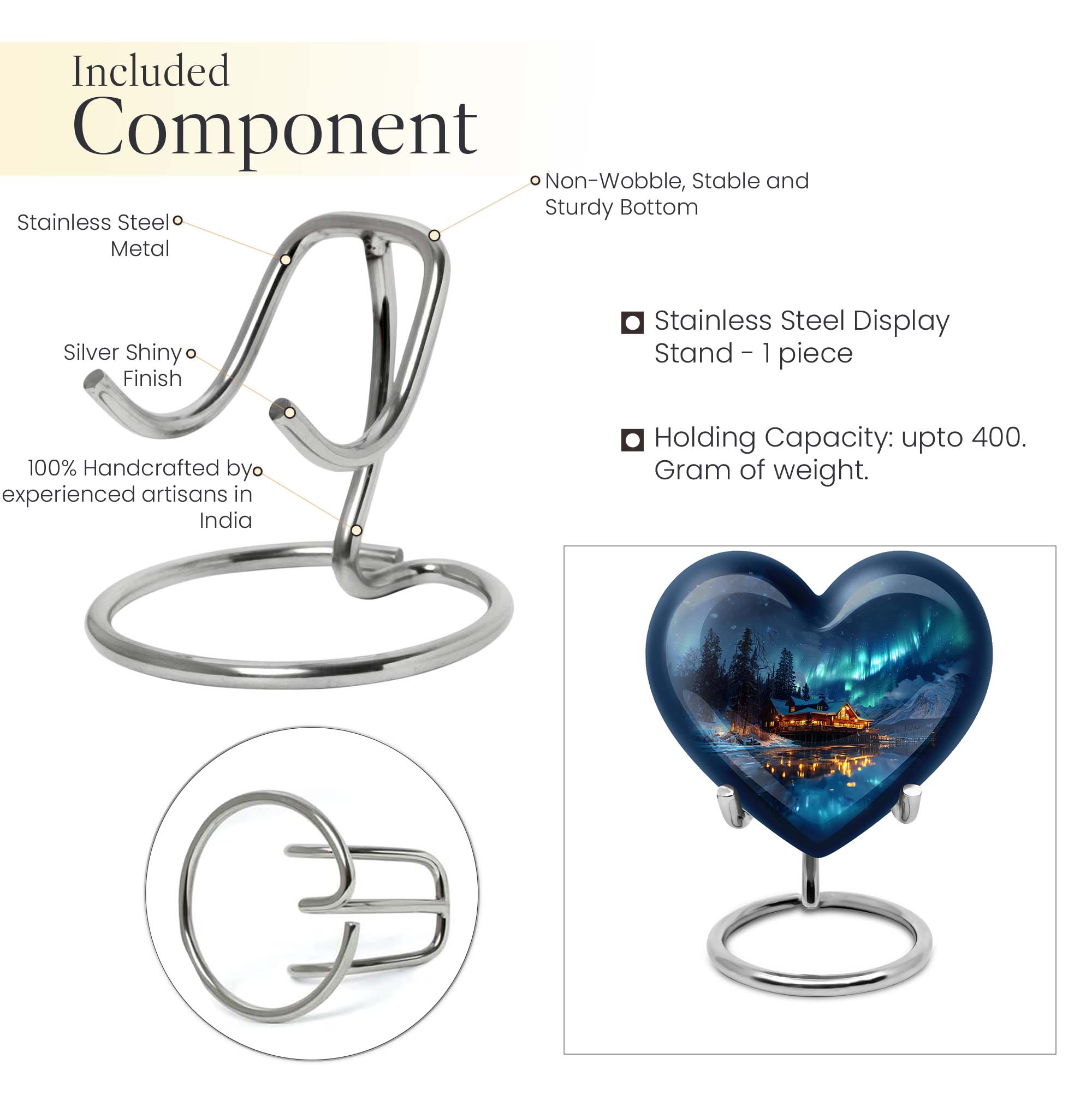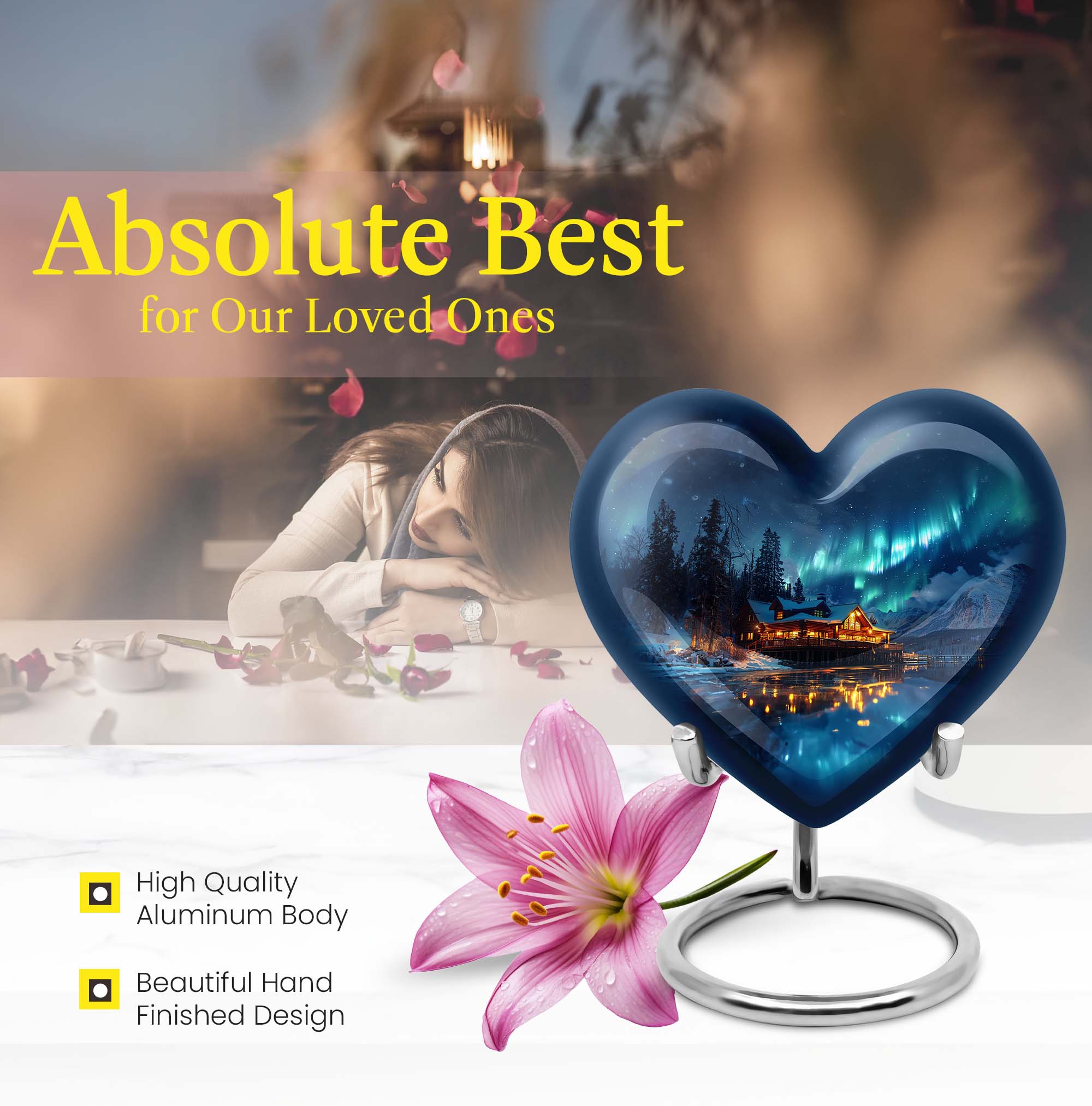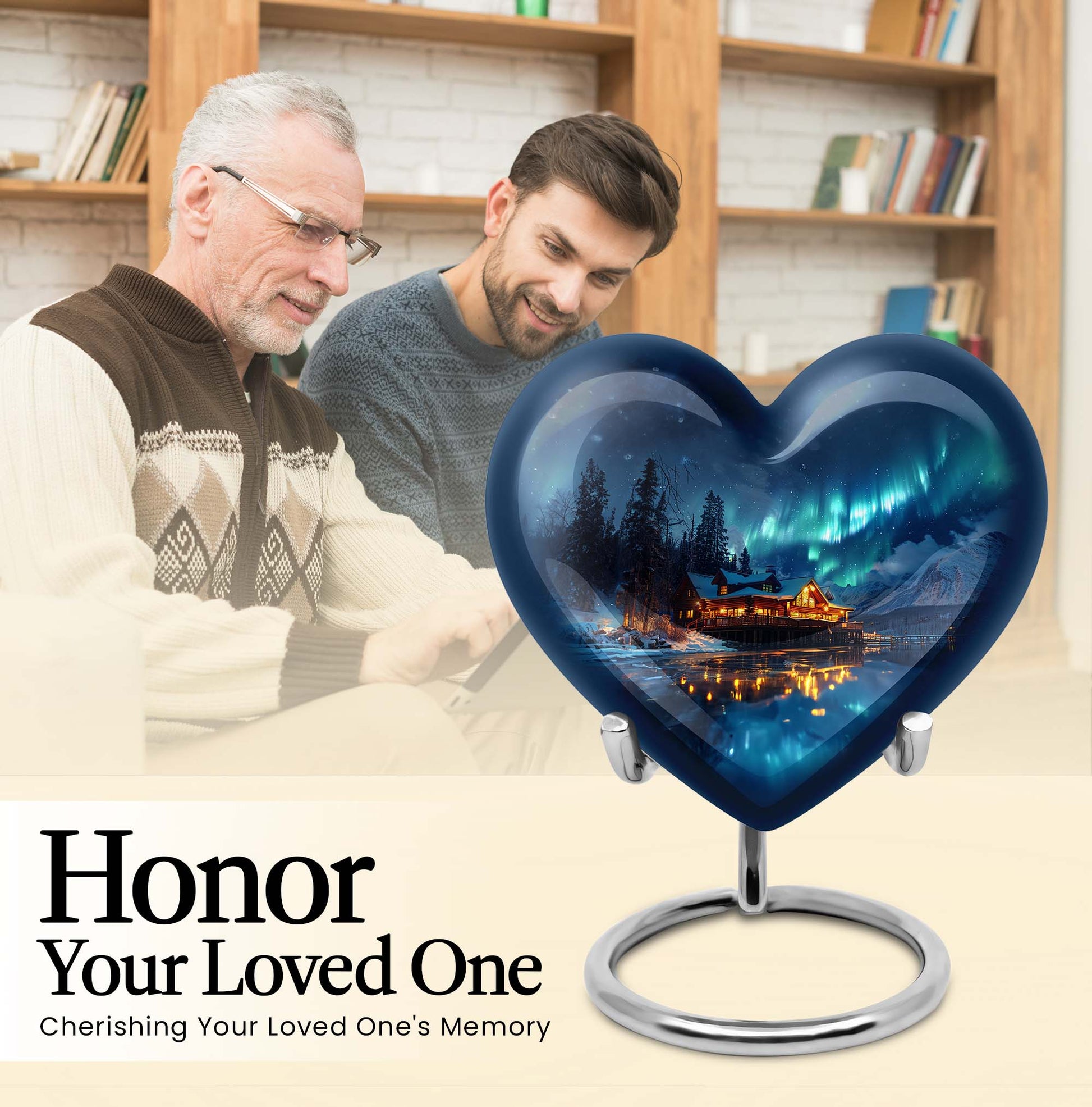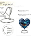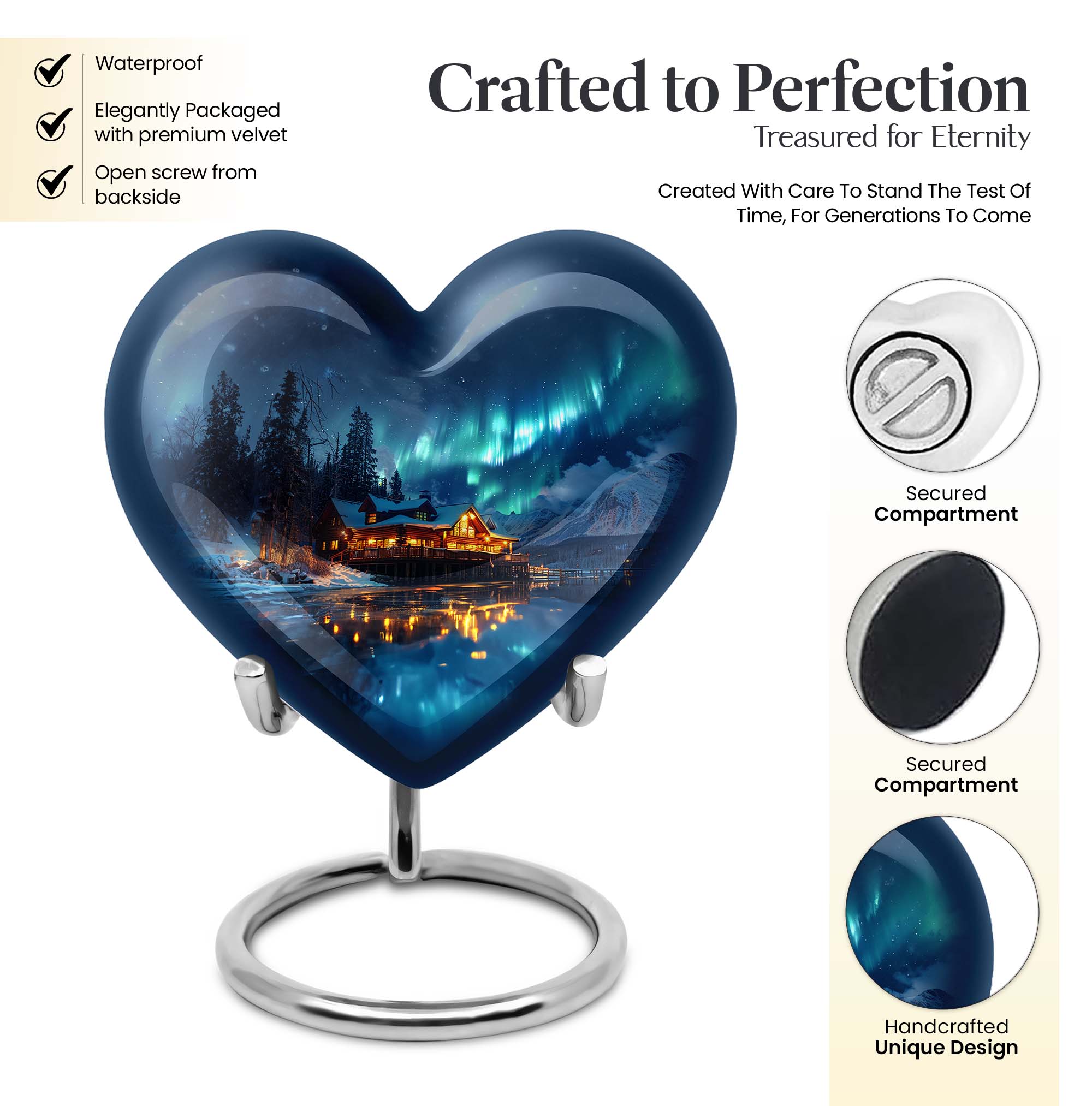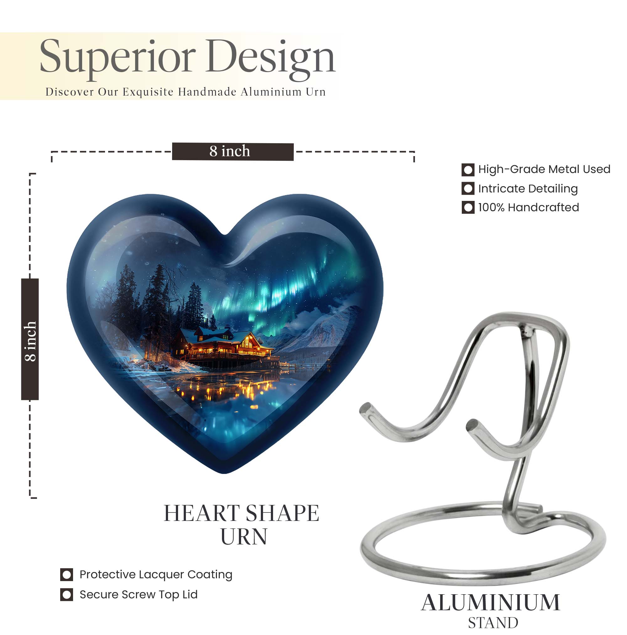 Honor the cherished memory of a departed loved one with our stunning, Northern Lights themed cremation urn. This heart-shaped, substantial urn, designed for an adult male, is constructed from resilient aluminium and stands prominently at a majestic height of 10 inches. Built to safeguard the ashes of your loved one, this vessel displays an intricate butterfly motif. It offers a capacity of 200 cubic inches, ideal for the containment of ashes. Weighing a sturdy 3.3 pounds, it is designed as a portable urn for travels, a poignant reminder of your loved one even on the move. A velvet pouch accompanies each urn, ensuring the ashes are neatly stored and undisturbed. Emphasizing personal touch, our urns can be personalized with engraved names, transforming it into a bespoke memorial. Reiterating its relevance for both, outdoor and indoor settings, it can also be considered as a metal mandir for home. Remember your beloved by housing their ashes in this elegantly designed urn.