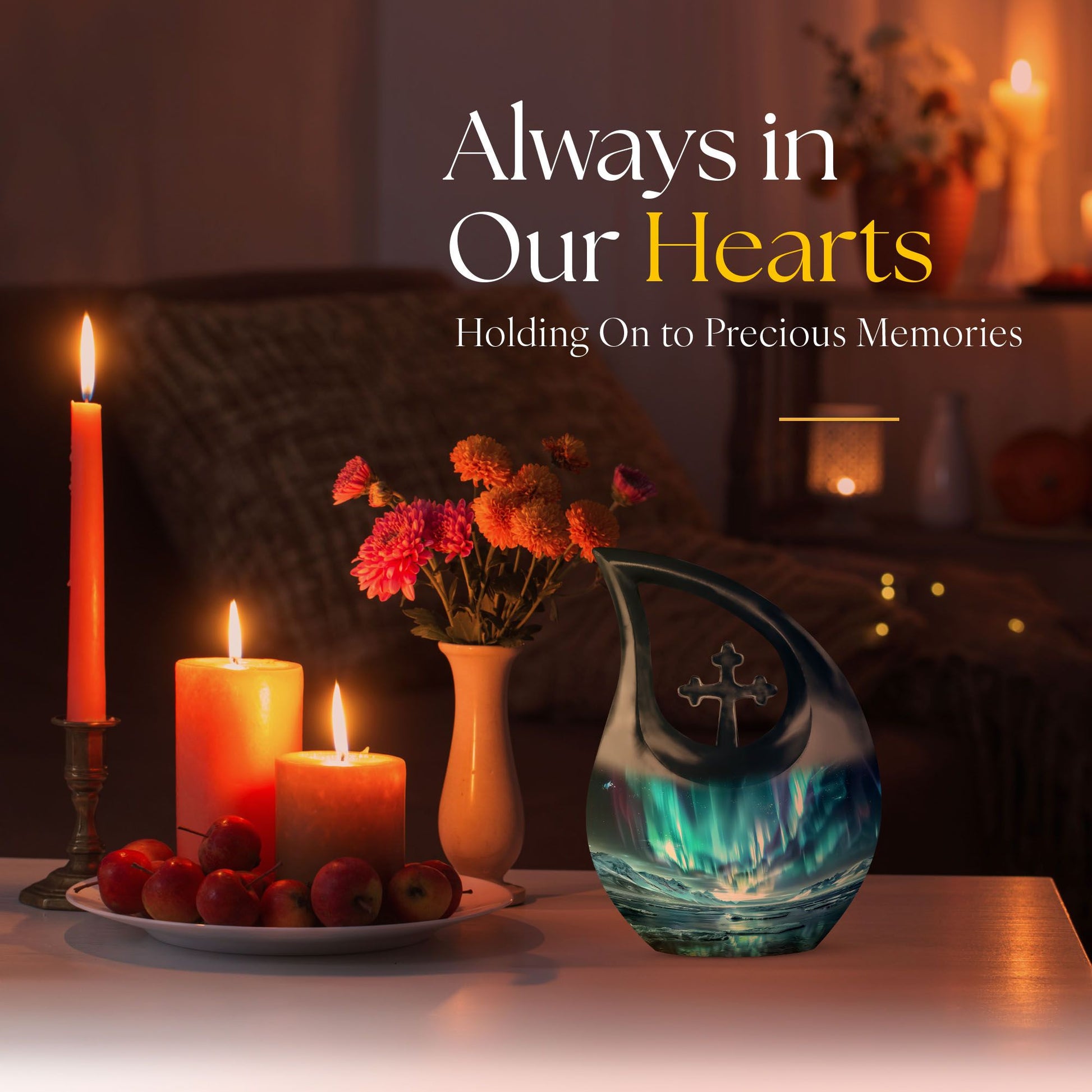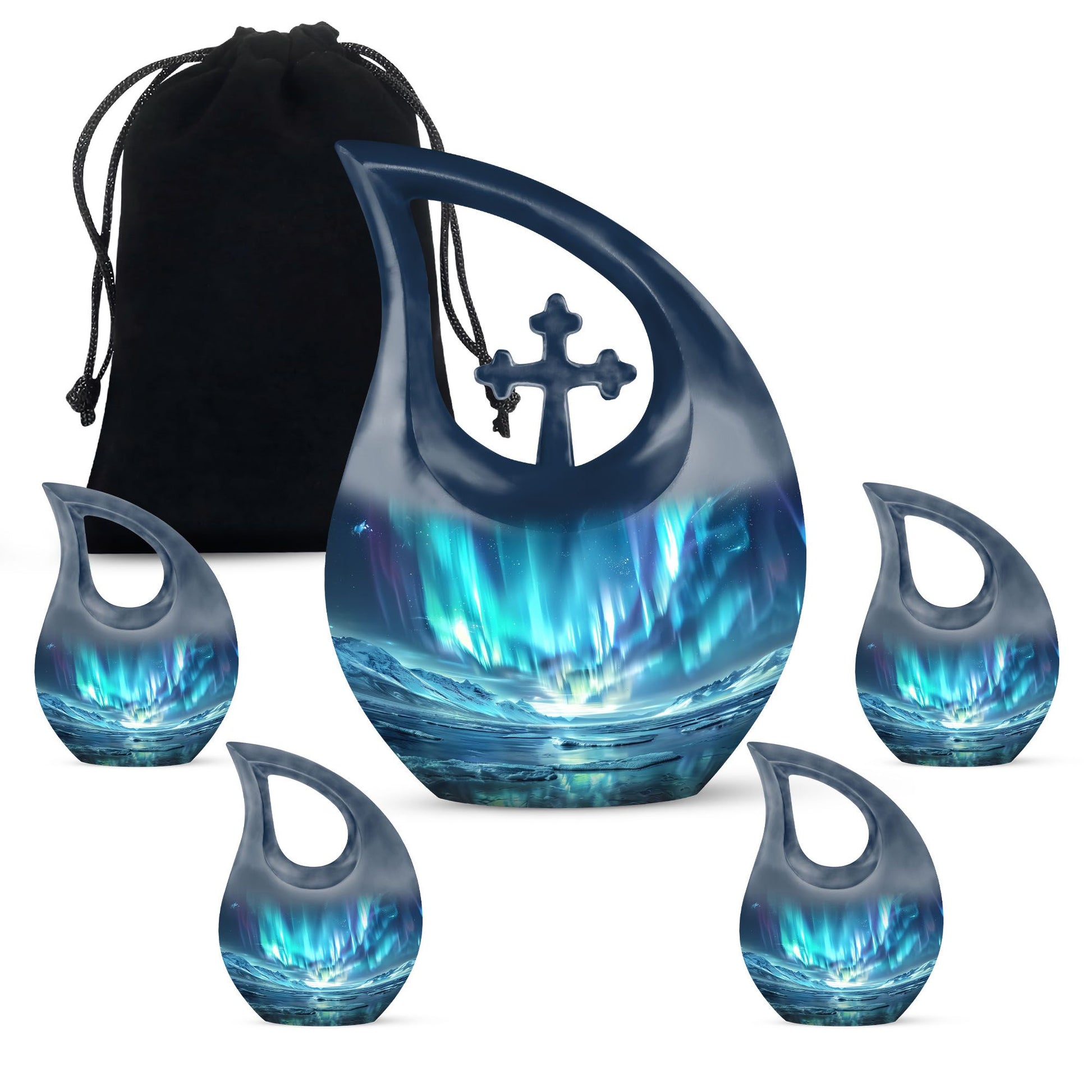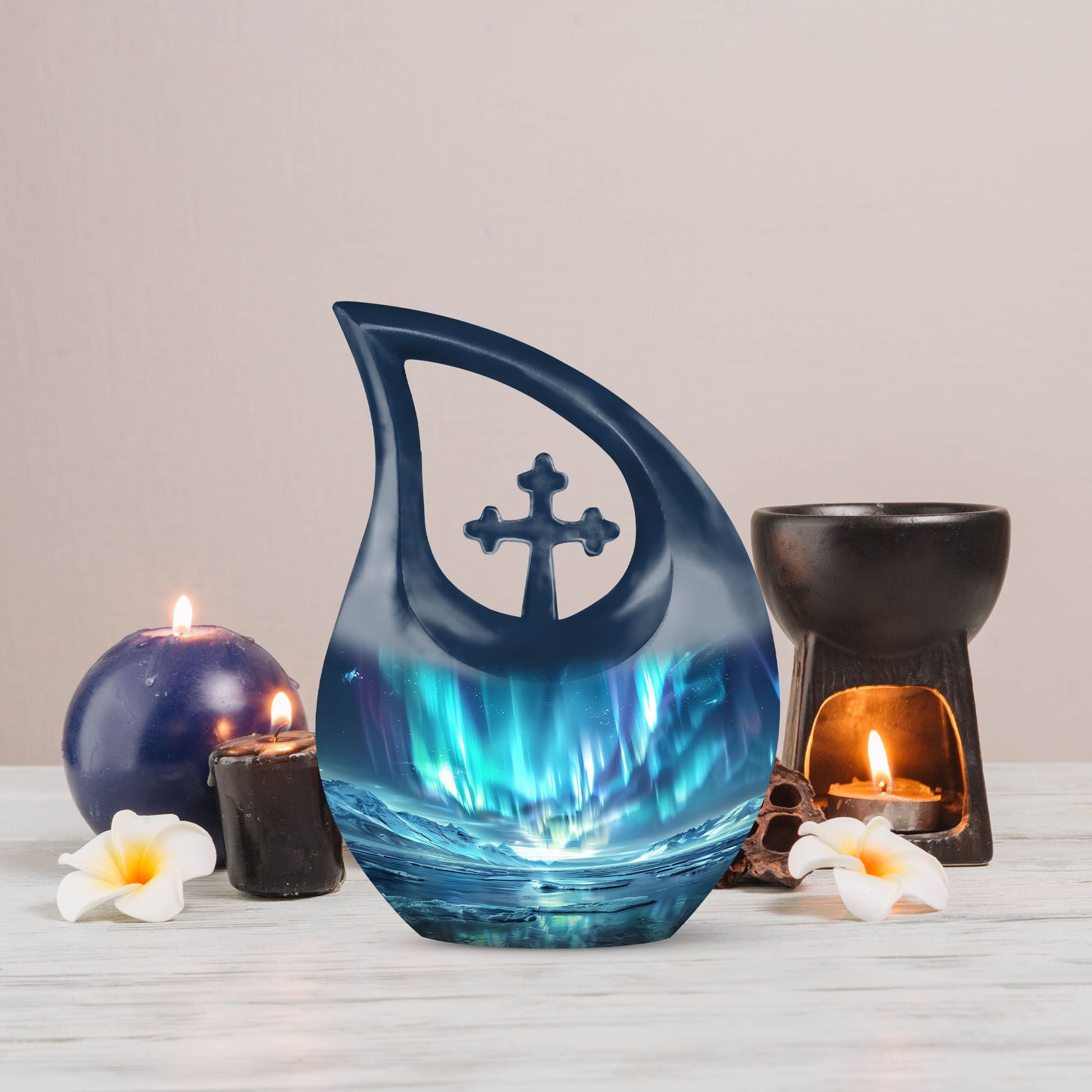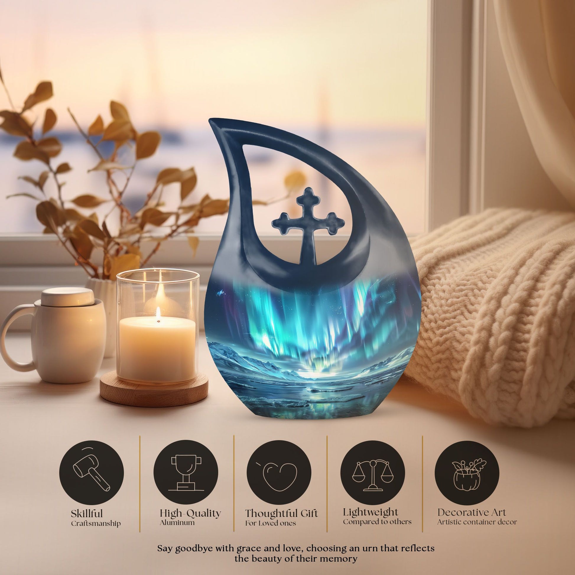 The Northern Lights Memorial Urn – Aurora Borealis Urn Combo Set for Women is a breathtaking tribute inspired by the tranquil dance of the northern skies. This large funeral urn embodies grace, light, and everlasting remembrance — a perfect resting place that honors a loved one’s spirit with celestial beauty.