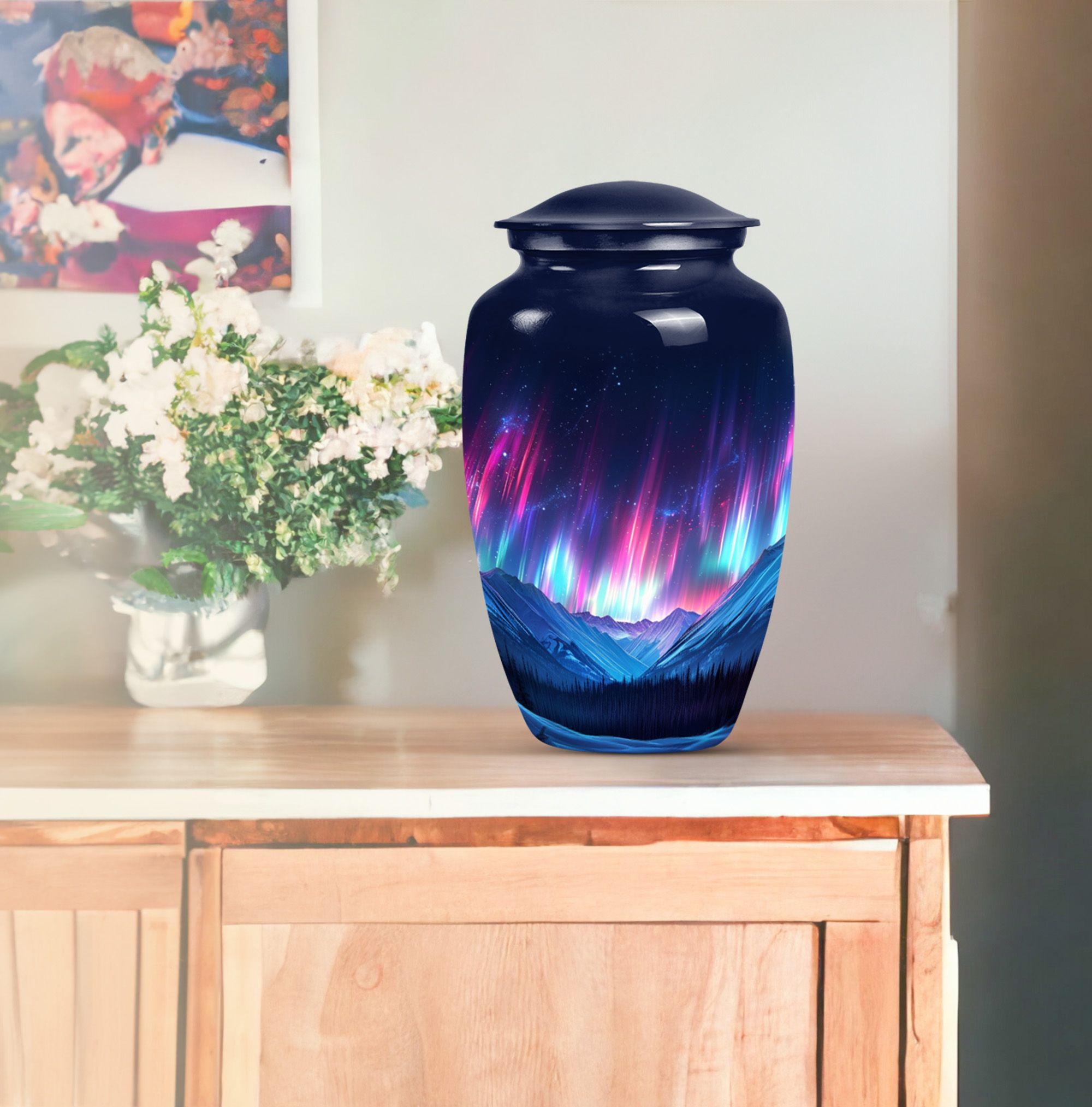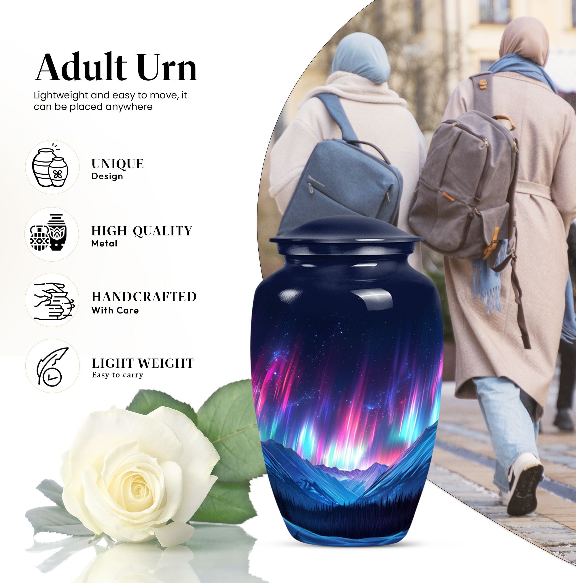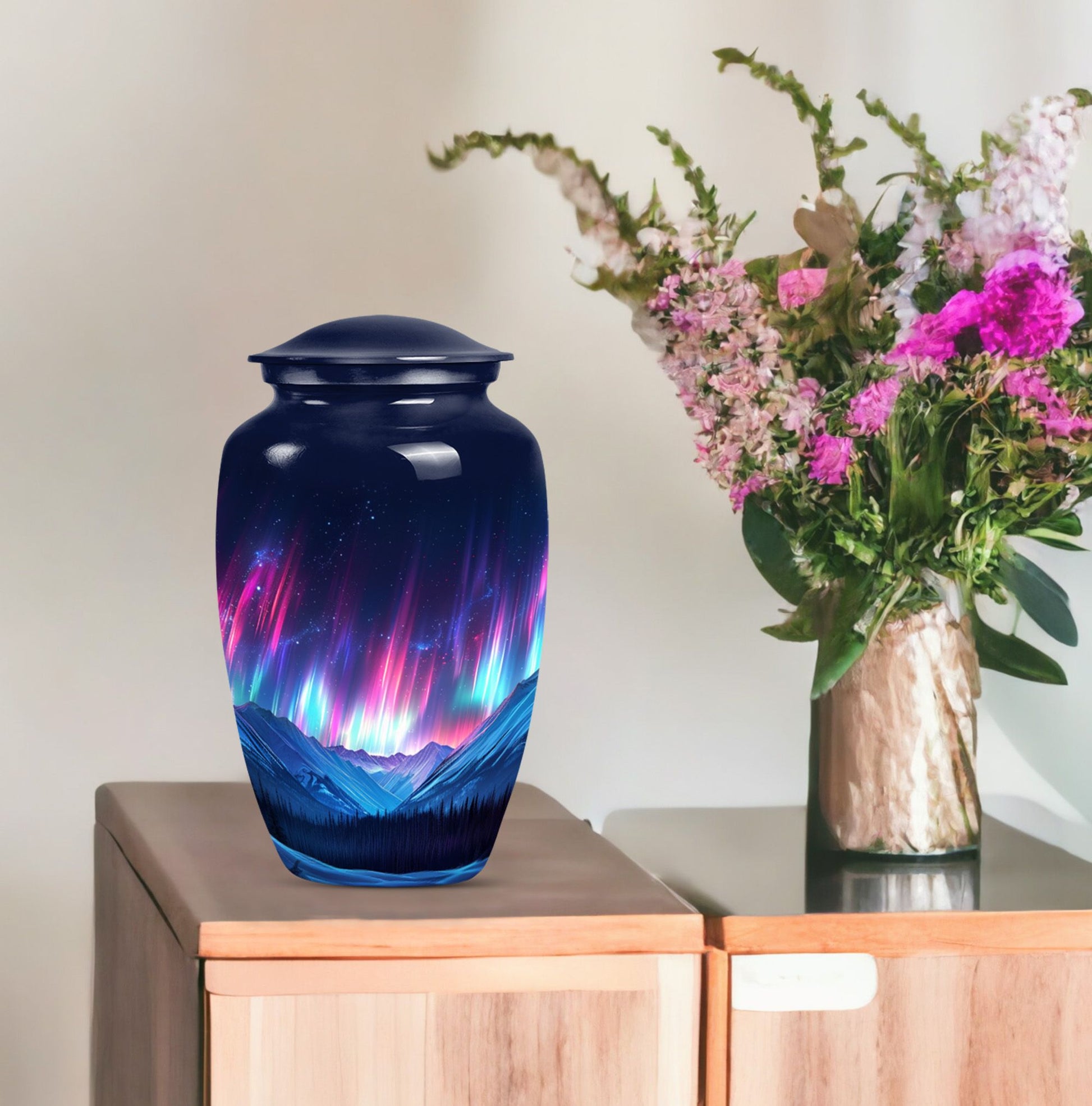 Discover the peace in eternal rest with our Northern Lights butterfly-themed cremation urn. This classic, large urn stands at 10 inches in height, an embodiment of reverence and respect that perfectly matches the solemn occasion. Carefully constructed from tough and sturdy aluminium, this reliable funeral urn for men's ashes weighs just 3.3 pounds. Accommodating up to 200 cubic inches, this piece is ideal for preserving the beloved memory of the departed. Dipped in a rich, lush theme of butterflies, the urn radiates a unique tranquility that comforts the grieving heart. The set also includes a velvet pouch for dignified containment of the ashes. What makes this urn truly special is the option to personalize it with engraved names, adding a distinctive touch. This decorative human ashes urn, steeped in sophistication, brings a noble closure to their earthy journey and bestows unbroken serenity as a timeless remembrance.