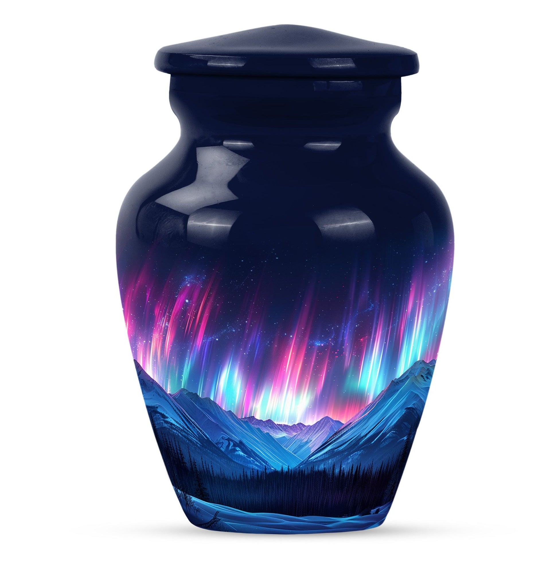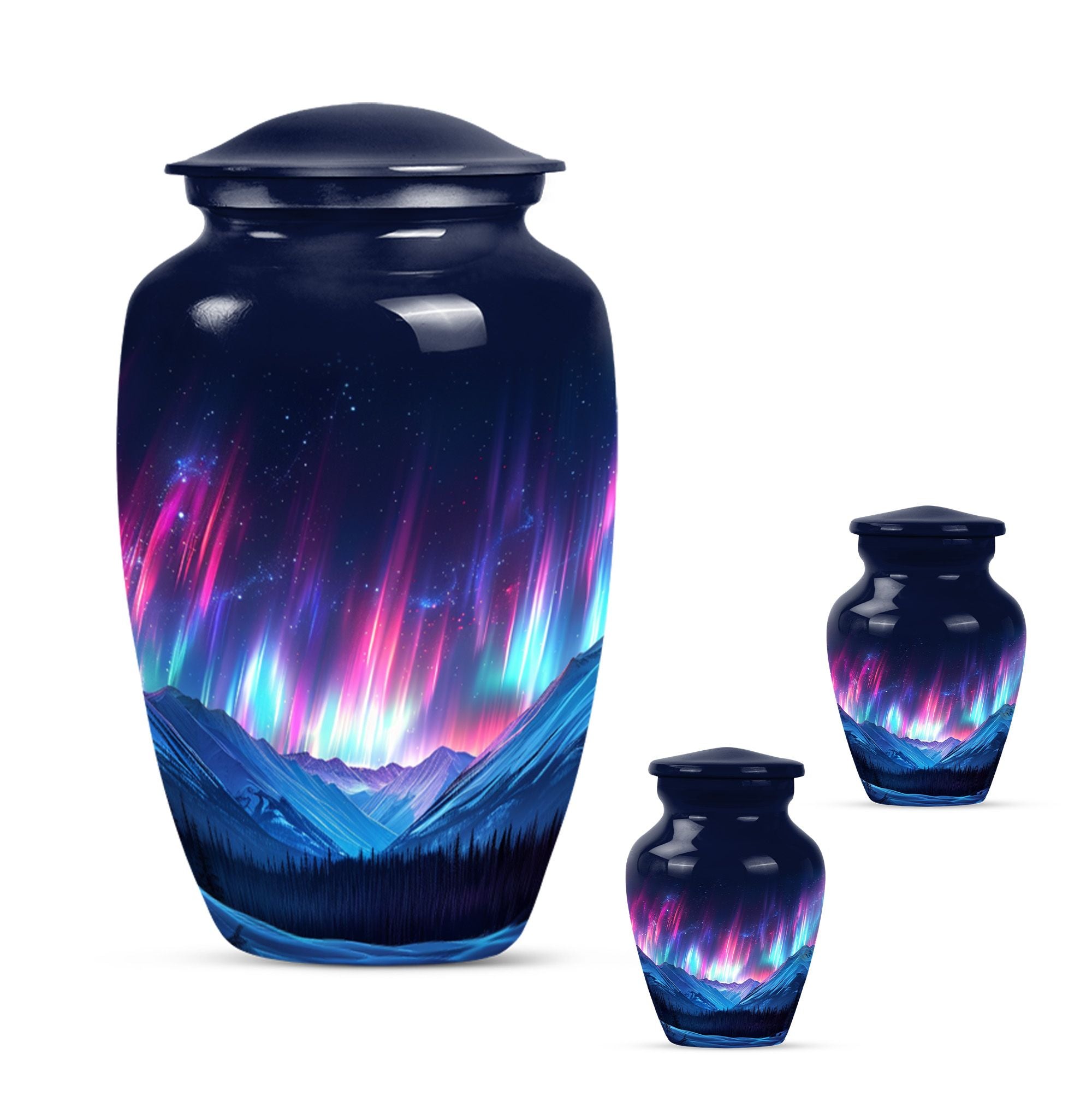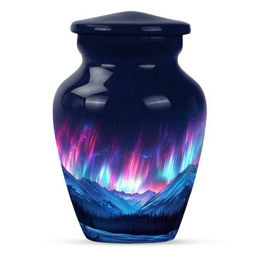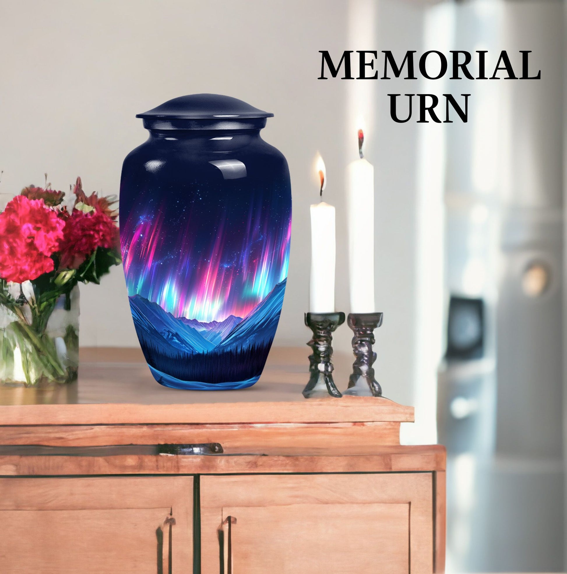 Discover the peace in eternal rest with our Northern Lights butterfly-themed cremation urn. This classic, large urn stands at 10 inches in height, an embodiment of reverence and respect that perfectly matches the solemn occasion. Carefully constructed from tough and sturdy aluminium, this reliable funeral urn for men's ashes weighs just 3.3 pounds. Accommodating up to 200 cubic inches, this piece is ideal for preserving the beloved memory of the departed. Dipped in a rich, lush theme of butterflies, the urn radiates a unique tranquility that comforts the grieving heart. The set also includes a velvet pouch for dignified containment of the ashes. What makes this urn truly special is the option to personalize it with engraved names, adding a distinctive touch. This decorative human ashes urn, steeped in sophistication, brings a noble closure to their earthy journey and bestows unbroken serenity as a timeless remembrance.
