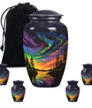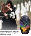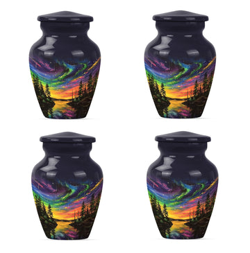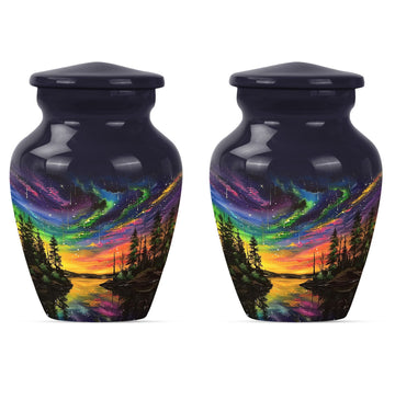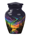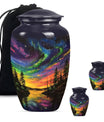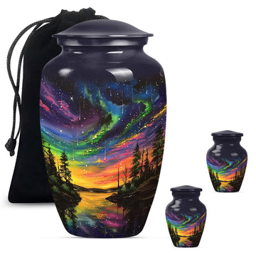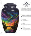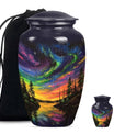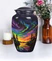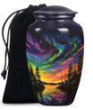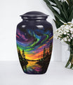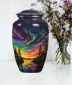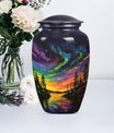 Introducing our tranquil Purple Meadow themed 'Northern Lights Urn', a large cremation urn designed for those who seek a dignified send-off for their loved ones. Measuring at 10 inches in height, it has the capacity to gently hold 200 cubic inches of ashes. This urn is constructed from high-quality aluminium, offering long-lasting assurance and serenity for you and your family. It weighs an approximate 3.3 pounds, displaying a profound sense of reverence and respect. This cremation urn package also includes a soothing velvet pouch designed for the containment and care of the ashes. You can further add a sentimental touch by personalizing it with engraved names, making it a truly unique funeral gift. Not to be mistaken with common urns, it is a truly unique product within the cremation large urns category that caters to your specific needs in these emotionally challenging times. Show your love, choose our 'Northern Lights Urn'.