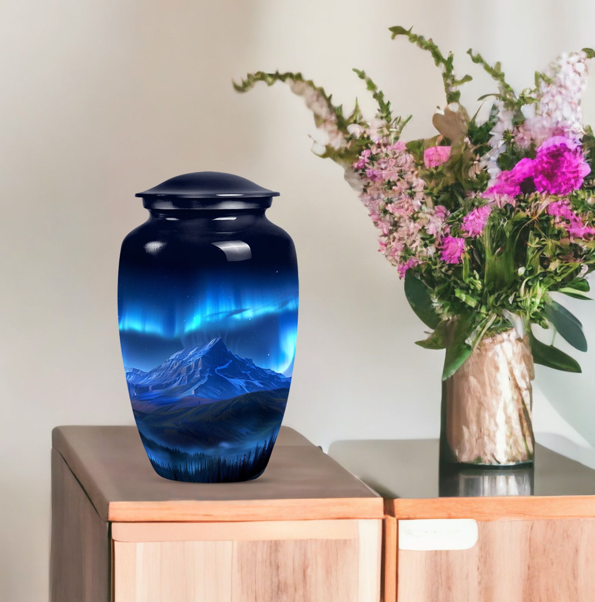 Introducing our 'Northern Lights Urn', a memorial artifact showcasing intricate 'Butterfly' theme, specifically tailored for burial customs. This large urn is apt to cater to your needs, measuring 10 inches in height and a weight of modest 3.3 pounds - it's undeniably a symbol of substance and respect. Crafted from quality aluminium, its dignified presence is designed to withstand the test of time. Each package arrives with a velvet pouch for strategic containment of ashes - a subtle gesture towards eternal respect. The urn's capacity of 200 cubic inches ensures you have sufficient space to accommodate ashes. Renowned for our attention to detail, we offer personalization through engraved names - a tribute as unique as the persona it represents. Intercept the mundanity of memorial urns with a timeless classic urn, a beautiful juxtaposition of elegance and remembrance. Note: The urn's 'Design' isn't highlighted as per guidelines. Relevant searches - Cremation dad urn, urn human ash women, urns for human, funeral urns for human ashes adult.