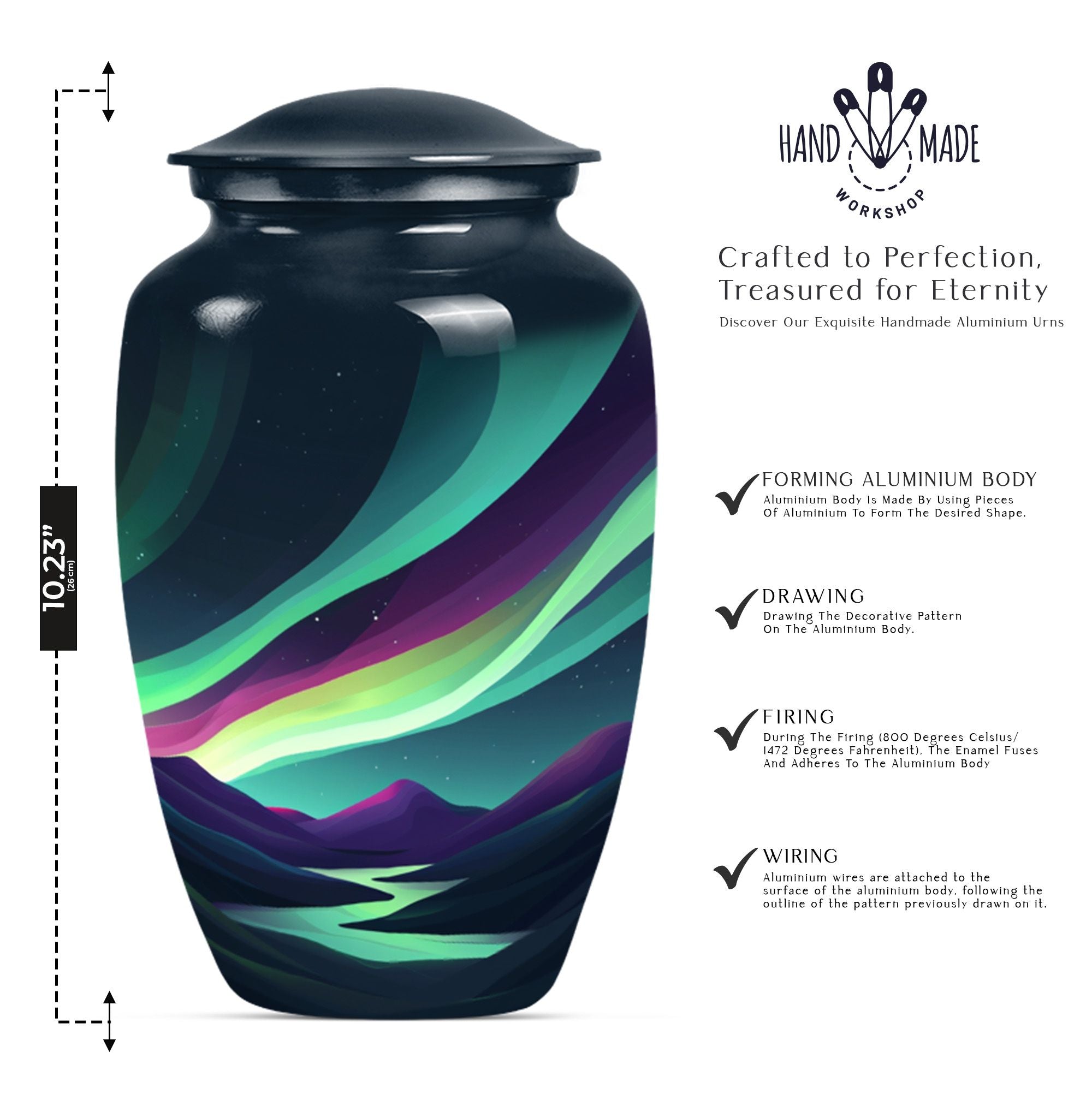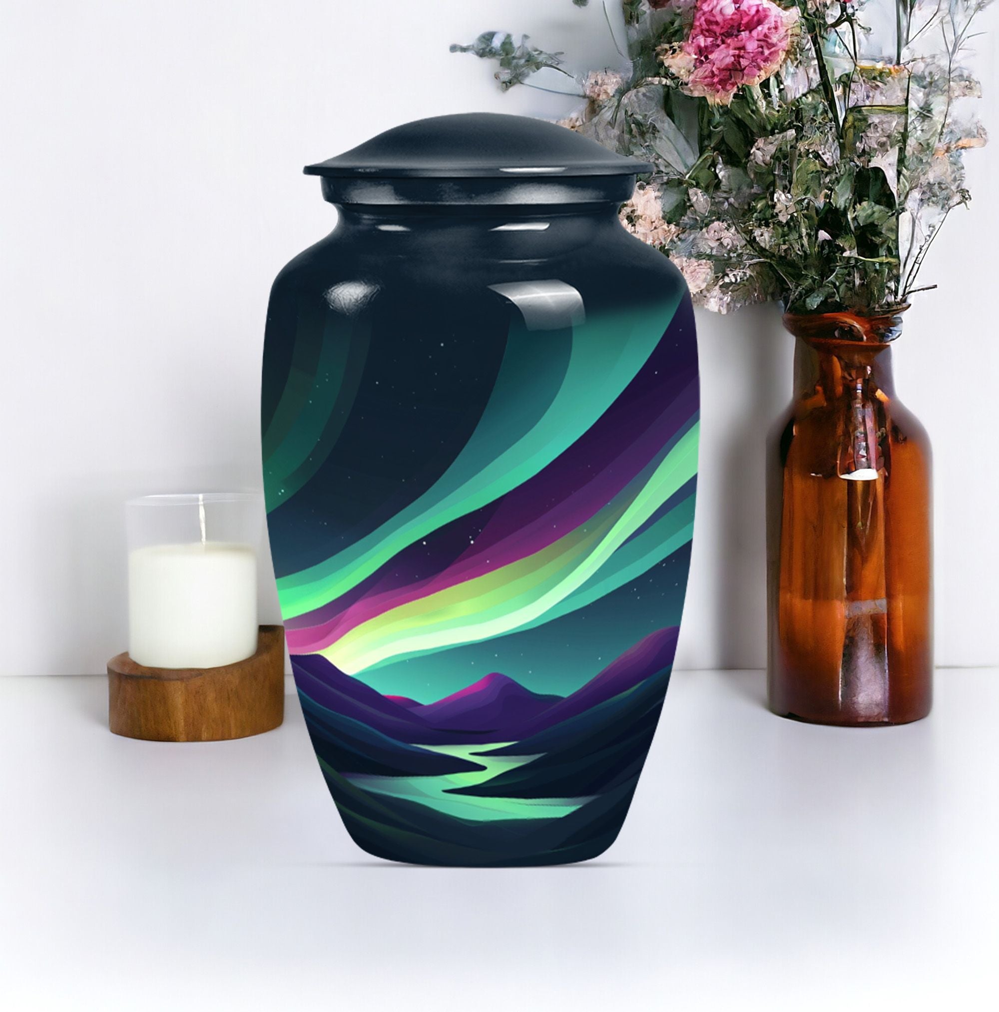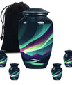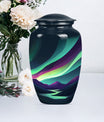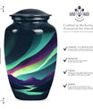 Experience a luminous tribute to your departed loved ones with our Large Northern Lights Urn, a specialty Memorial Ash Urn of compelling beauty and spirit. Tailored from durable Aluminium and coated in a captivating 'Purple Meadow' theme, this Memorial Urn stands at an unassuming 10 inches, showcasing its humble respect for the monumental task it accommodates. The classic Urn's size can graciously hold up to 200 cubic inches of ashes, allowing for a comprehensive tribute, weighty with memories. As an addition, it comes with an elegant velvet pouch for the containment and protection of the precious remains. Displaying its value beyond beauty, this Large Urn supports customization, allowing for the eternal engraving of names, allowing personal attachment to the stylish memorial. Always remember your departed with a Funeral urn that merges an immersive tribute with elegance, large enough for adult men ashes. Transport the sacred remains safe and stylish, reminiscent of the universal love echoed through the Aurora Borealis, our Northern Lights Urn.