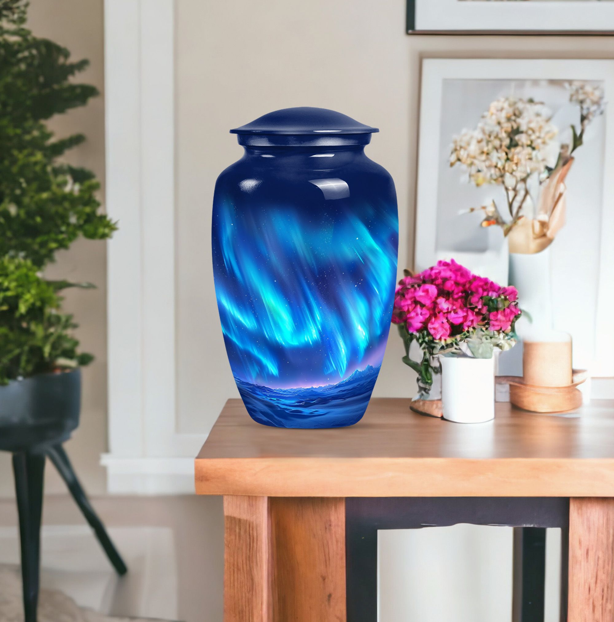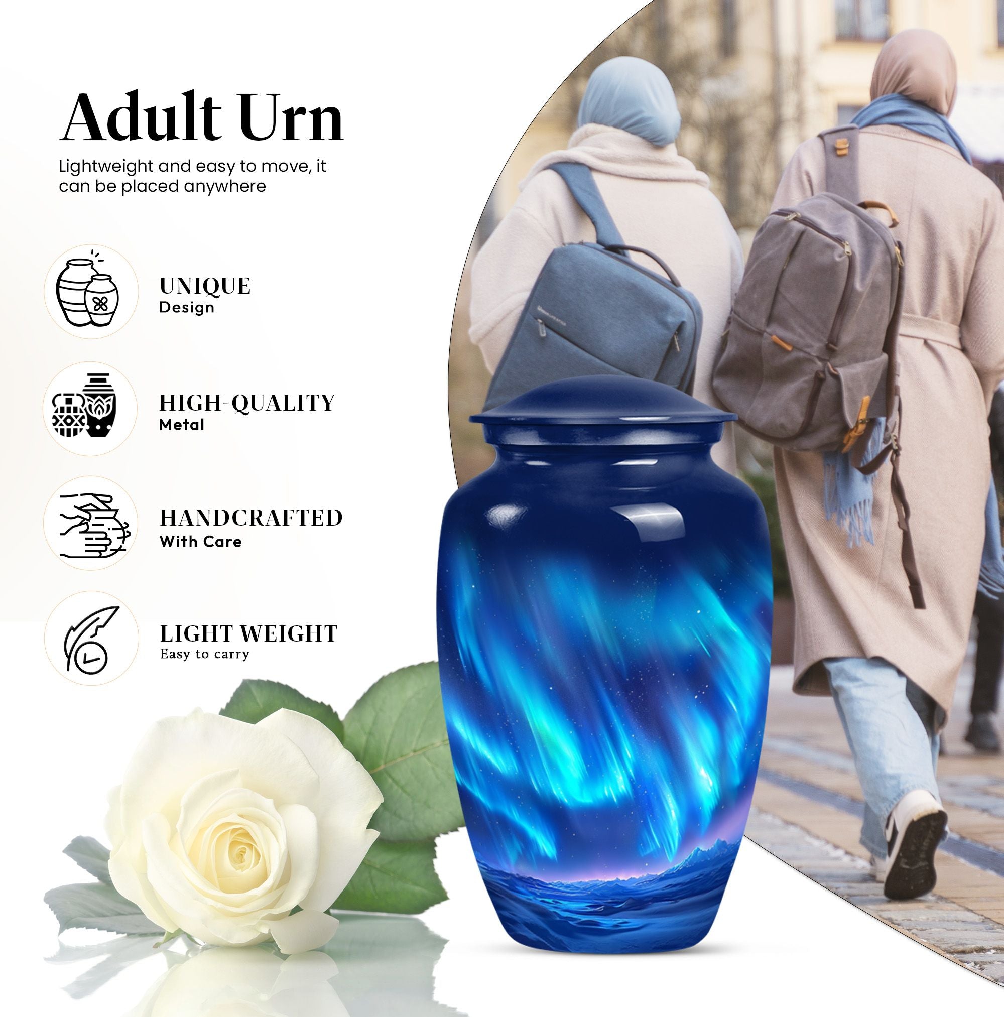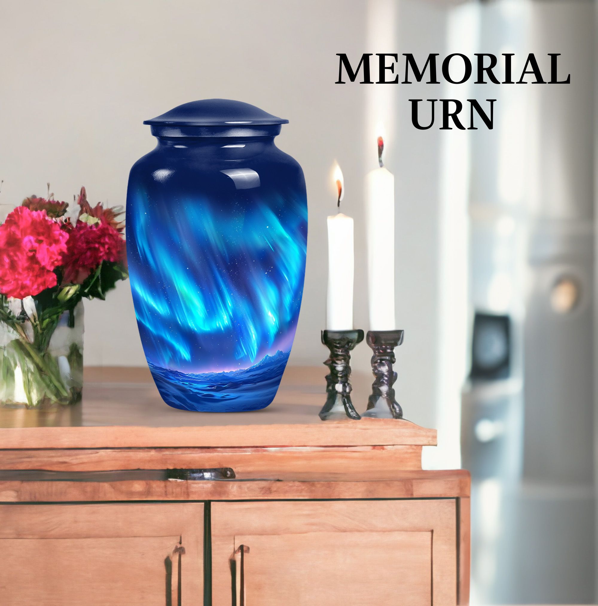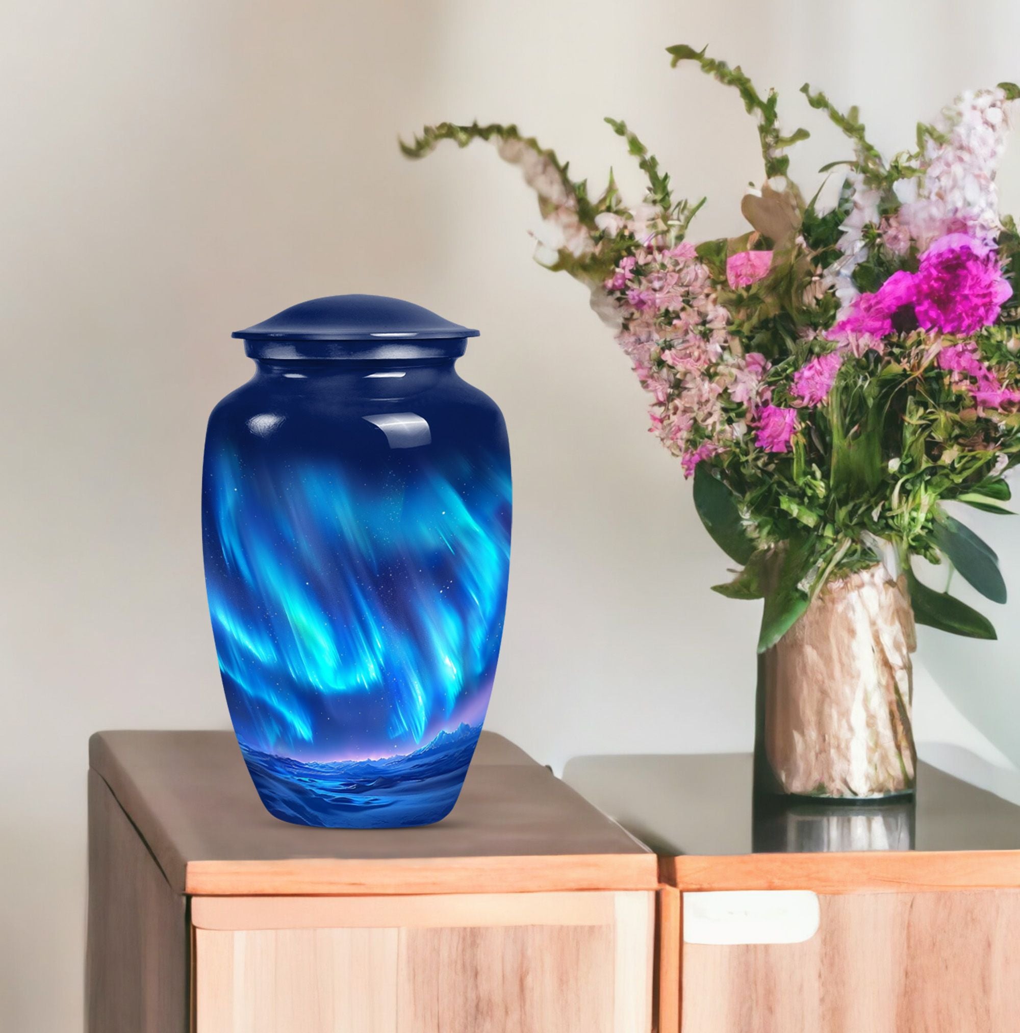 Introducing our Northern Lights Urn, a significant part of memorial ceremony supplies, designed for those seeking a tasteful and memorable way to cherish their loved ones. This large urn is known for its capacity, provides ample space for 200 cubic inches of ashes. Crafted delicately from resistant aluminium, it combines durability with heartwarming elegance. This 10-inch tall memorial urn showcases an enchanting butterfly theme, subtly conveying a soul's liberation and eternal transformation. Its weight of 3.3 pounds ensures a solid base, offering a sturdy presence. We understand the sanctity and individuality of memories, hence, every urn comes with an option of customization. Personalize the urn with the engraved names of your departed loved ones to create a unique memorial tribute. Not to forget, we include a plush velvet pouch for containment and safekeeping of ashes. Explore the realm of memorial urns, go beyond the ordinary funeral burial with our Northern Lights Urn, ensuring your memorial tributes resonate as eternal as the love you hold.