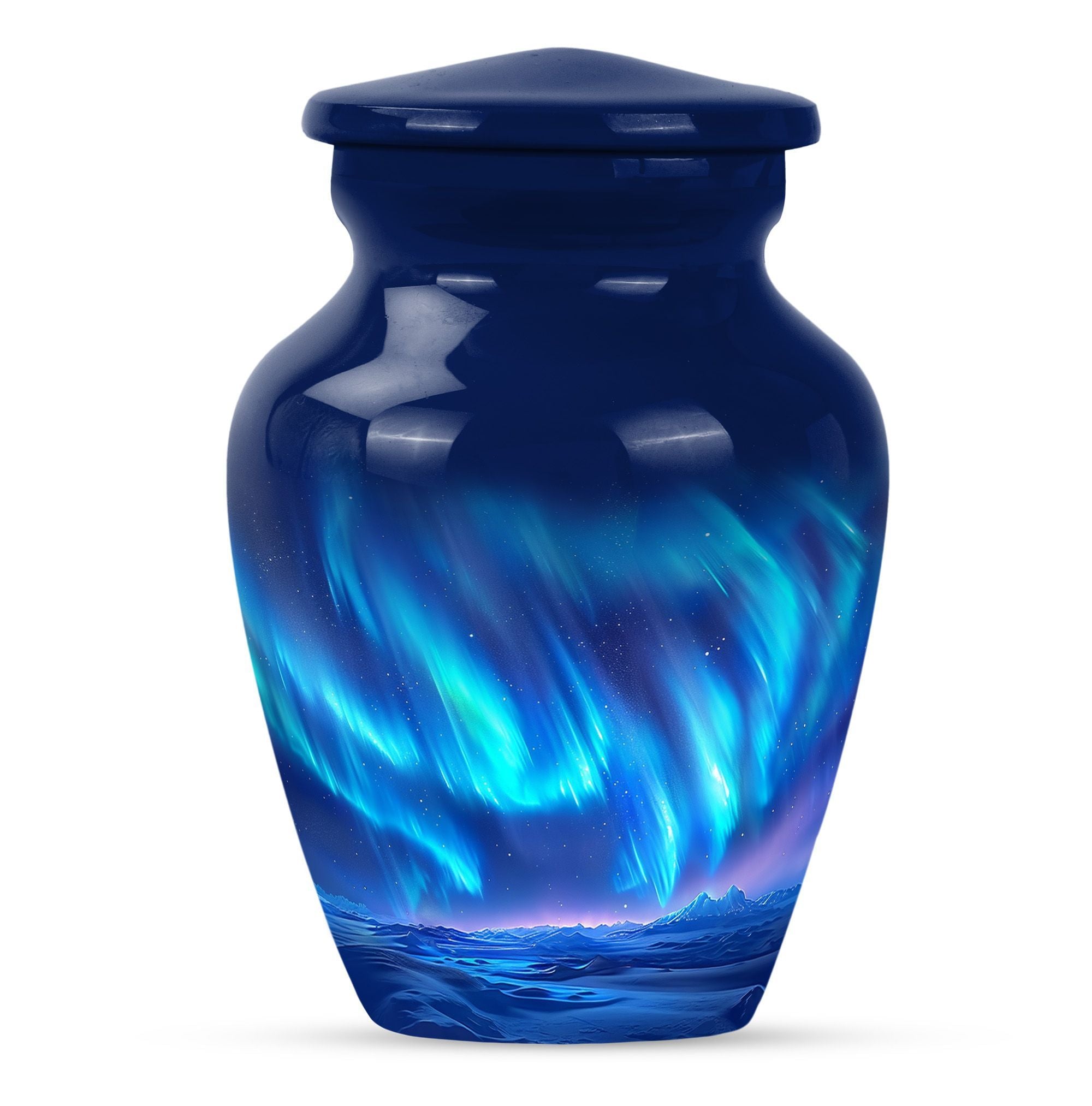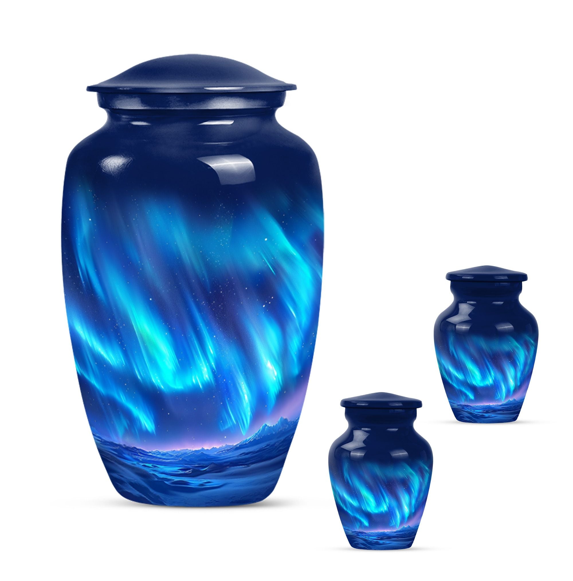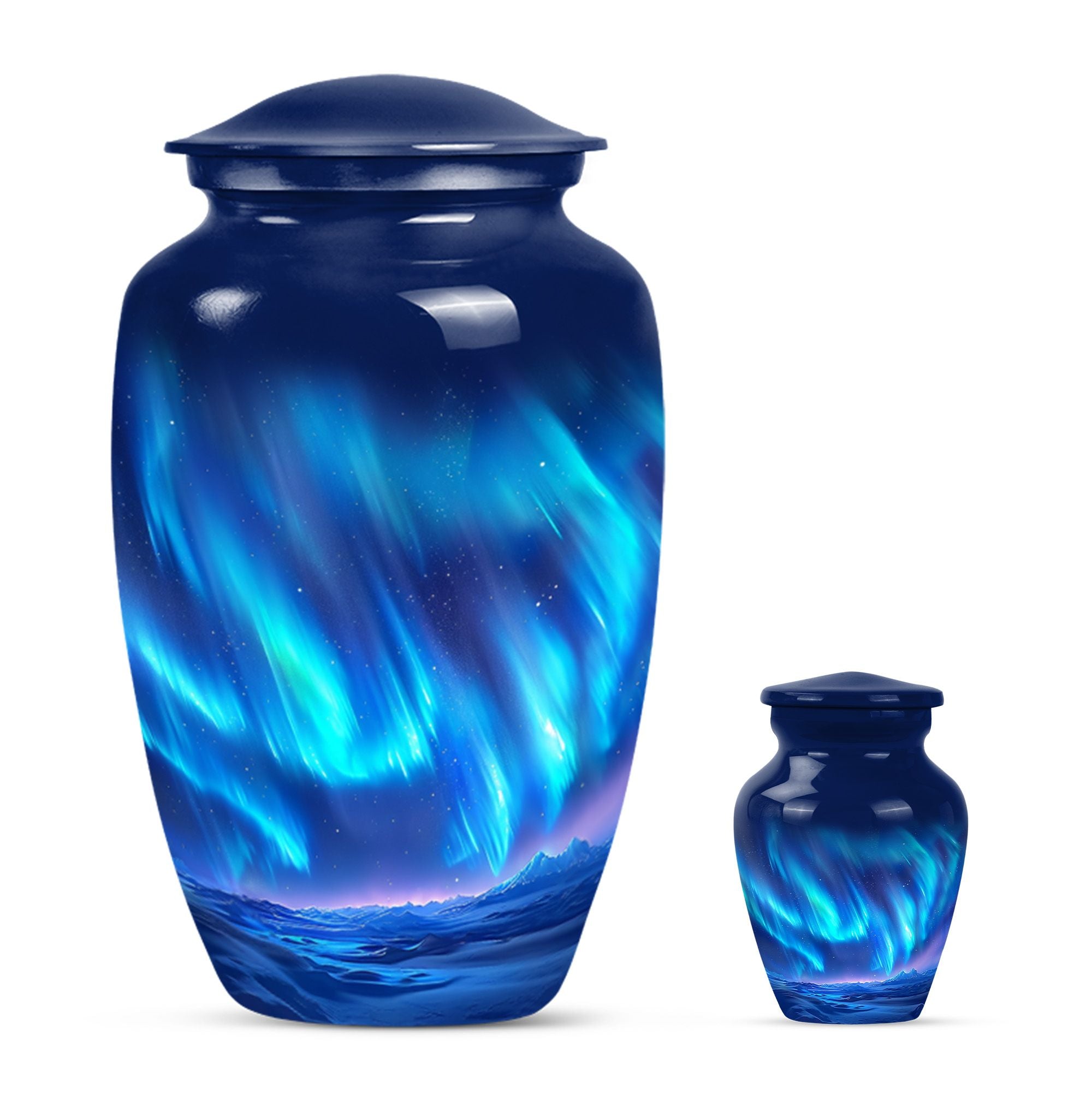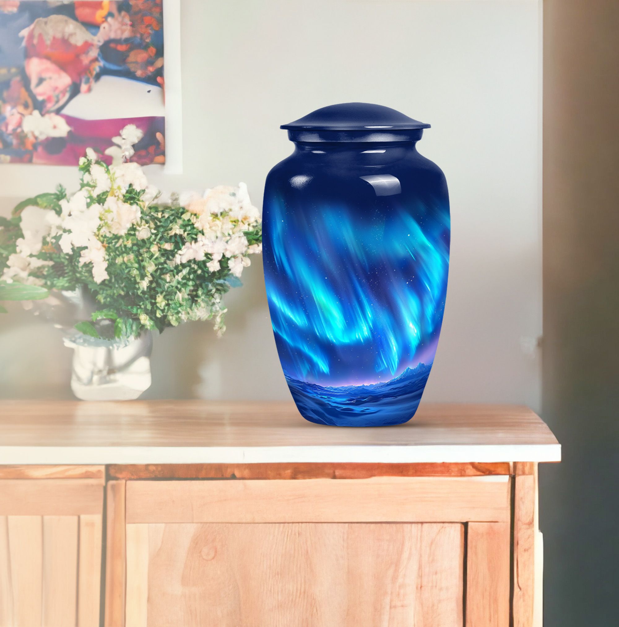 Introducing our Northern Lights Urn, a significant part of memorial ceremony supplies, designed for those seeking a tasteful and memorable way to cherish their loved ones. This large urn is known for its capacity, provides ample space for 200 cubic inches of ashes. Crafted delicately from resistant aluminium, it combines durability with heartwarming elegance. This 10-inch tall memorial urn showcases an enchanting butterfly theme, subtly conveying a soul's liberation and eternal transformation. Its weight of 3.3 pounds ensures a solid base, offering a sturdy presence. We understand the sanctity and individuality of memories, hence, every urn comes with an option of customization. Personalize the urn with the engraved names of your departed loved ones to create a unique memorial tribute. Not to forget, we include a plush velvet pouch for containment and safekeeping of ashes. Explore the realm of memorial urns, go beyond the ordinary funeral burial with our Northern Lights Urn, ensuring your memorial tributes resonate as eternal as the love you hold.