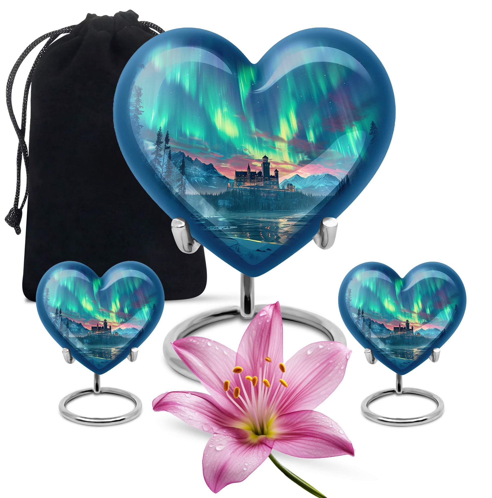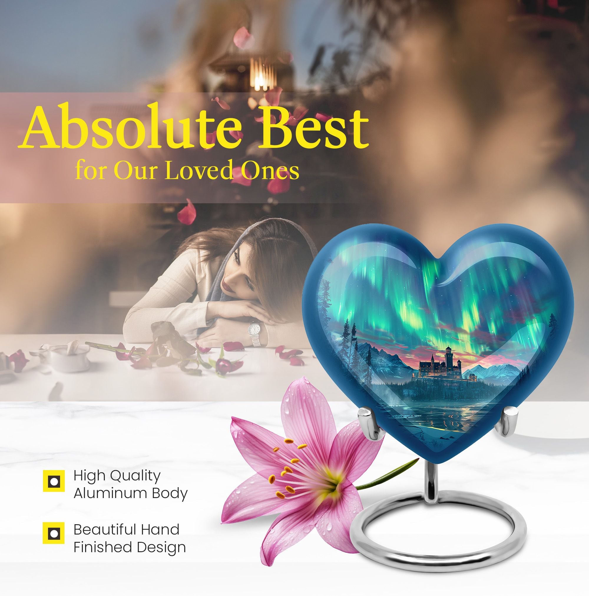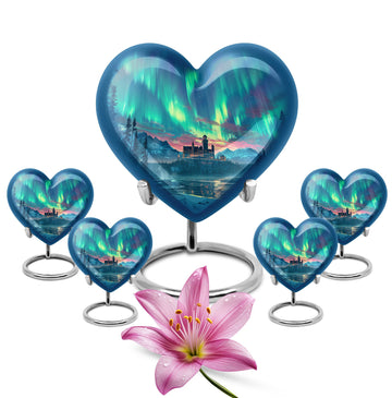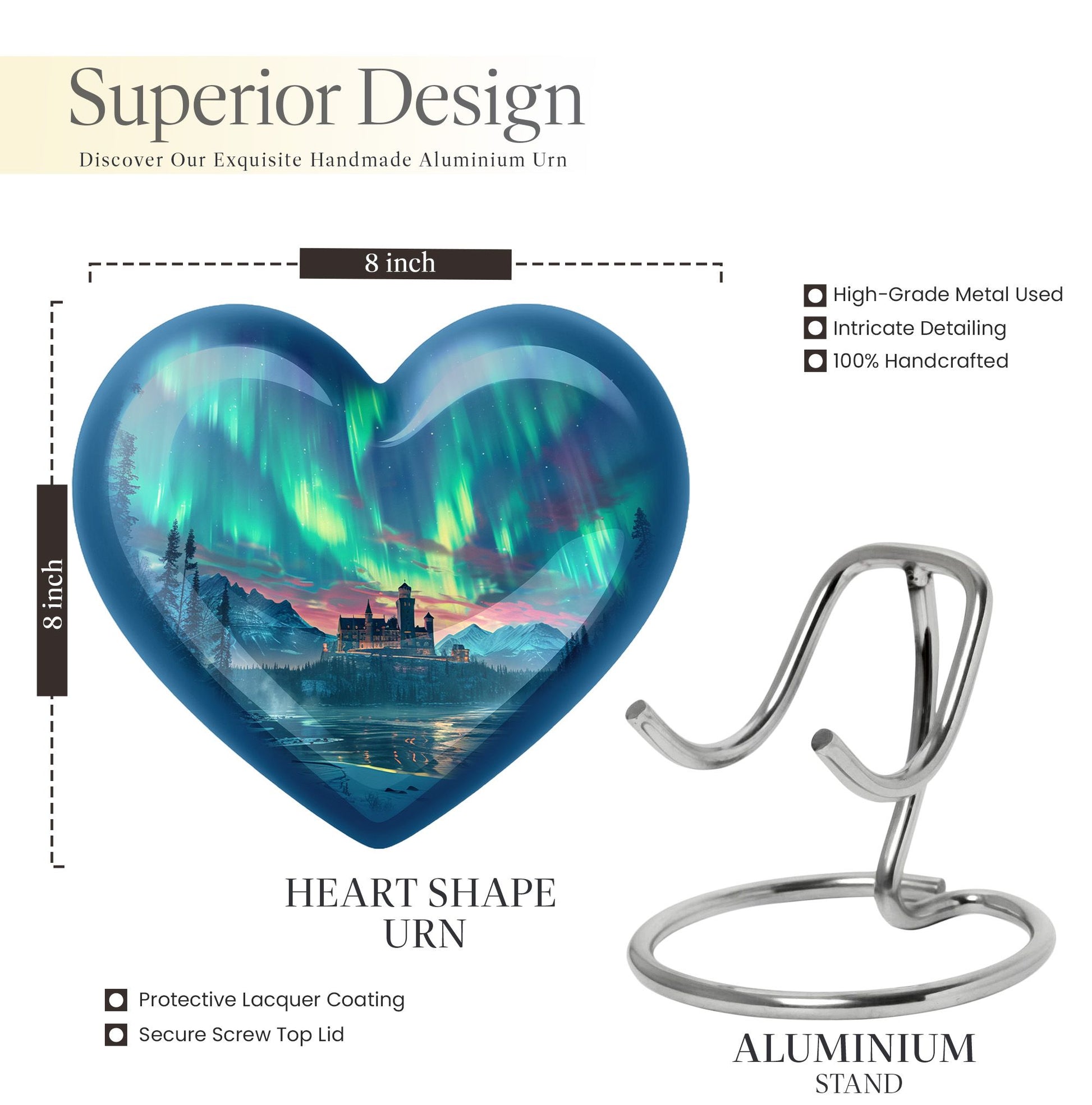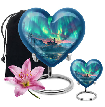 Our Northern Lights Urn is more than an exquisite tribute to your loved one; it's also a striking piece of memorial artistry. Made of resilient, refined aluminium and standing proud at 10 inches, this urn is an appealing way to safeguard capaciously up to 200 cubic inches of ashes. This robust large urn weighs a sturdy 3.3 pounds, lending it a solid, comforting feel that is equally suitable for seniors and adults. The urn comes along with a soft, velvet pouch for secure and respectful containment of ashes. It evokes a heart-warming feel with its heart-shaped design, an abstract theme adds an element of distinctive elegance to it. Add a special touch by personalizing the Northern Lights Urn with engraved names. Our memorial urn is not just a product; it is a cherished keepsake to honour those unforgettable moments and memories. In your search for 'memorial funeral urns for ashes,' 'funeral unique urns for human ashes,' or 'urns for cremation ashes mother and father', choose our Northern Lights Urn for its unparalleled quality and design.