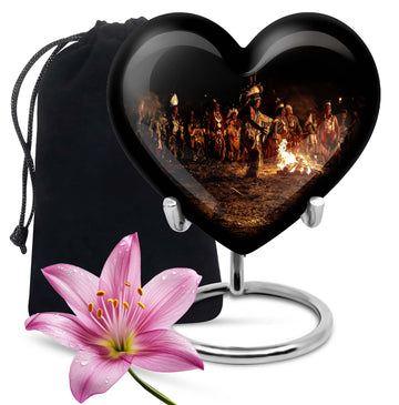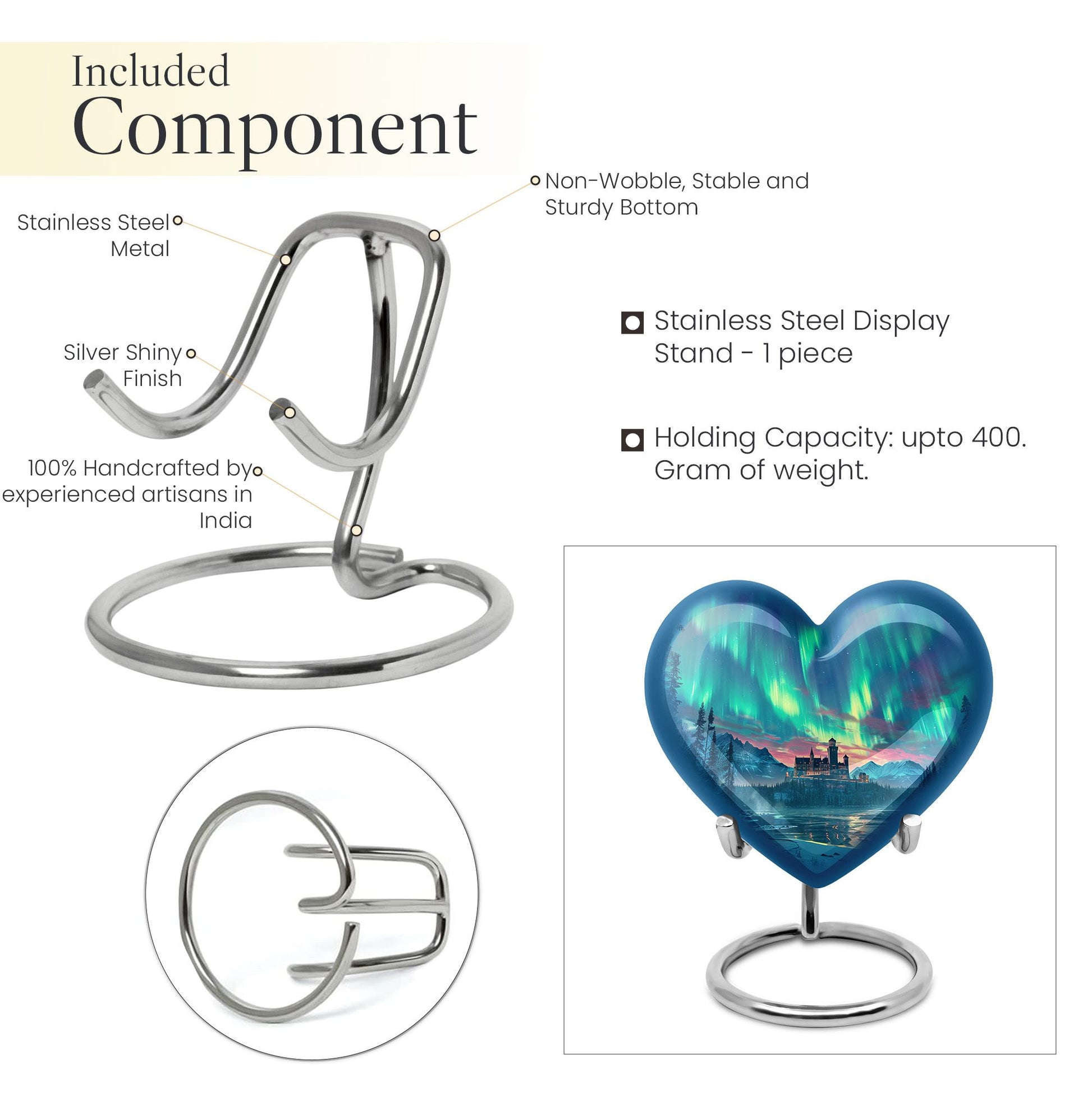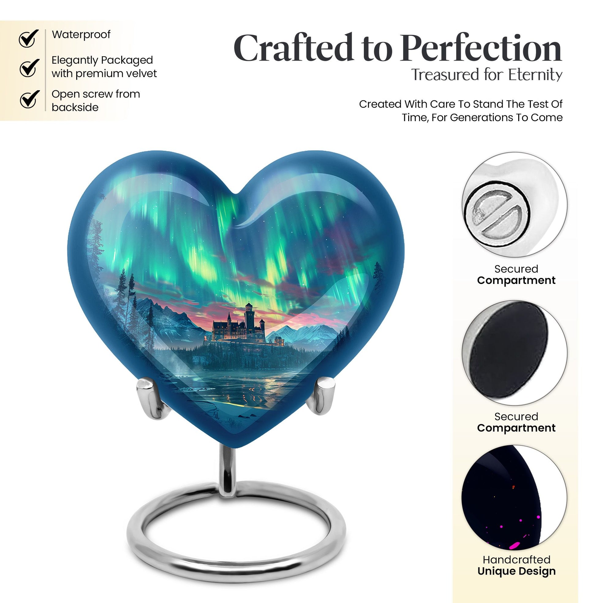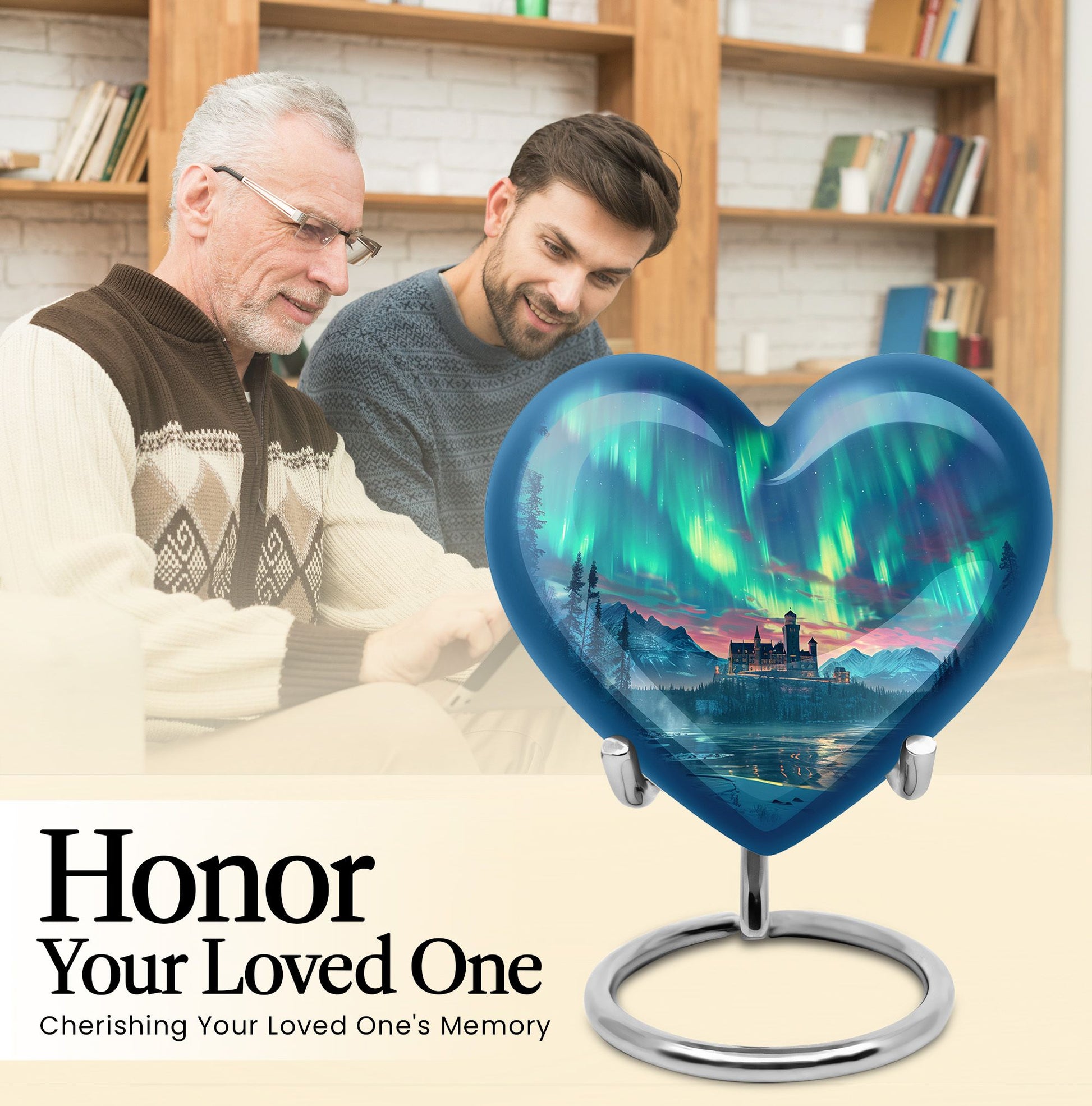 Our Northern Lights Urn is more than an exquisite tribute to your loved one; it's also a striking piece of memorial artistry. Made of resilient, refined aluminium and standing proud at 10 inches, this urn is an appealing way to safeguard capaciously up to 200 cubic inches of ashes. This robust large urn weighs a sturdy 3.3 pounds, lending it a solid, comforting feel that is equally suitable for seniors and adults. The urn comes along with a soft, velvet pouch for secure and respectful containment of ashes. It evokes a heart-warming feel with its heart-shaped design, an abstract theme adds an element of distinctive elegance to it. Add a special touch by personalizing the Northern Lights Urn with engraved names. Our memorial urn is not just a product; it is a cherished keepsake to honour those unforgettable moments and memories. In your search for 'memorial funeral urns for ashes,' 'funeral unique urns for human ashes,' or 'urns for cremation ashes mother and father', choose our Northern Lights Urn for its unparalleled quality and design.