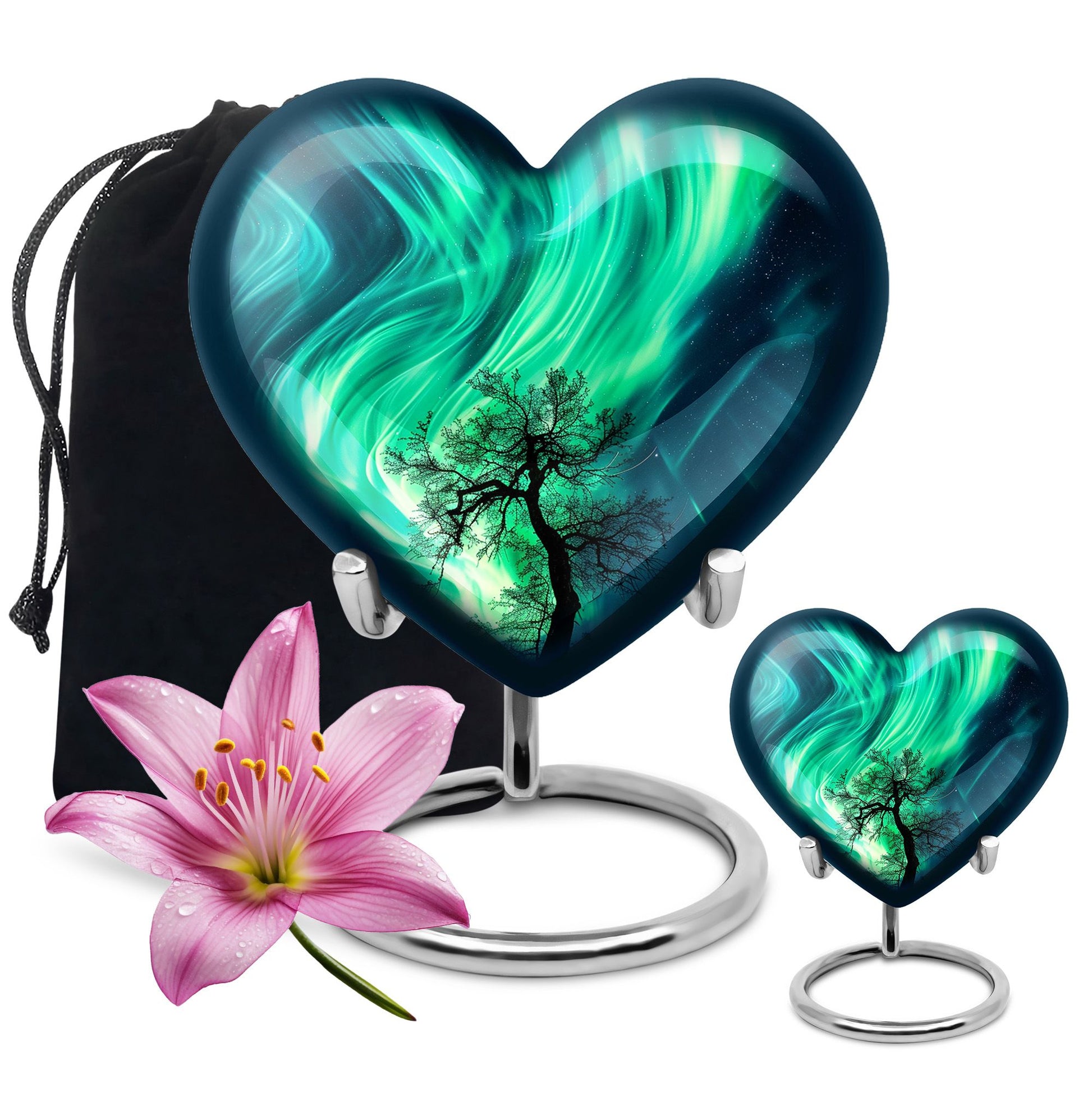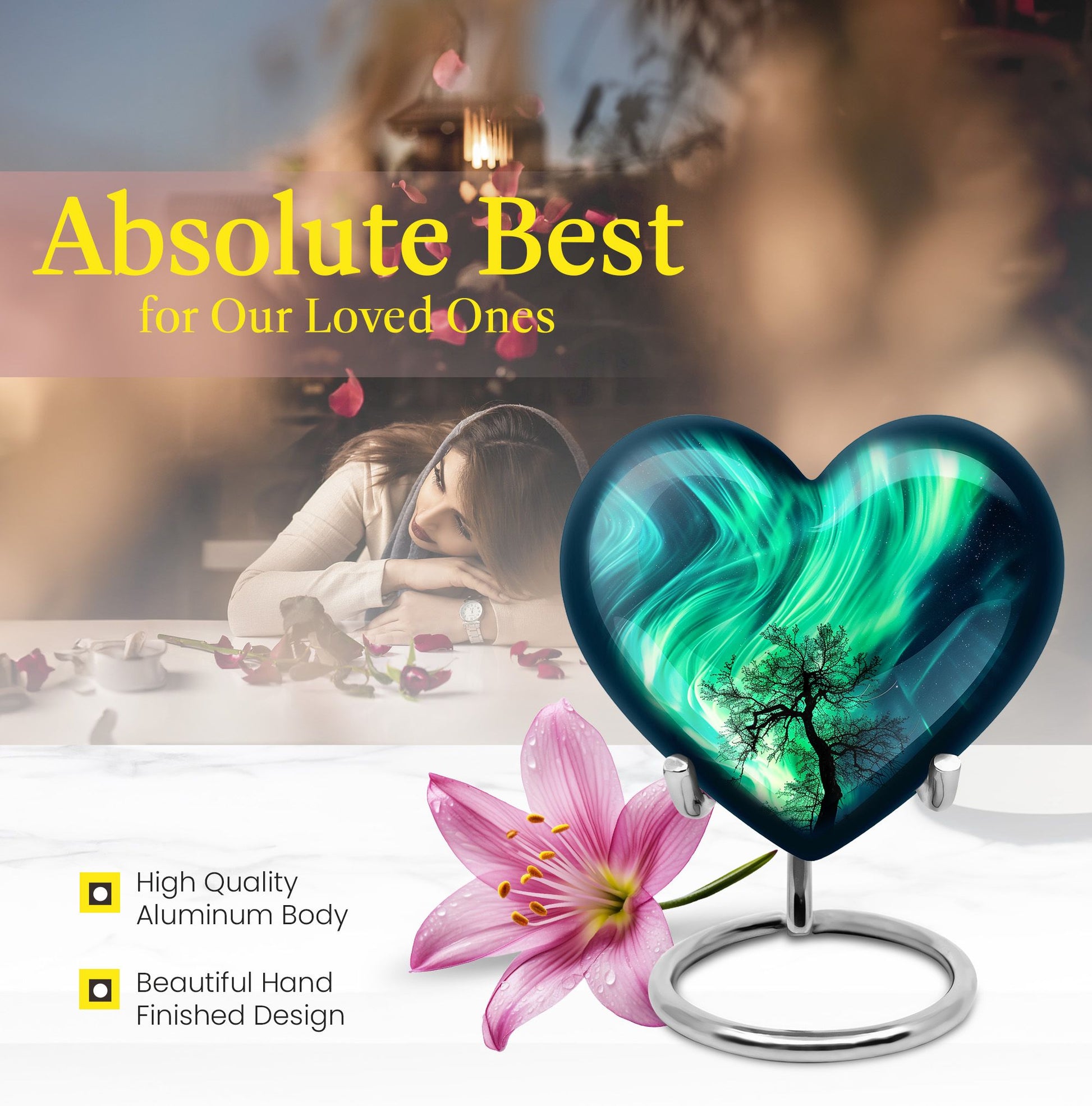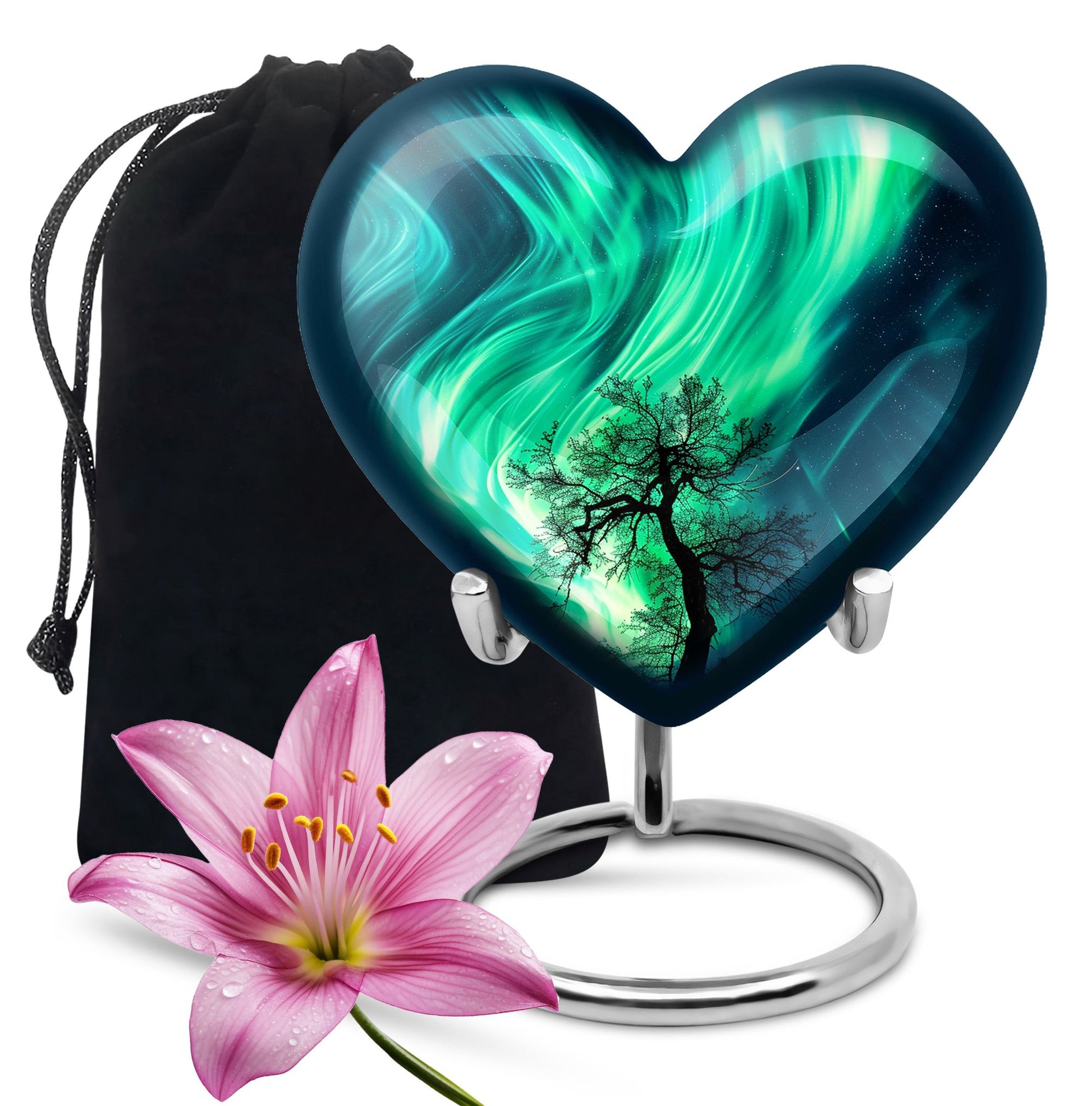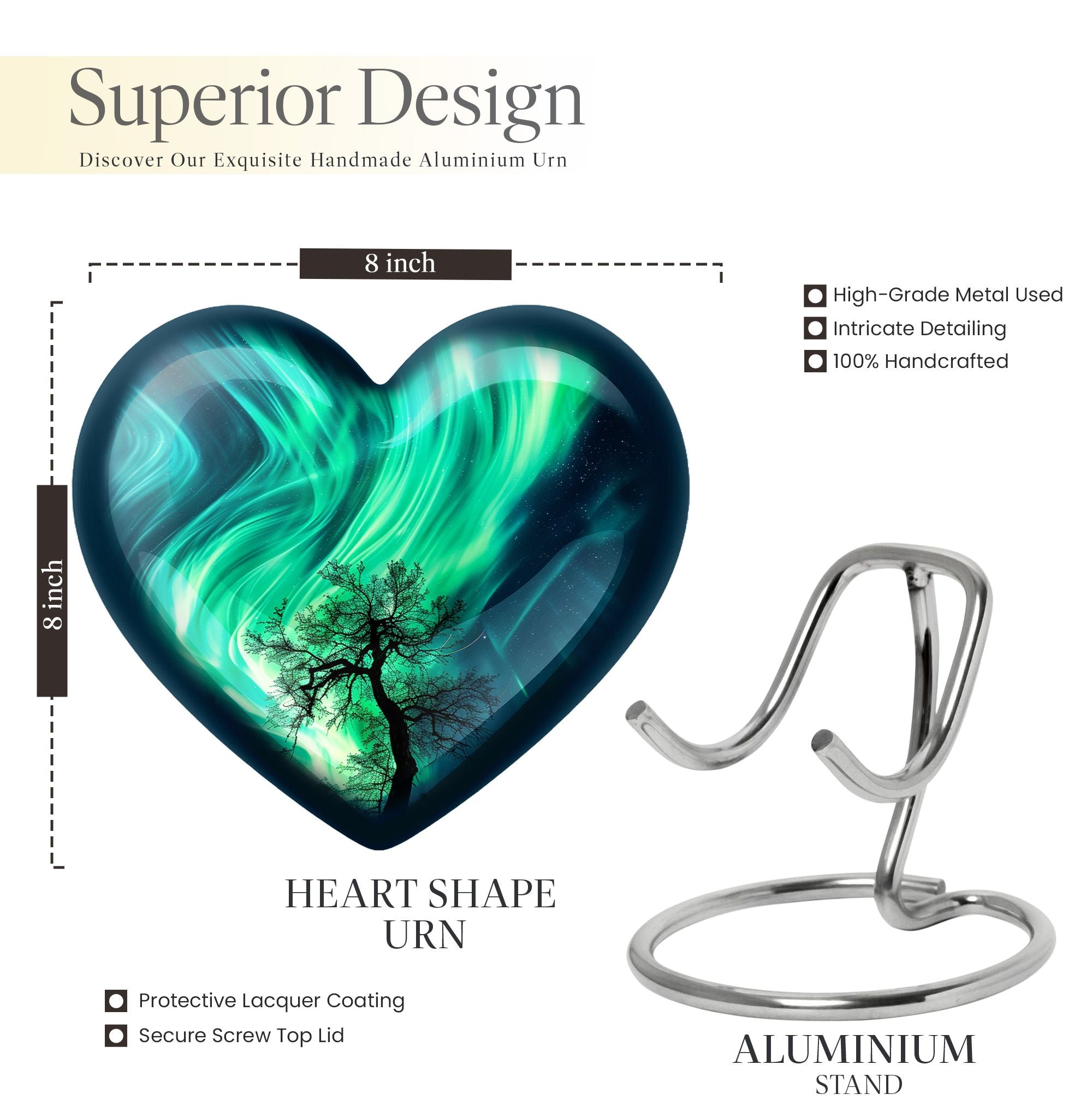 Cherish the memory of your loved ones with our 'Northern Lights Urn', an abstract-themed memorial urn crafted with utmost sincerity in the heart-shaped design. Measuring at a size of 10 inches and weighing just 3.3 pounds, this large urn is as noticeable and elegant as it is ethereal. Carved from high-quality aluminium, it can securely hold up to 200 cubic inches of ashes. It includes a velvet pouch for thoughtful and respectful containment of ashes while easing transportation. Not just a burial urn, it is a vessel to respect and cherish forever. Alongside its functional utility, it allows personalization where you can engrave names adding a unique and affectionate touch to honour your cherished one. Whether you need a unique burial urn or an adult ash urn, the Northern Lights Urn offers a comforting remembrance solution resonating your enduring affection. Ideal for burial in the ground, this funeral urn makes remembering extraordinary lives extraordinary.