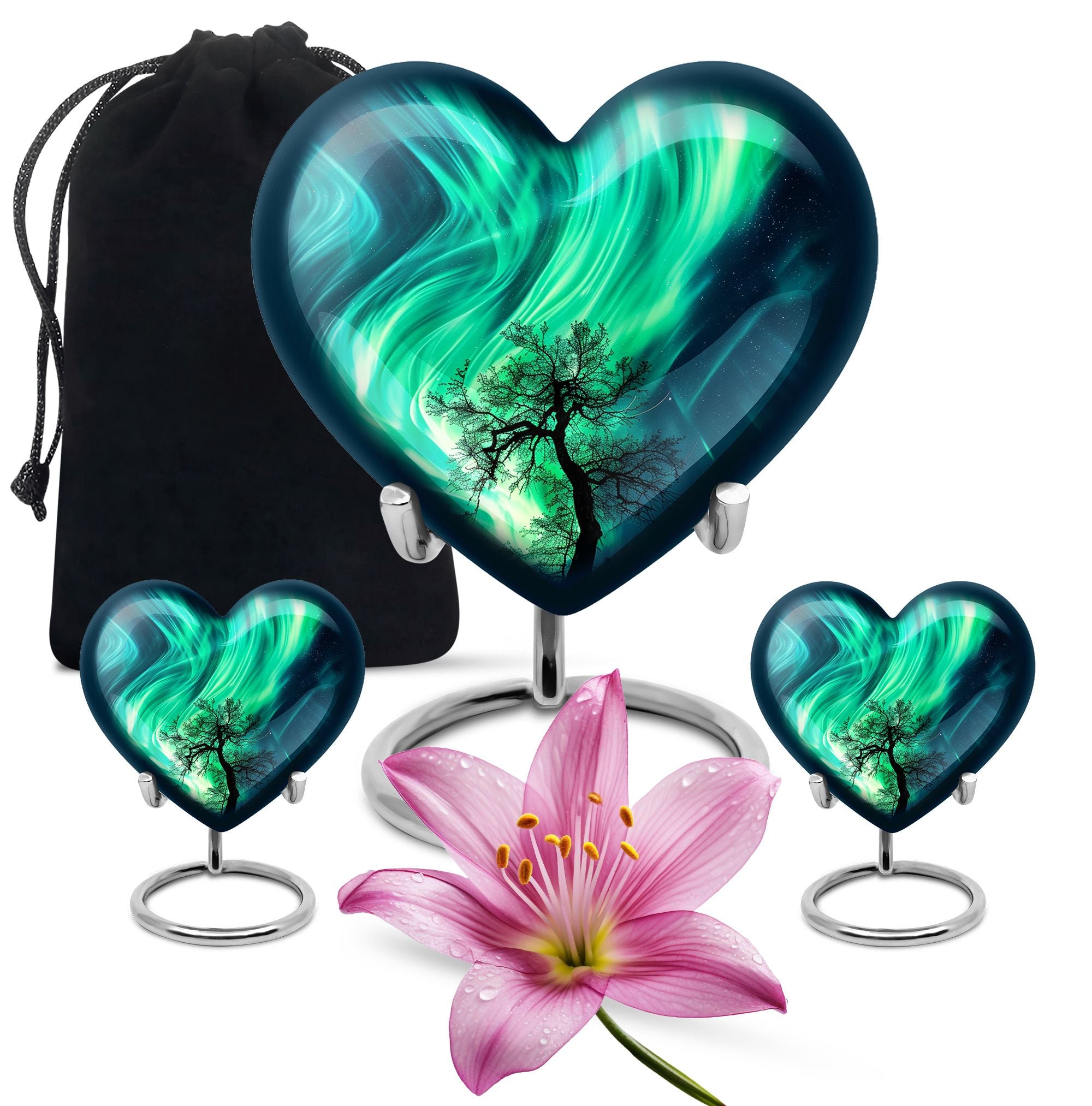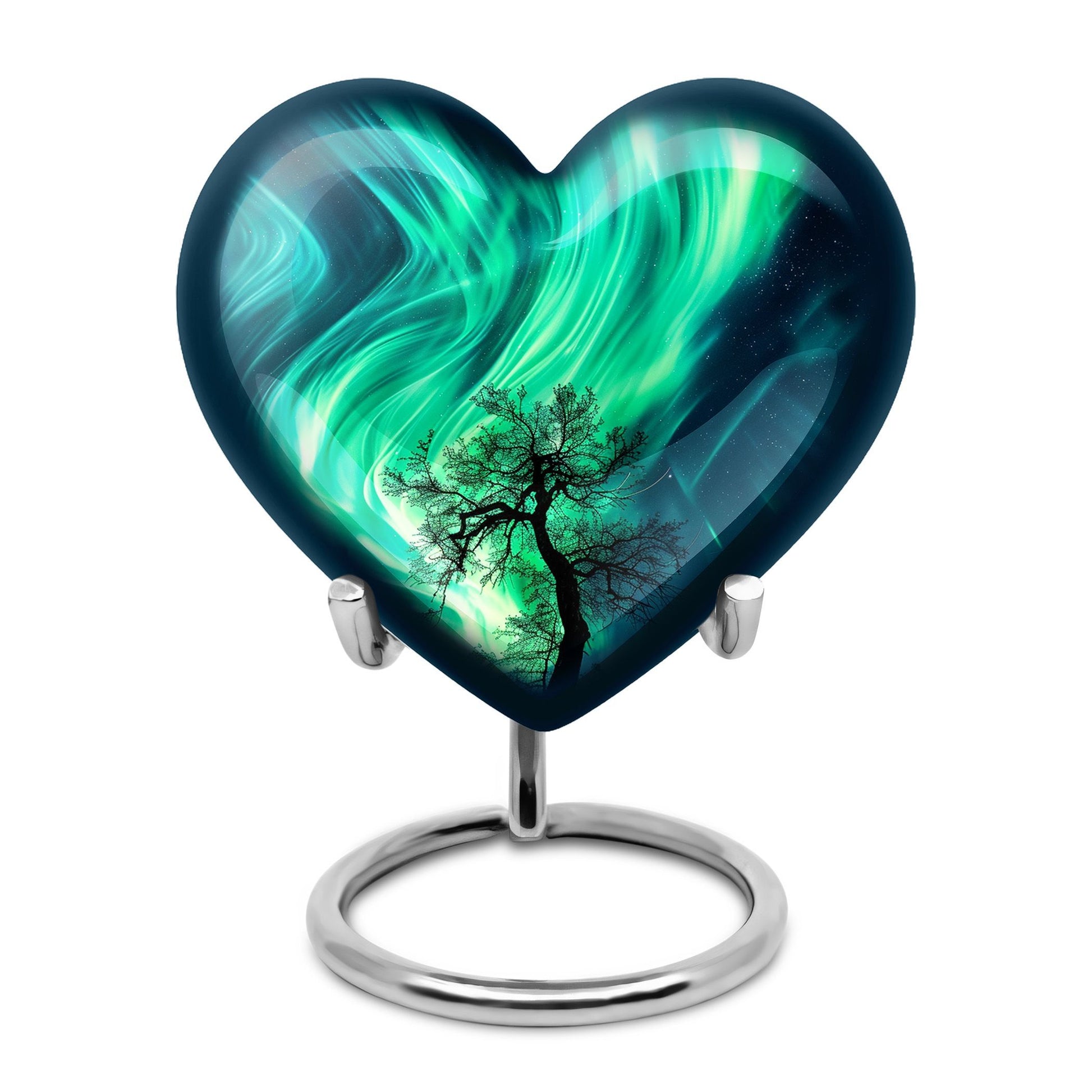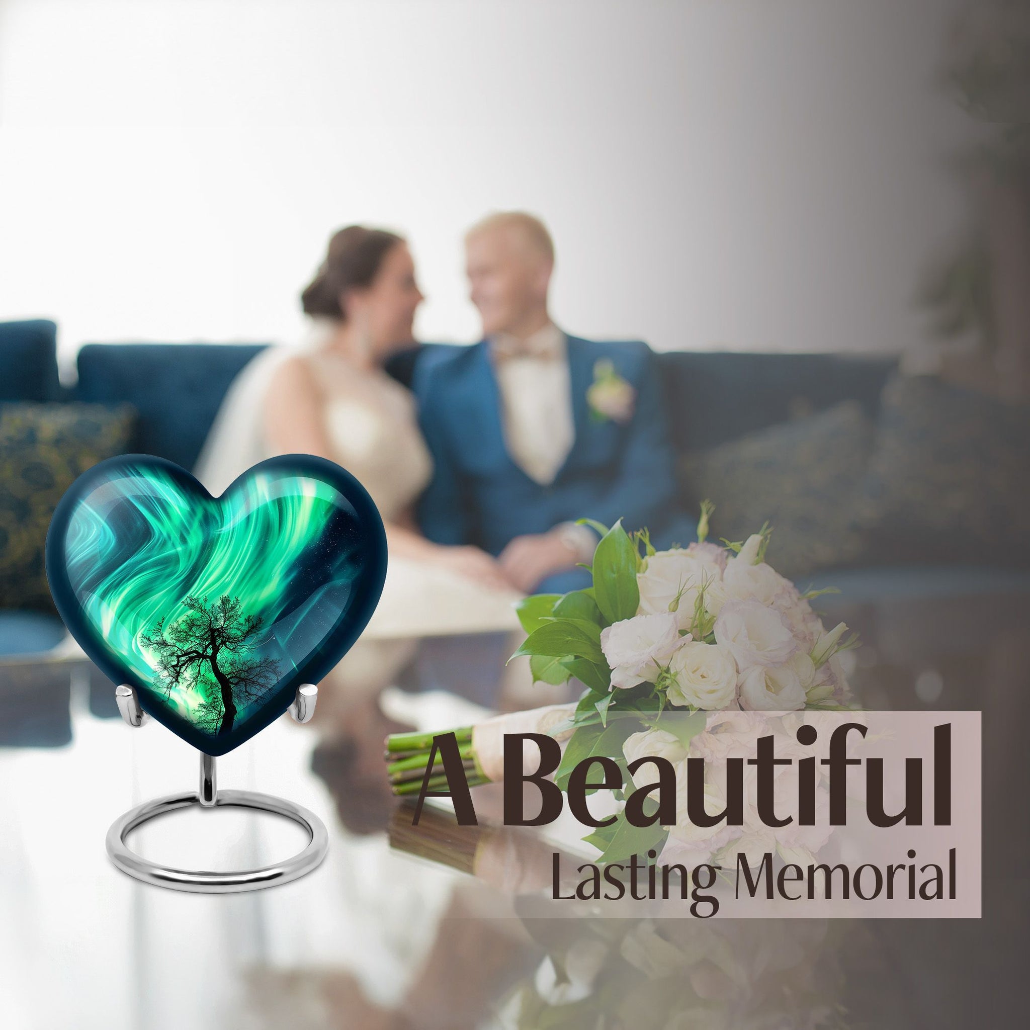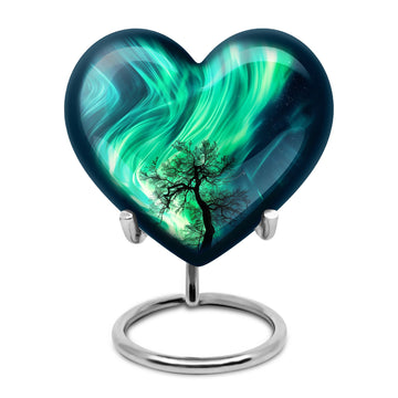 Cherish the memory of your loved ones with our 'Northern Lights Urn', an abstract-themed memorial urn crafted with utmost sincerity in the heart-shaped design. Measuring at a size of 10 inches and weighing just 3.3 pounds, this large urn is as noticeable and elegant as it is ethereal. Carved from high-quality aluminium, it can securely hold up to 200 cubic inches of ashes. It includes a velvet pouch for thoughtful and respectful containment of ashes while easing transportation. Not just a burial urn, it is a vessel to respect and cherish forever. Alongside its functional utility, it allows personalization where you can engrave names adding a unique and affectionate touch to honour your cherished one. Whether you need a unique burial urn or an adult ash urn, the Northern Lights Urn offers a comforting remembrance solution resonating your enduring affection. Ideal for burial in the ground, this funeral urn makes remembering extraordinary lives extraordinary.