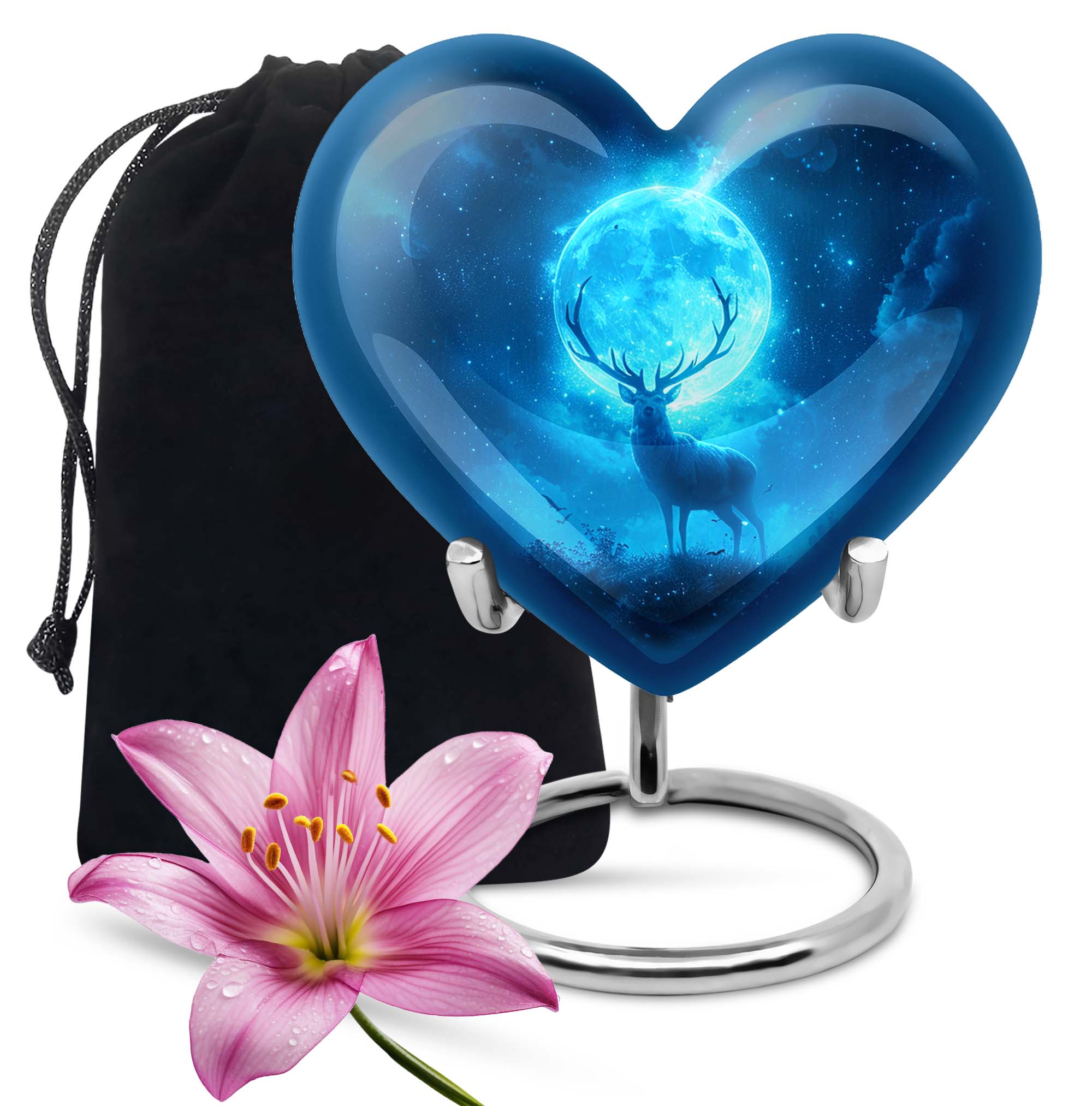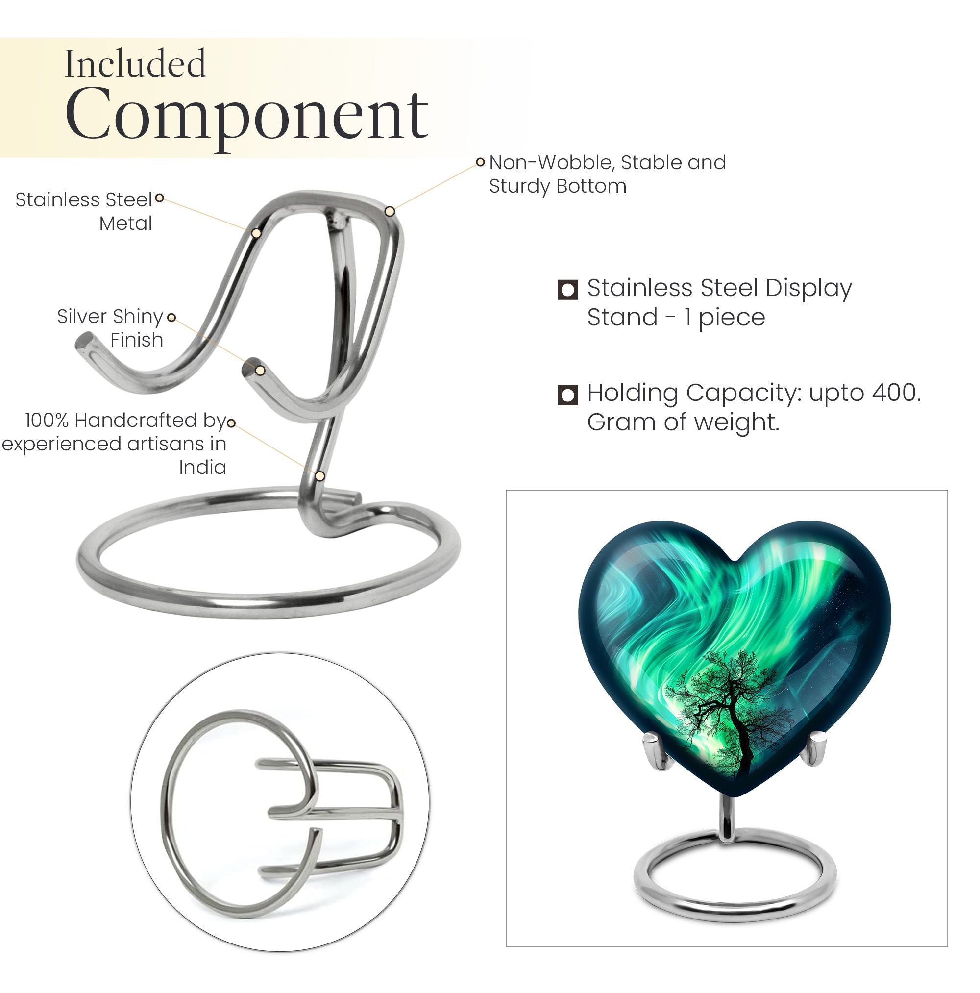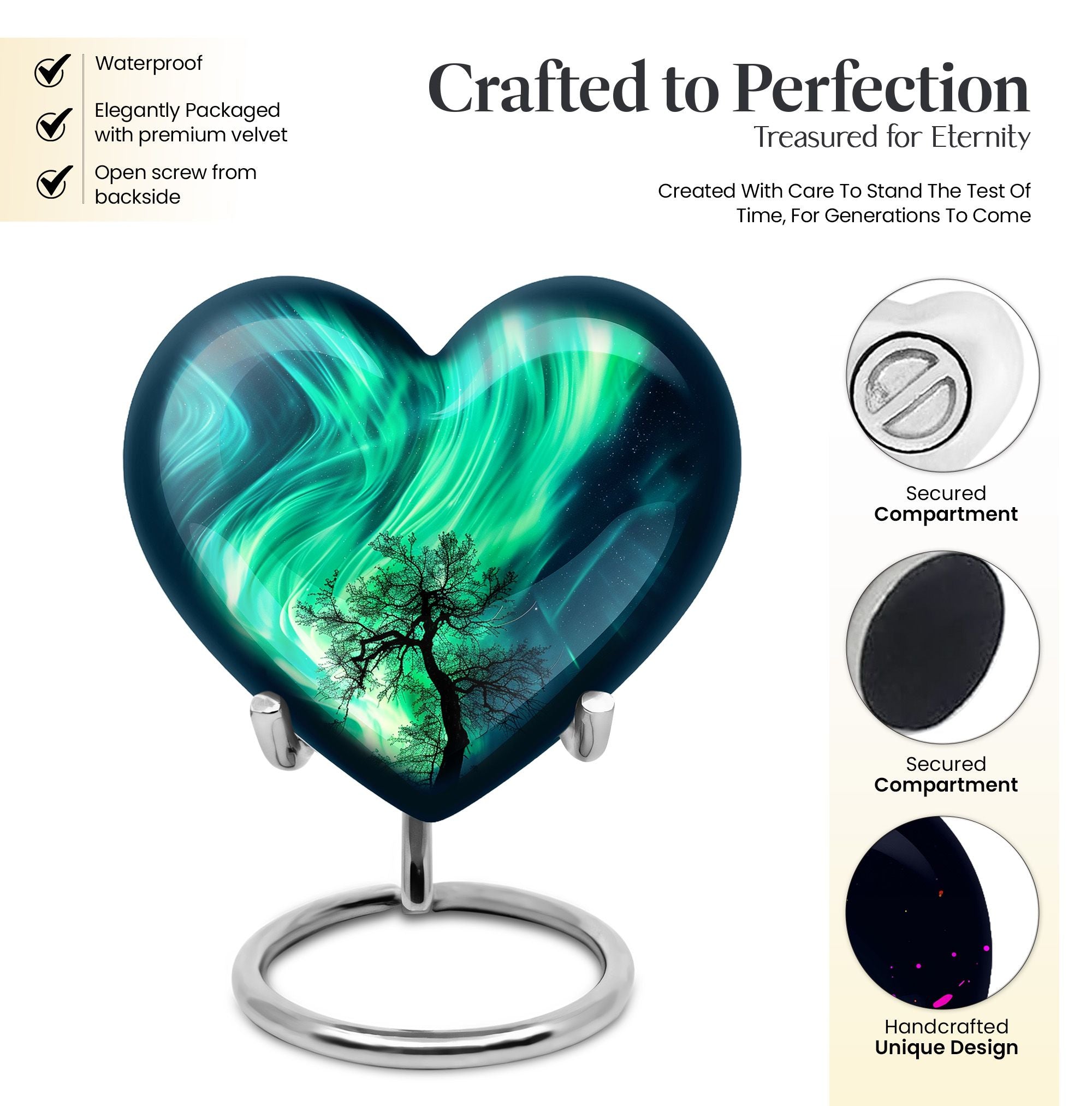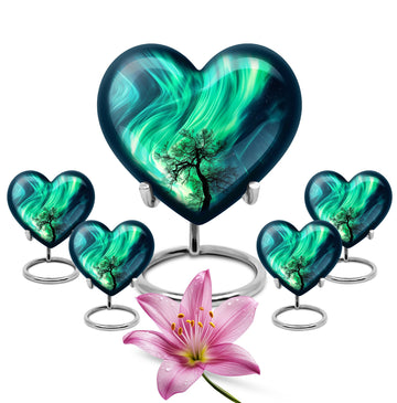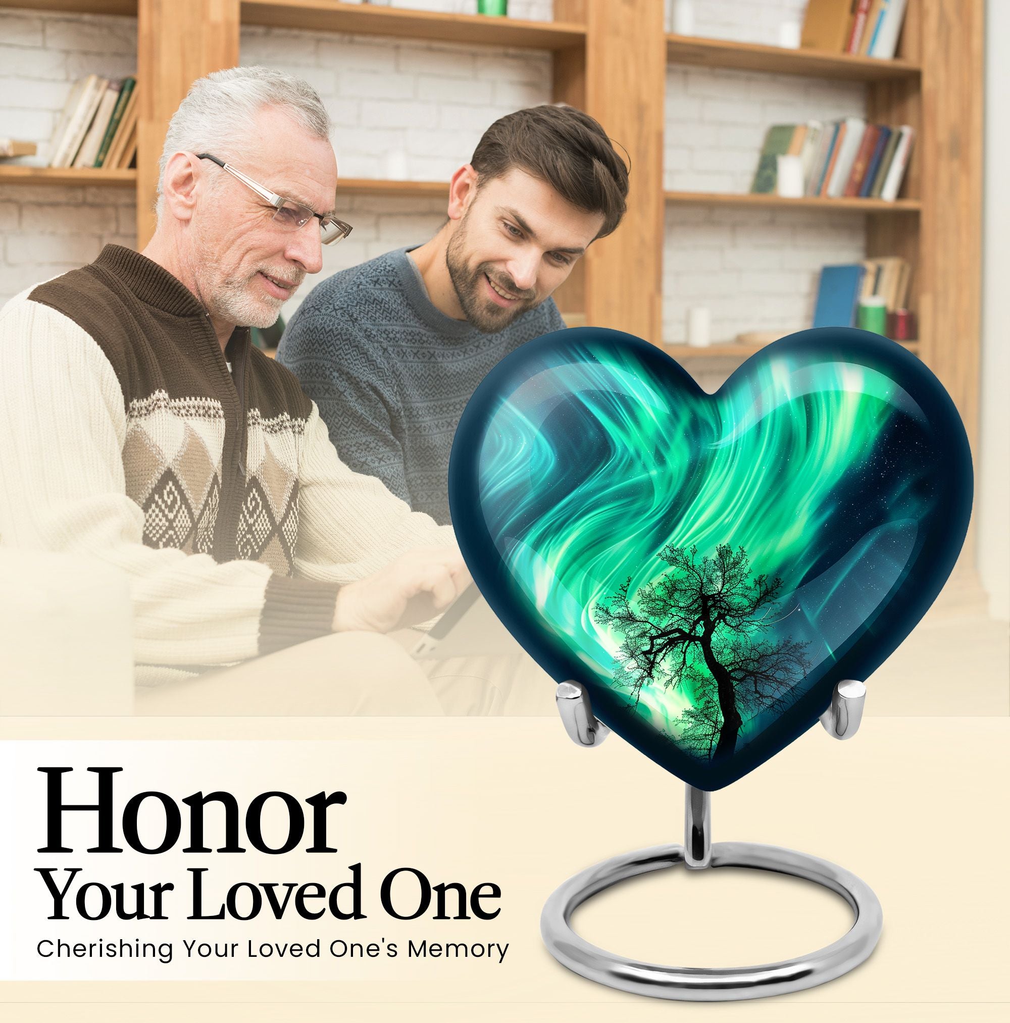 Cherish the memory of your loved ones with our 'Northern Lights Urn', an abstract-themed memorial urn crafted with utmost sincerity in the heart-shaped design. Measuring at a size of 10 inches and weighing just 3.3 pounds, this large urn is as noticeable and elegant as it is ethereal. Carved from high-quality aluminium, it can securely hold up to 200 cubic inches of ashes. It includes a velvet pouch for thoughtful and respectful containment of ashes while easing transportation. Not just a burial urn, it is a vessel to respect and cherish forever. Alongside its functional utility, it allows personalization where you can engrave names adding a unique and affectionate touch to honour your cherished one. Whether you need a unique burial urn or an adult ash urn, the Northern Lights Urn offers a comforting remembrance solution resonating your enduring affection. Ideal for burial in the ground, this funeral urn makes remembering extraordinary lives extraordinary.