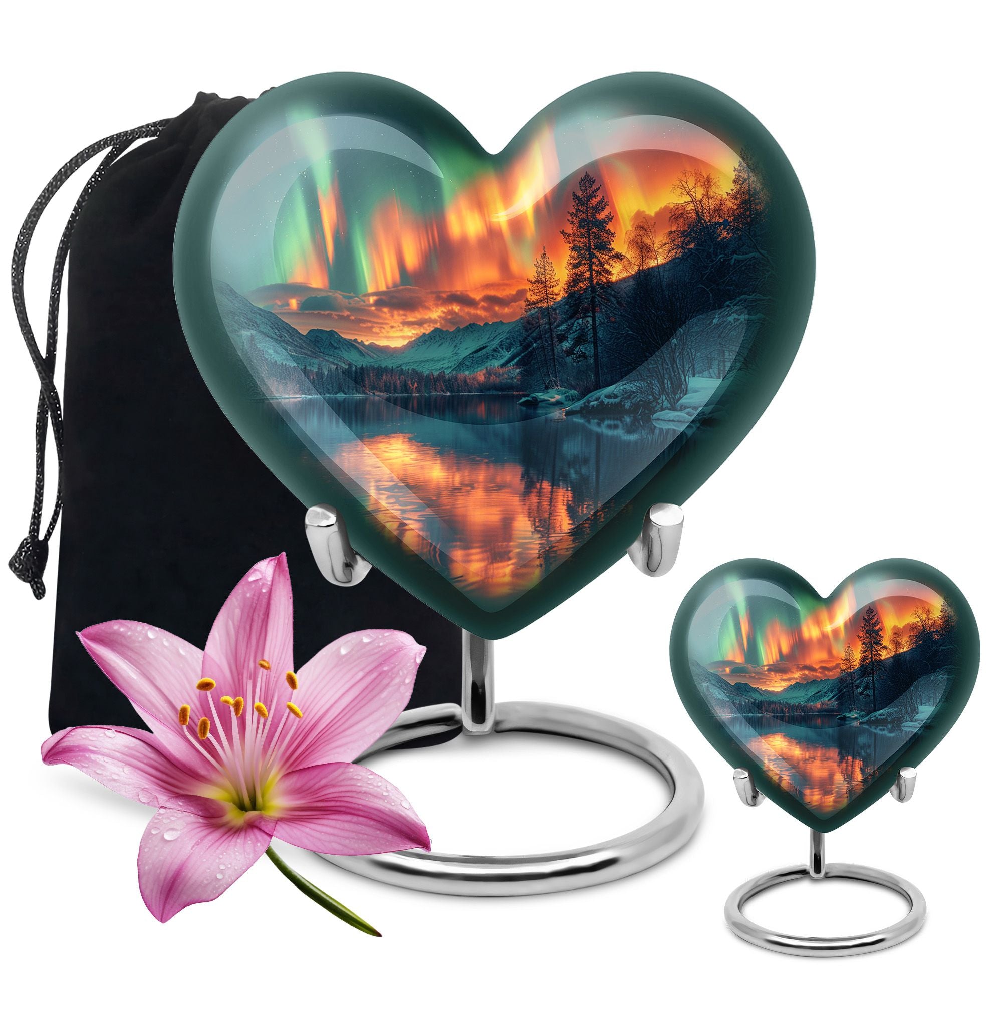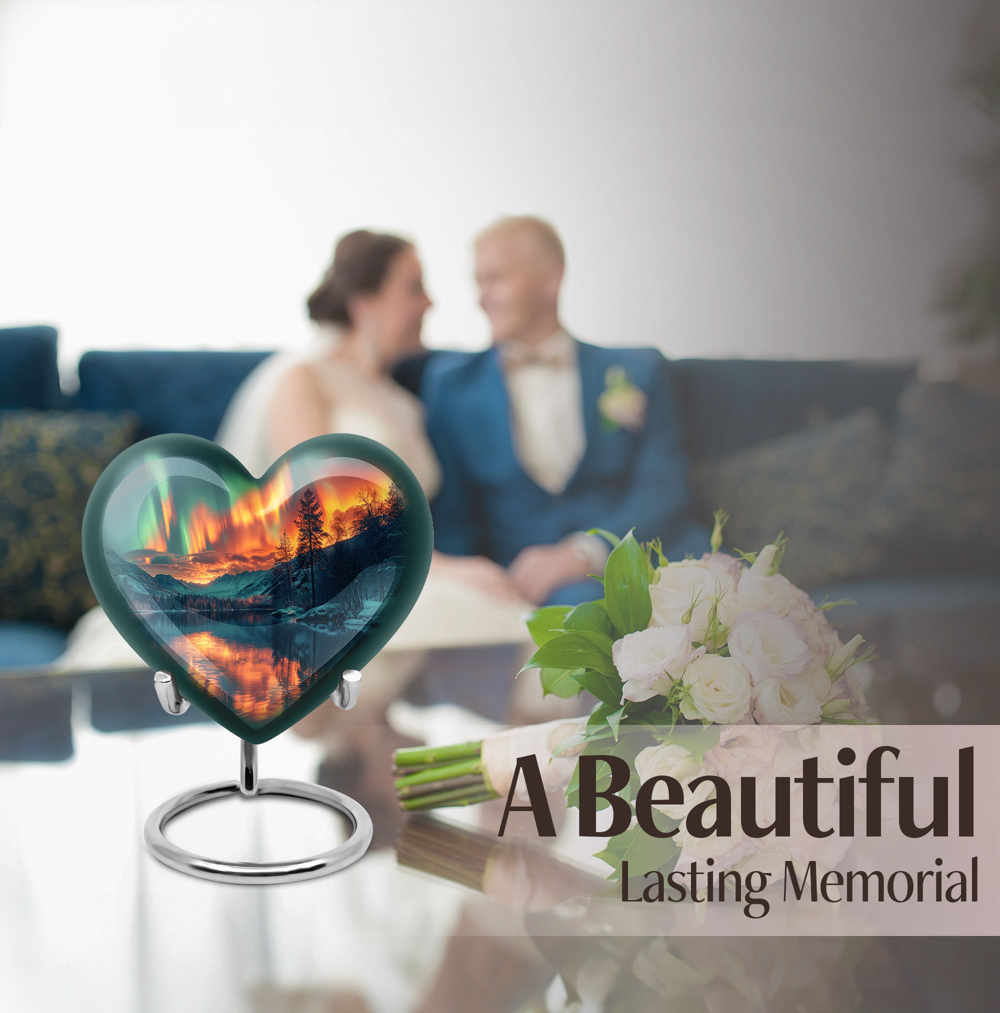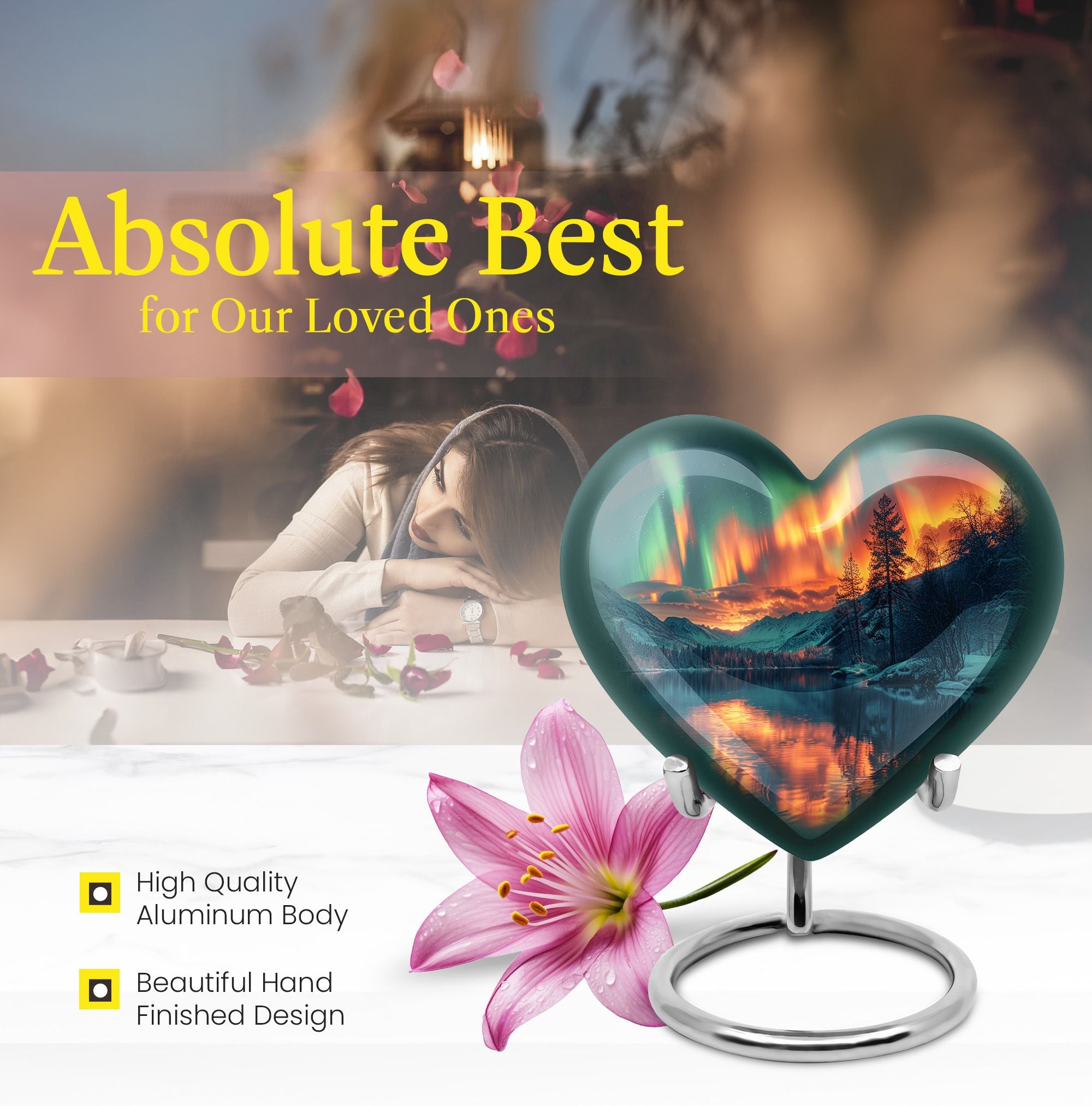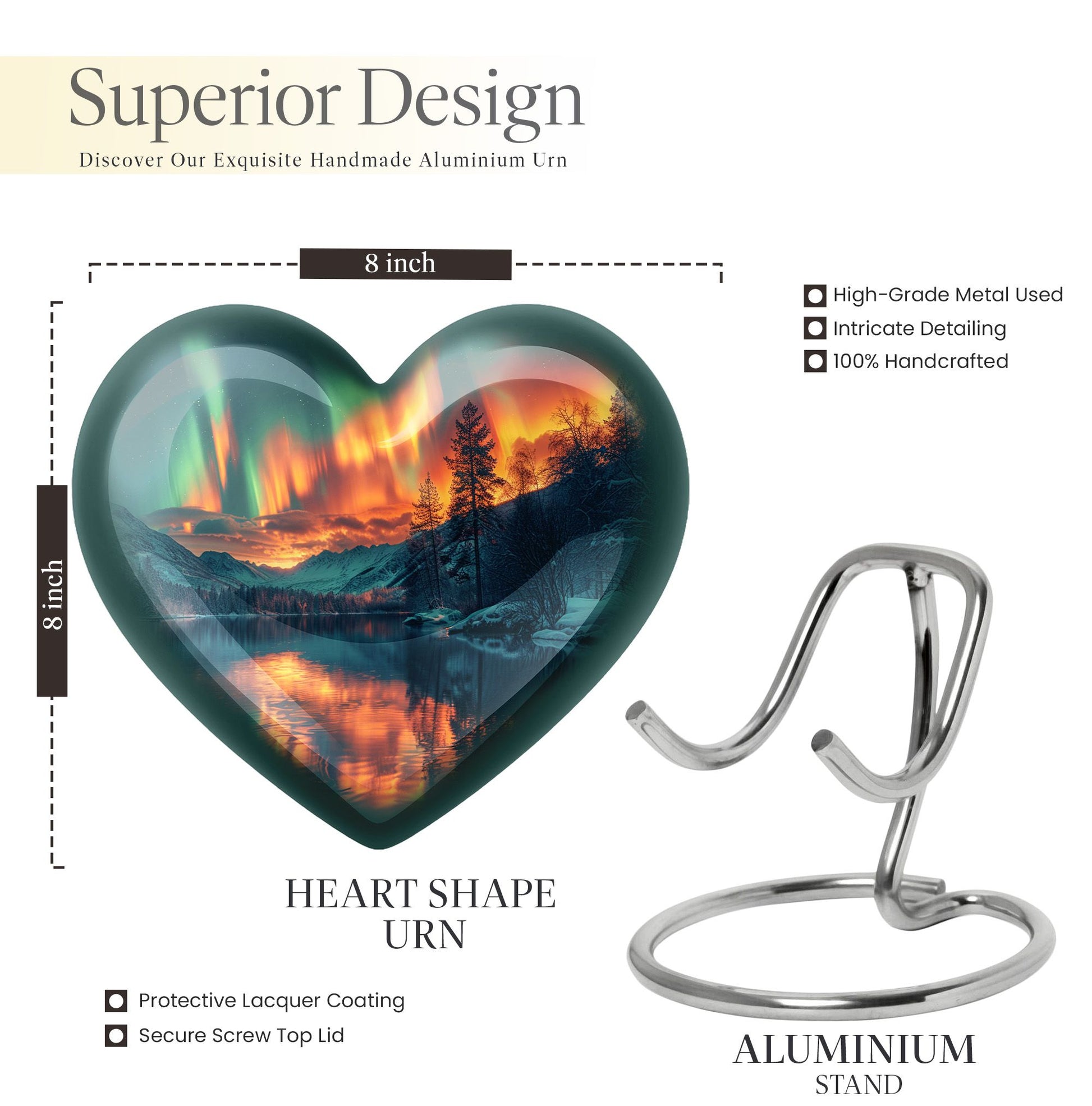 Presenting the Soulful Northern Lights Urn, a sublime piece meticulously crafted for your loved ones. This burial funeral urn is sized at 10 inches and comes with a comfortable weight of 3.3 pounds, making it a substantial memorial item. The urn's abstract theme renders it an exquisite work of art, underscoring the dignity of the person whose ashes it carries. It can hold up to 200 cubic inches. Crafted from robust and sleek aluminium, the urn is strong and built to last, paying a lasting tribute to the departed. The urn comes complete with a velvet pouch for a respectful containment of ashes. We also offer an option to personalize these large urns with engraved names, allowing you to create a truly meaningful memento. Popularly searched as 'cremation memorial urns for human ashes,' 'human urn adult ash woman,' 'cremation box,' and 'adult size cremation urns', this item perfectly fits your search for memorial urns. Note: The design attribute is not mentioned as per instructions.