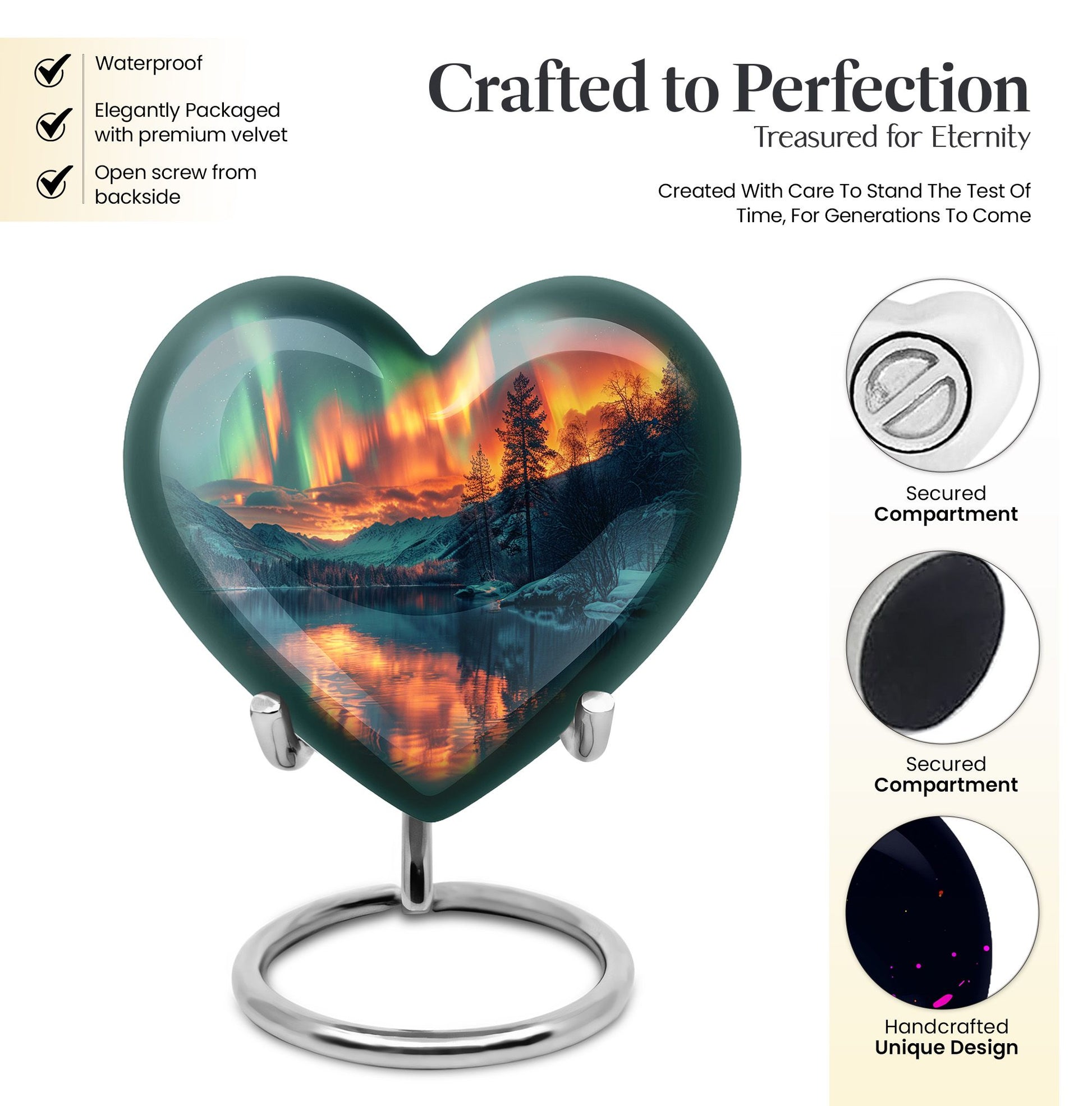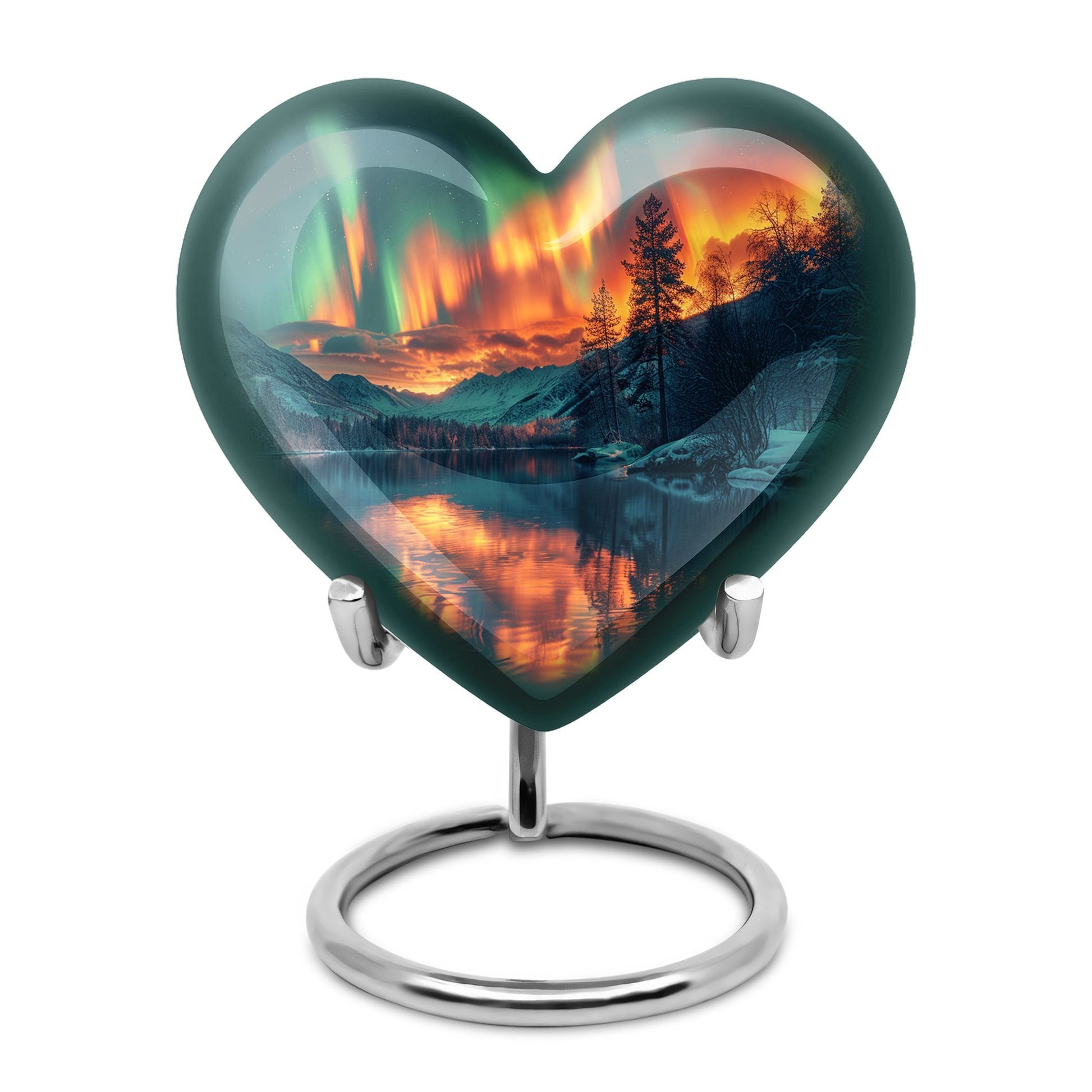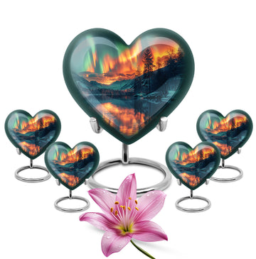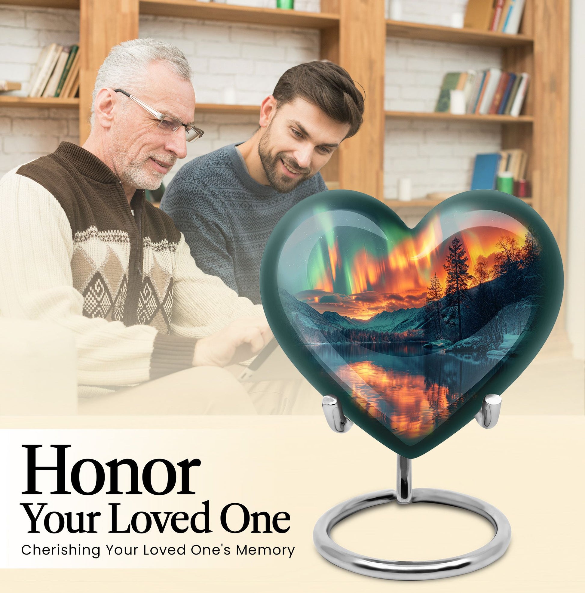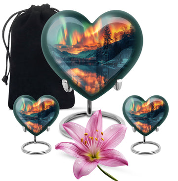 Presenting the Soulful Northern Lights Urn, a sublime piece meticulously crafted for your loved ones. This burial funeral urn is sized at 10 inches and comes with a comfortable weight of 3.3 pounds, making it a substantial memorial item. The urn's abstract theme renders it an exquisite work of art, underscoring the dignity of the person whose ashes it carries. It can hold up to 200 cubic inches. Crafted from robust and sleek aluminium, the urn is strong and built to last, paying a lasting tribute to the departed. The urn comes complete with a velvet pouch for a respectful containment of ashes. We also offer an option to personalize these large urns with engraved names, allowing you to create a truly meaningful memento. Popularly searched as 'cremation memorial urns for human ashes,' 'human urn adult ash woman,' 'cremation box,' and 'adult size cremation urns', this item perfectly fits your search for memorial urns. Note: The design attribute is not mentioned as per instructions.