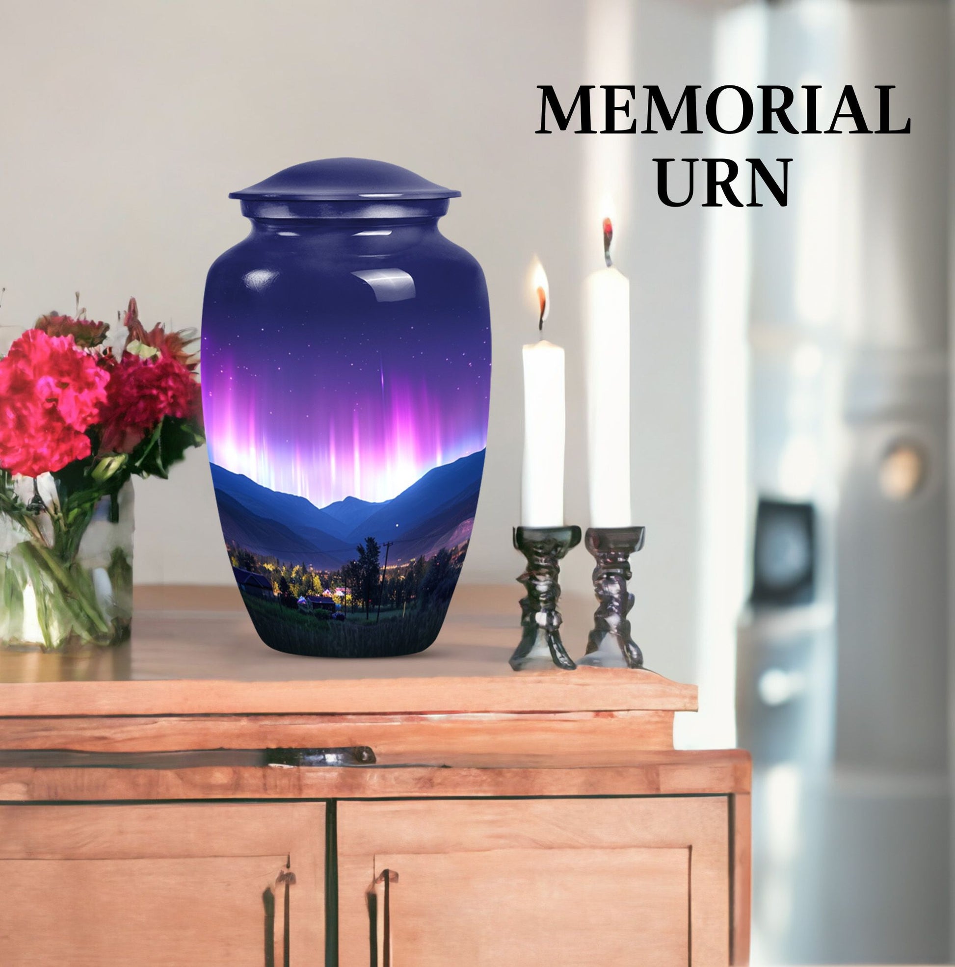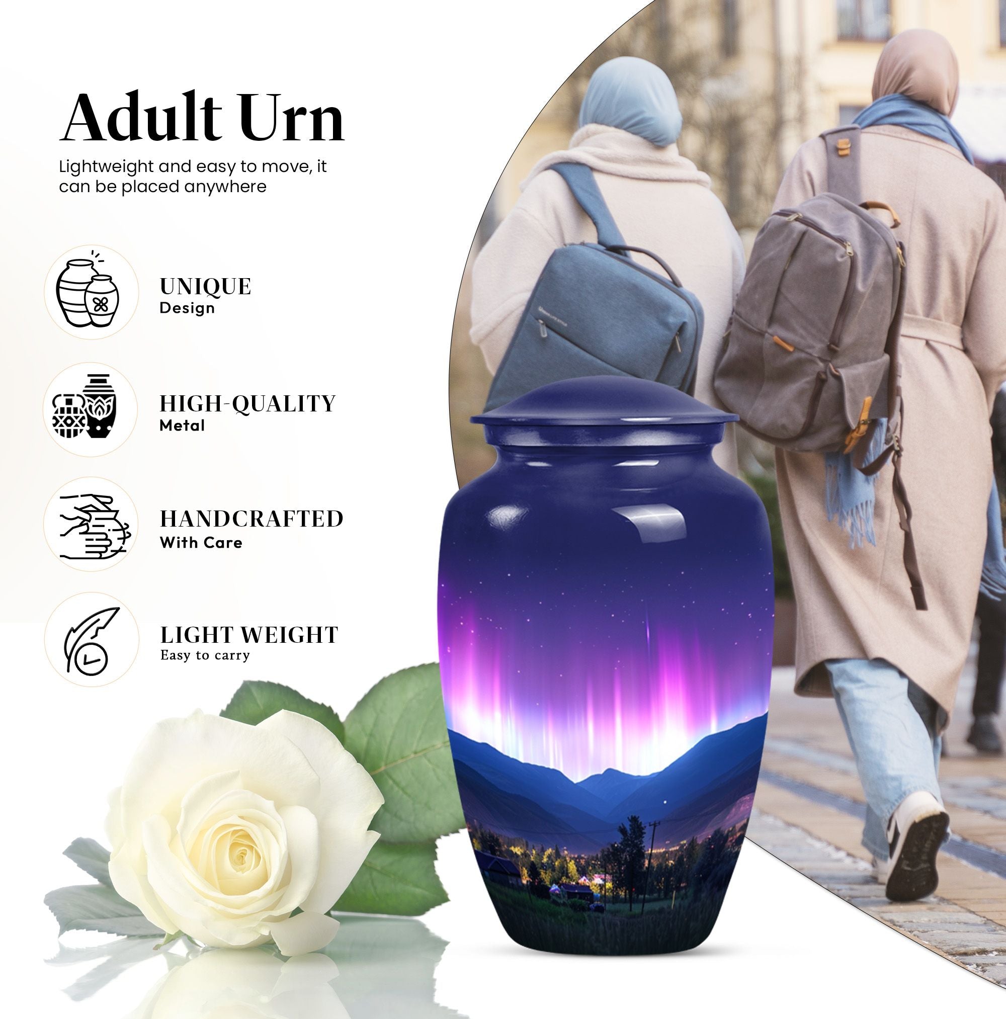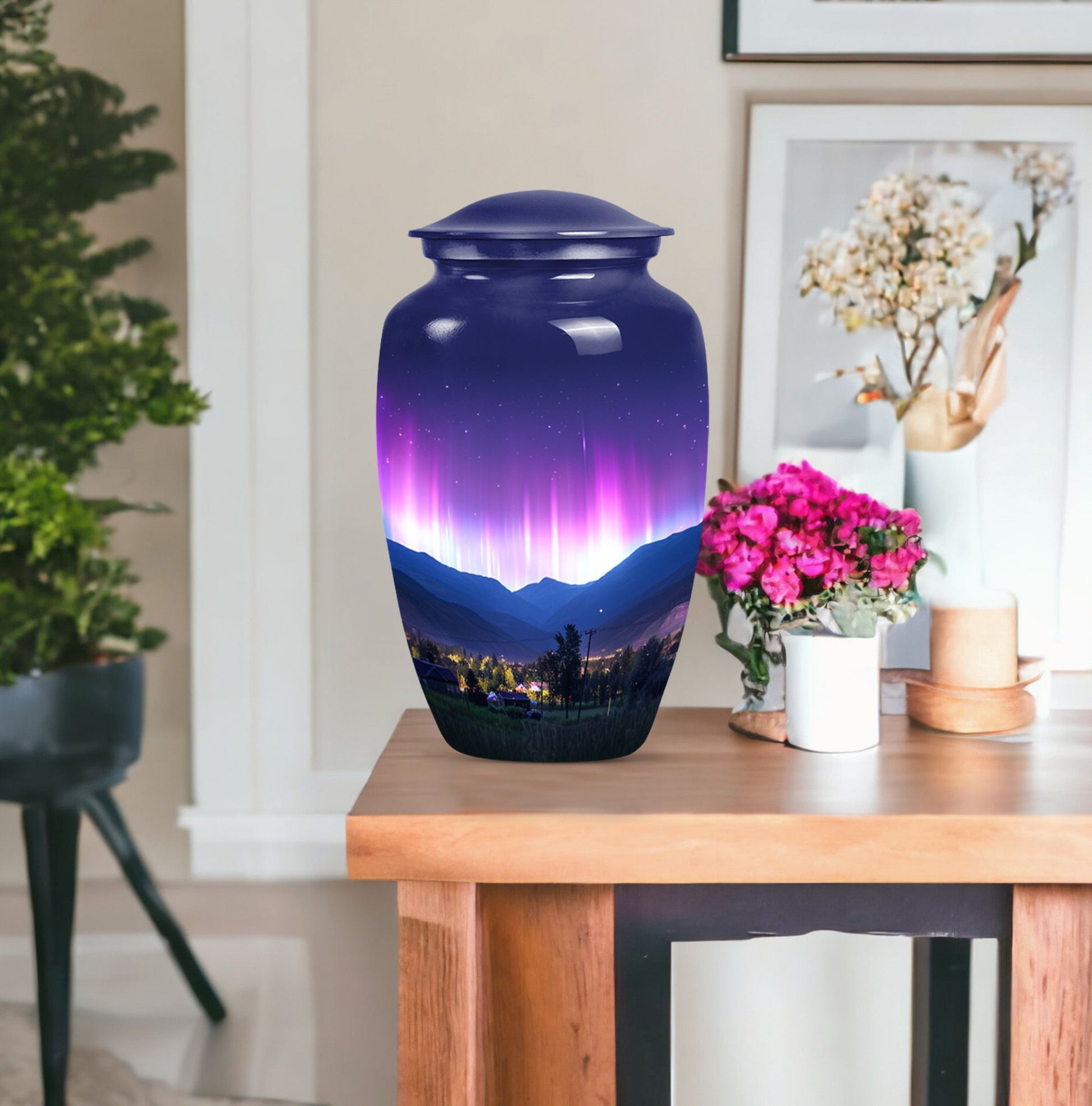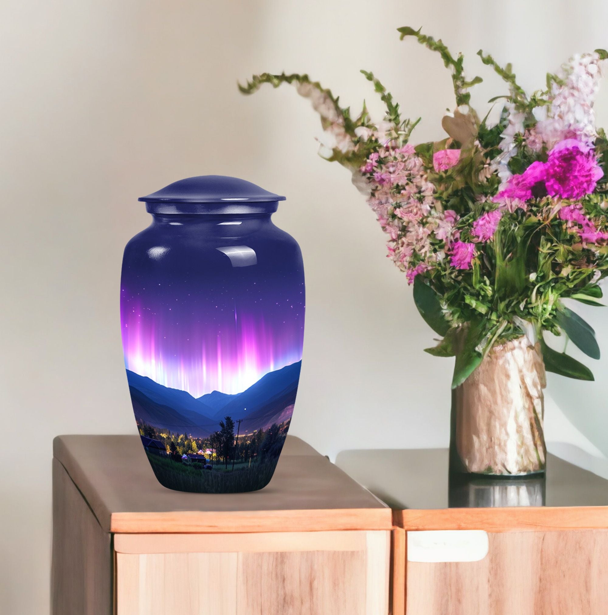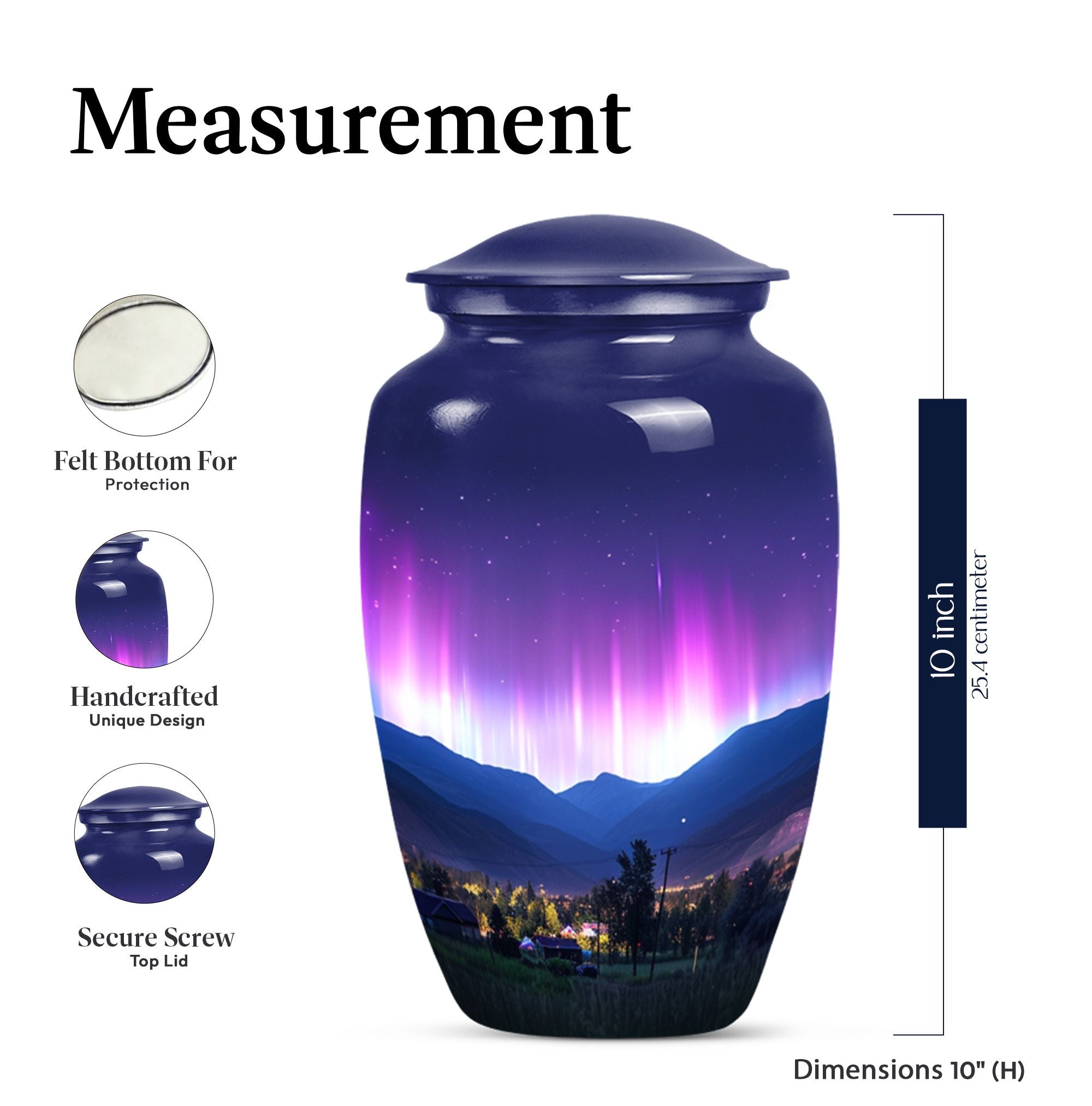 Illuminate the memory of your beloved with this Northern Lights cremation urn, a heartfelt tribute for a cherished father or a revered mother. Our large urn crafted from sturdy aluminum, measures 10 inches in height and weighs a solid 3.3 pounds, embodying a sense of permanence and eternity. Harmoniously blending aesthetics with functionality, it offers a comforting and solemn representation for your loved one’s rest. The space inside can generously accommodate 200 cubic inches, ensuring a trusted containment for the ashes. A miniature version of our burial urns, it is accented with a cross design, symbolizing faith and divine love. The urn package is thoughtfully complemented with a velvet pouch to hold the ashes3. With provision for personal engraving, you can inscribe names, thus lending a touch of intimacy and closeness to the memorial tribute. The butterfly theme signifies transformation and a spiritual journey, reflecting the soul’s ascension into divine light. This cremation urn for human ashes serves as a reminiscent of your loved ones, holding them close in spirit, always.