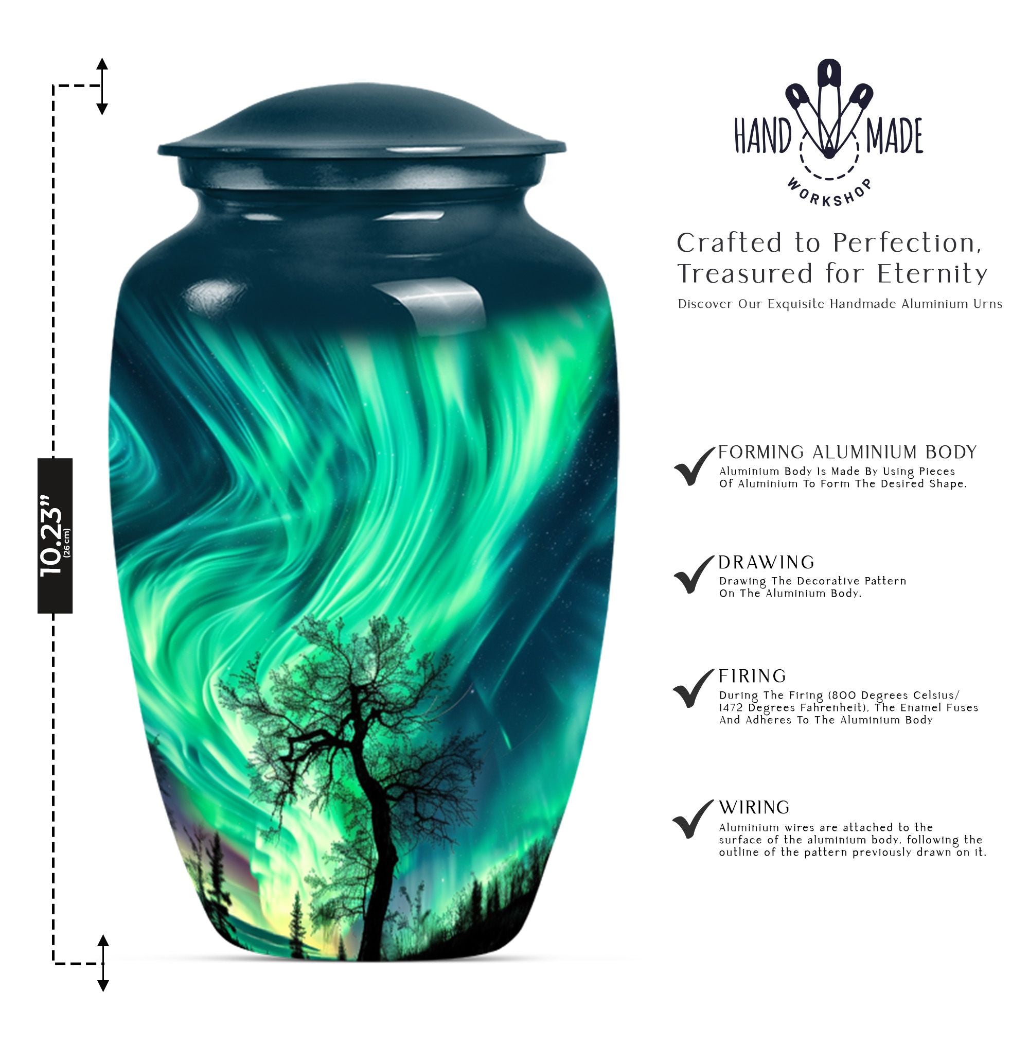 Immerse yourself in the serene tranquility of a Purple Meadow with our Northern Lights Urn. This exquisite artifact, a type of large urn, serves as an ideal tribute to honour the memory of your loved one. Measuring 10-inch and crafted from superior quality aluminium, the cremation urn possesses a durable structure robust enough to withstand wear and tear over time. It weighs an accessible 3.3 pounds and sports convenient dimensions of 10 inches in height. The urn has a substantial capacity of about 200 cubic inches, offering ample room for preserving adult male's ashes. One distinctive feature of this cremation urn is the option to personalize it with engraved names, lending it a unique touch. It comes thoughtfully packaged with a velvet pouch for discreet containment of ashes. Suitable for both genders, this funeral metal urn serves as a fitting choice for burial in the ground. Notably excluded from the realm of mundane, this northern lights urn is a dignified celebration of life in its purest form. With this burial urn for men & women's ashes, keep your bond alive, even in memory.