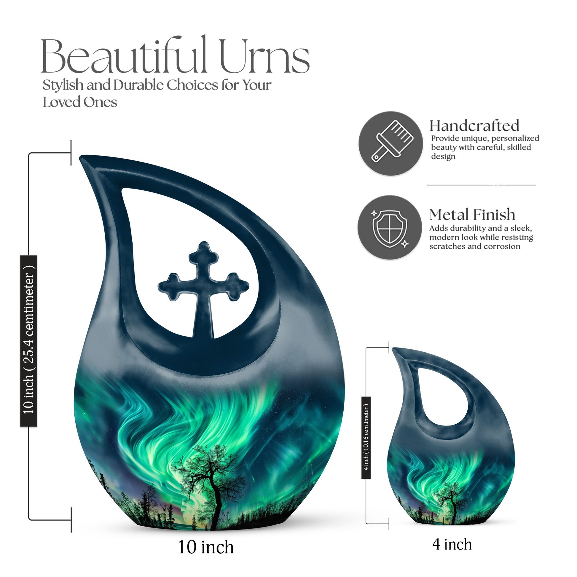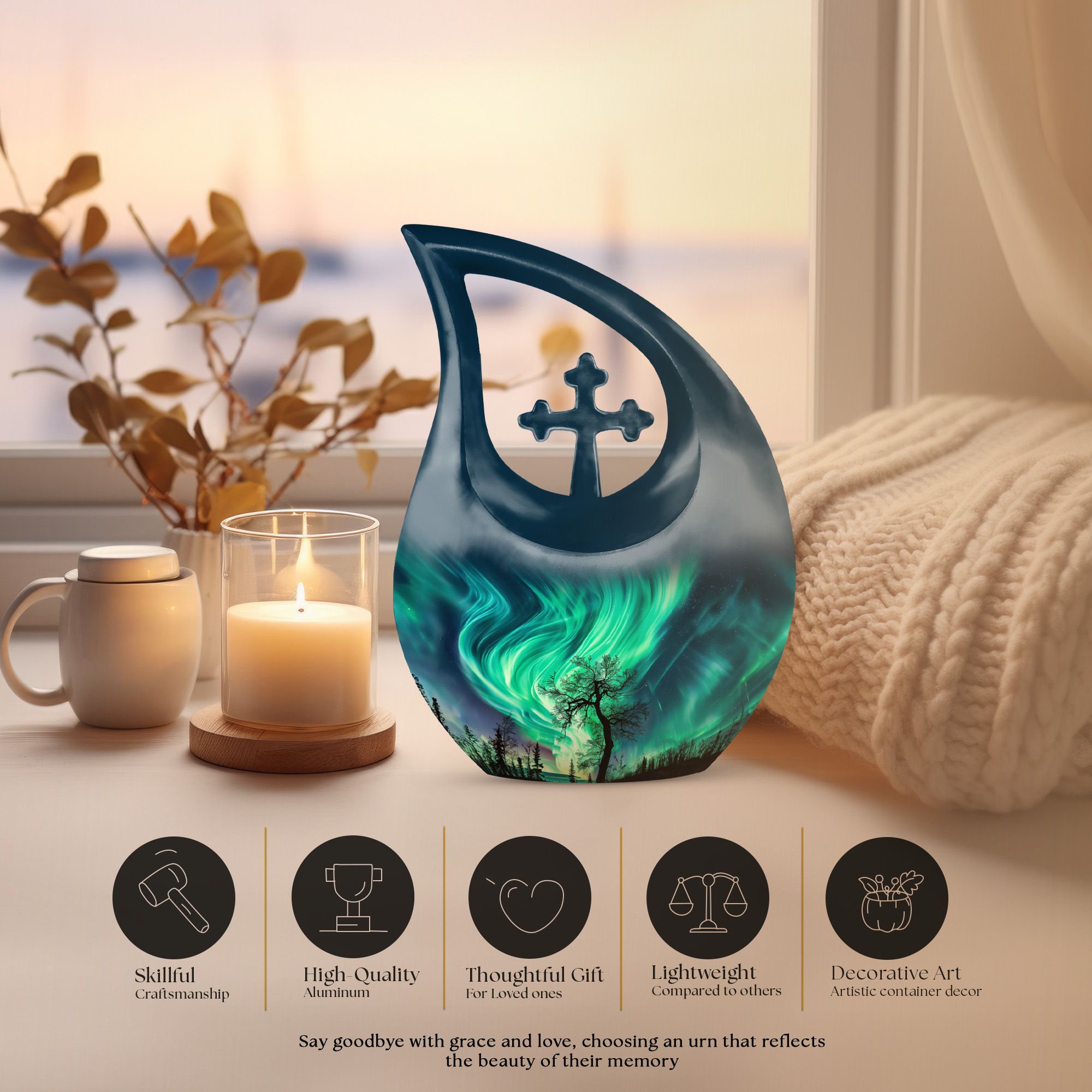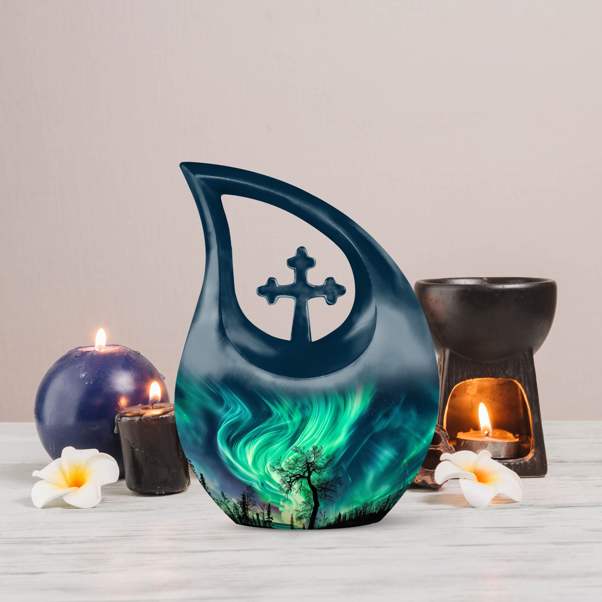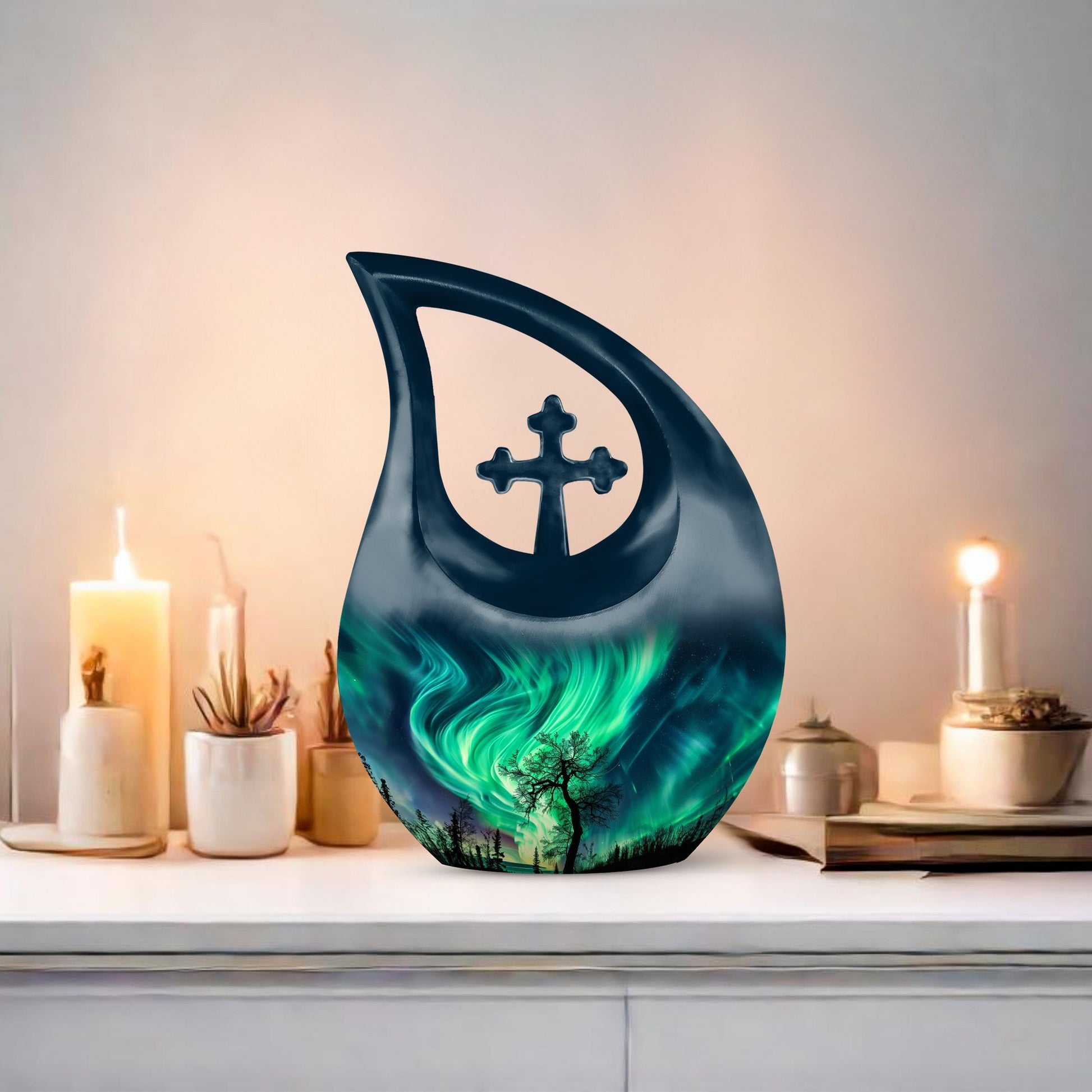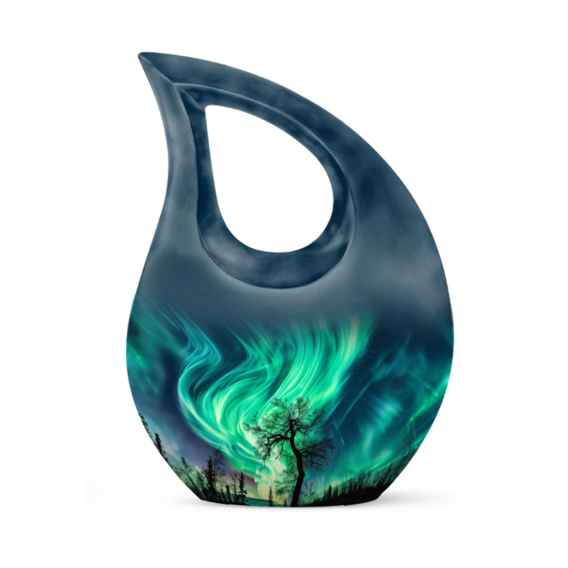 This Northern Lights burial urn offers a peaceful and heartfelt way to honor a cherished life, capturing the celestial glow of the night sky. Designed for families seeking a human cremation urn or a cremation urn for human ashes, it provides a comforting tribute filled with light, love, and lasting remembrance.