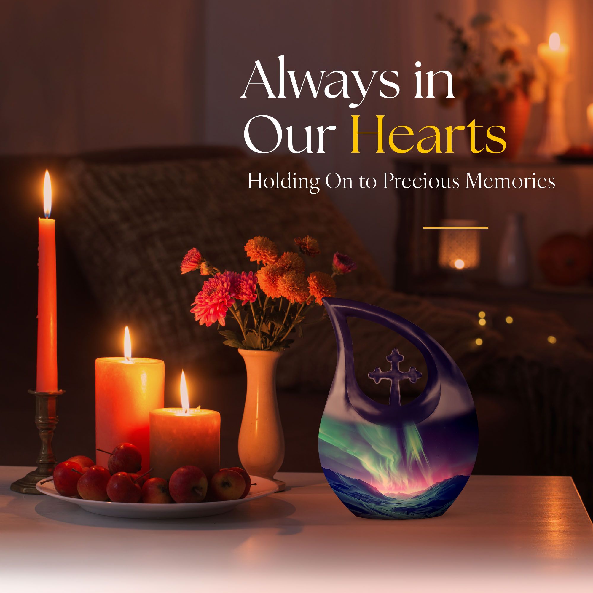This Northern Lights set creates a serene, love-filled tribute for honoring a cherished parent, partner, or family member. The calming celestial design offers a sense of hope and continued presence, making it a beautiful centerpiece for memorials, home displays, or shared keepsake collections.