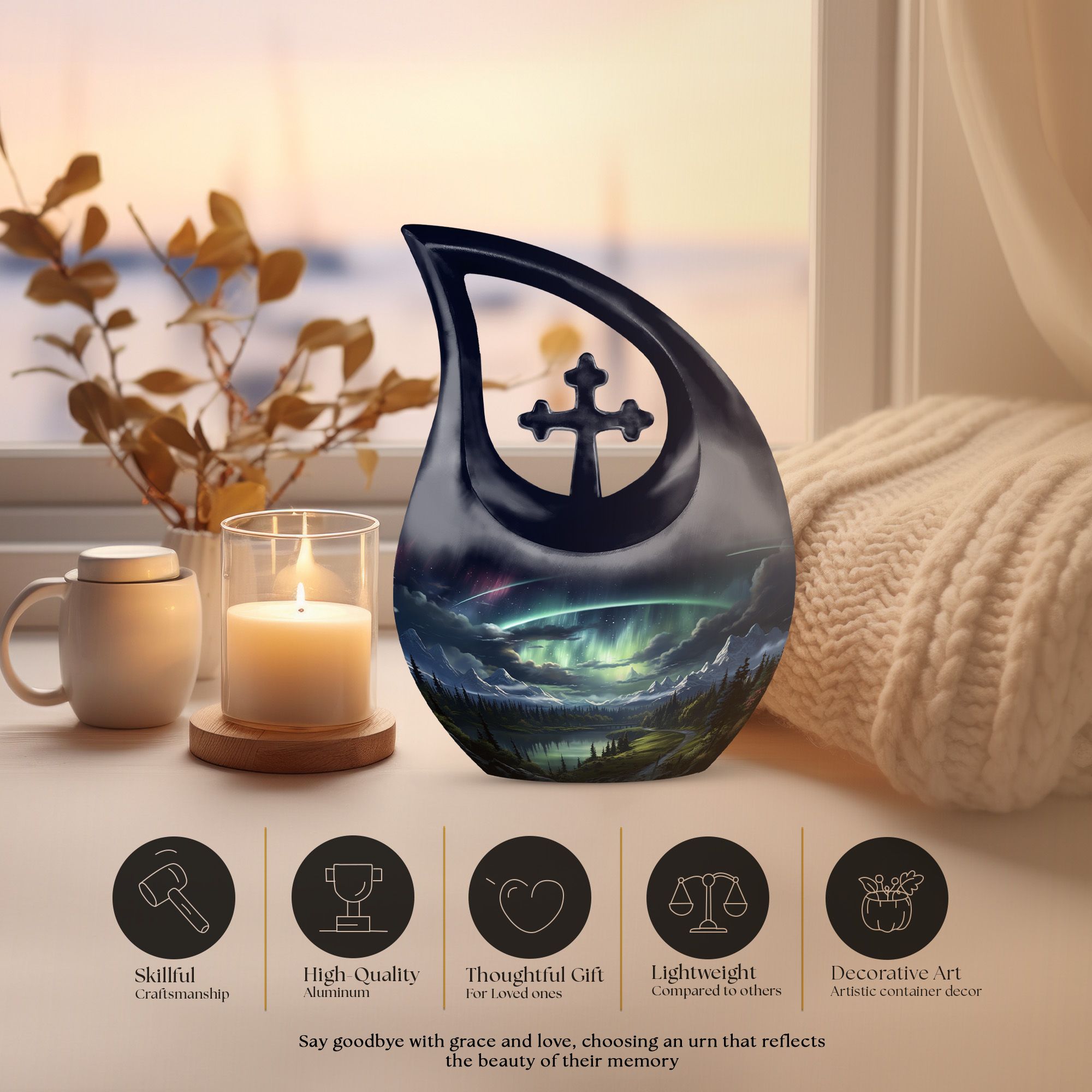The Northern Lights Urn embodies both art and emotion—an elegant expression of remembrance and peace. Each urn stands as a symbol of love that continues to shine brightly, keeping your loved one’s memory beautifully illuminated for generations.