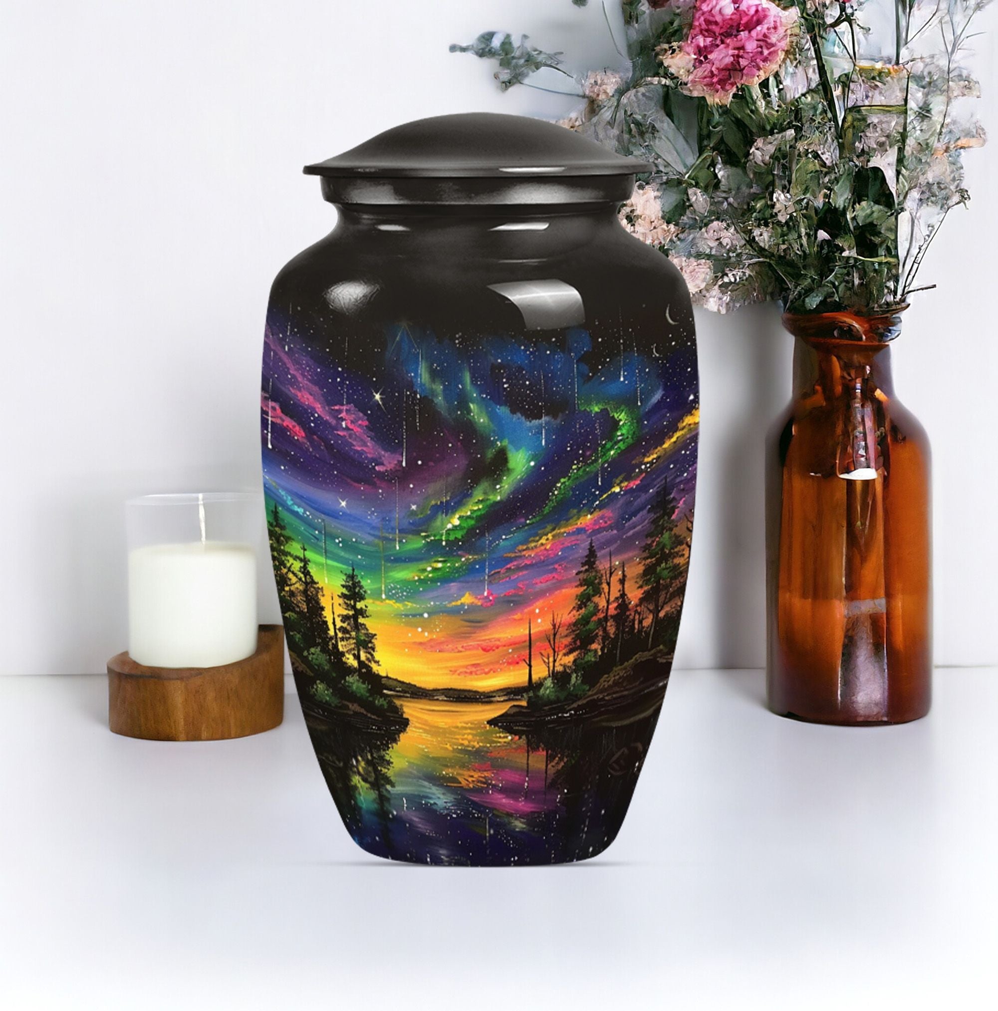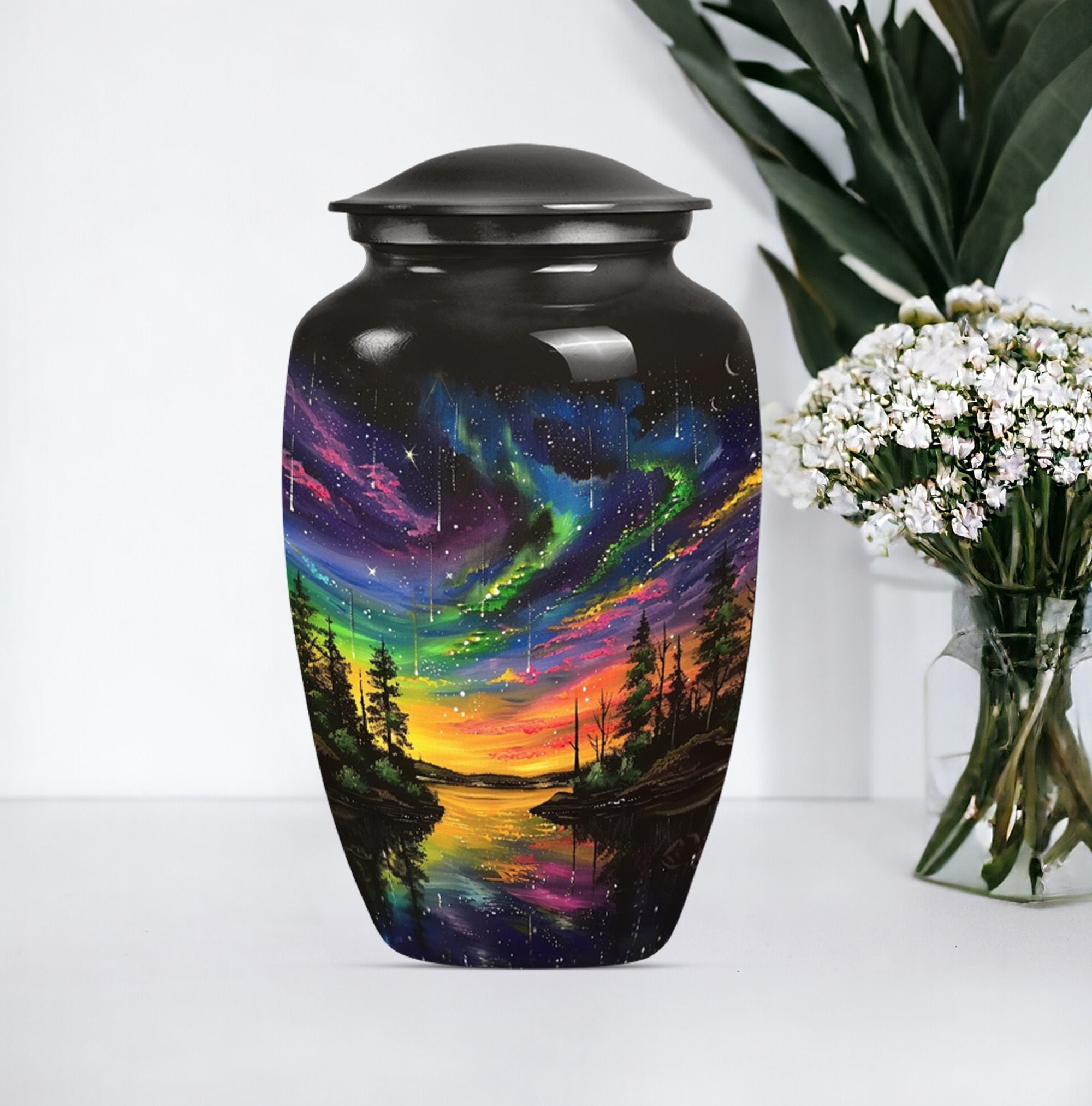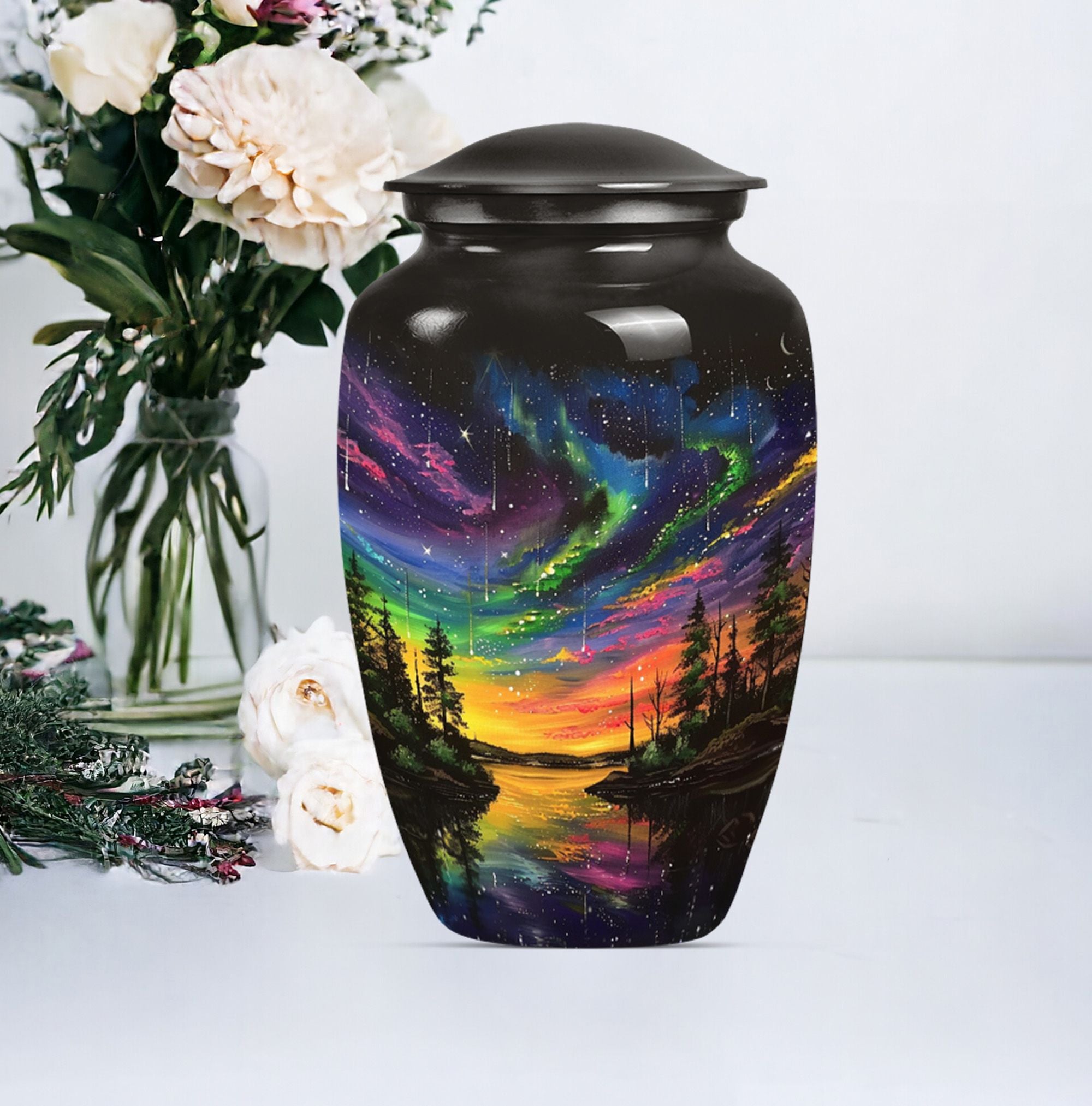 Emphasize respect and remembrance with our one-of-a-kind 'Northern Lights Urn.' This funeral urn for men ashes provides an elegant and significant method to preserve the memories of your cherished ones. Each beautifully crafted cremation urn measures 10 inches in height, making it an ideal large urn choice. With a capacity of 200 cubic inches, it is designed to securely hold the ashes of an adult. Embracing a classic urn theme, this unique piece is intricately crafted from durable aluminium, offering an enduring symbol of affection and respect. The urn is shipped with an accompanying velvet pouch to provide a gracious containment for the ashes. Add a personal touch to this commemoration with our customization feature that allows you to engrave names on the urn, radiating an intimate sentiment. This purple-meadow themed urn is an emblem of endearing memories, fixing a part of your loved one with you. Note: This item weighs 3.3 pounds, signifying its robustness and longevity. This stunning urn attracts those on the hunt for adult urns for ashes, decorative human ashes urns, or metal urns.