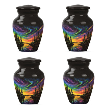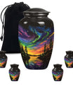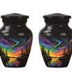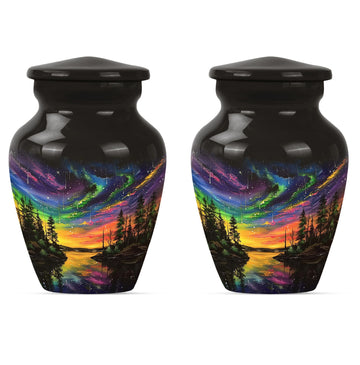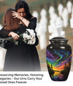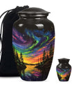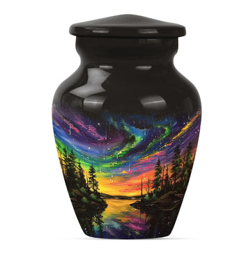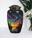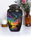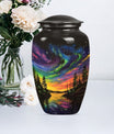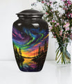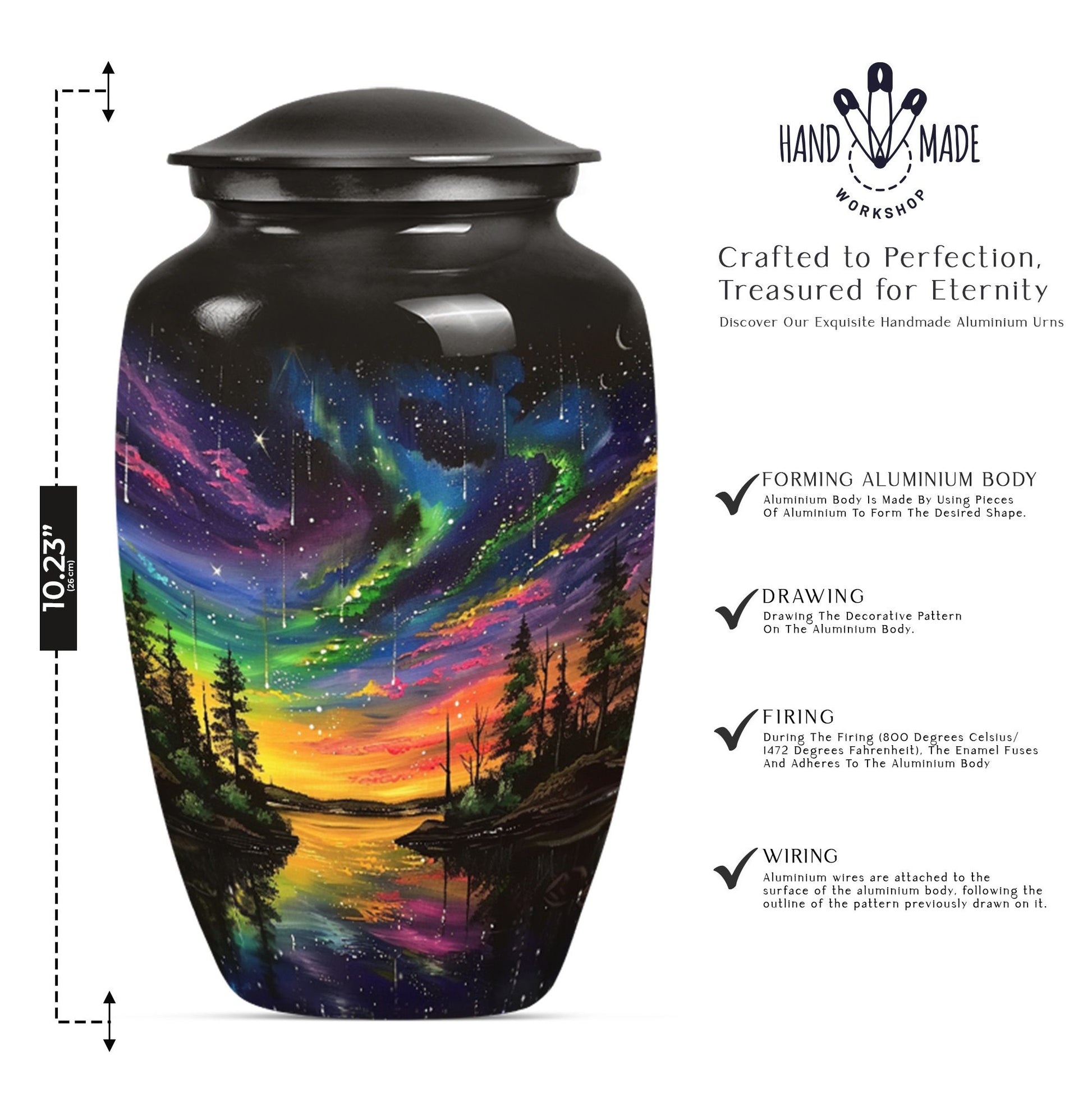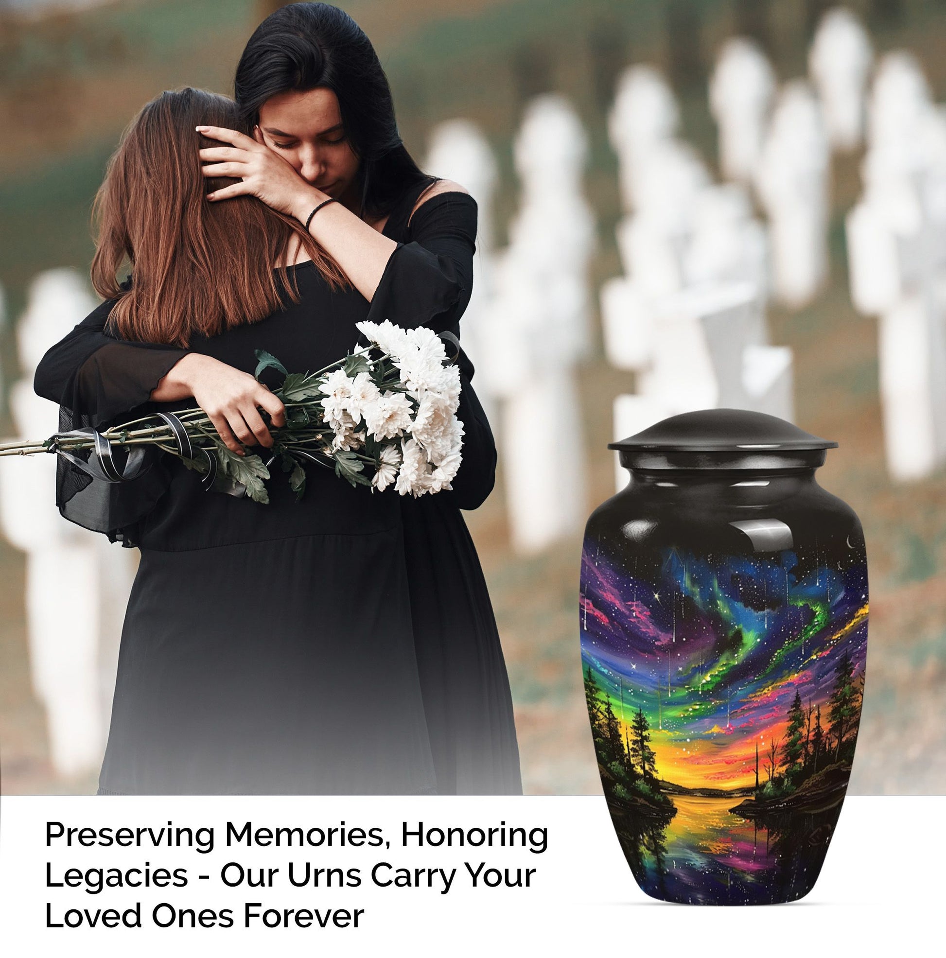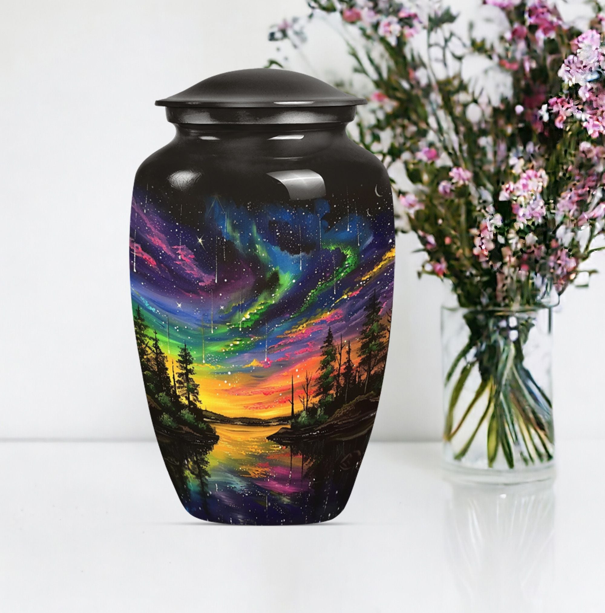 Emphasize respect and remembrance with our one-of-a-kind 'Northern Lights Urn.' This funeral urn for men ashes provides an elegant and significant method to preserve the memories of your cherished ones. Each beautifully crafted cremation urn measures 10 inches in height, making it an ideal large urn choice. With a capacity of 200 cubic inches, it is designed to securely hold the ashes of an adult. Embracing a classic urn theme, this unique piece is intricately crafted from durable aluminium, offering an enduring symbol of affection and respect. The urn is shipped with an accompanying velvet pouch to provide a gracious containment for the ashes. Add a personal touch to this commemoration with our customization feature that allows you to engrave names on the urn, radiating an intimate sentiment. This purple-meadow themed urn is an emblem of endearing memories, fixing a part of your loved one with you. Note: This item weighs 3.3 pounds, signifying its robustness and longevity. This stunning urn attracts those on the hunt for adult urns for ashes, decorative human ashes urns, or metal urns.