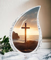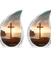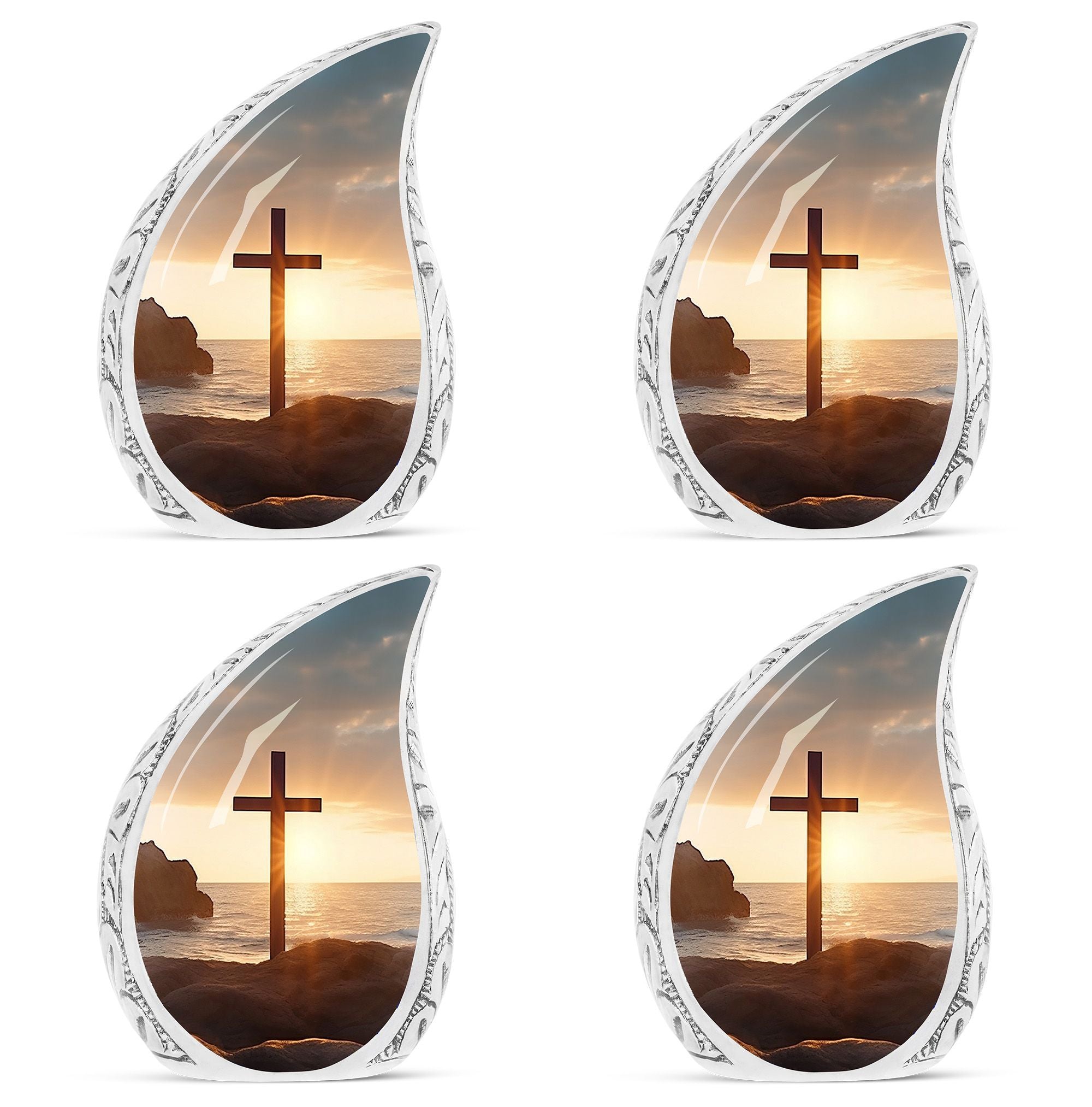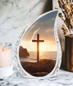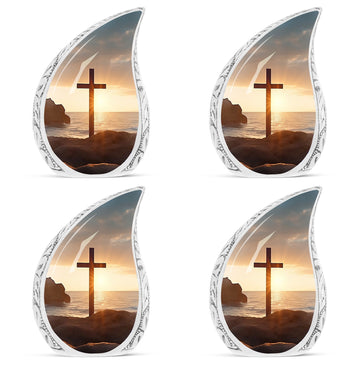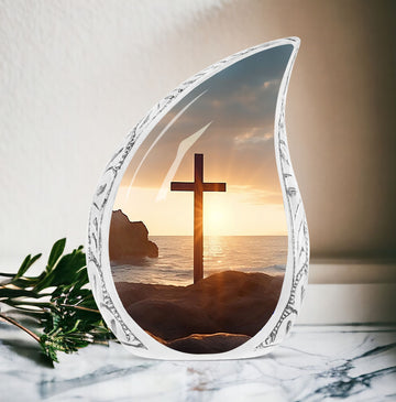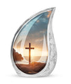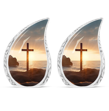 Immerse yourself in the tranquility of faith and devotion with this timeless piece, the Ocean Jesus Cross Urns for Human Ashes. Serving as a cherished final resting place, this 200 cubic inches large urn is meticulously made from durable aluminium. Its weight of 3.3 pounds and height of 10 inches make it an appropriate size to preserve the memories of your loved ones. Each piece includes a velvet pouch for containment of ashes, ensuring a protective and dignified storage. The Ocean Jesus Cross Urn can be personalized by engraving names, adding a unique touch to the memorial. This cremation urn is not merely an urn container, it's a symbol of love and respect for the departed soul. This urn design is a tribute to eternal love and life's beautiful journey.