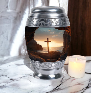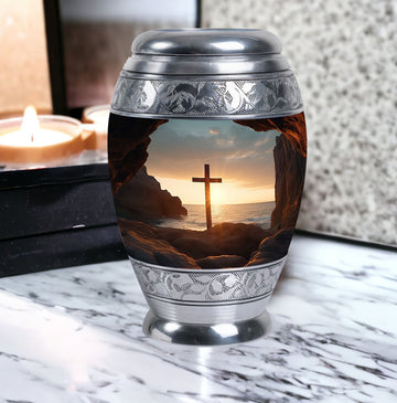 Honor your loved ones with our captivating Ocean Jesus Cross Urns for Human Ashes. This 3-inch, large urn, weighing 3.3 pounds with a capacity of 200 cubic inches, has been meticulously crafted to offer a poignant memorial. Each urn is made from high-quality aluminum, ensuring long-lasting and durable construction that beautifully transcends time. At 10 inches in height, this classic urn conveys reverence and respect, subtly highlighting the depth of your love. It also includes a velvet pouch for secure containment of ashes, adding a further layer of protection. Our urn can be personalized with engraved names, providing a heartfelt touch that accentuates this tribute to eternity. Perfect for adults or seniors wanting a unique and meaningful memorial, this urn is one of the most exquisite cremation urns available. Ideal for those in search of 'Customized Urns for Ashes for Adults', 'Human Urns', or 'Large Urns for Human Ashes', this urn offers a profound way to express love and memories that never fade.