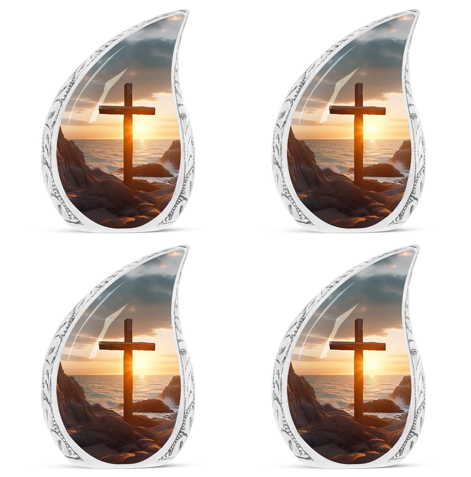 Immerse yourself into a serene sense of remembrance with the Ocean Jesus Cross Urns for Ashes. Our stunning, full-sized 3-inch Cremation Urns are skilfully made from reliable Aluminium materials, resulting in a substantial weight of 3.3 pounds. Each urn effortlessly communicates timeless dignity, thanks to its 10-inch height dimensions and an impressive content capacity of 200 cubic inches. Moreover, our urns are part of the Large Urns type, providing ample space for the containment of ashes. Additionally, we offer an exclusive feature of personalizing your urn with engraved names, adding an extra layer of sentiment to this invaluable memorial item. Every purchase includes a soft velvet pouch, harmoniously safeguarding the precious contents within the urn. Whether you're seeking unique urns or customary cremation urns, our range ensures an unforgettable tribute. Stand apart with our classic urn design, a distinct alternative to the often searched 'memorial urns'. The Ocean Jesus Cross Urns for Ashes: your meaningful companion in cherished memories.