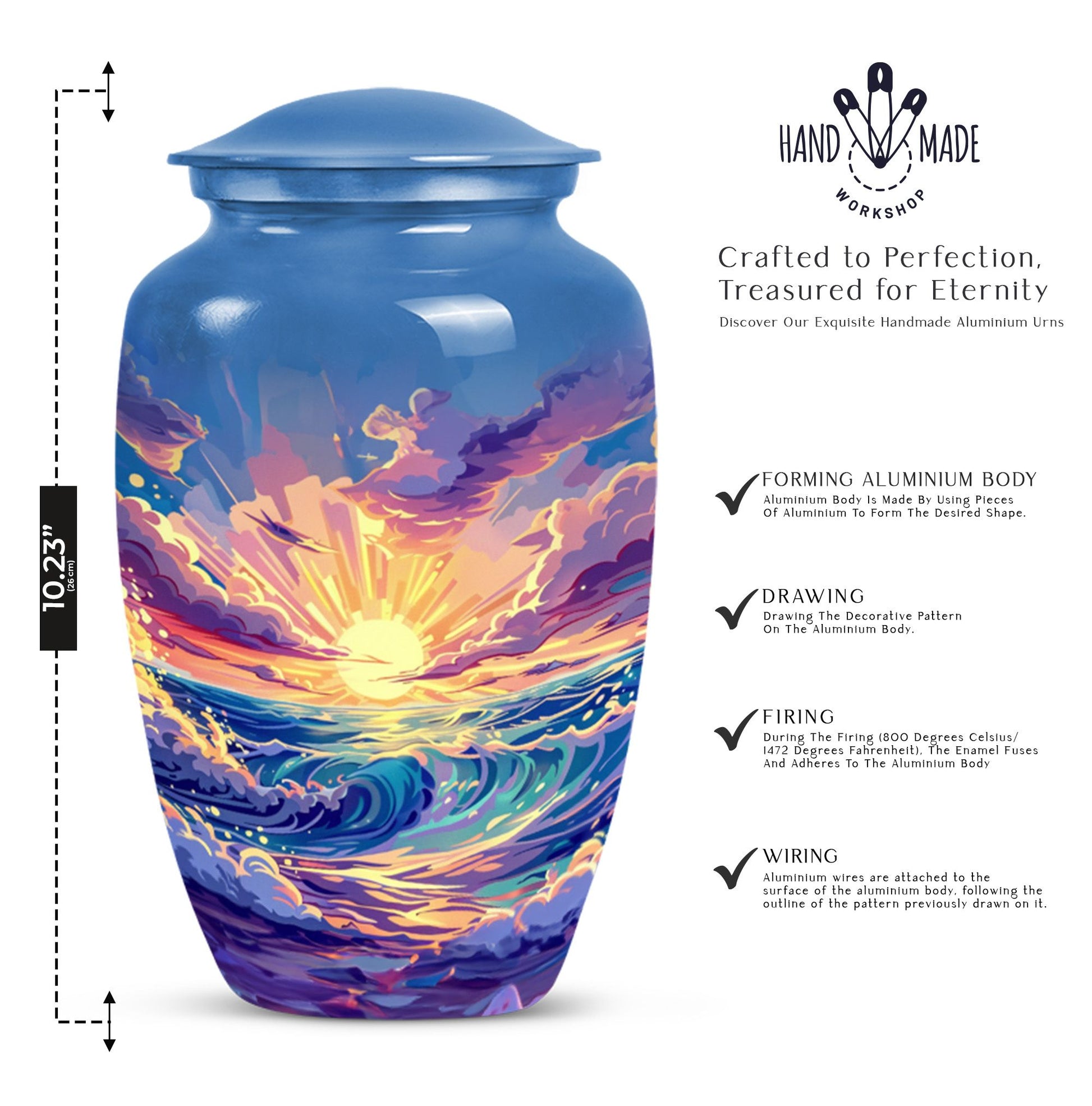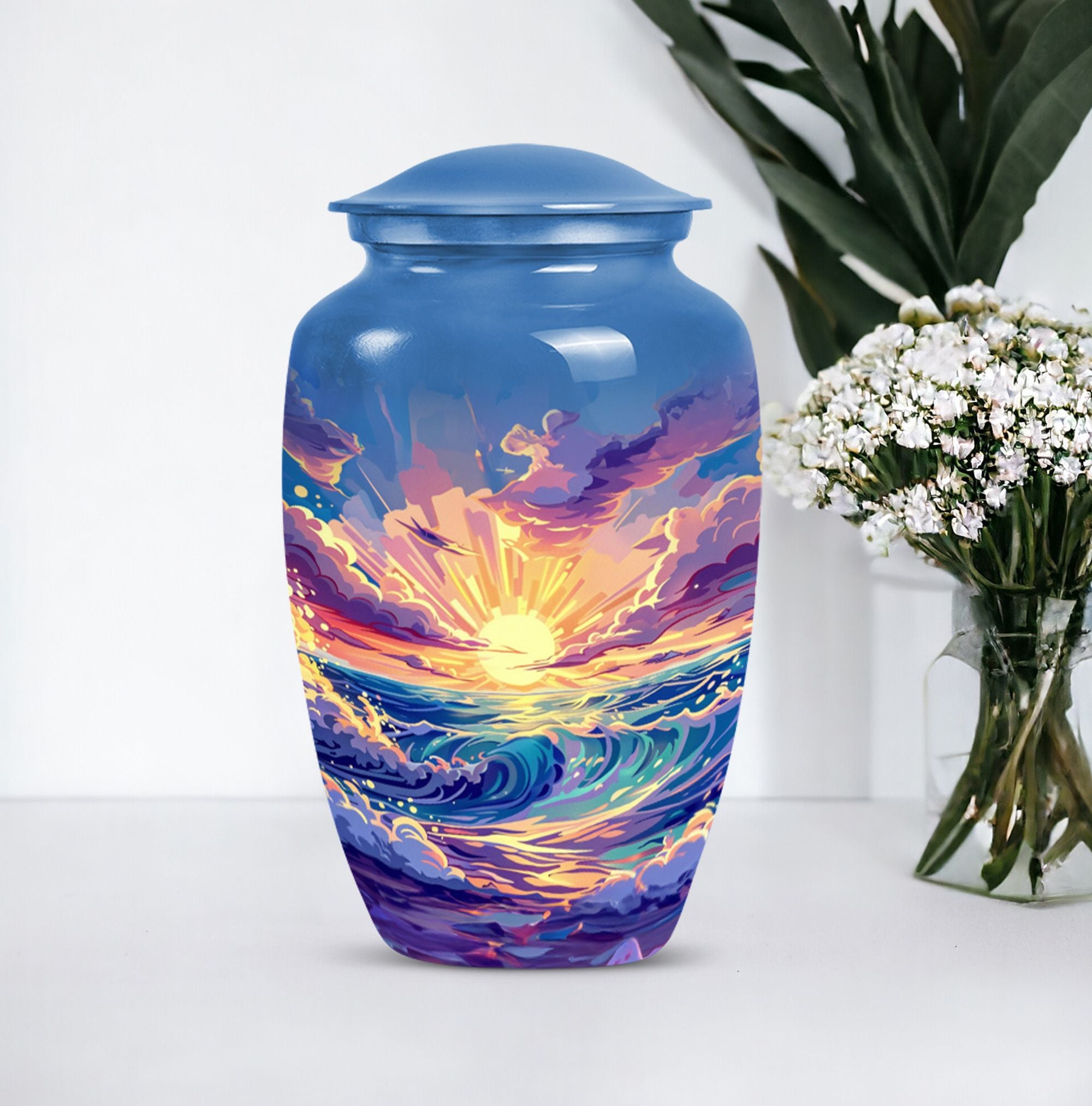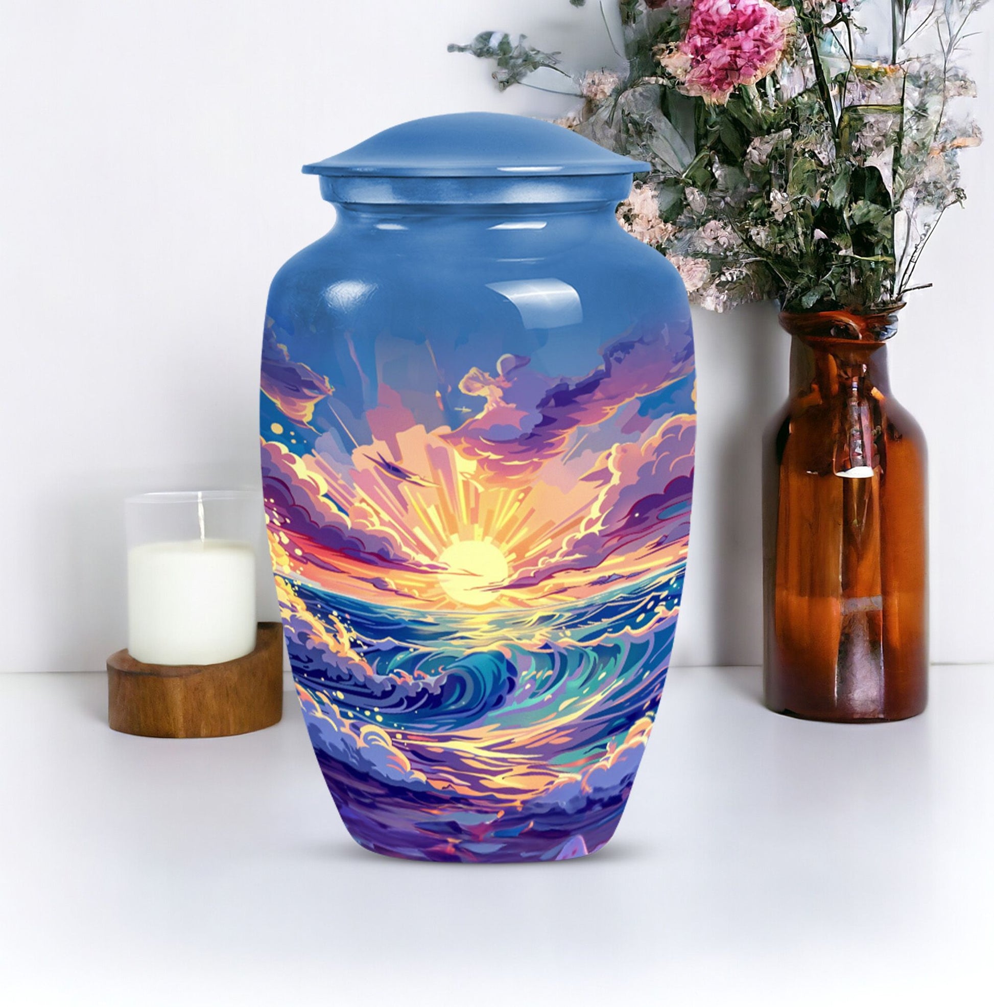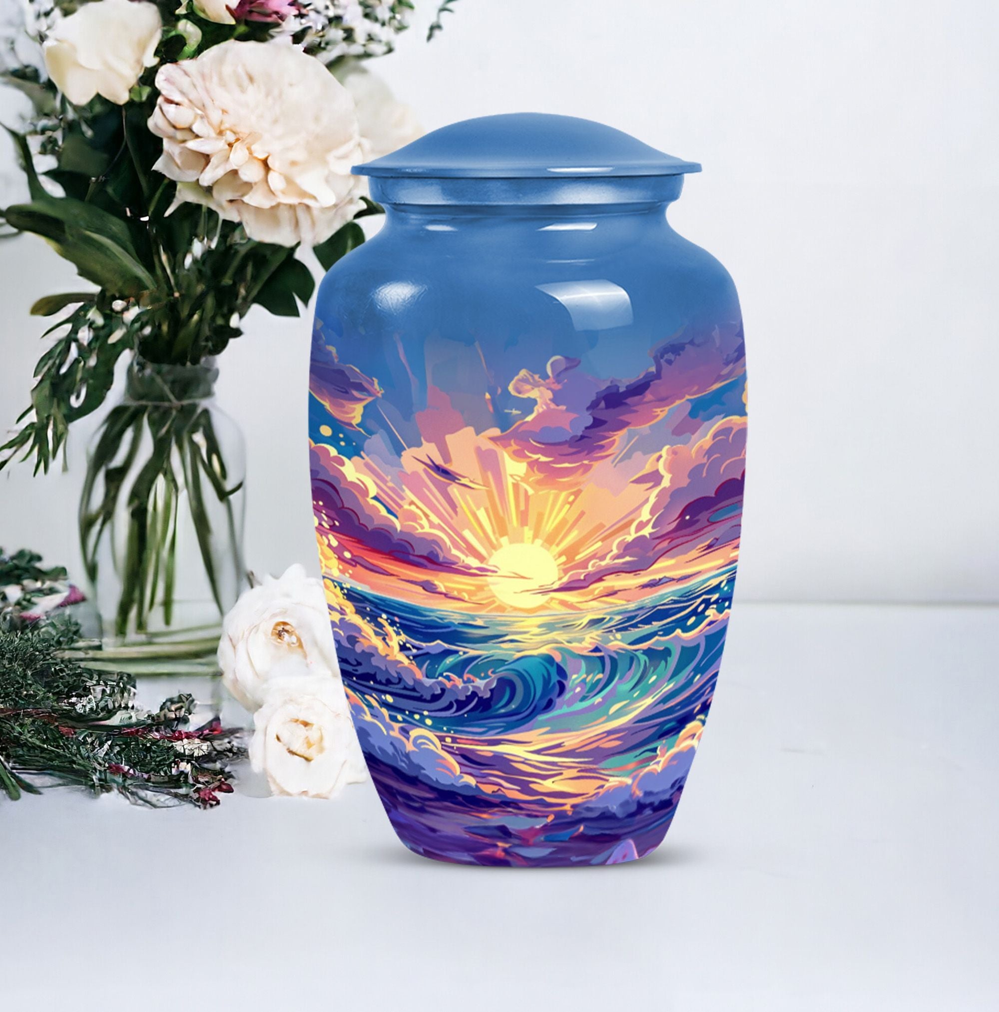 Our Ocean Waves Urn is a distinctive and solemn option for those seeking to remember a cherished adult male in their lives. Meticulously crafted from high-quality Aluminium, this large urn measures 10 inches in height and can comfortably accommodate 200 cubic inches of ashes. The dignified Butterfly theme imparts a gentle sense of tranquility, making it an exquisite addition to any memorial ceremony. To make it even more special, there is an option to personalize the urn with engraved names. It's conveniently sized- neither too big nor too small- a perfect fit for most ceremonial needs. Along with the urn, we provide a velvet pouch to carefully hold the ashes, ensuring they stay safe. Weighing just 3.3 pounds, the urn is easy to carry and handle. Pay tribute to your loved ones with this elegant cremation urn. Uncommon phrases related to this product include funeral urns for human ashes or companion urns for two adults.