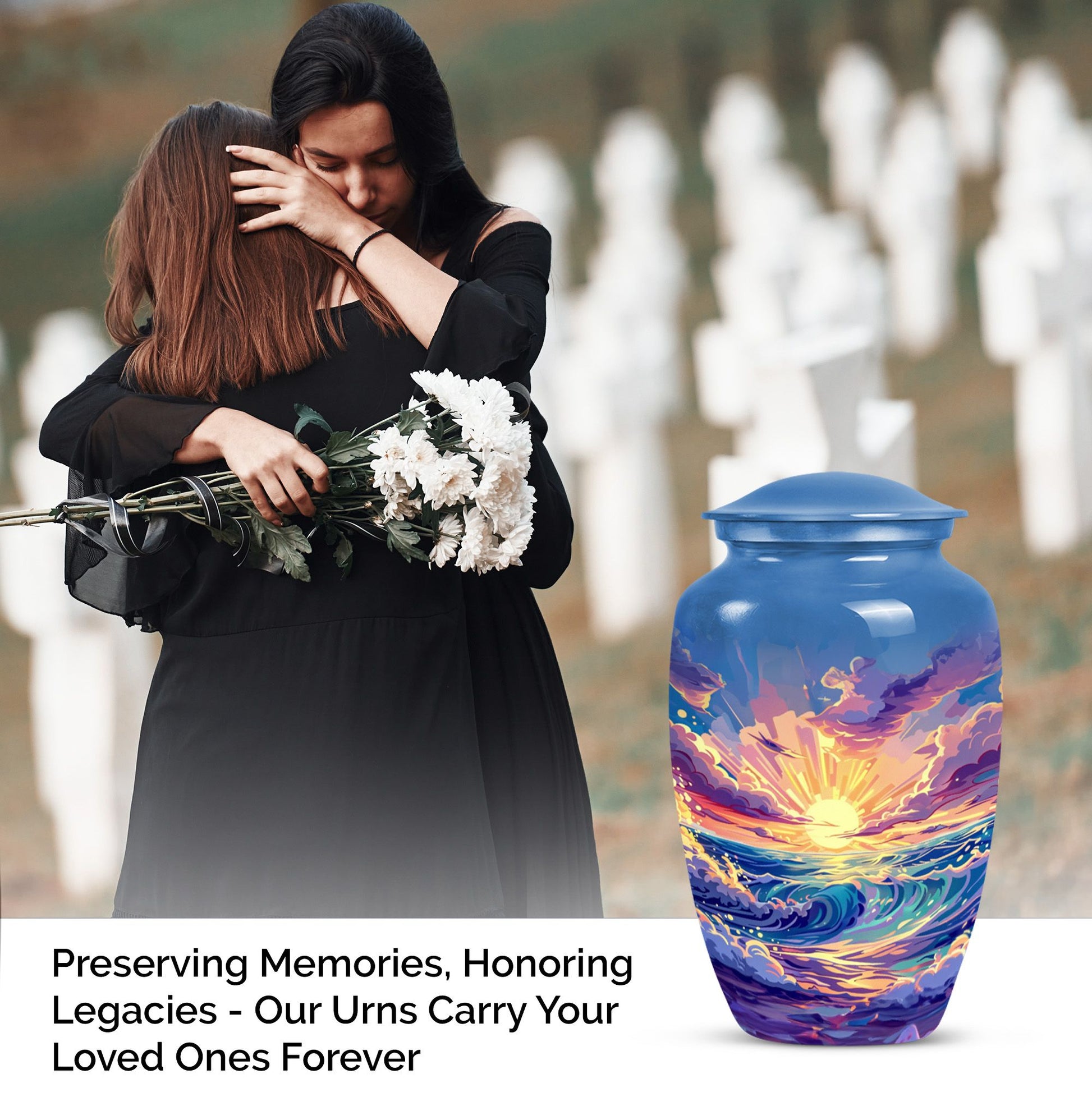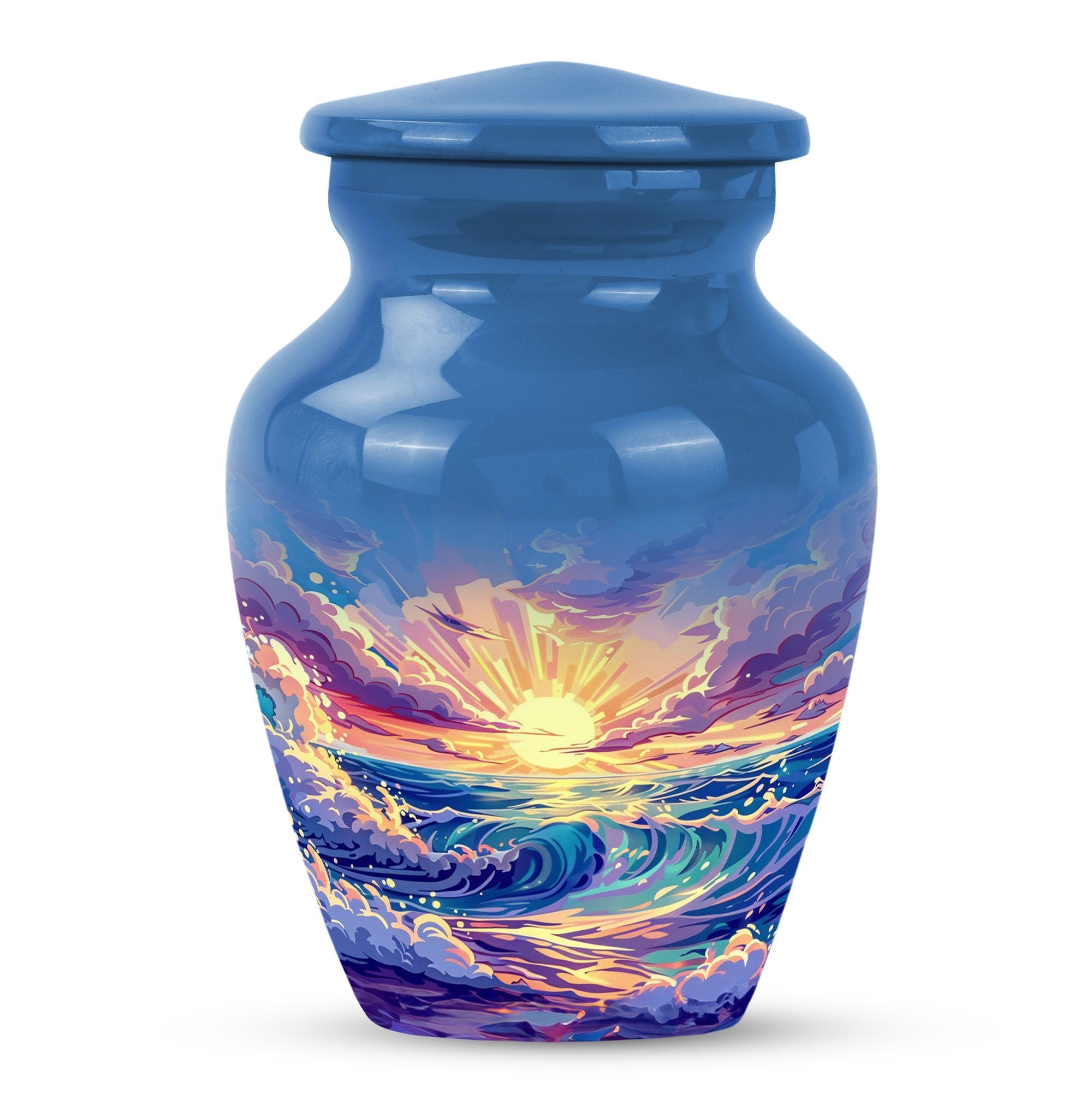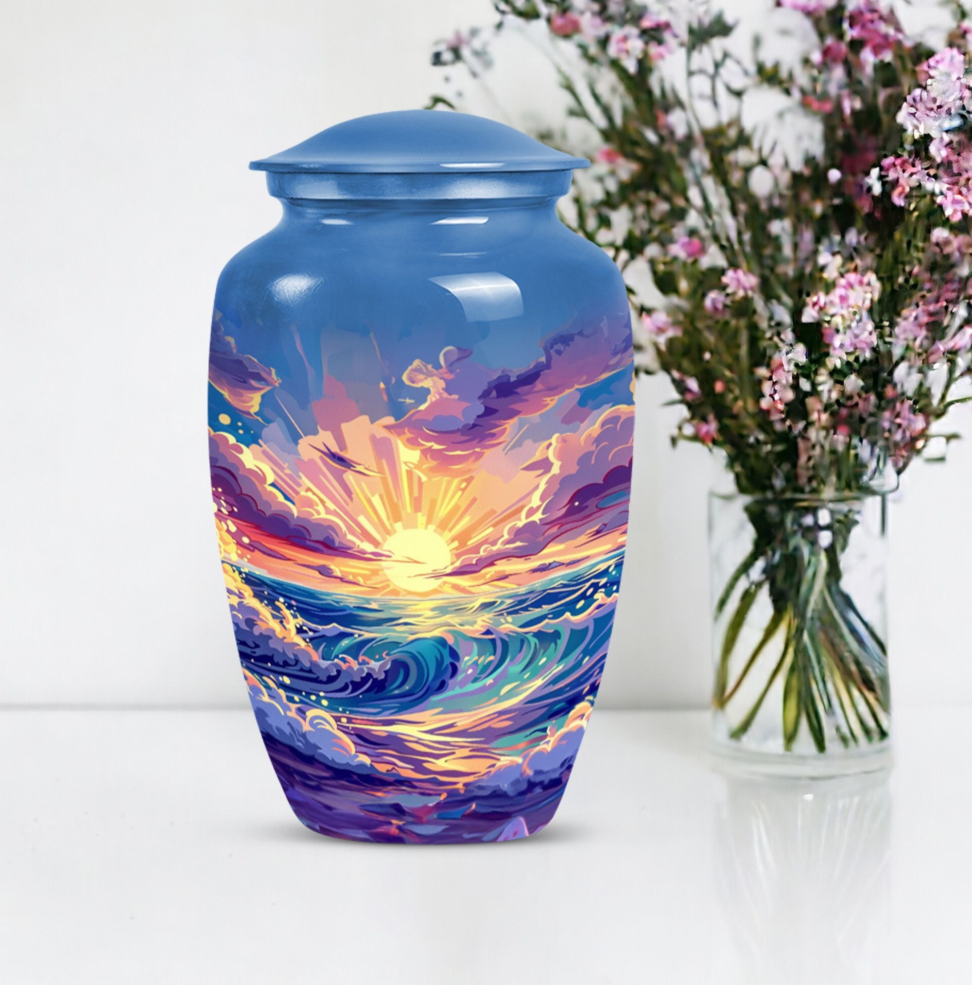 Our Ocean Waves Urn is a distinctive and solemn option for those seeking to remember a cherished adult male in their lives. Meticulously crafted from high-quality Aluminium, this large urn measures 10 inches in height and can comfortably accommodate 200 cubic inches of ashes. The dignified Butterfly theme imparts a gentle sense of tranquility, making it an exquisite addition to any memorial ceremony. To make it even more special, there is an option to personalize the urn with engraved names. It's conveniently sized- neither too big nor too small- a perfect fit for most ceremonial needs. Along with the urn, we provide a velvet pouch to carefully hold the ashes, ensuring they stay safe. Weighing just 3.3 pounds, the urn is easy to carry and handle. Pay tribute to your loved ones with this elegant cremation urn. Uncommon phrases related to this product include funeral urns for human ashes or companion urns for two adults.